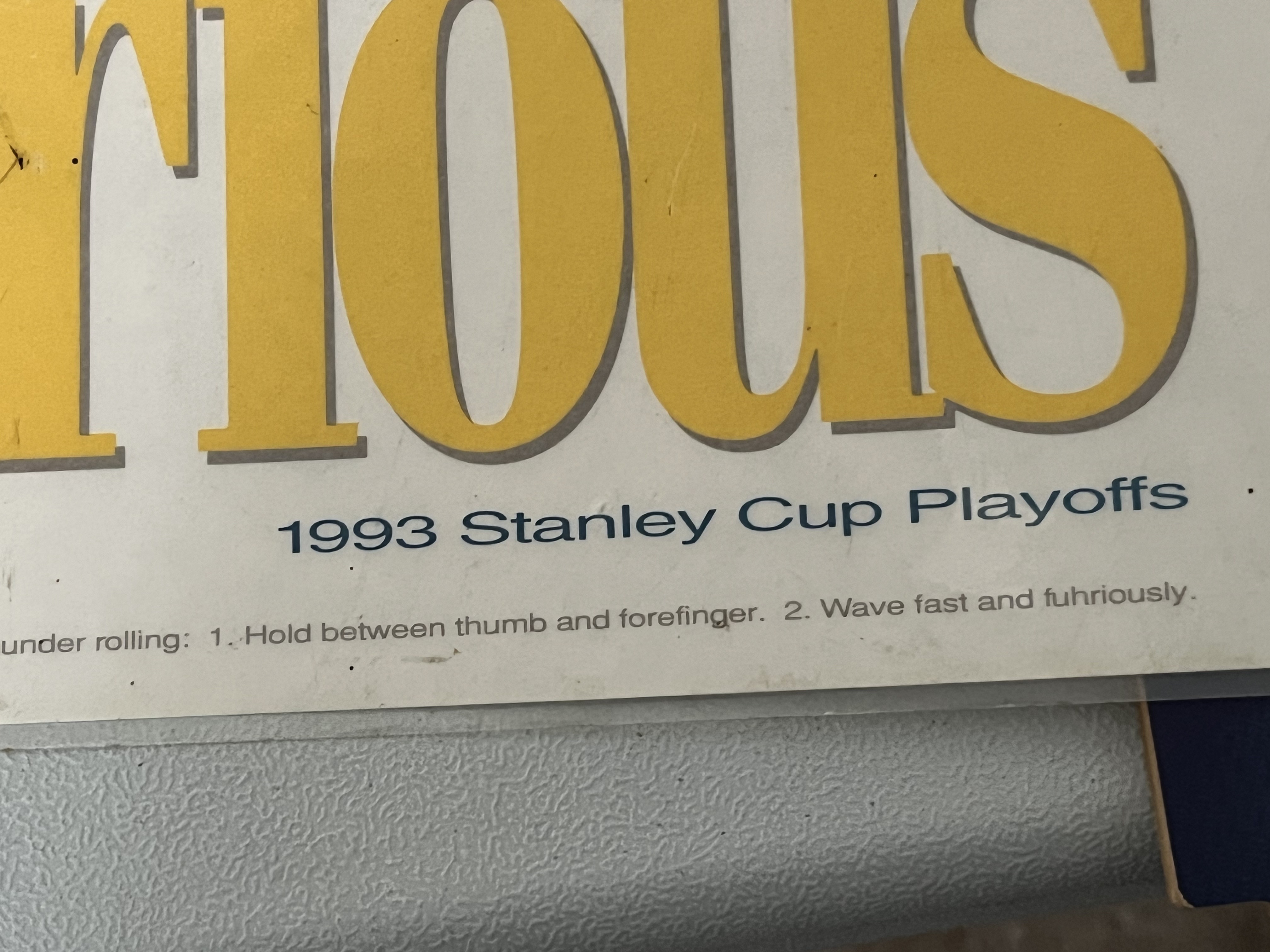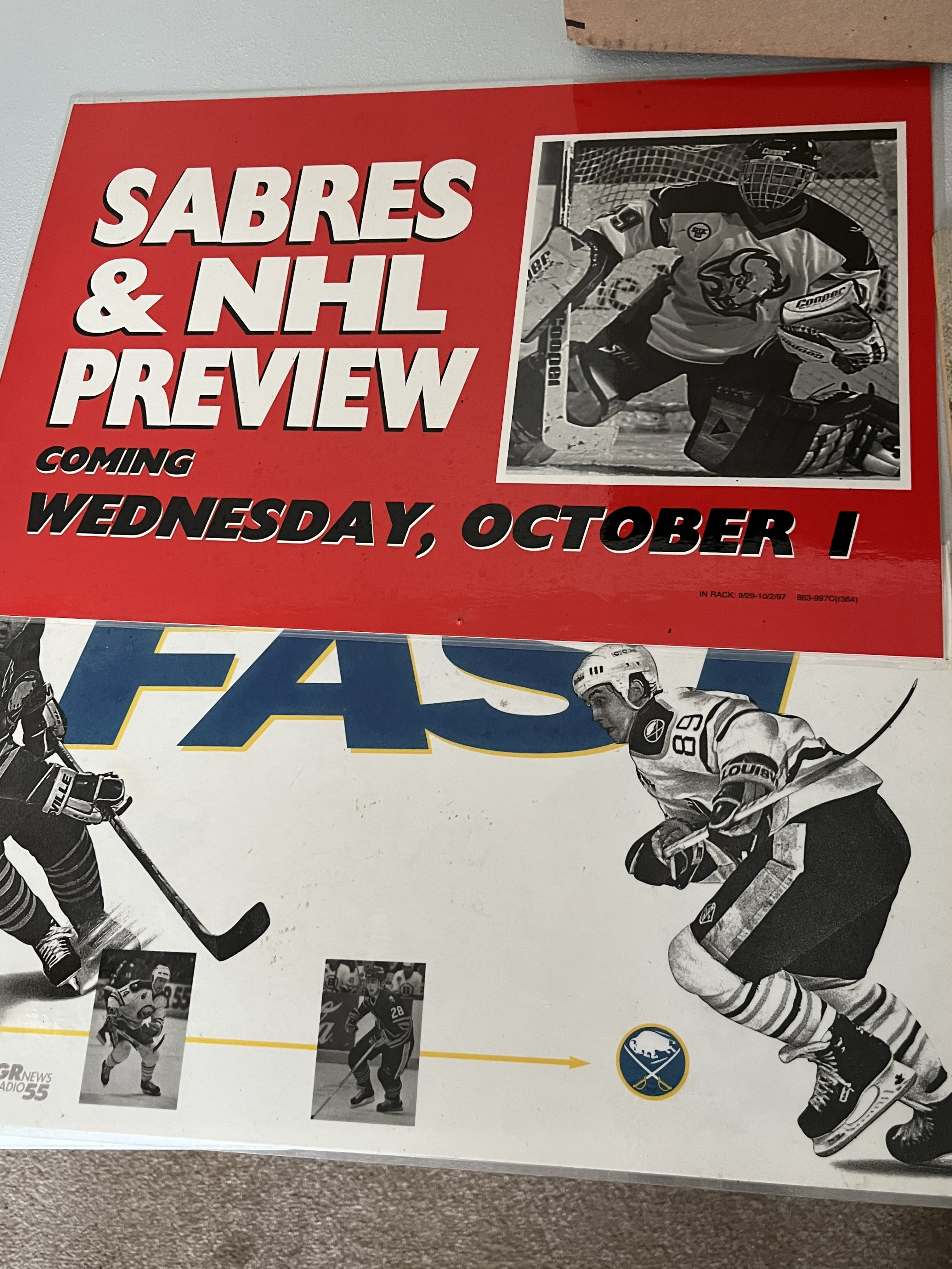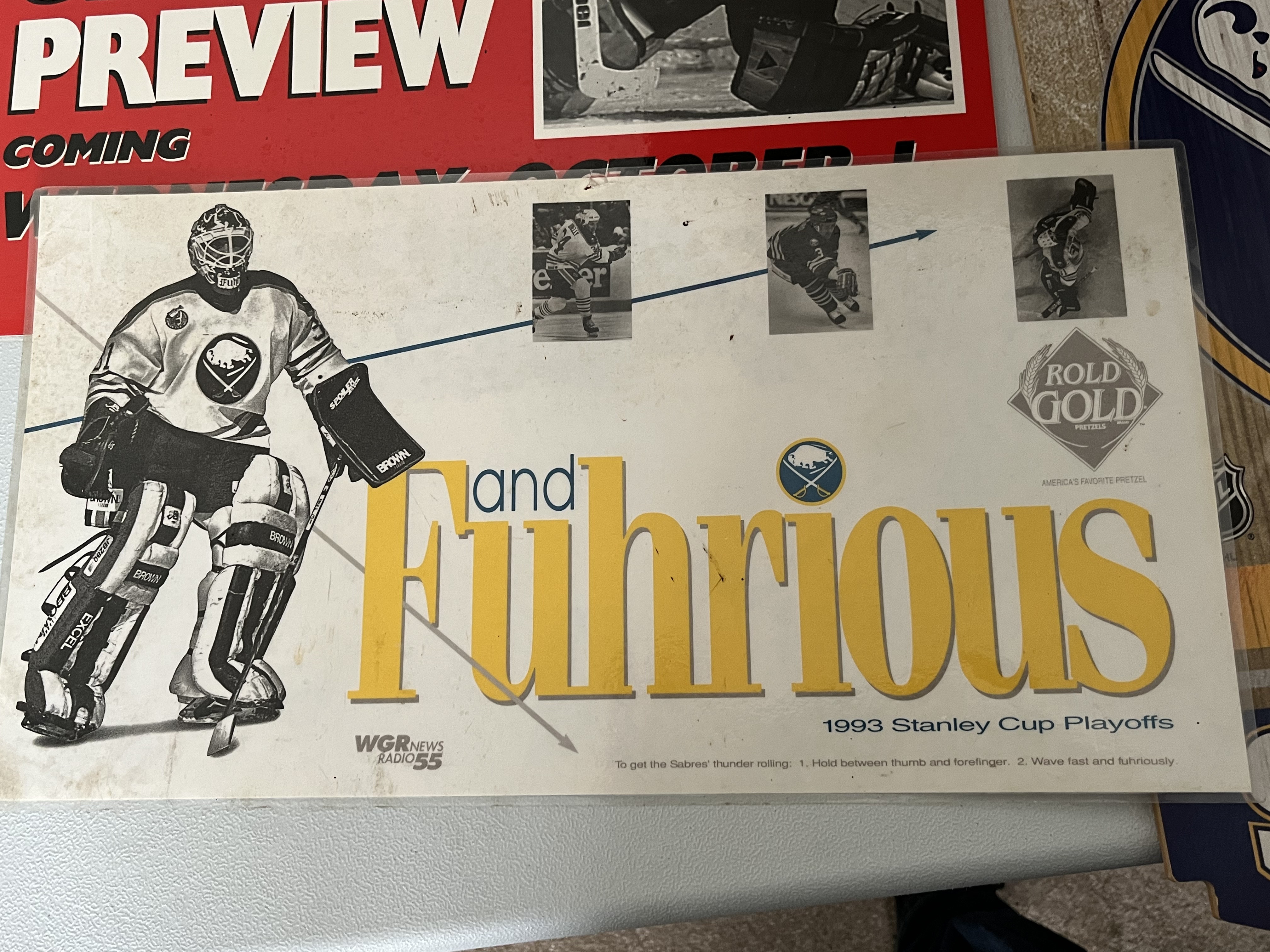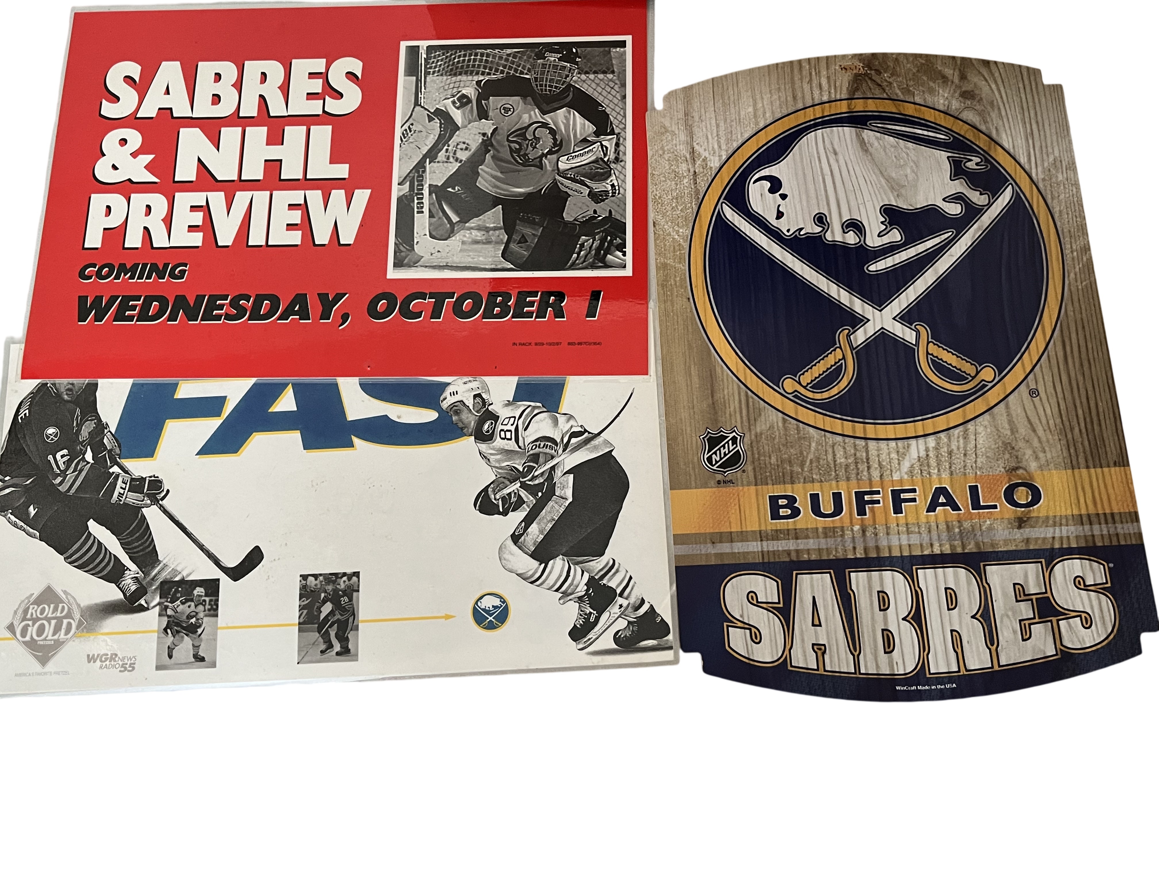 A collection of Buffalo Sabres NHL memorabilia including promotional paper pieces and a decorative wall sign, circa 1993-1997. The group features a 1993 Stanley Cup Playoffs Fast and Fuhrious commemorative piece, an Alexander Mogilny promotional poster, and a Sabres and NHL Preview poster. Included is a WinCraft manufactured wood-grain finish sign featuring the team logo and name. Markings include WinCraft Made in the USA on the sign and Rold Gold and WGR News Radio 55 logos on the promotional materials.