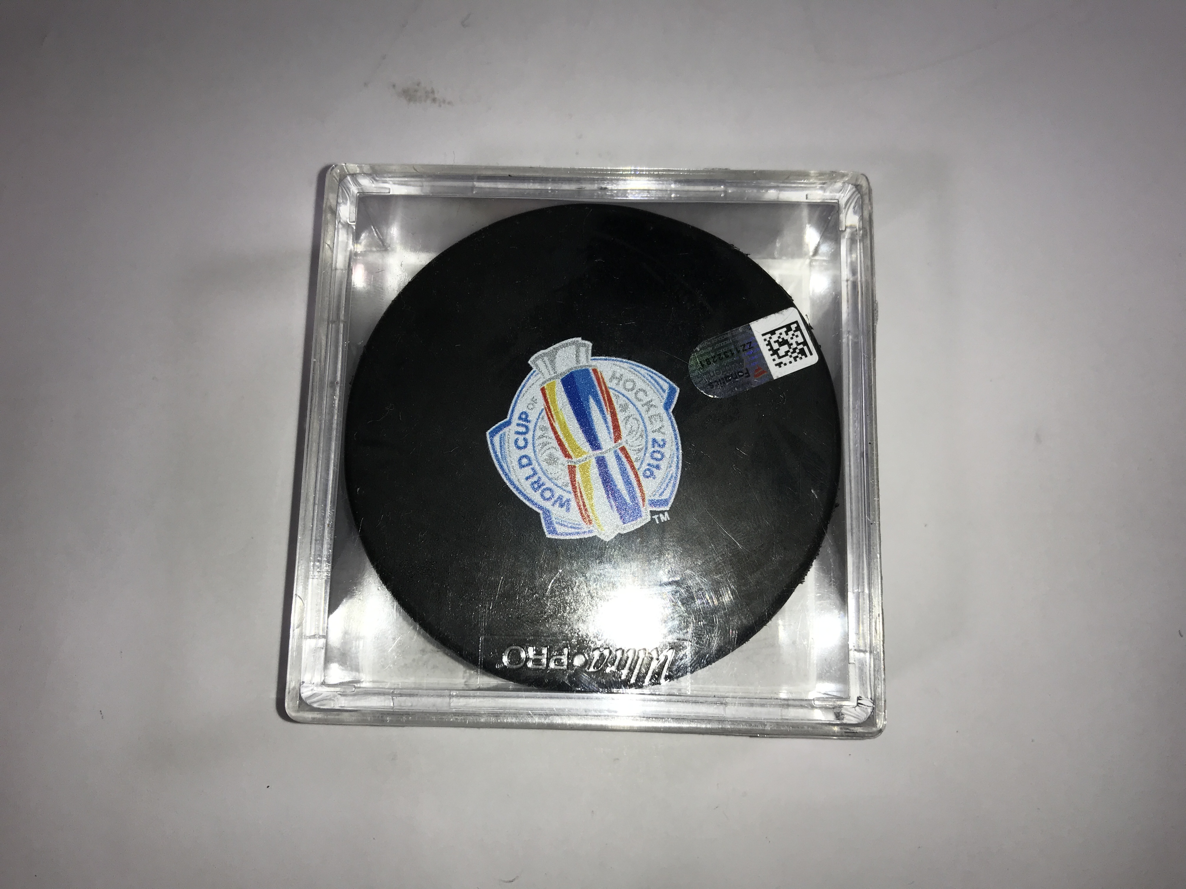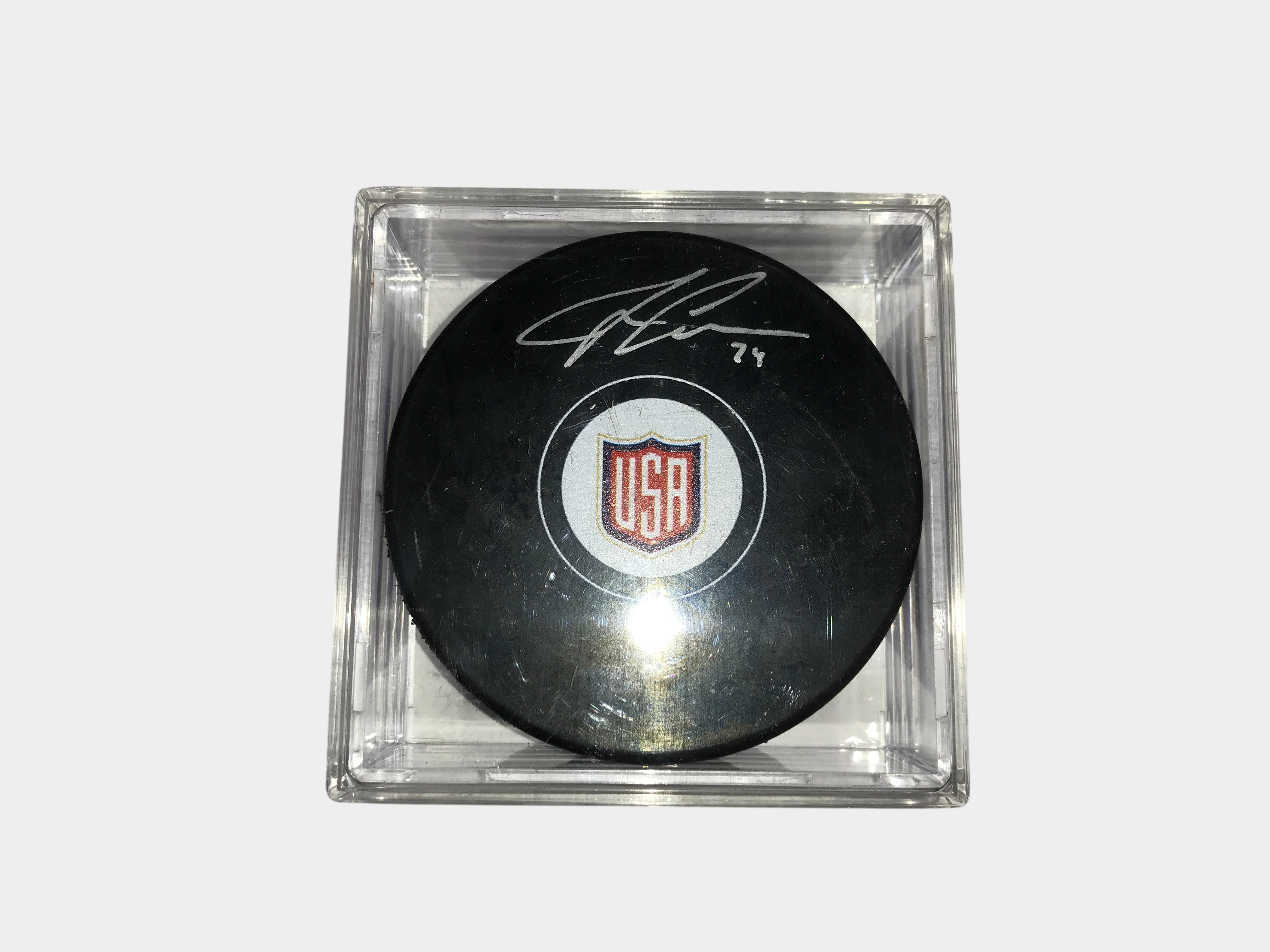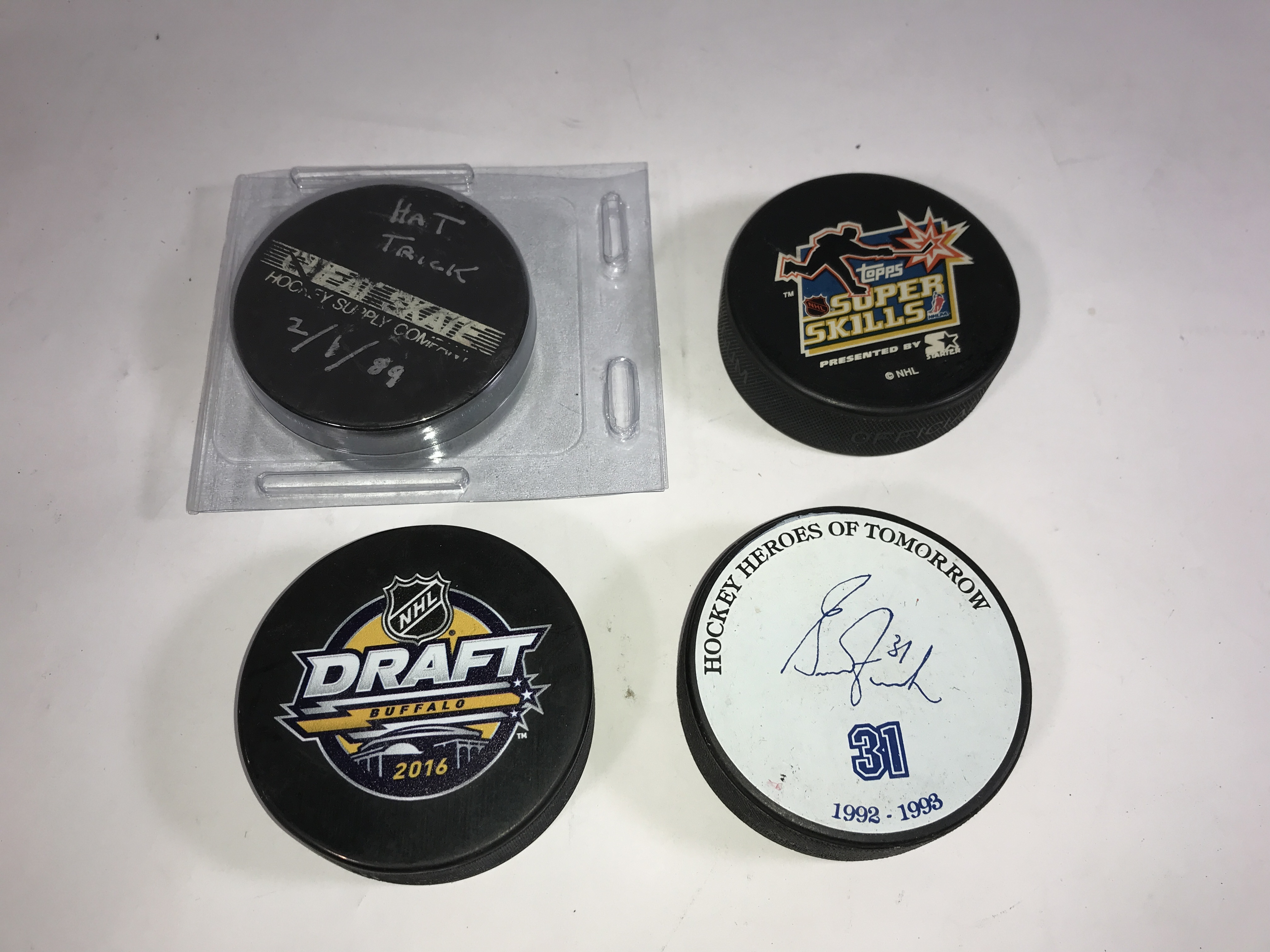 The primary highlight is a 2016 World Cup of Hockey USA team puck signed in silver-tone ink and numbered 74. This item is authenticated by a Fanatics hologram ZZ1132251 and is presented in an Ultra PRO display case. The group also features an AHL Portland Pirates souvenir puck signed in gold-tone ink, a 2016 NHL Draft Buffalo puck, and a Topps Super Skills puck presented by Starter. The assortment includes an orange NHL licensed puck by Trench Mfg., an orange Cooper official puck, and a Nichols School Tornadoes puck. One puck from Realskate Hockey Supply Company is marked HAT TRICK and dated 2/1/89. Several examples bear unidentified signatures in silver and gold-tone ink with associated player numbers including 31, 27, and 8. One puck is designated Hockey Heroes of Tomorrow 1992-1993 with a signature and number 31.