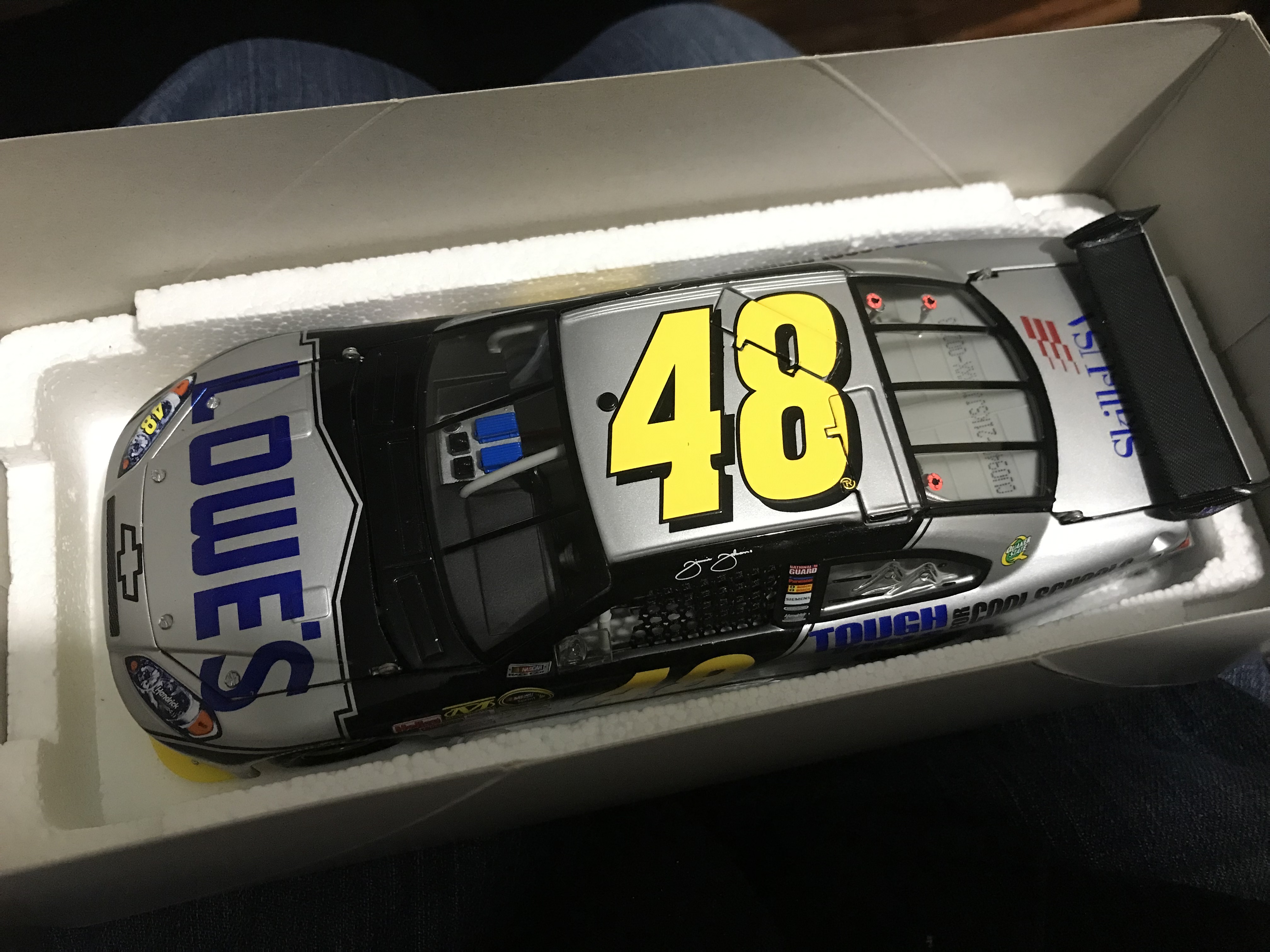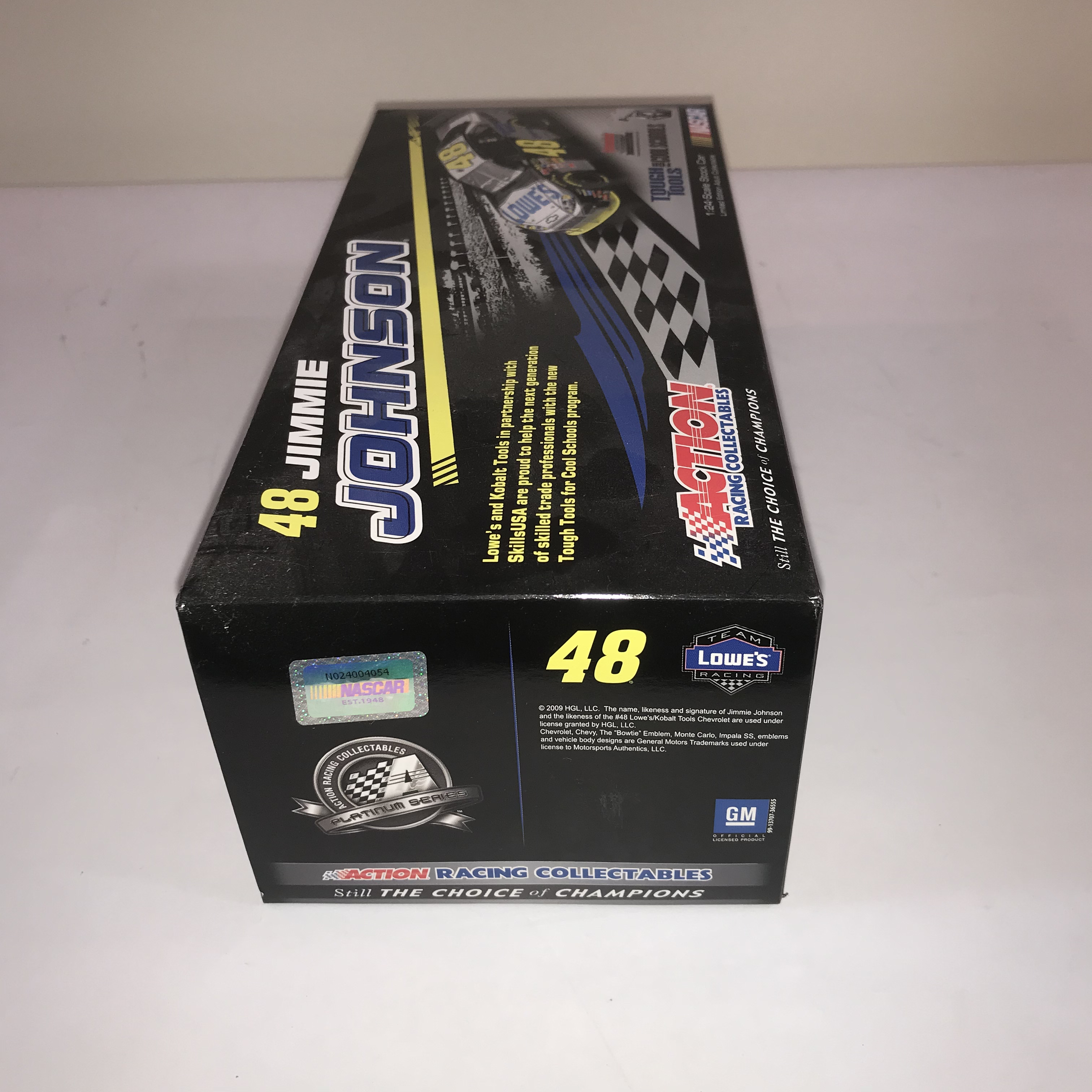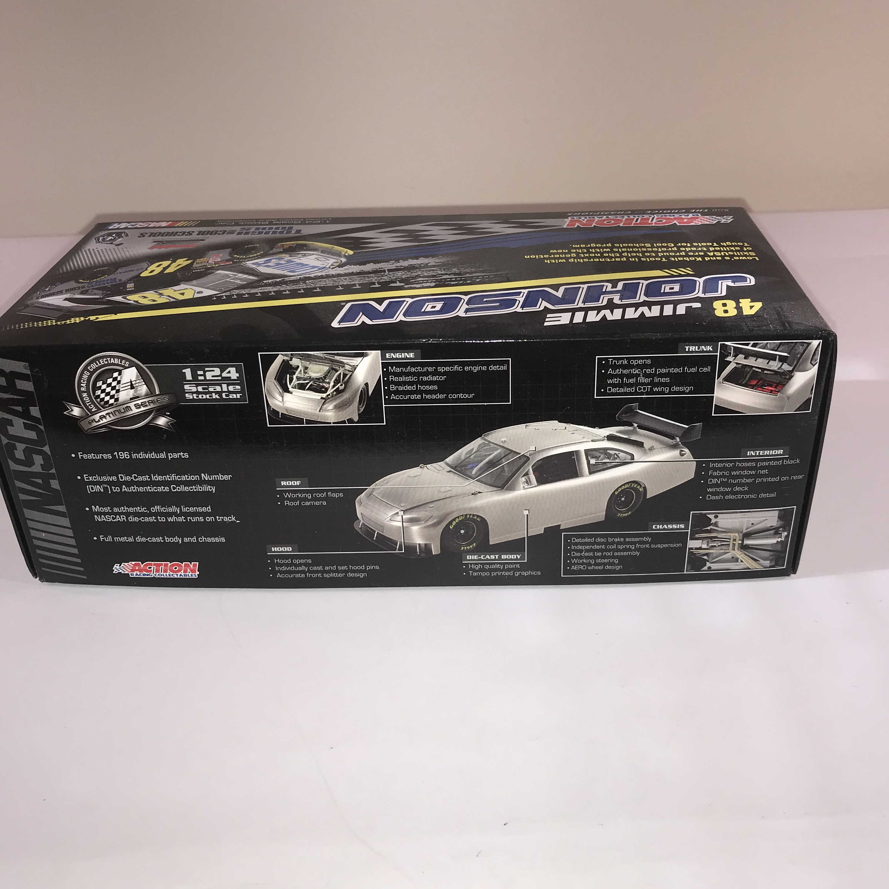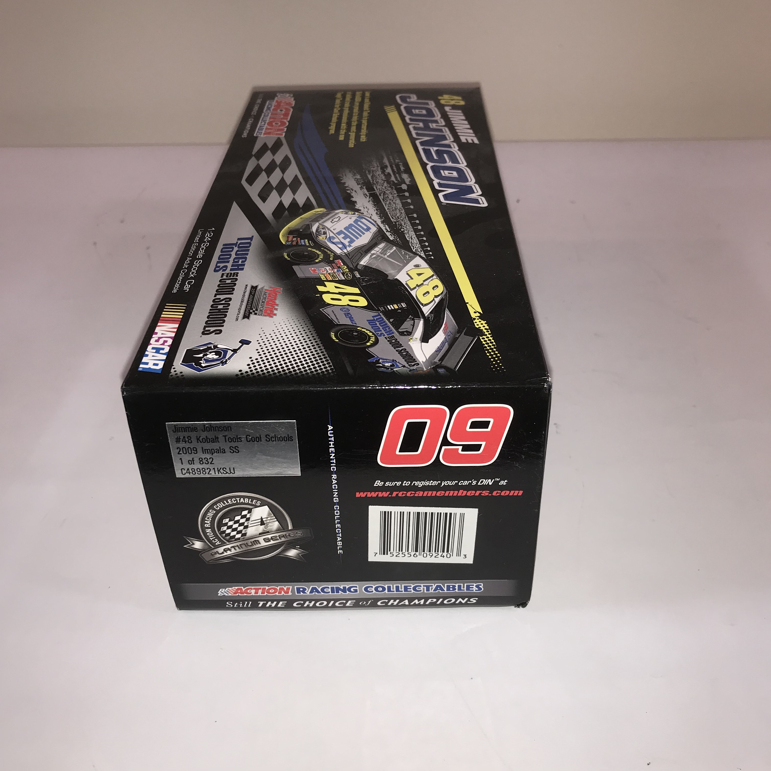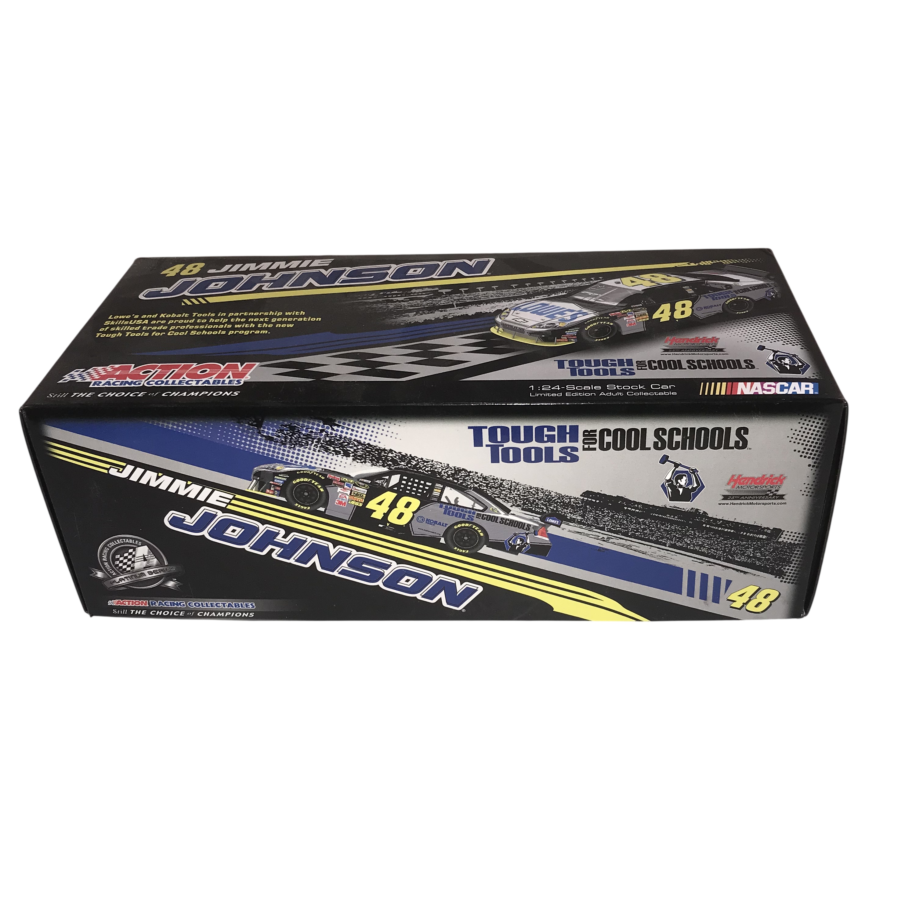 Action Racing Collectables Platinum Series 1:24 scale die-cast model of the Jimmie Johnson #48 Hendrick Motorsports 2009 Chevrolet Impala SS. The model features the Tough Tools for Cool Schools Kobalt Tools and Lowe’s livery on a die-cast metal body and chassis with 196 individual parts. Technical details include an opening hood and trunk, working roof flaps, a fabric window net, and a unique Die-Cast Identification Number (DIN). Box labels identify this as a limited edition release of 832 units with product code C489821KSJJ.