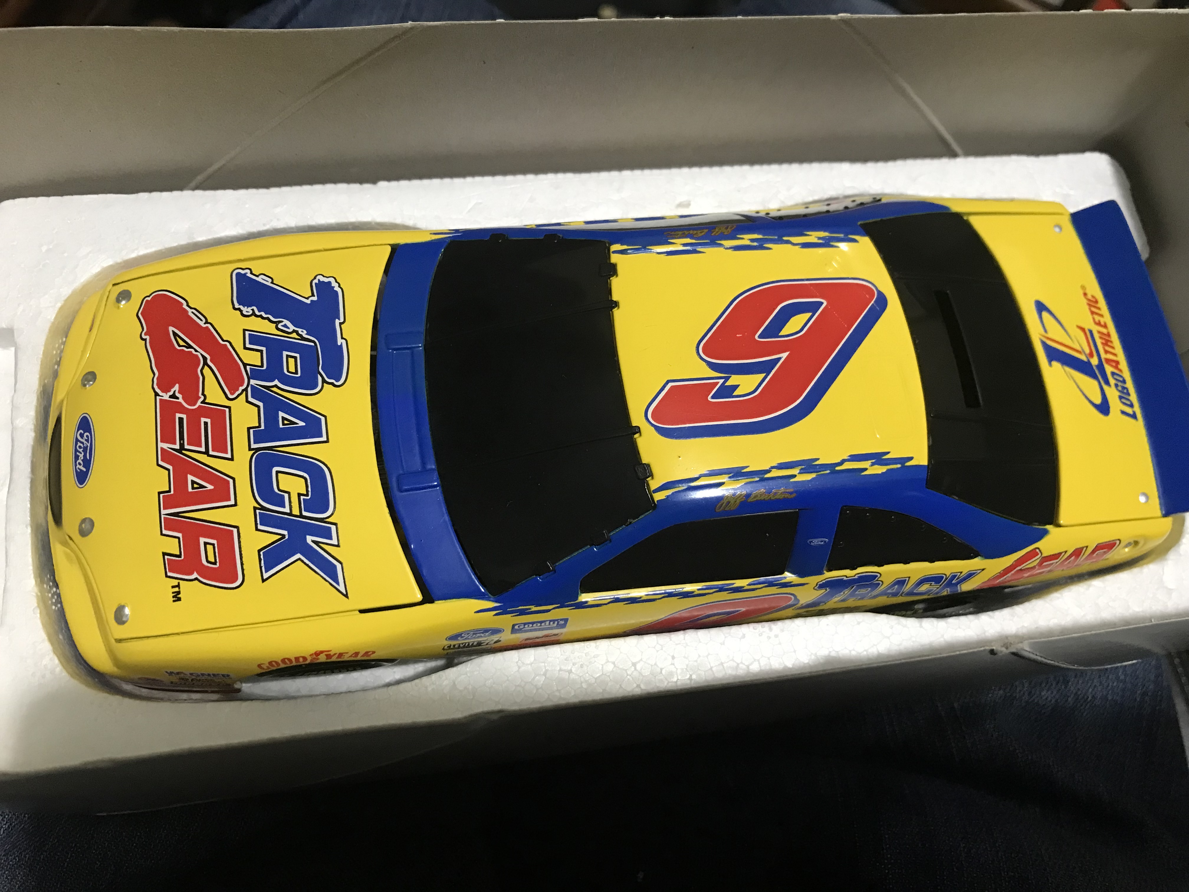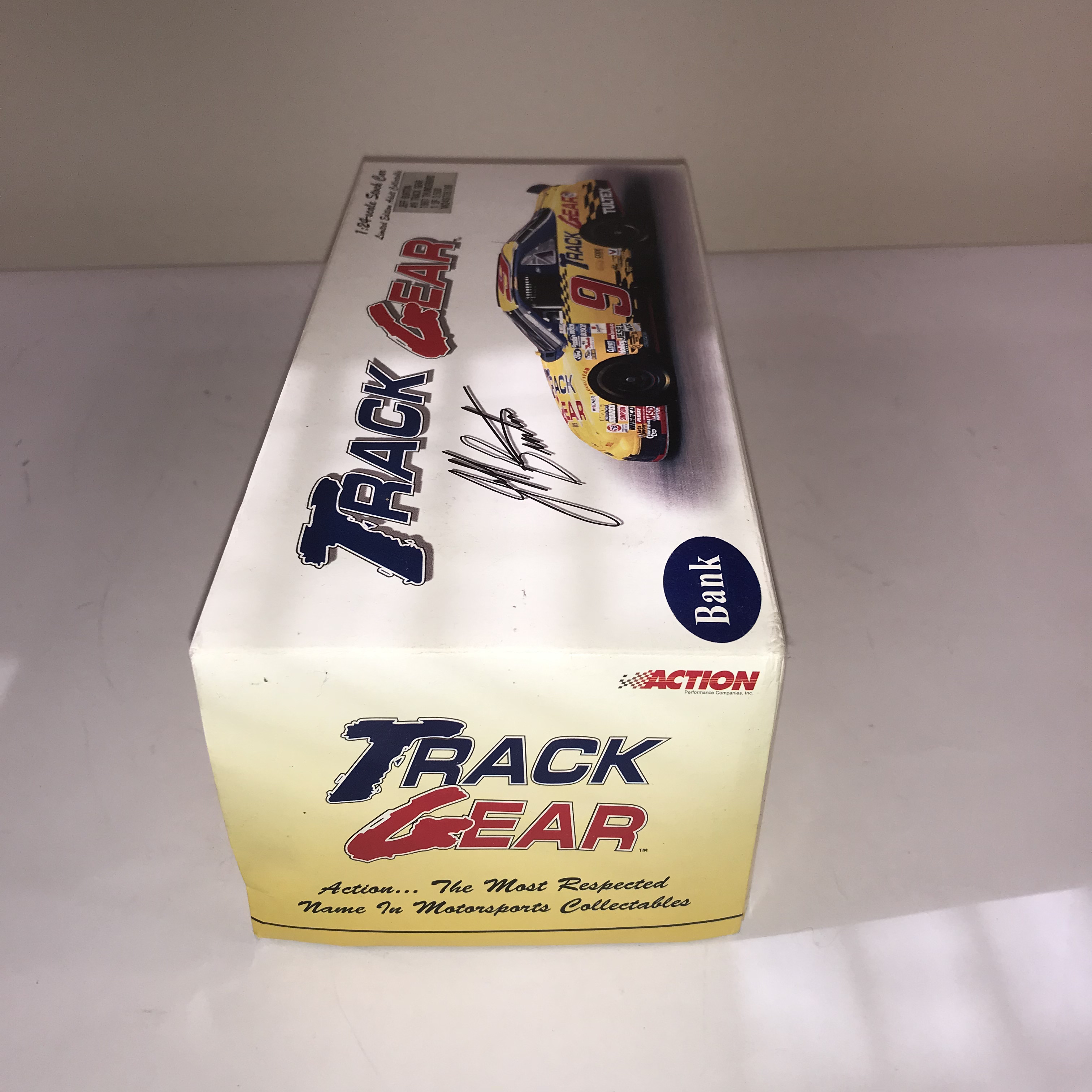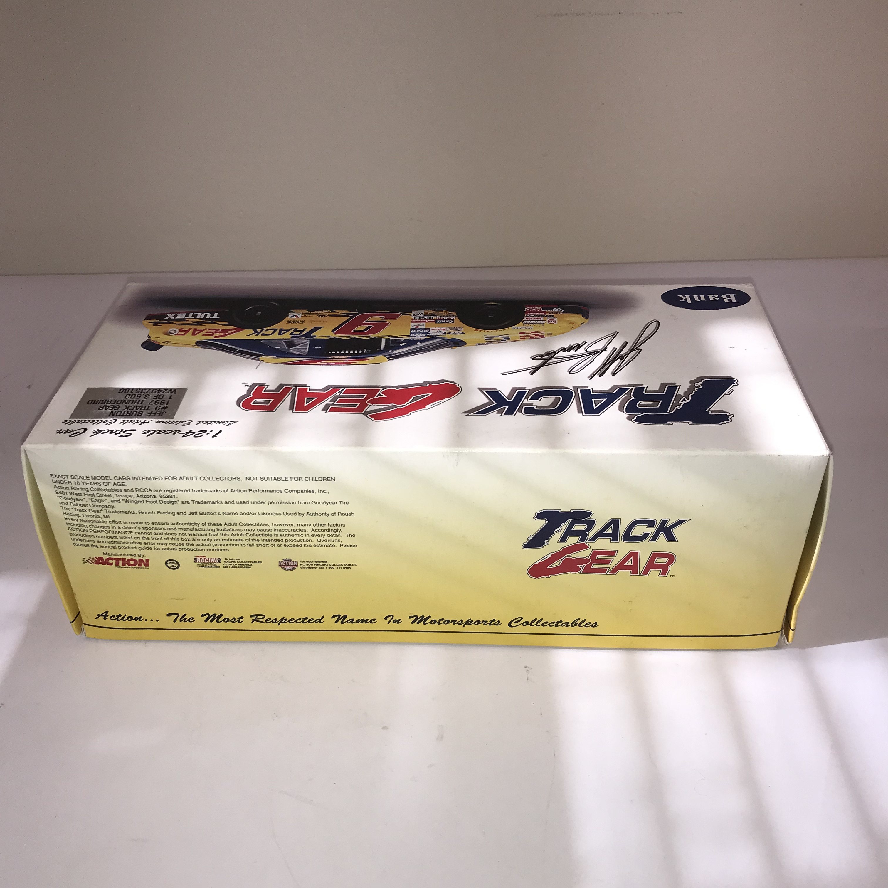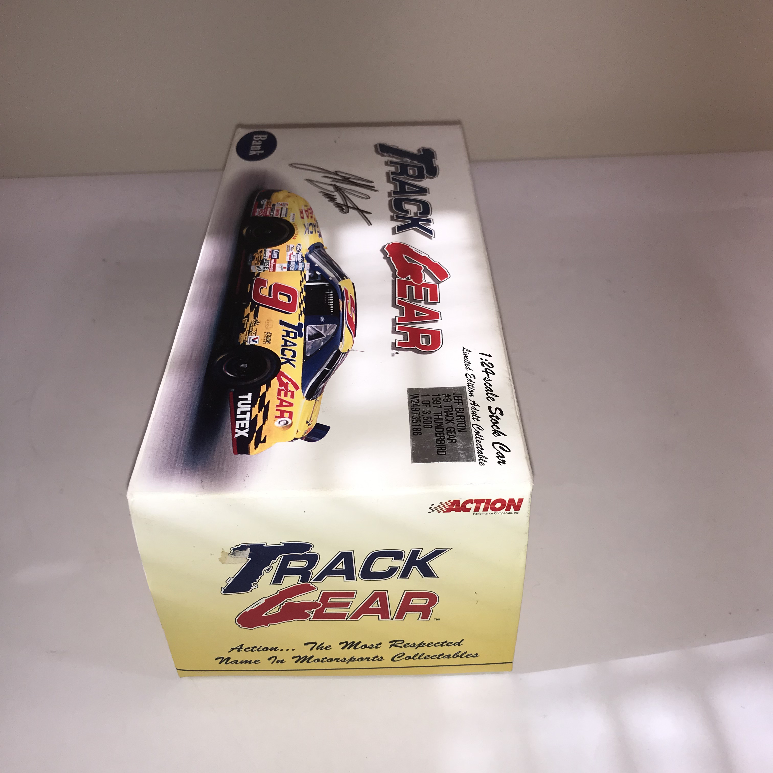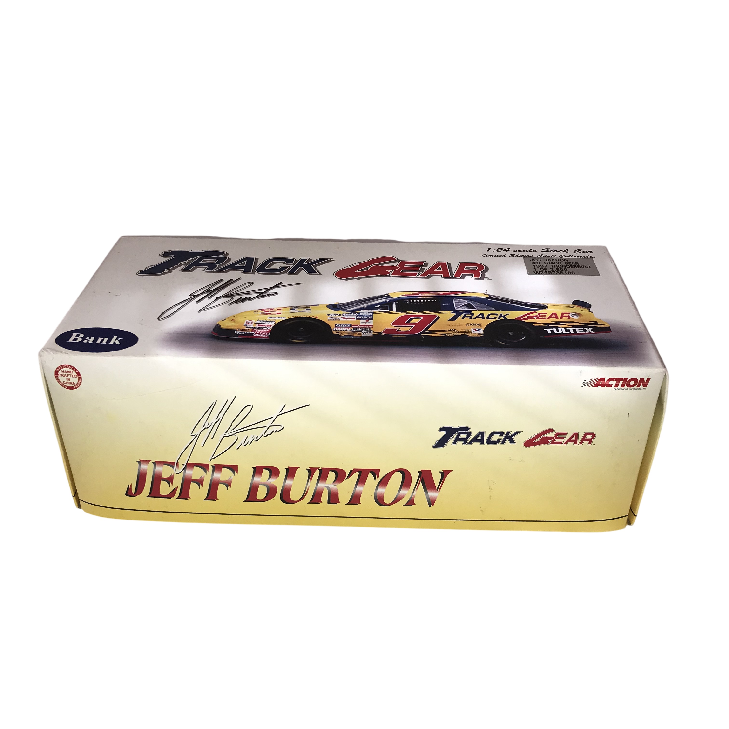 Action Performance Companies, Inc. limited edition 1:24-scale die-cast stock car bank featuring Jeff Burton’s #9 Track Gear Ford Thunderbird, produced in 1997. The vehicle features a yellow and black livery with Track Gear sponsorship and is designed with a coin slot for use as a bank. Original packaging displays facsimile signatures and a silver foil production label identifying the piece as 1 of 3,500 with code W249735186.