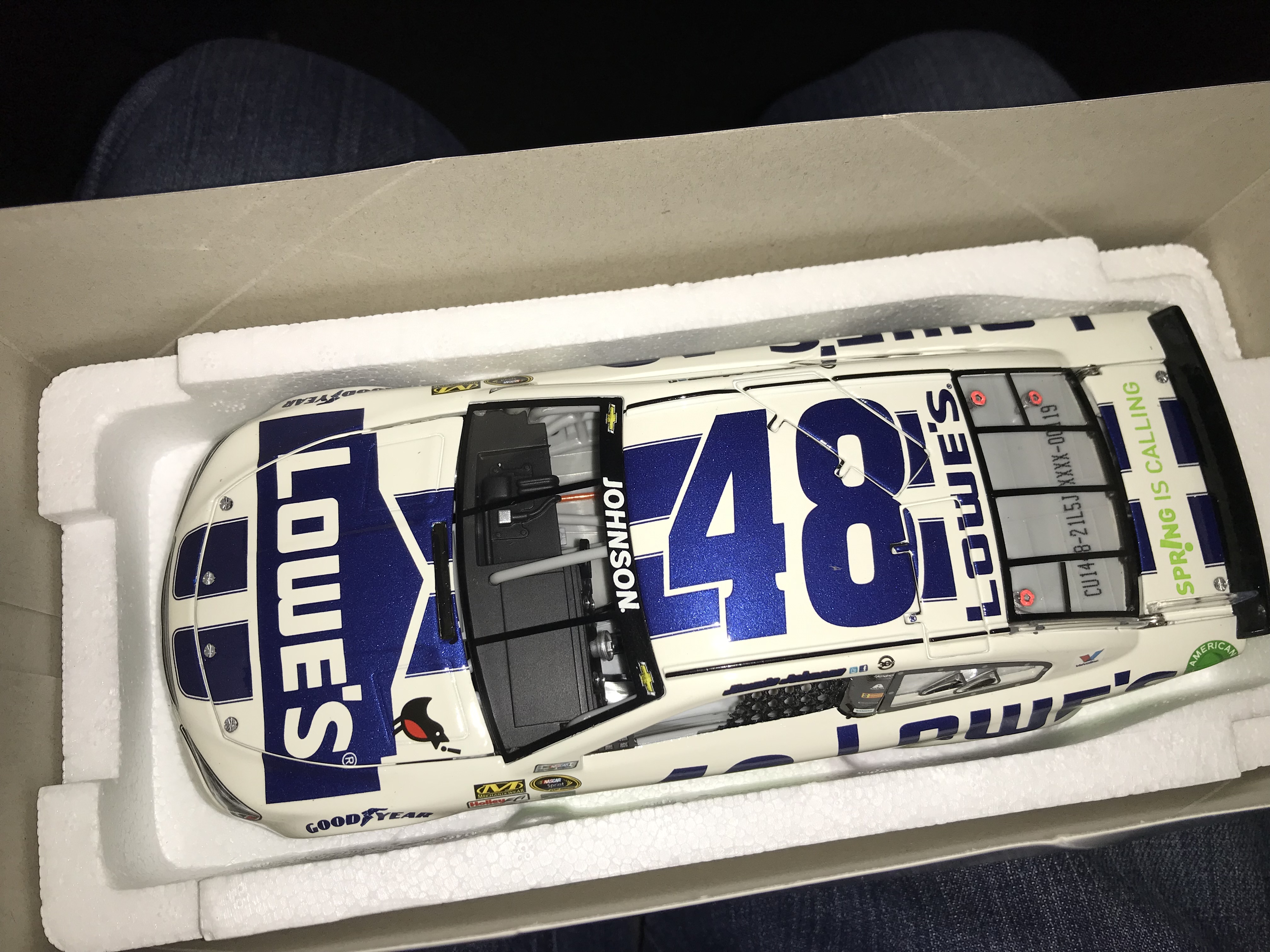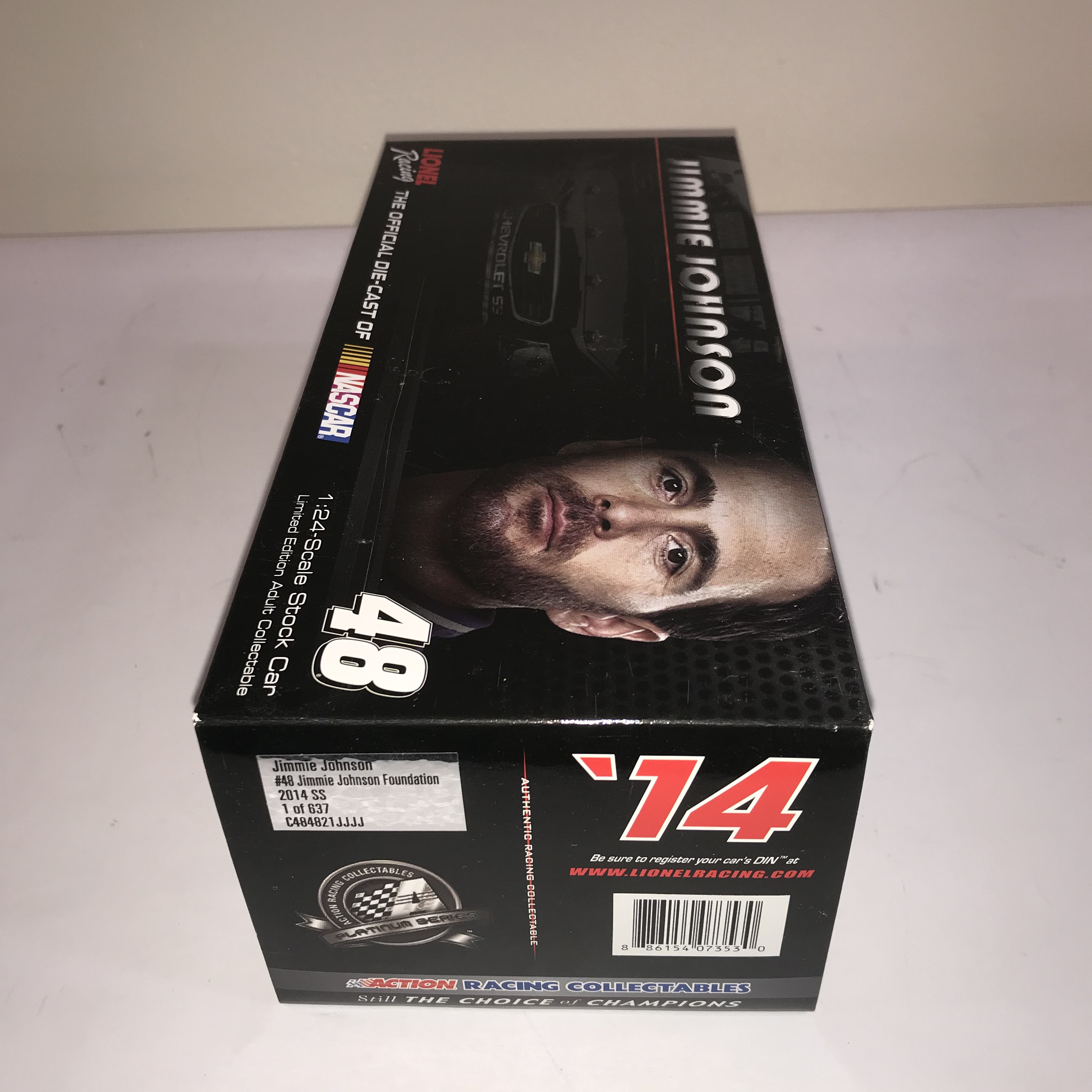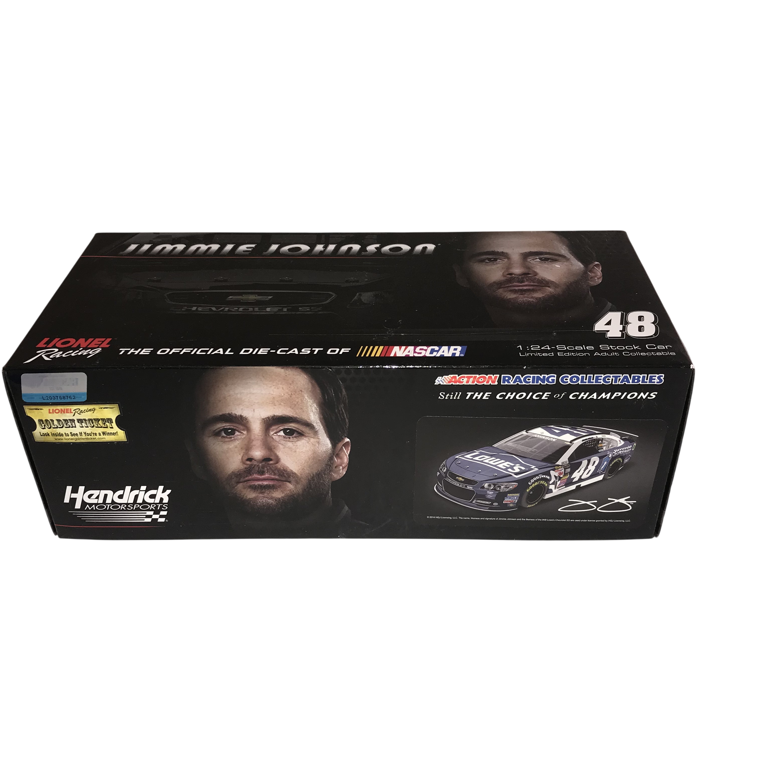 Lionel Racing Action Racing Collectables 1:24 scale stock car of Jimmie Johnson’s number 48 Chevrolet SS, 2014. This Platinum Series model features the Jimmie Johnson Foundation livery and is constructed of die-cast metal with plastic components. The original commemorative box includes a NASCAR holographic licensing sticker L203758762, a Lionel Racing Golden Ticket sticker, and a manufacturer label identifying it as one of 637 produced.
