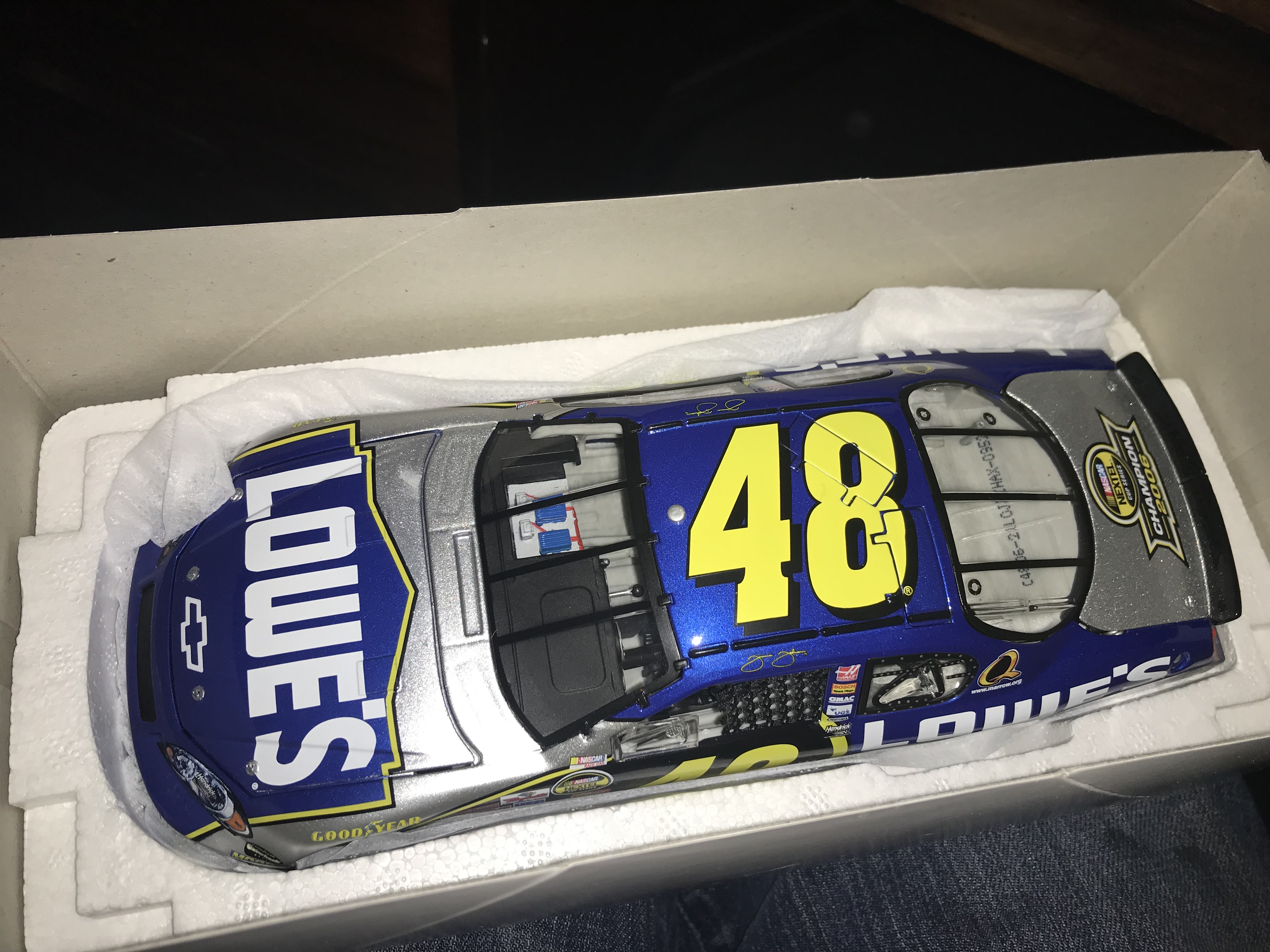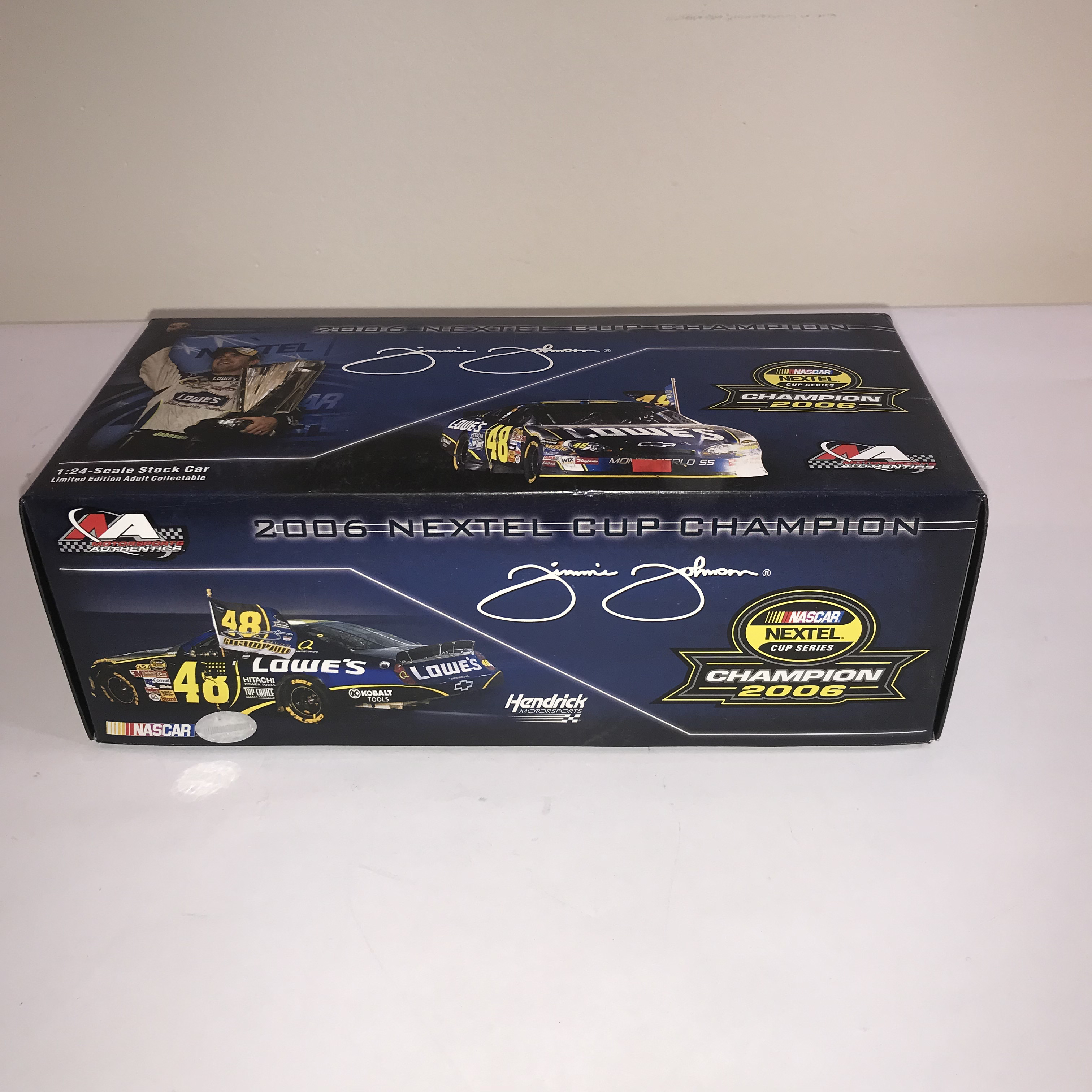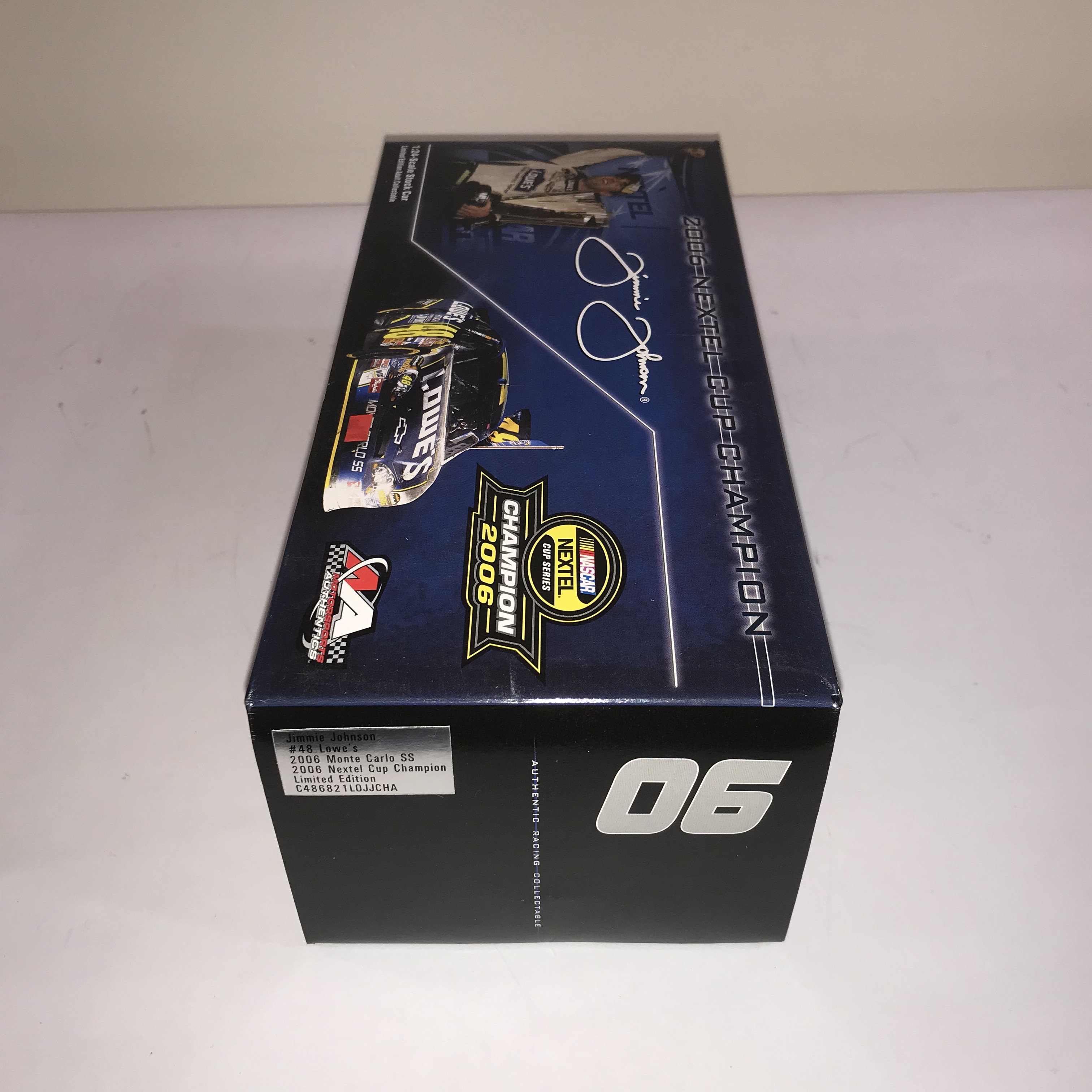 Motorsports Authentics 1:24 scale die-cast model of Jimmie Johnson’s #48 Lowe’s Chevrolet Monte Carlo SS, commemorating his 2006 NASCAR NEXTEL Cup Series Championship. The vehicle features authentic sponsor decals and is housed in its original commemorative packaging with driver imagery and facsimile signature. A factory label on the side panel identifies the model as a limited edition
