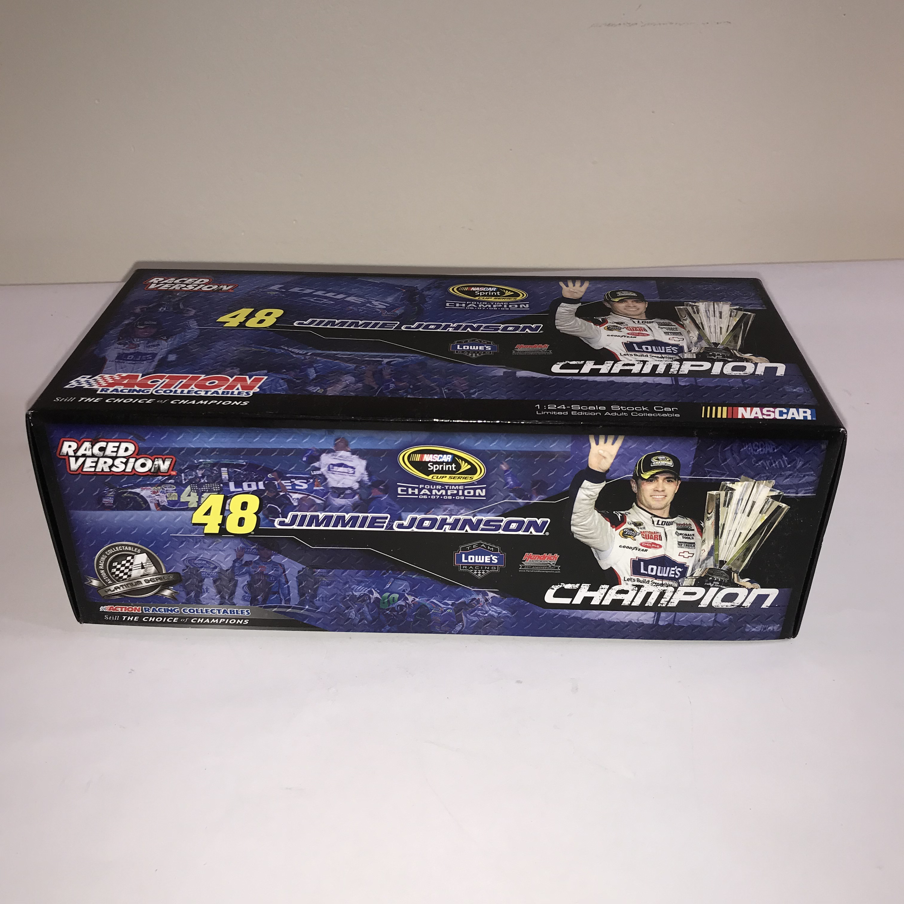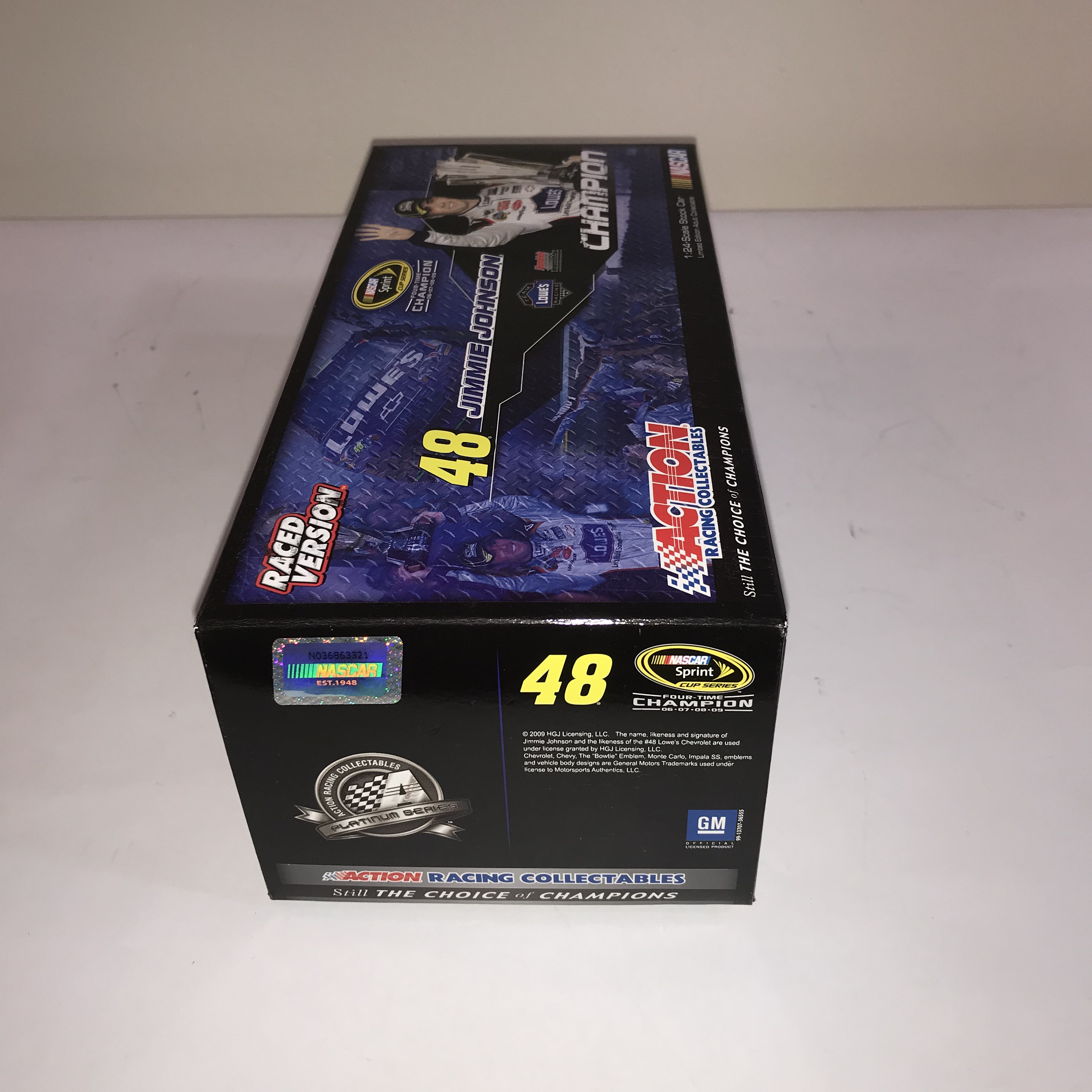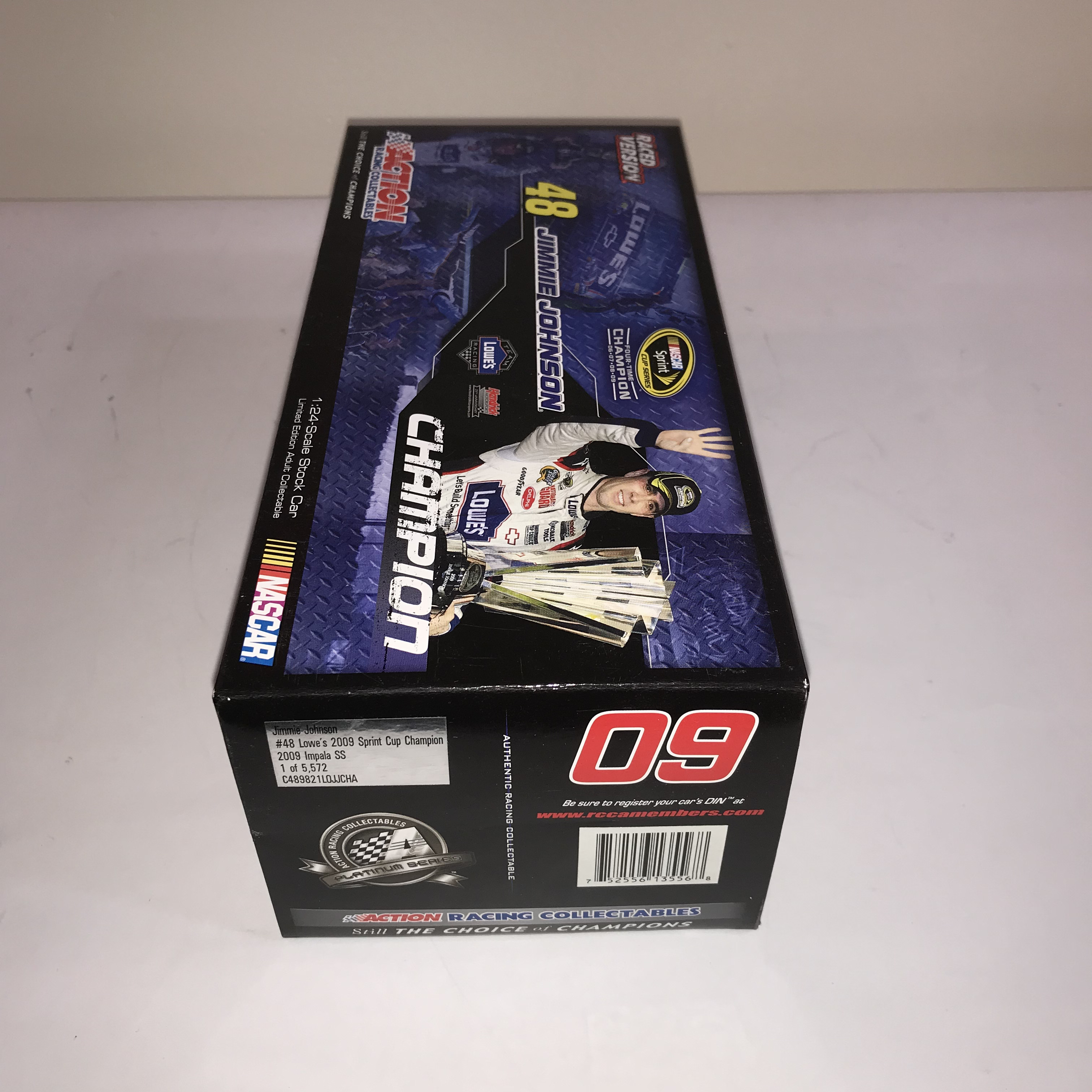 Action Racing Collectables Platinum Series 1:24 scale die-cast model of Jimmie Johnson’s #48 Lowe’s Chevrolet Impala SS. This Raced Version collectible commemorates Johnson’s 2009 NASCAR Sprint Cup Championship, marking his fourth consecutive title from 2006 to 2009. The box side panel identifies this as a limited edition production, specifically numbered 1 of 5,572