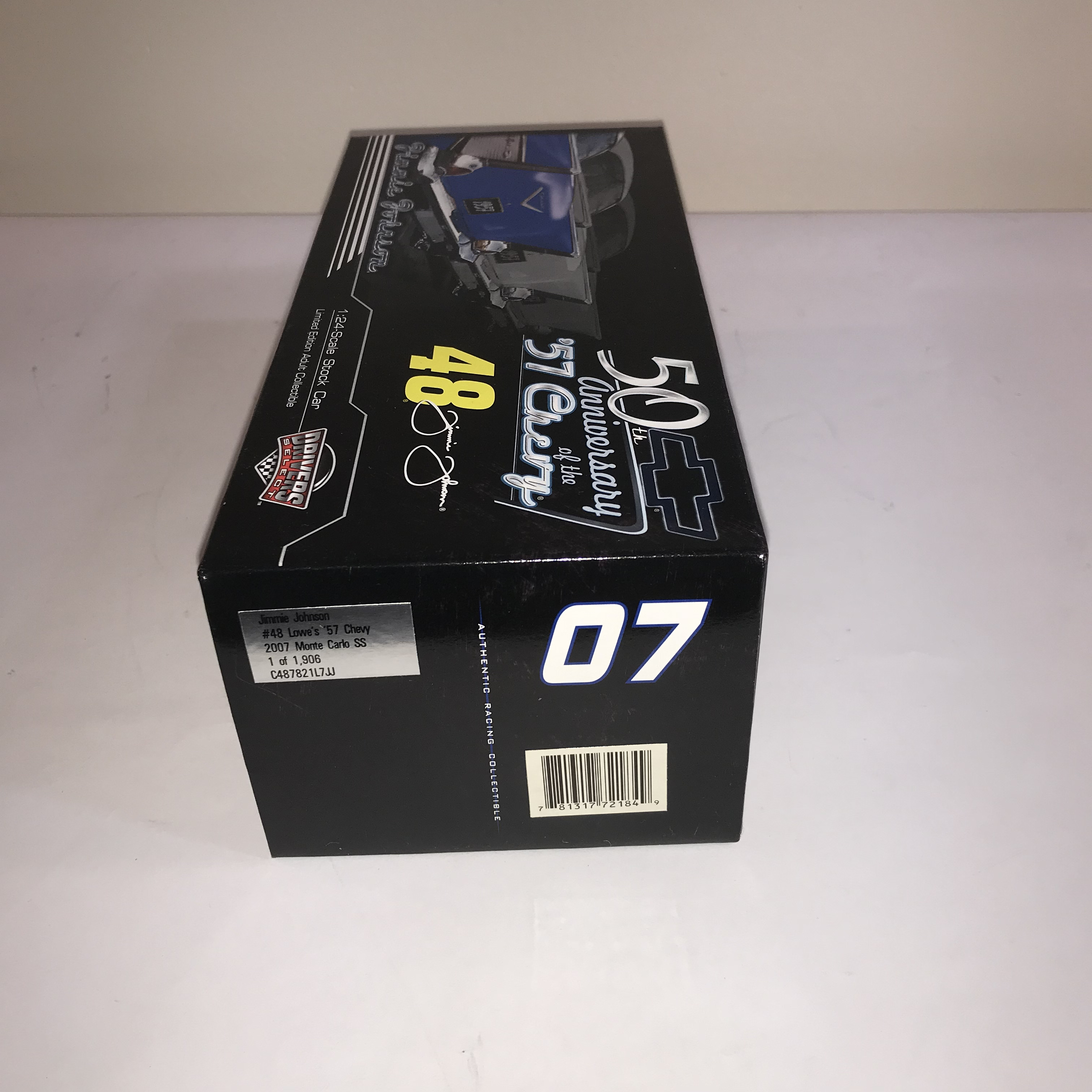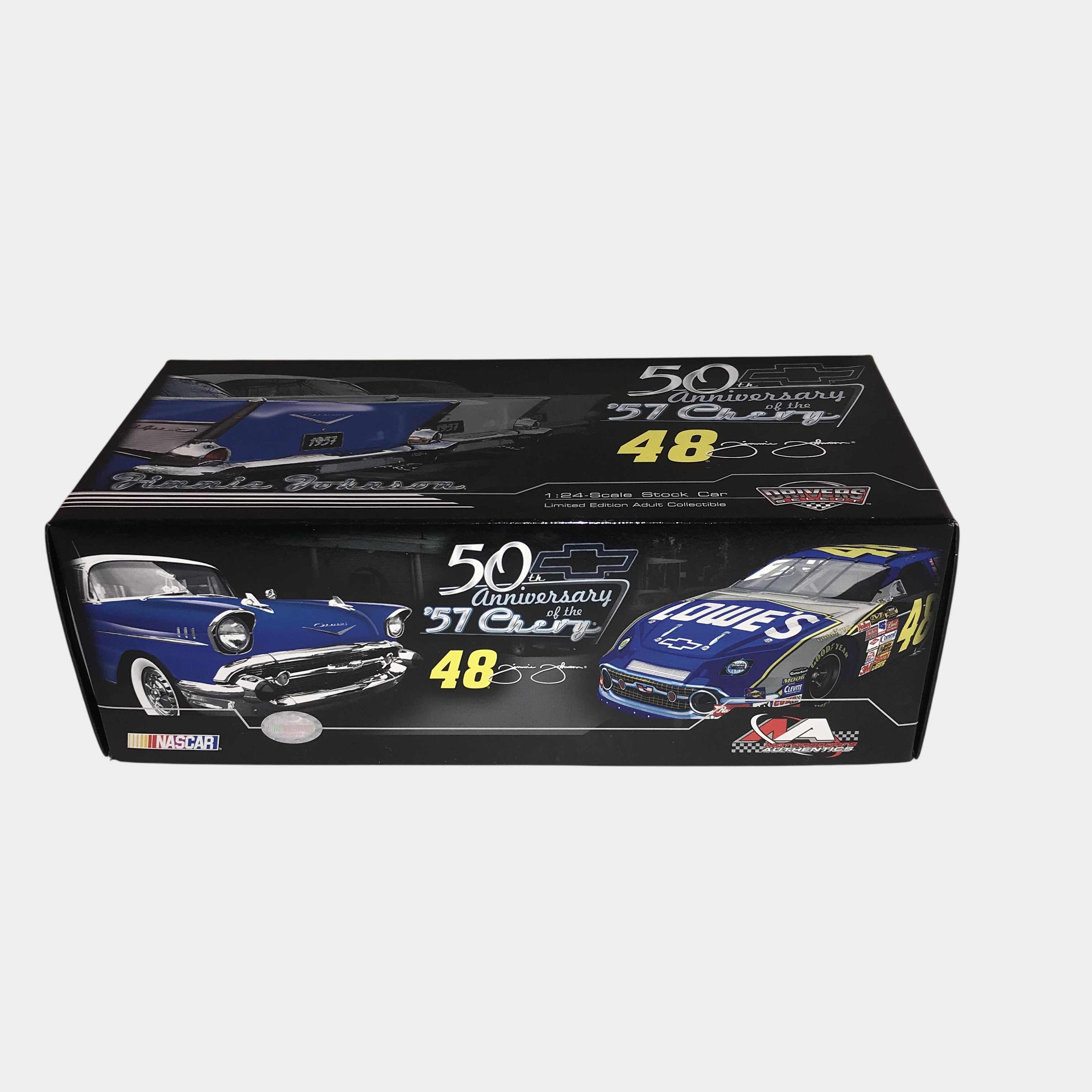 Motorsports Authentics Drivers Select 1:24 scale die-cast model of the Jimmie Johnson #48 Lowe’s Chevrolet Monte Carlo SS. The vehicle features a tribute paint scheme commemorating the 50th anniversary of the 1957 Chevrolet. limited edition, numbered 1 of 1,906,