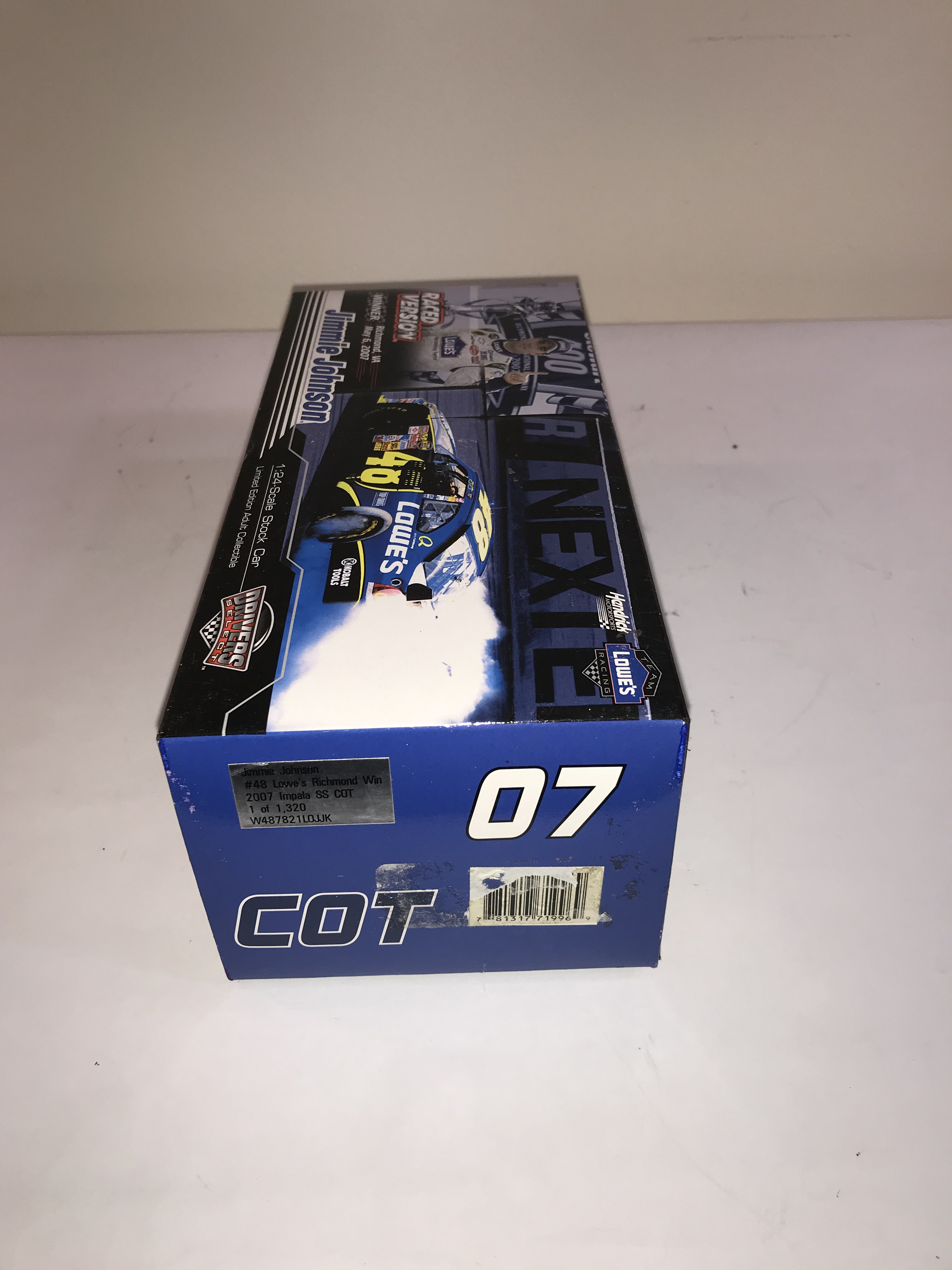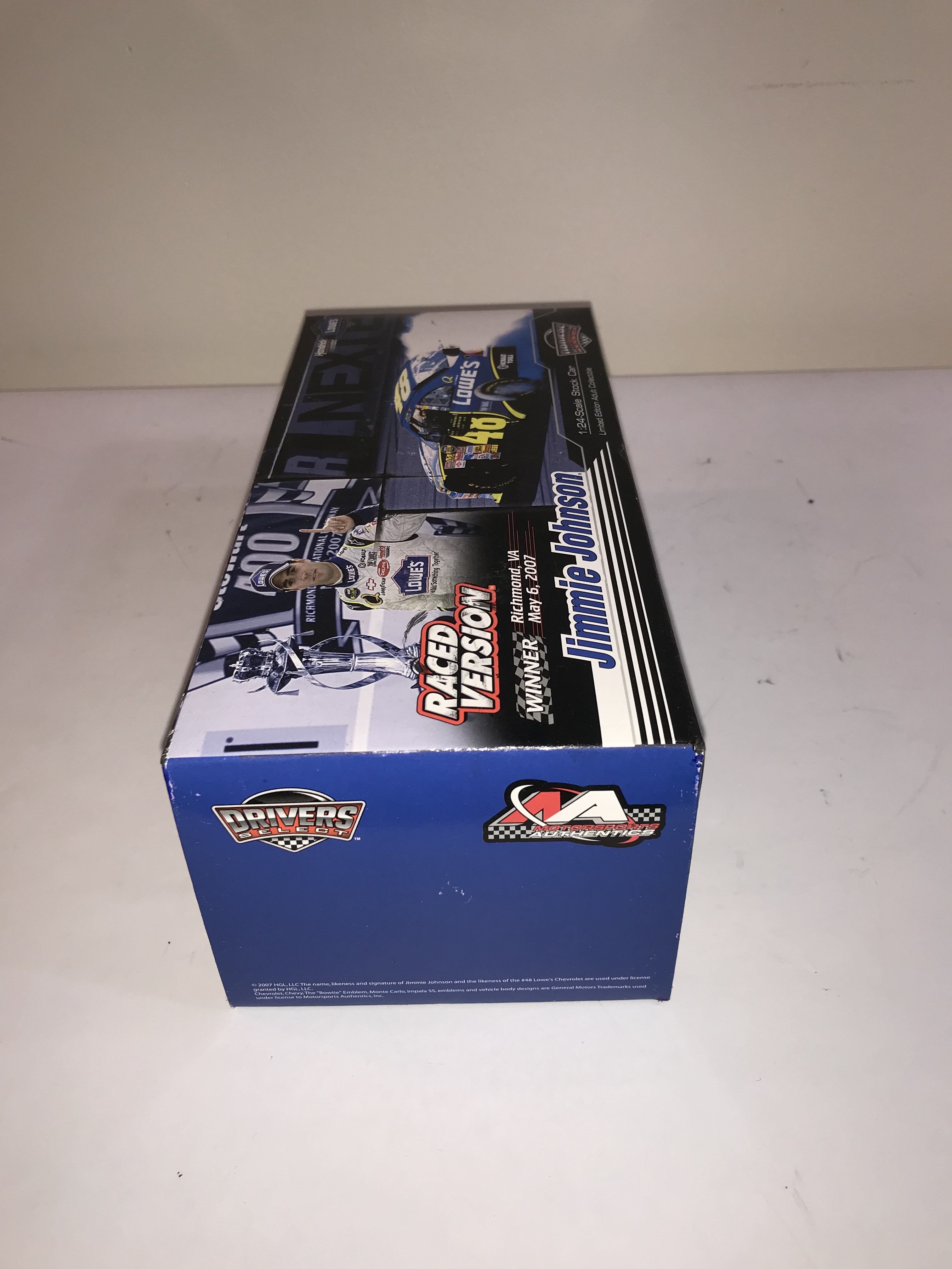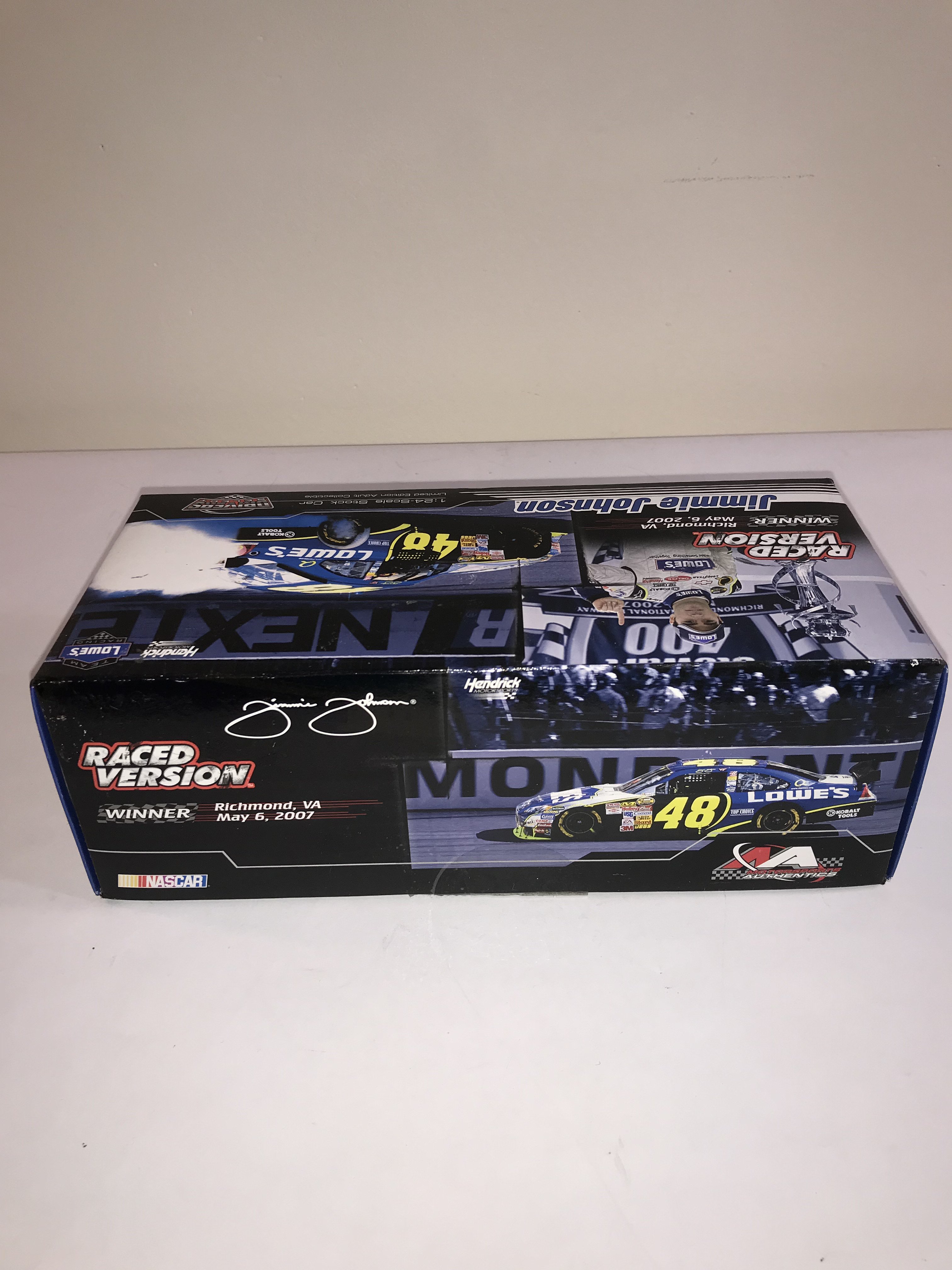 Motorsports Authentics Drivers Select 1:24 scale die-cast model of Jimmie Johnson’s number 48 Lowe’s Chevrolet Impala SS Car of Tomorrow. The model is a Raced Version commemorating Johnson’s victory at Richmond International Raceway on May 6, 2007. As a Raced Version, the vehicle features simulated track debris, tire rubs, and race-day grime as seen in victory lane. The item is a limited edition 1 of 1,320. A NASCAR holographic authentication sticker is affixed to the front of the box.