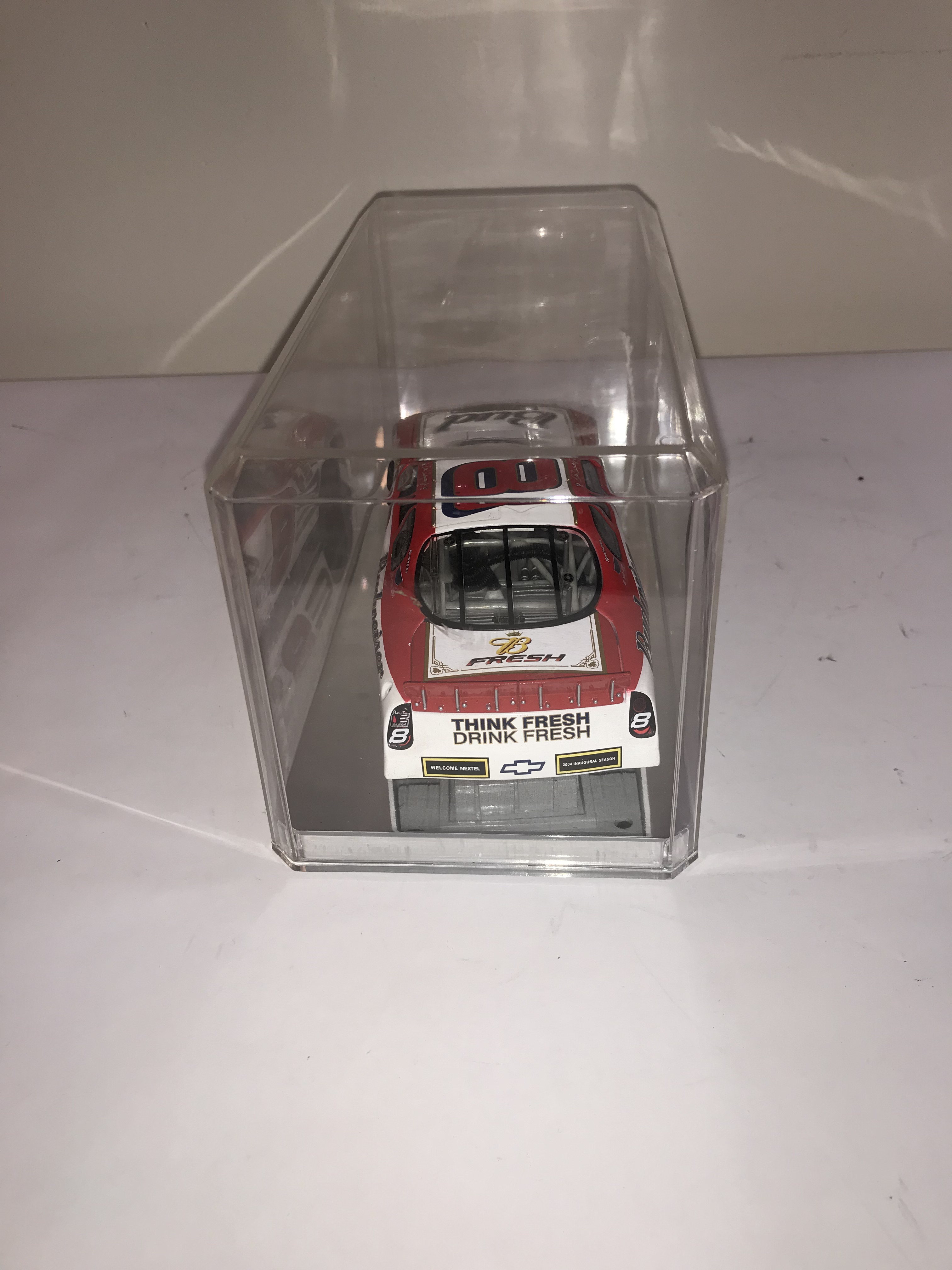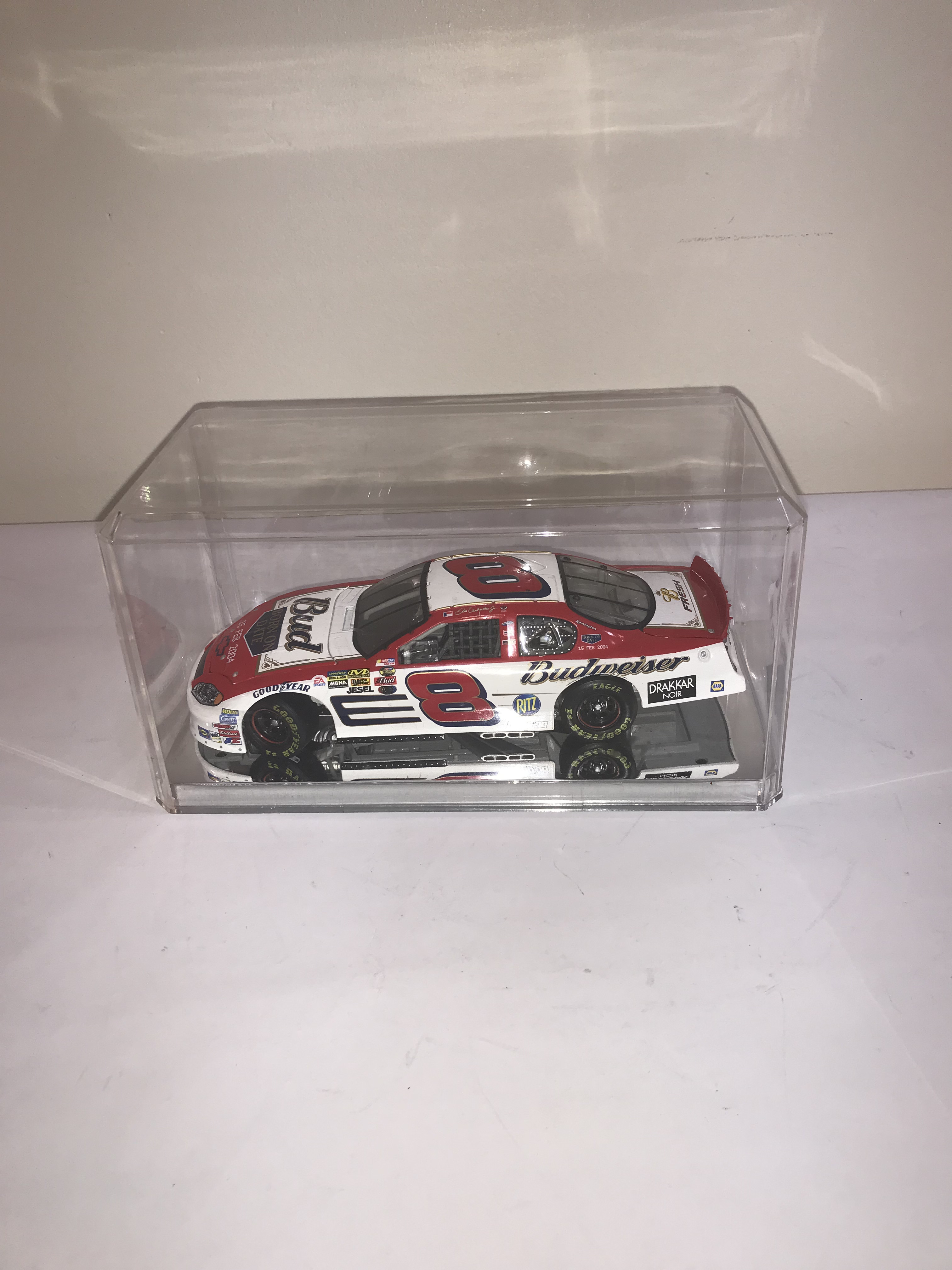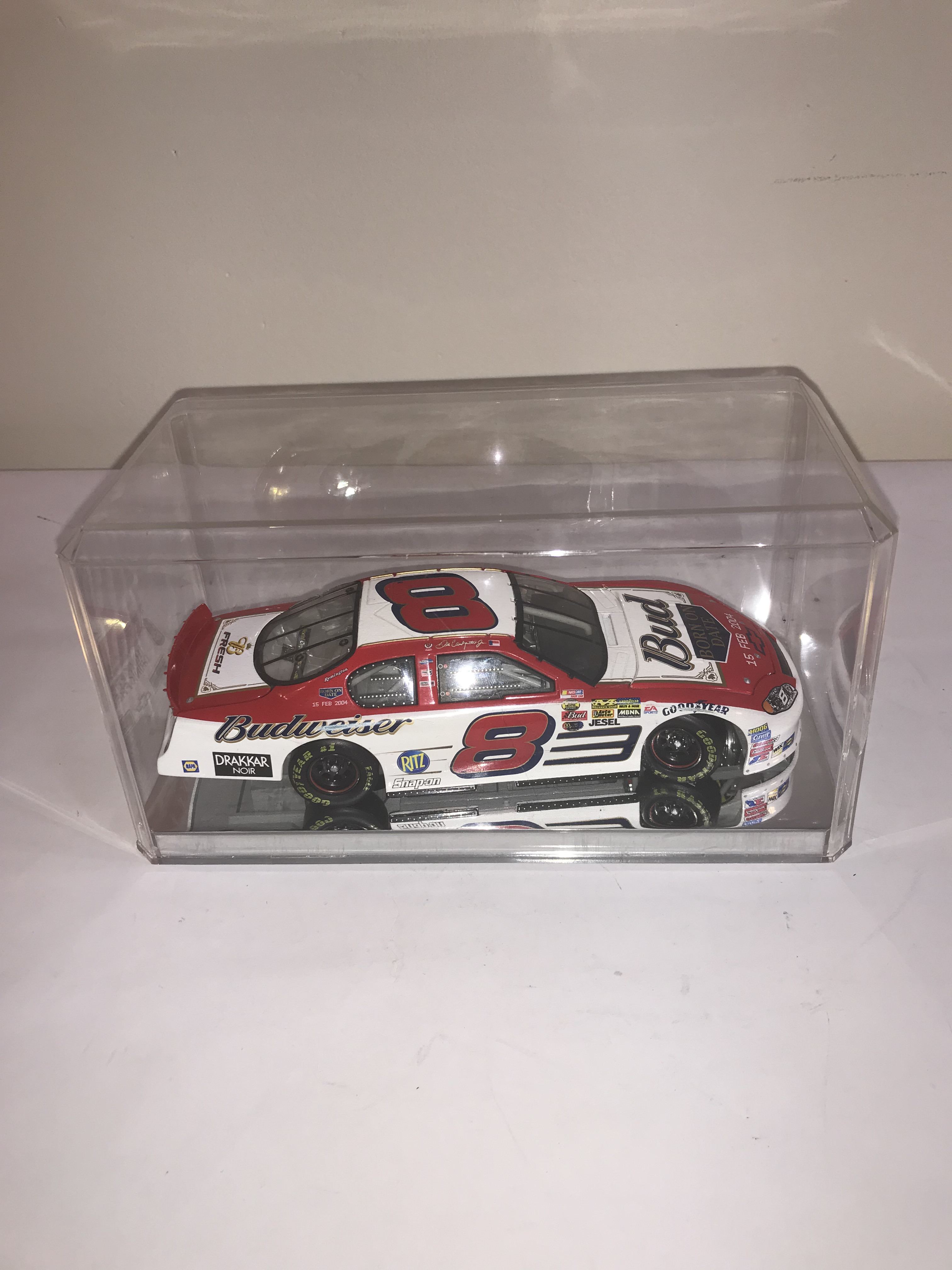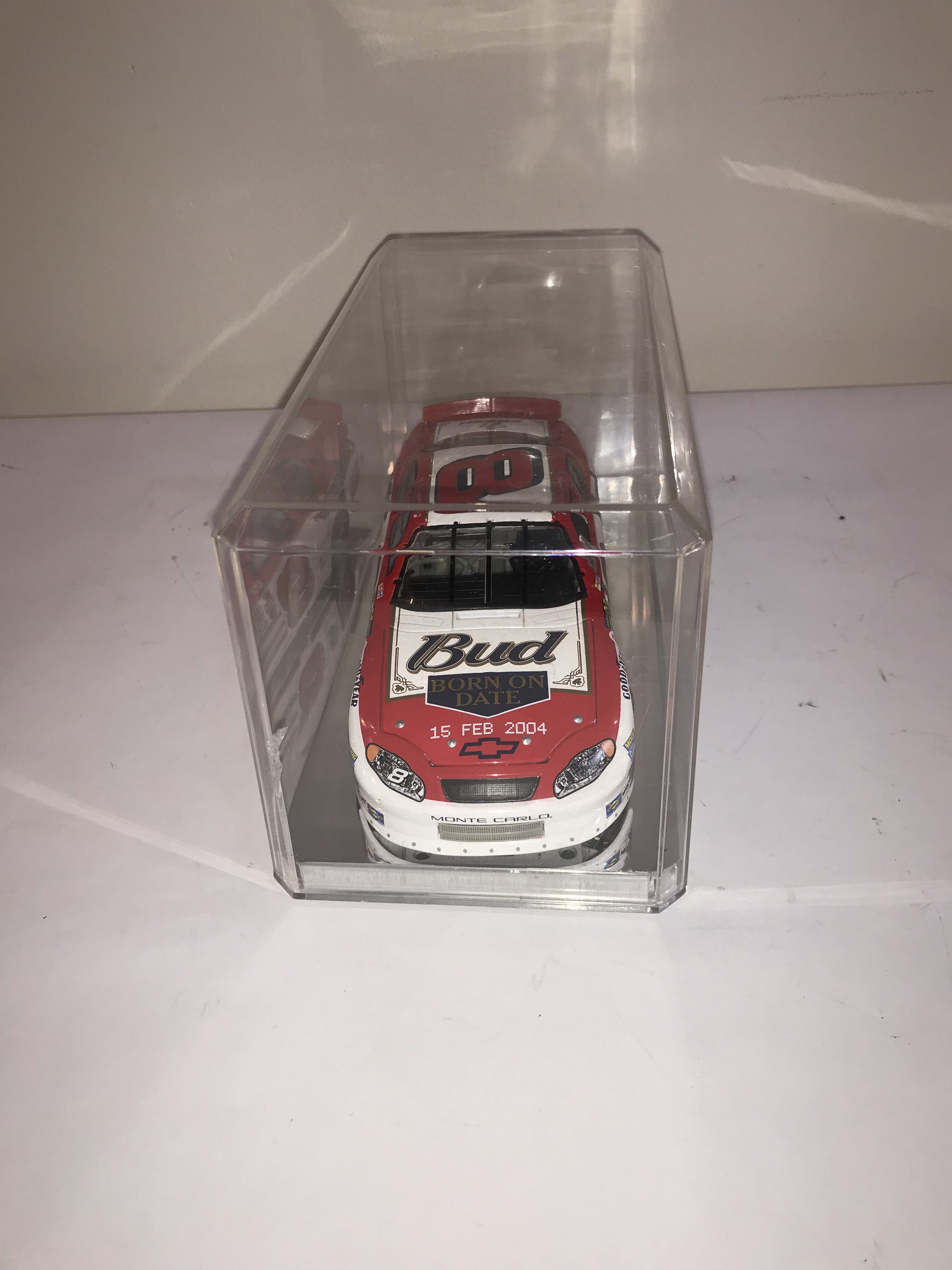 Raced Version 1:24 scale die-cast model produced by Action Performance representing the number 8 Budweiser Chevrolet Monte Carlo driven by Dale Earnhardt Jr. during the 2004 NASCAR season. This model features the special Born On Date livery for February 15, 2004, corresponding to the date of the Daytona 500. The roof features the driver signature and the number 8. The model is presented on a mirrored base within a clear acrylic display case.