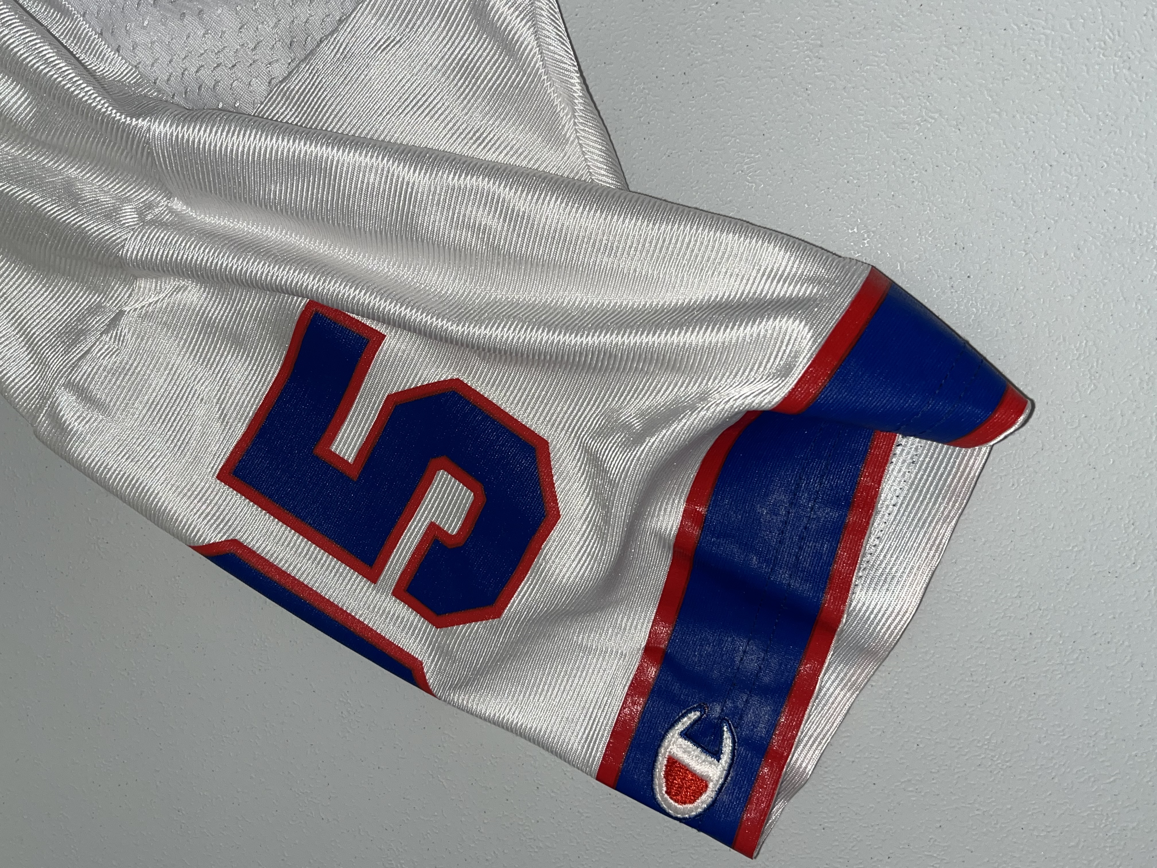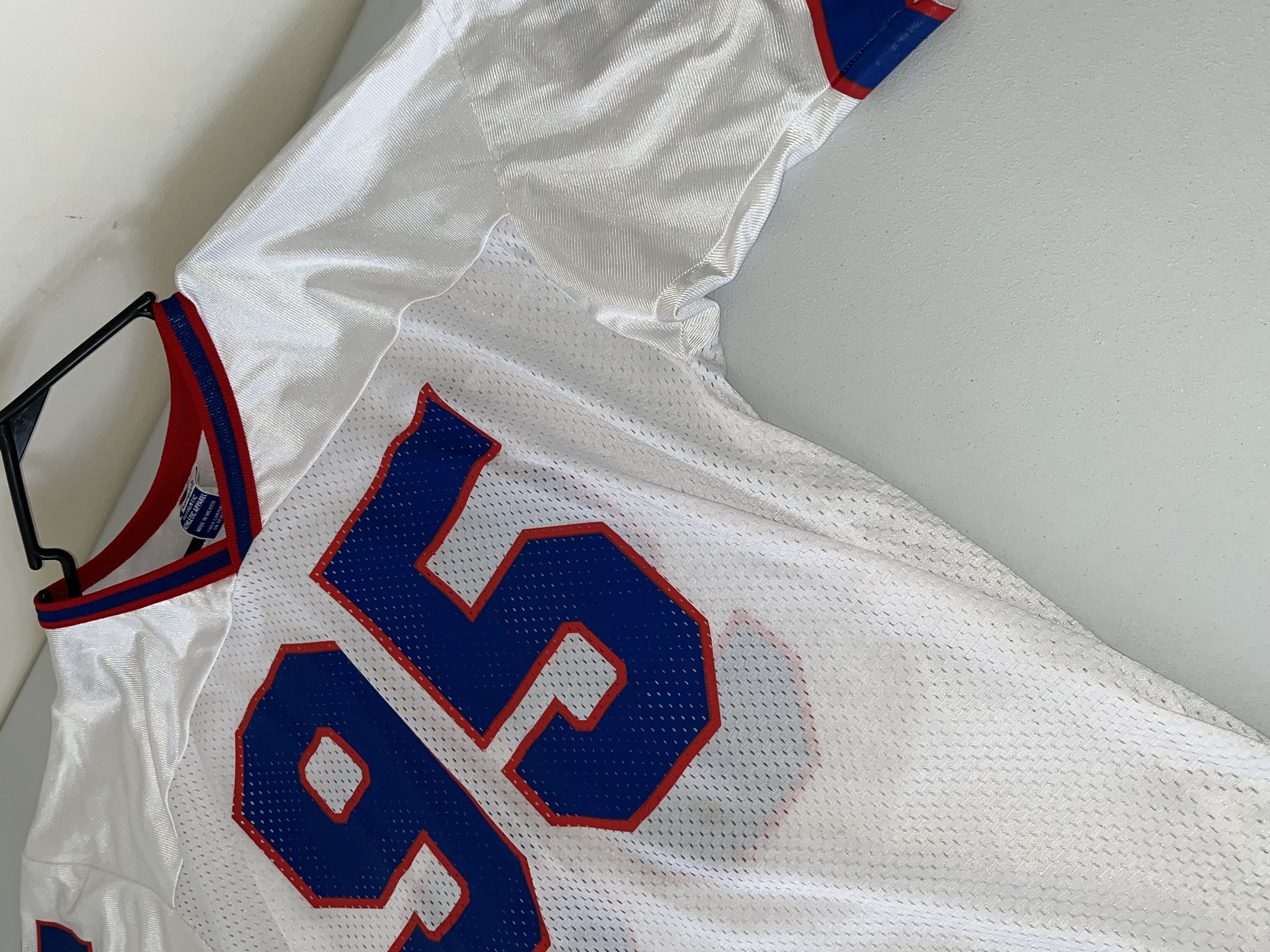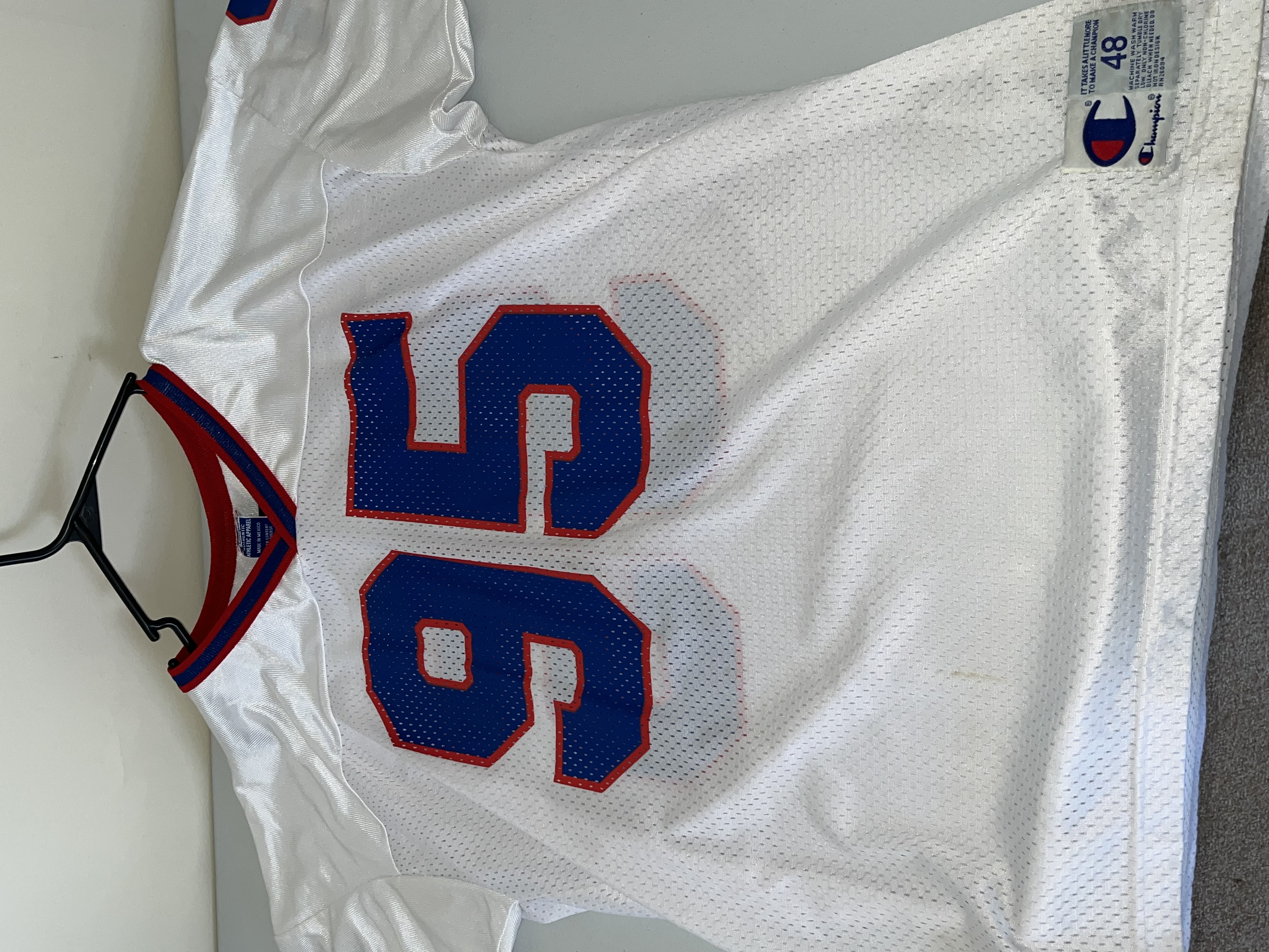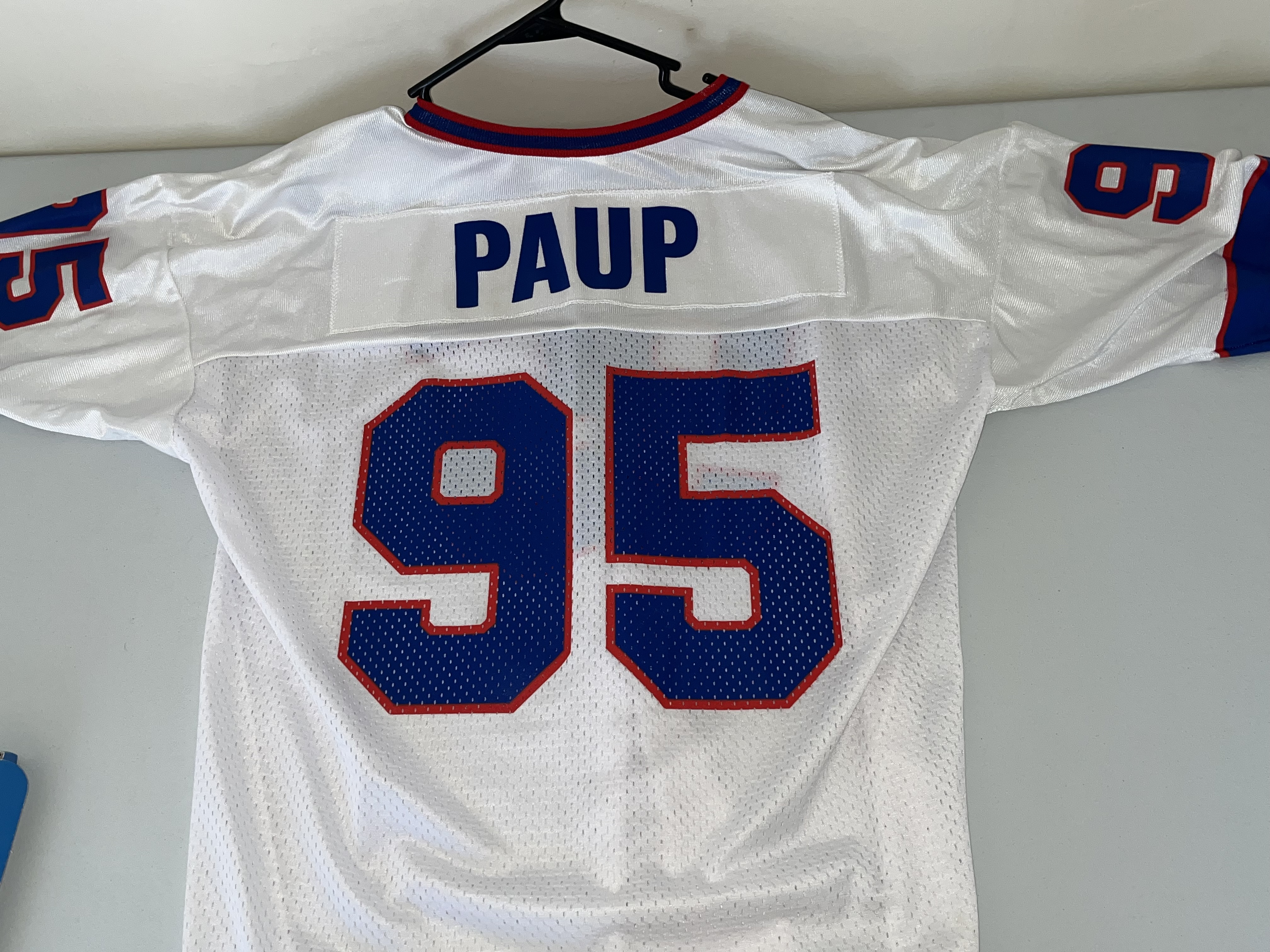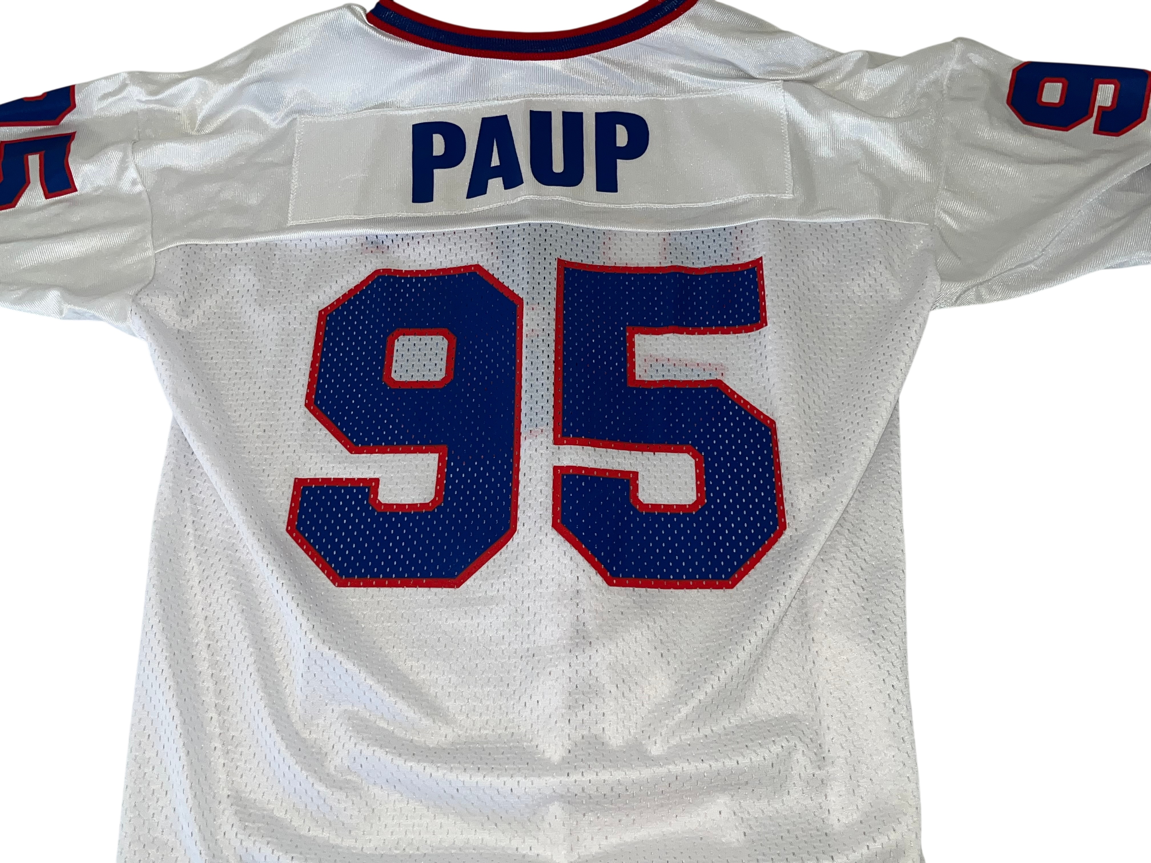 This is a vintage 1990s Buffalo Bills “away” white jersey featuring former Pro Bowl linebacker and 1995 NFL Defensive Player of the Year, Bryce Paup. The jersey is manufactured by Champion and is a high-quality retail replica from the mid-to-late 1990s. The garment is constructed with a white mesh body and solid fabric on the shoulders and sleeves. It features Paup’s number “95” screen-printed in blue with a red border on the front, back, and shoulders. The player’s name, “PAUP,” is printed in blue block lettering on a white nameplate sewn onto the upper back. The jersey is finished with a red and blue striped V-neck collar and matching sleeve cuffs.