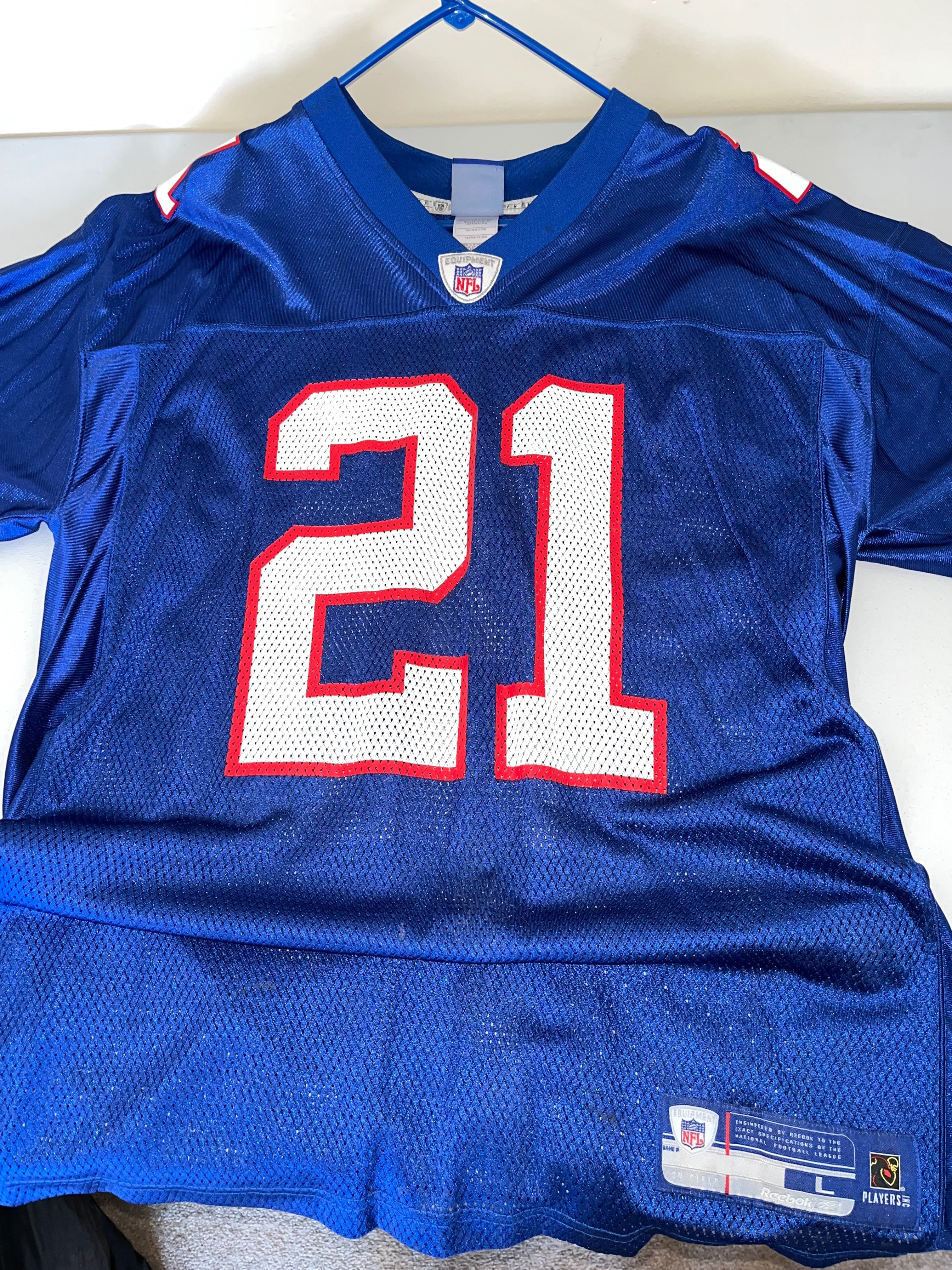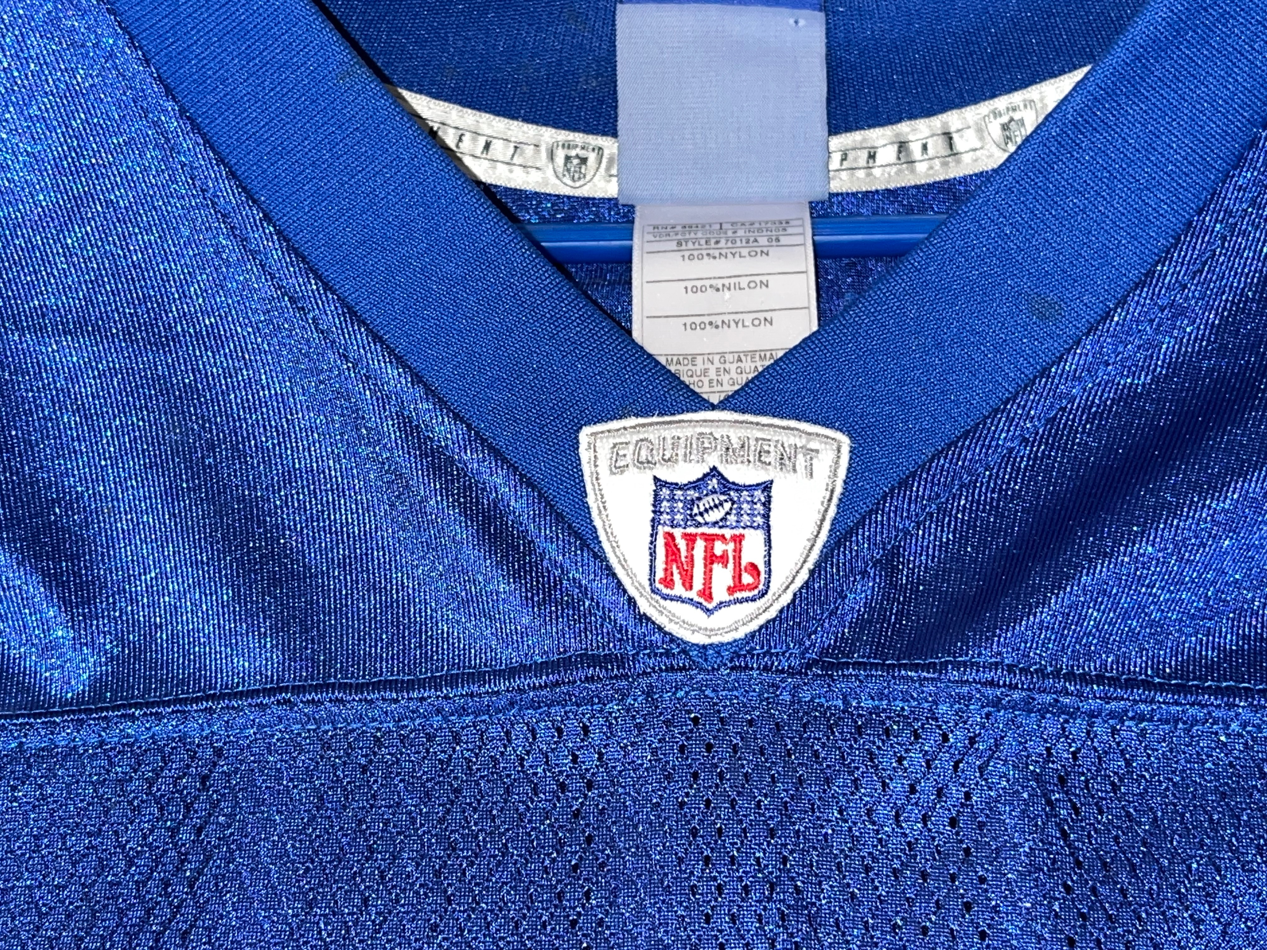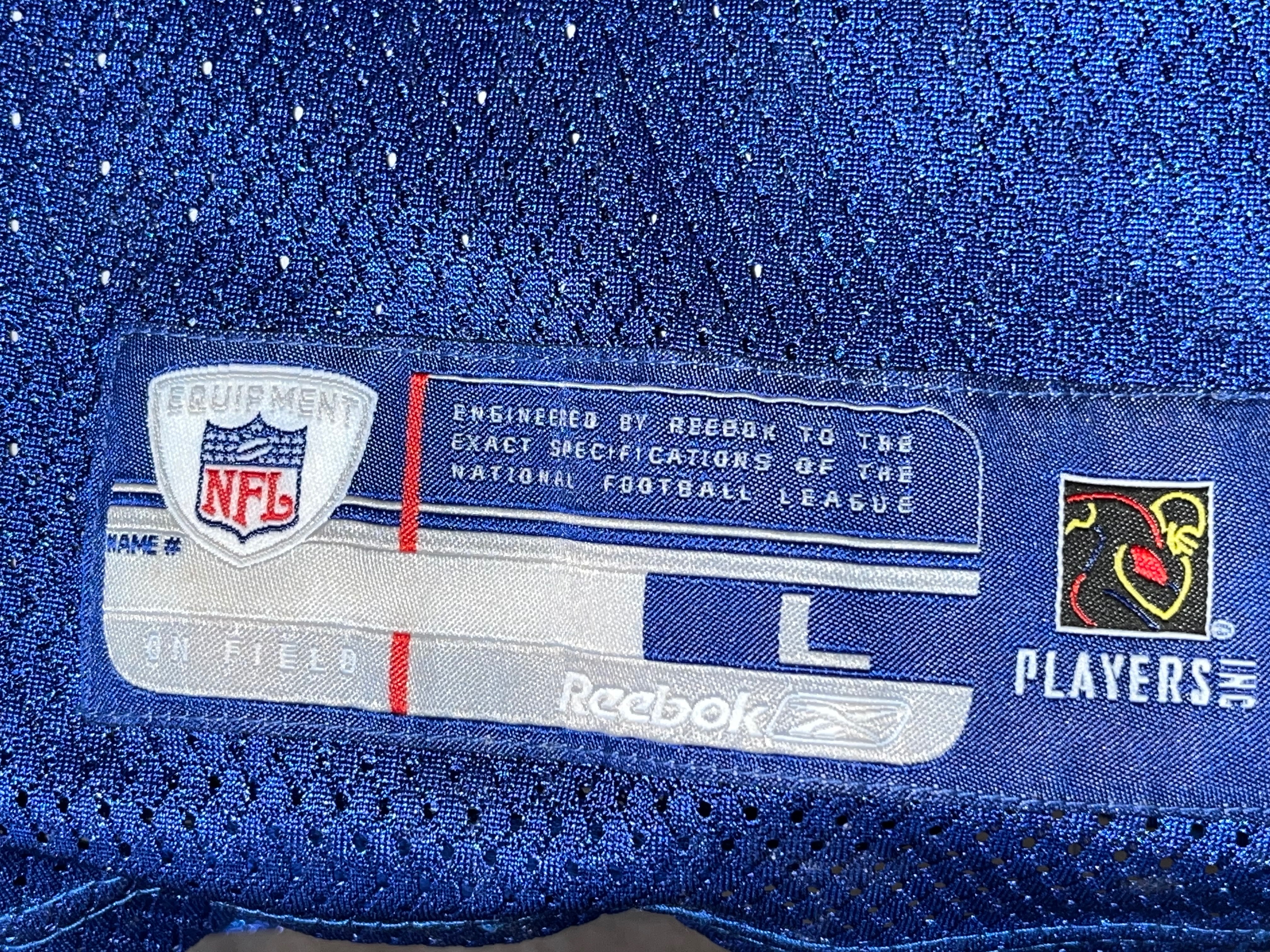 Willis McGahee Buffalo Bills royal blue replica jersey by Reebok, circa 2003-2006. Features screen-printed nameplate and number 21 on a 100% nylon mesh body with an embroidered NFL shield at the collar. Retail garment, size Large, with original Reebok NFL Equipment jock tag.