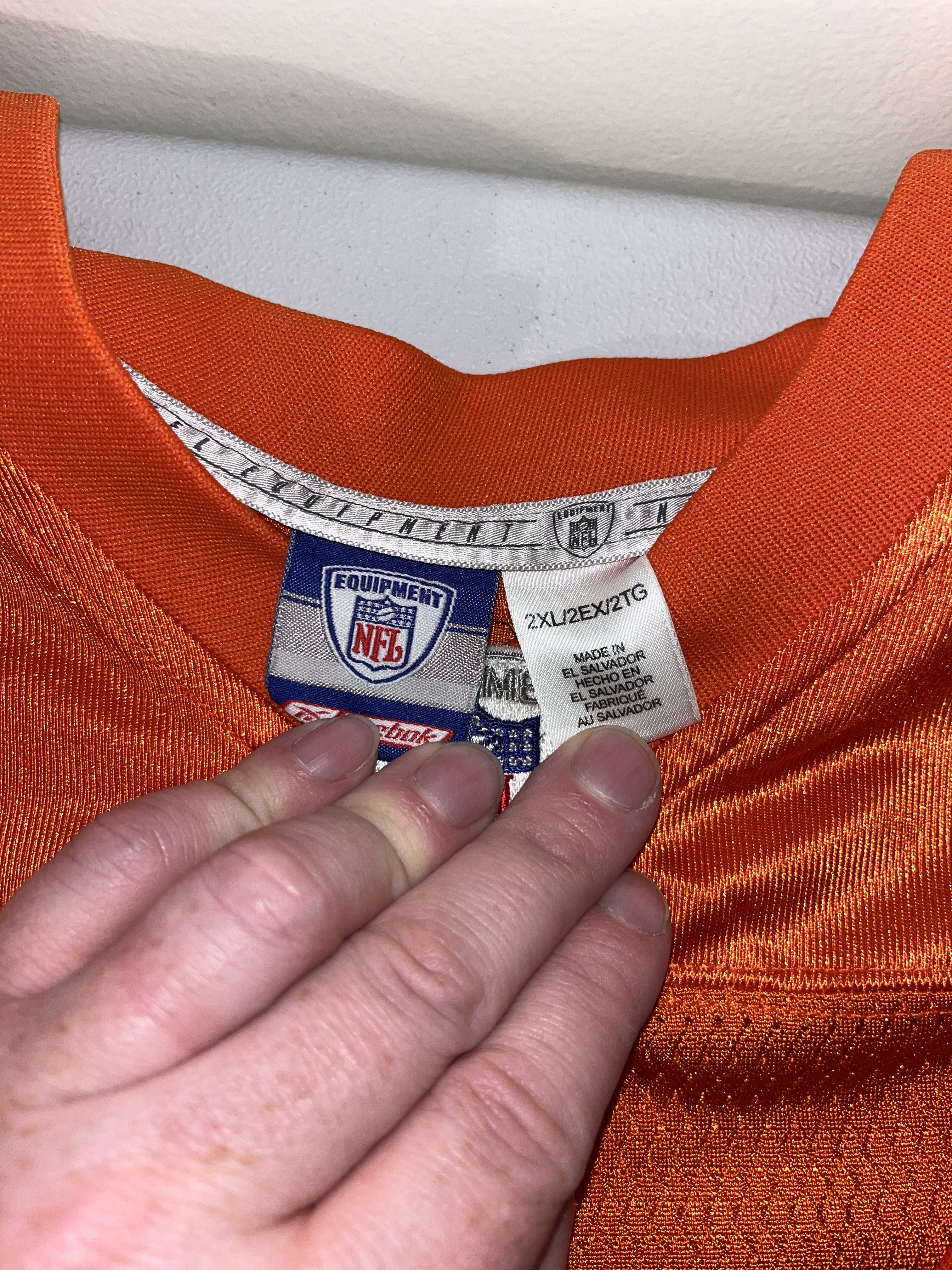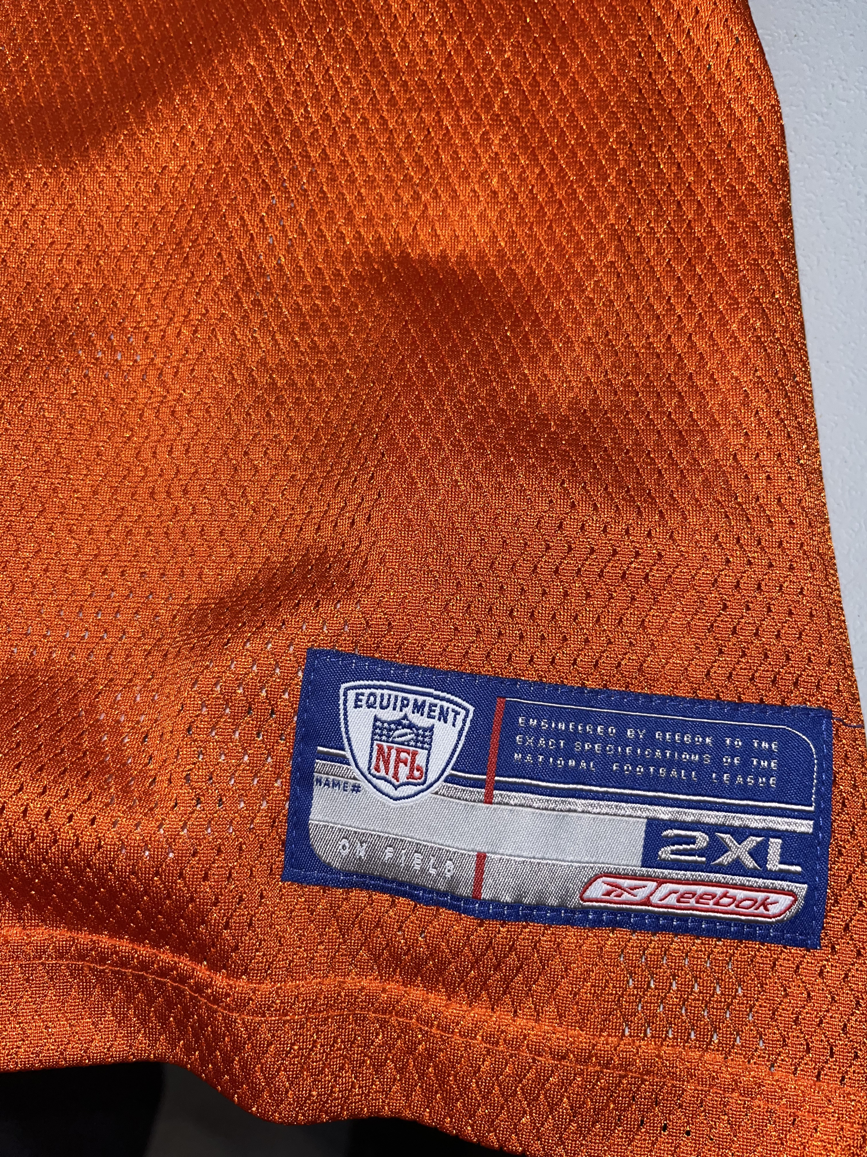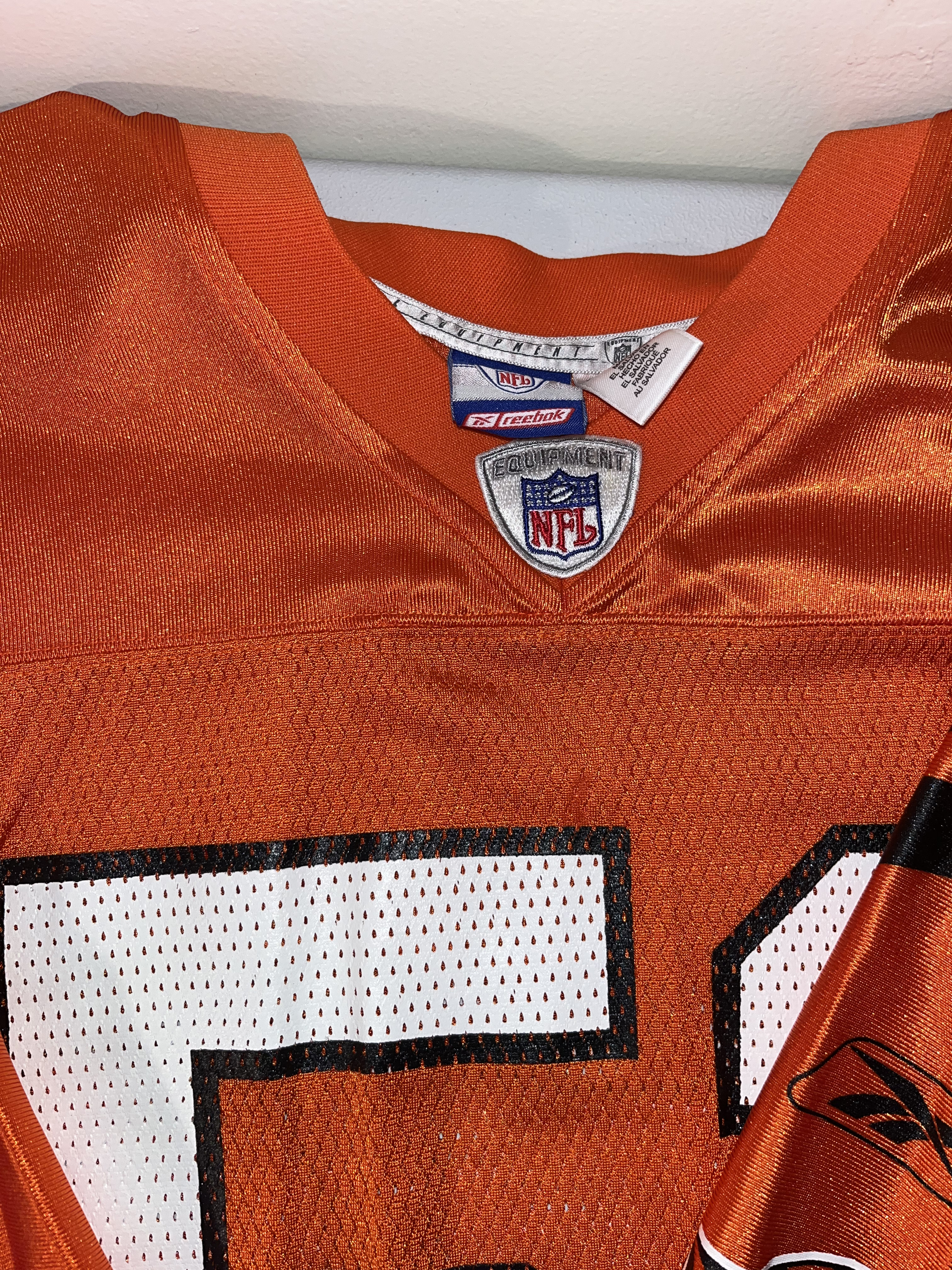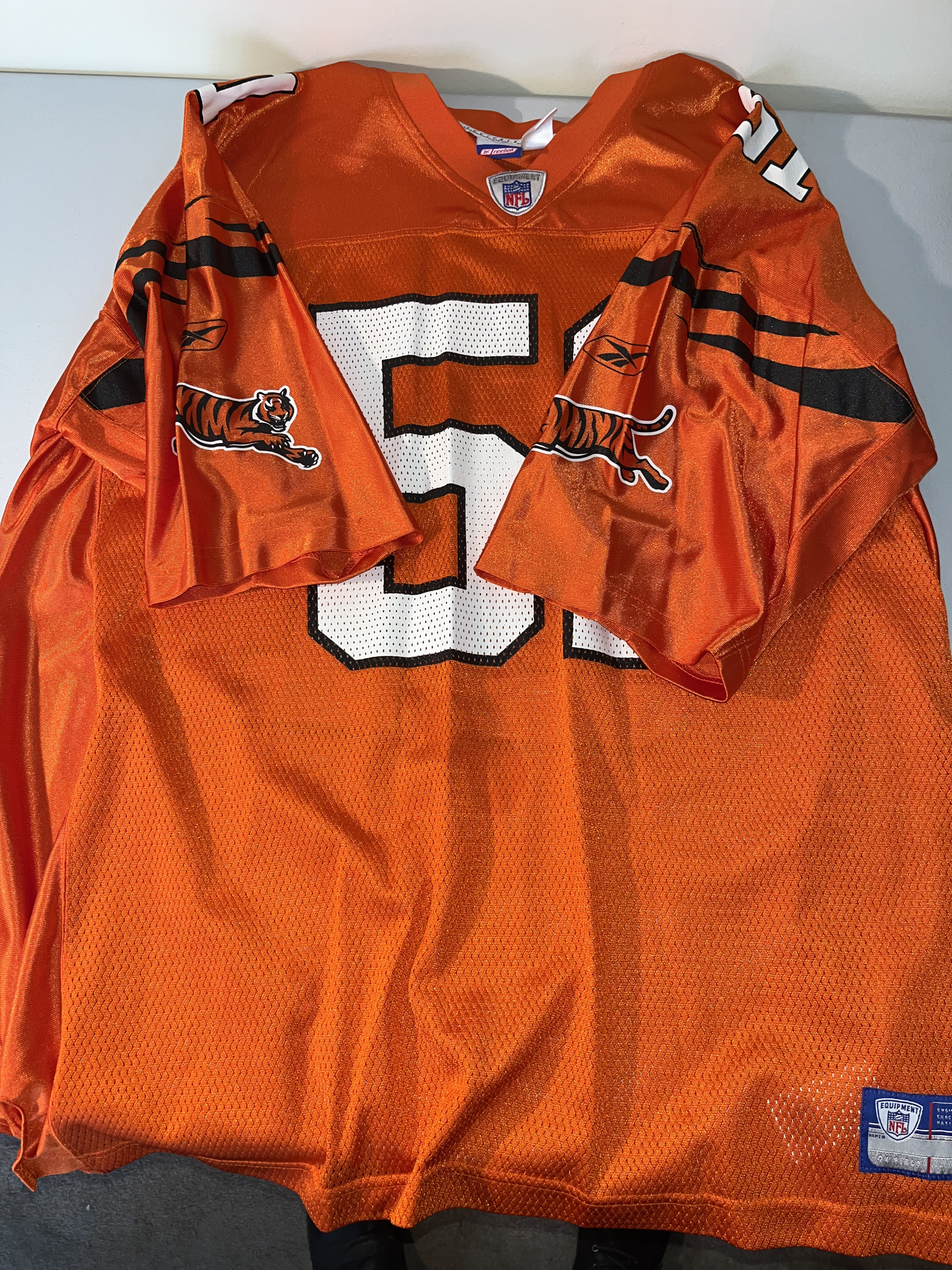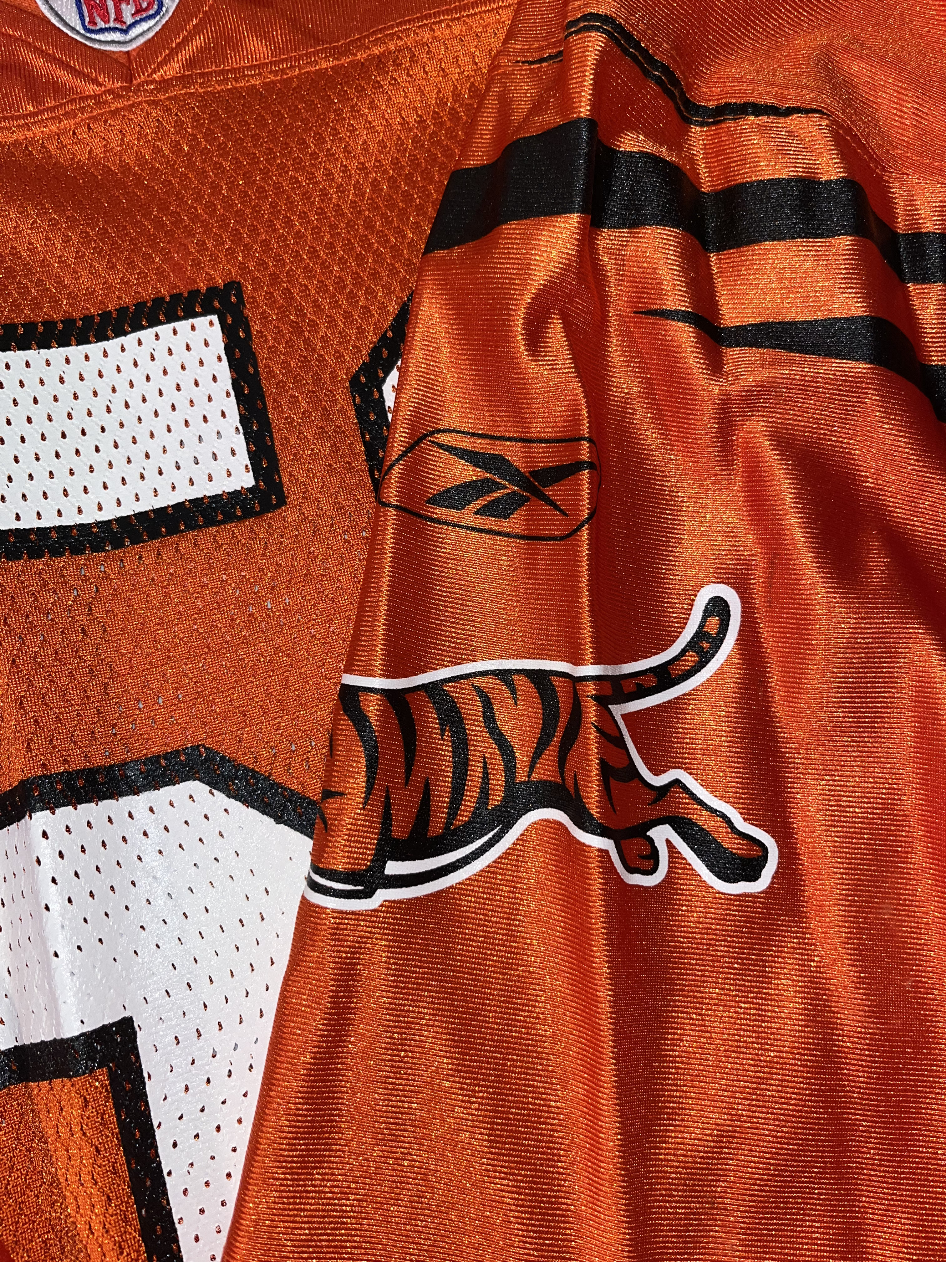 This is a Reebok NFL Equipment On Field replica jersey for linebacker Takeo Spikes of the Cincinnati Bengals. Spikes was a cornerstone of the Bengals defense from 1998 to 2002. The jersey is designed in the team’s signature orange color with black tiger stripe patterns on the shoulders and the jumping tiger logo on both sleeves.