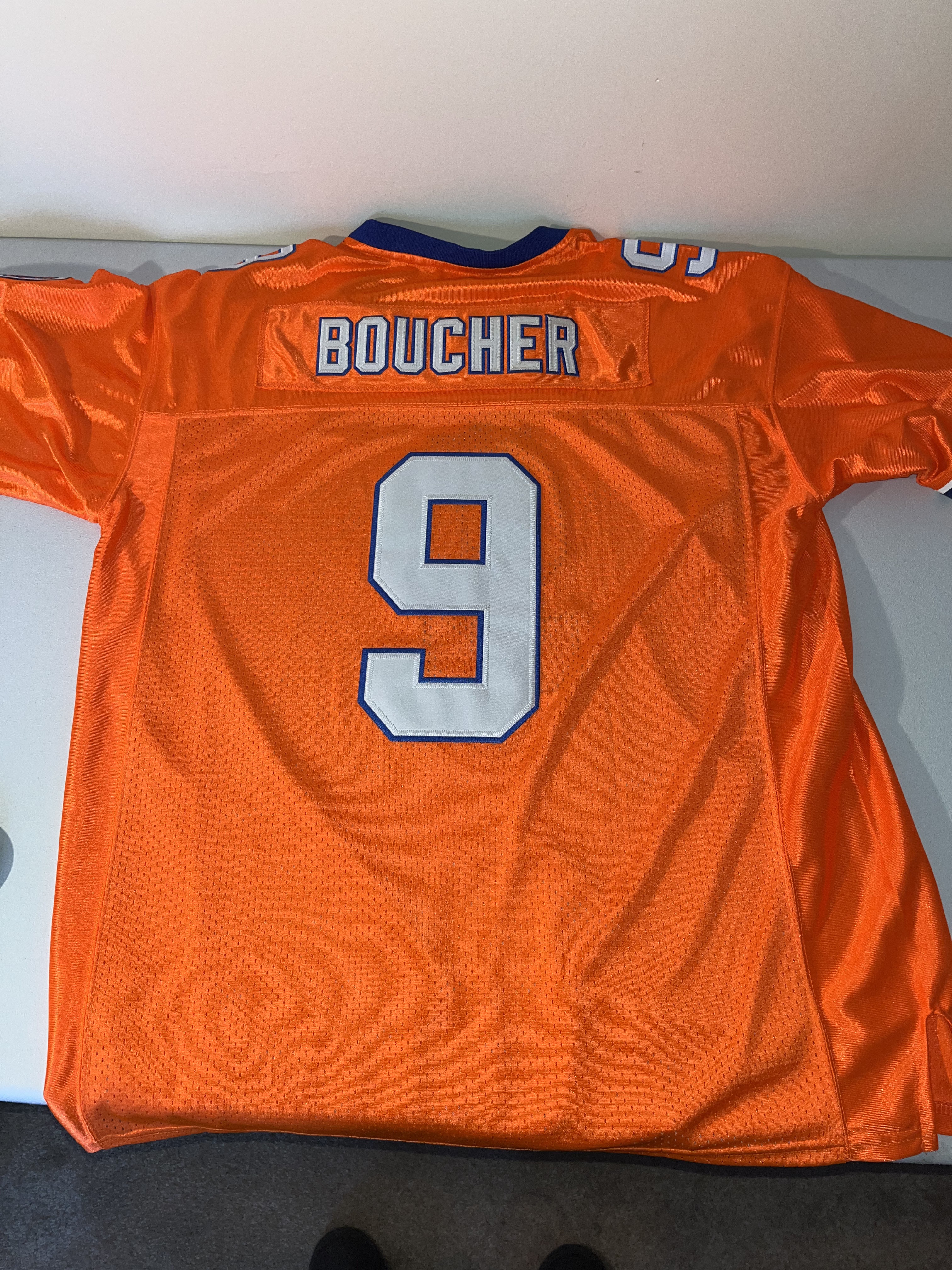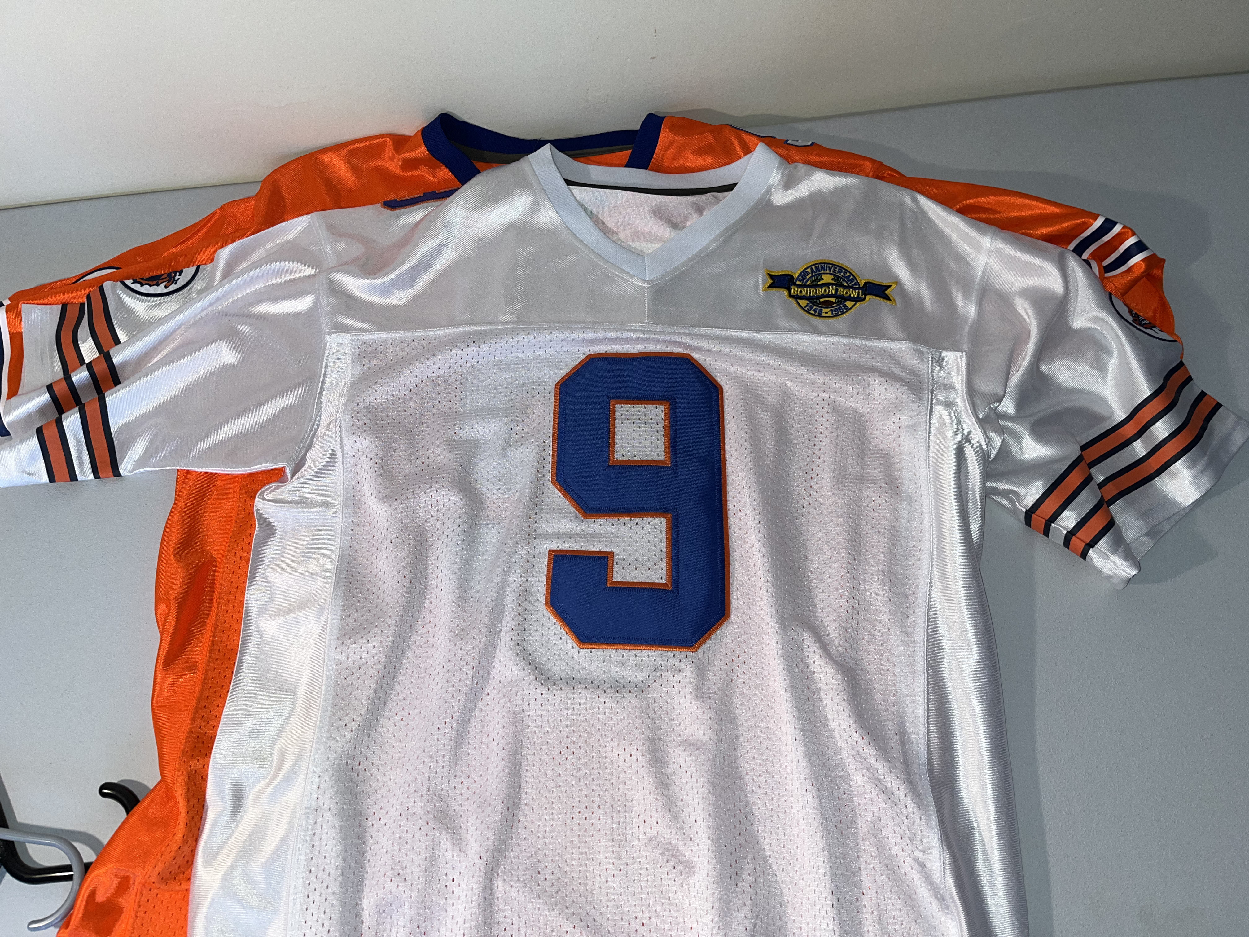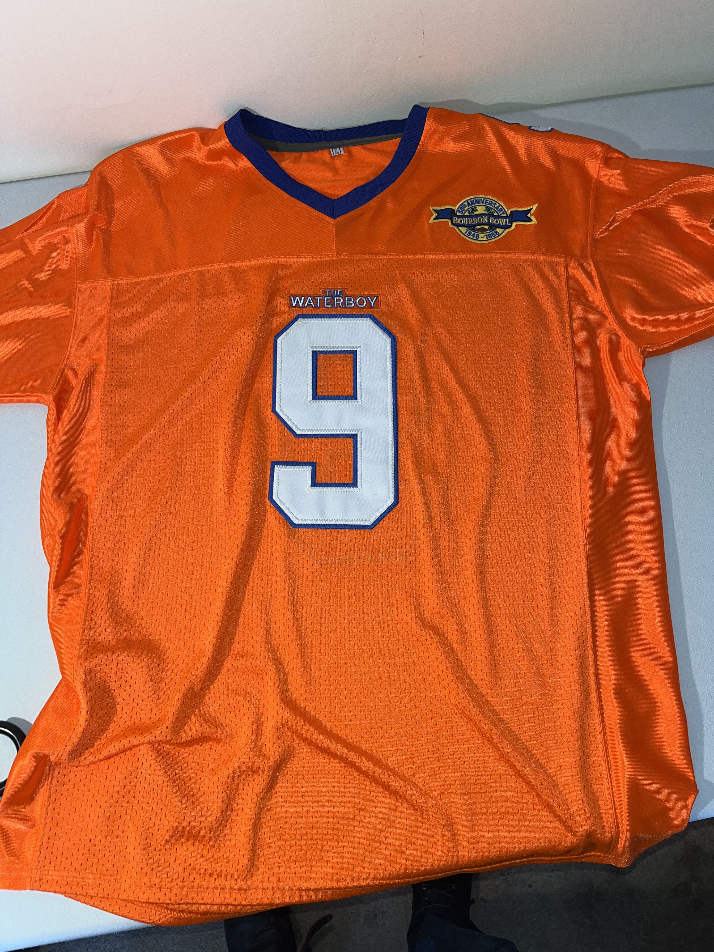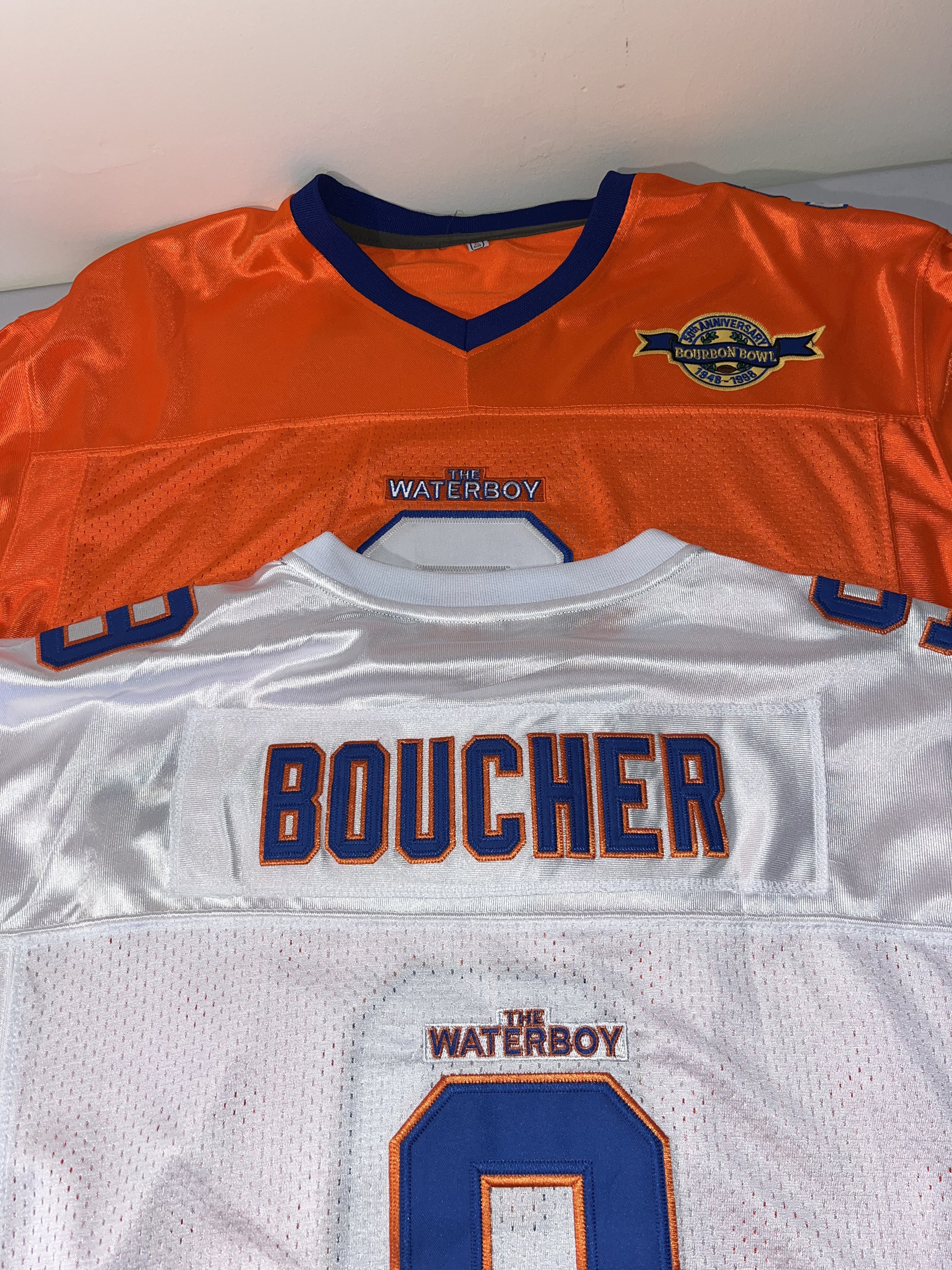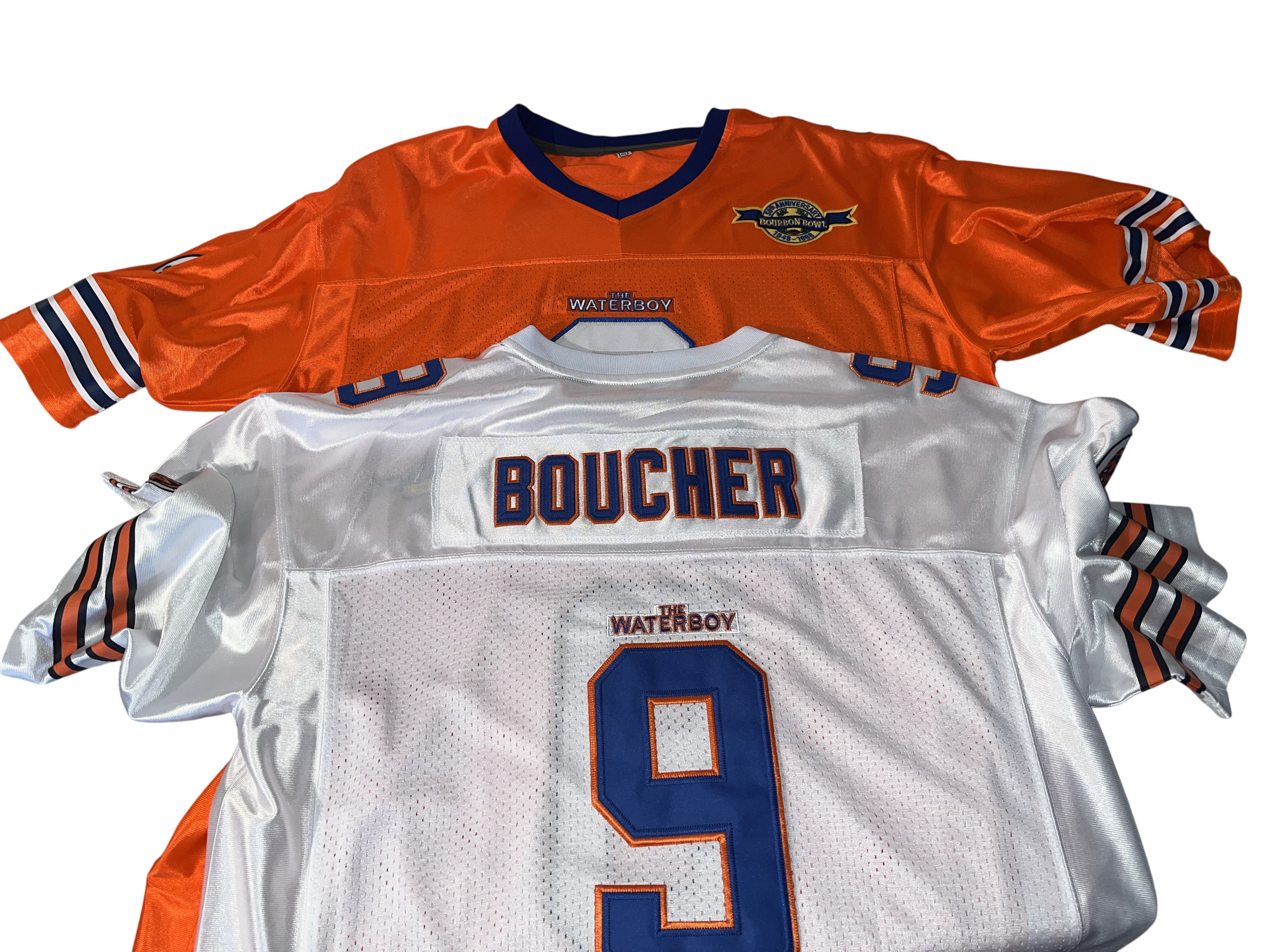 Both are XL. This lot features a pair of high-quality fan replica football jerseys from the 1998 sports comedy film, The Waterboy. The jerseys represent the fictional South Central Louisiana State University (SCLSU) Mud Dogs and the character Bobby Boucher, famously portrayed by Adam Sandler. The set includes both the Home (orange) and Away (white) variations and a “50th Anniversary Bourbon Bowl 1948-1998” commemorative patch on the left chest. These items are high-quality replicas intended for display or fan wear; they are not screen-worn props and do not contain any player or actor signatures.