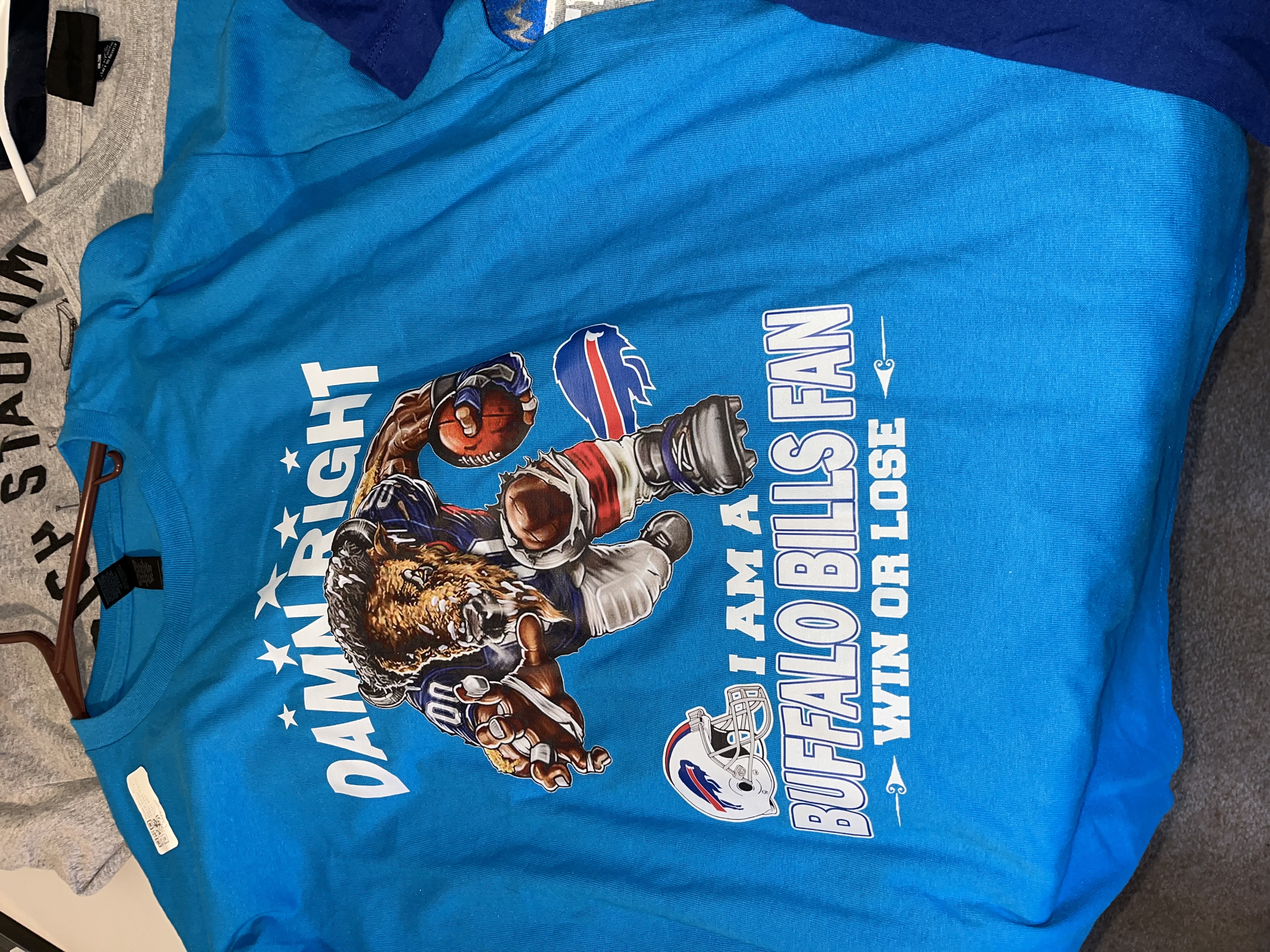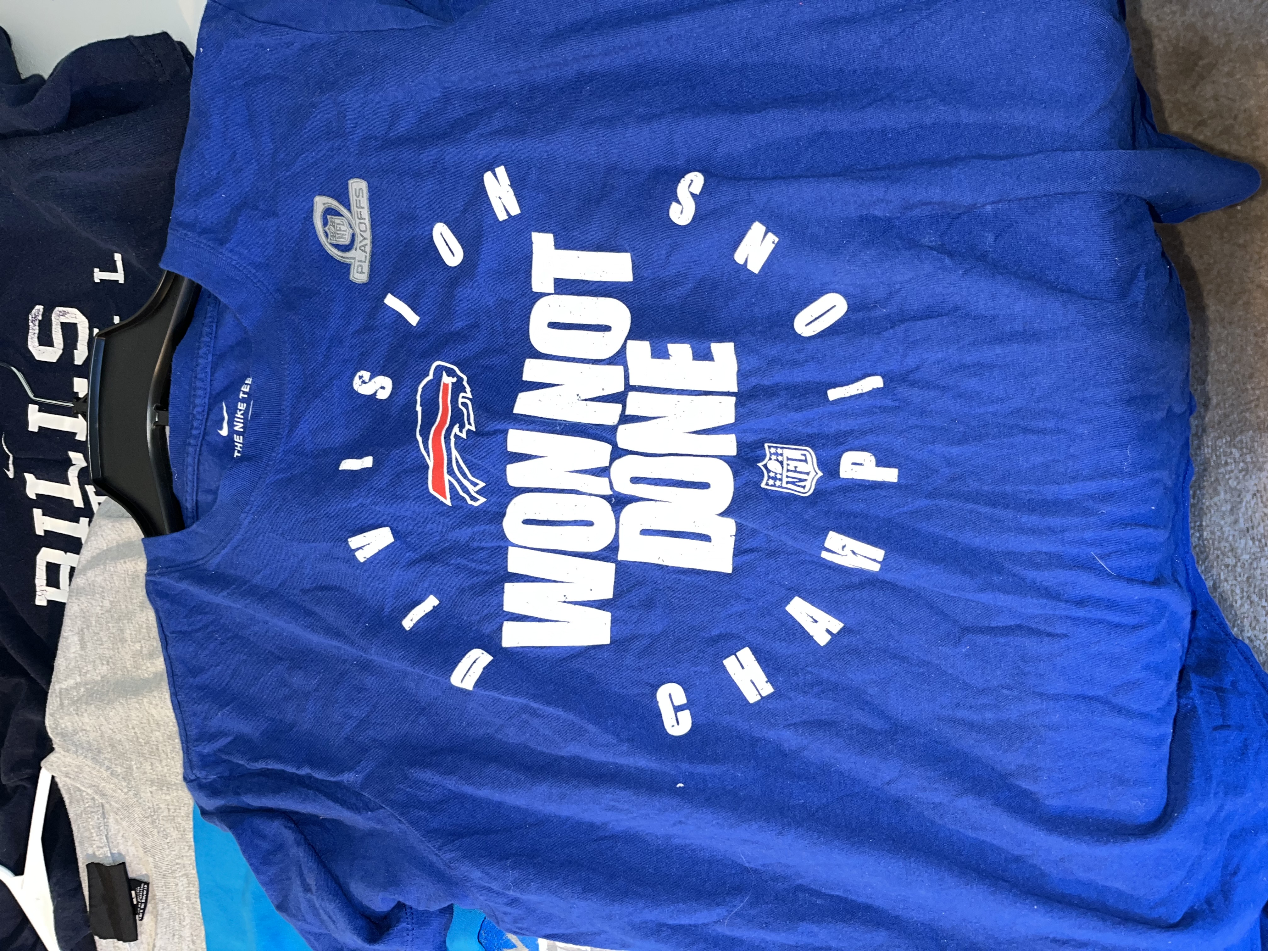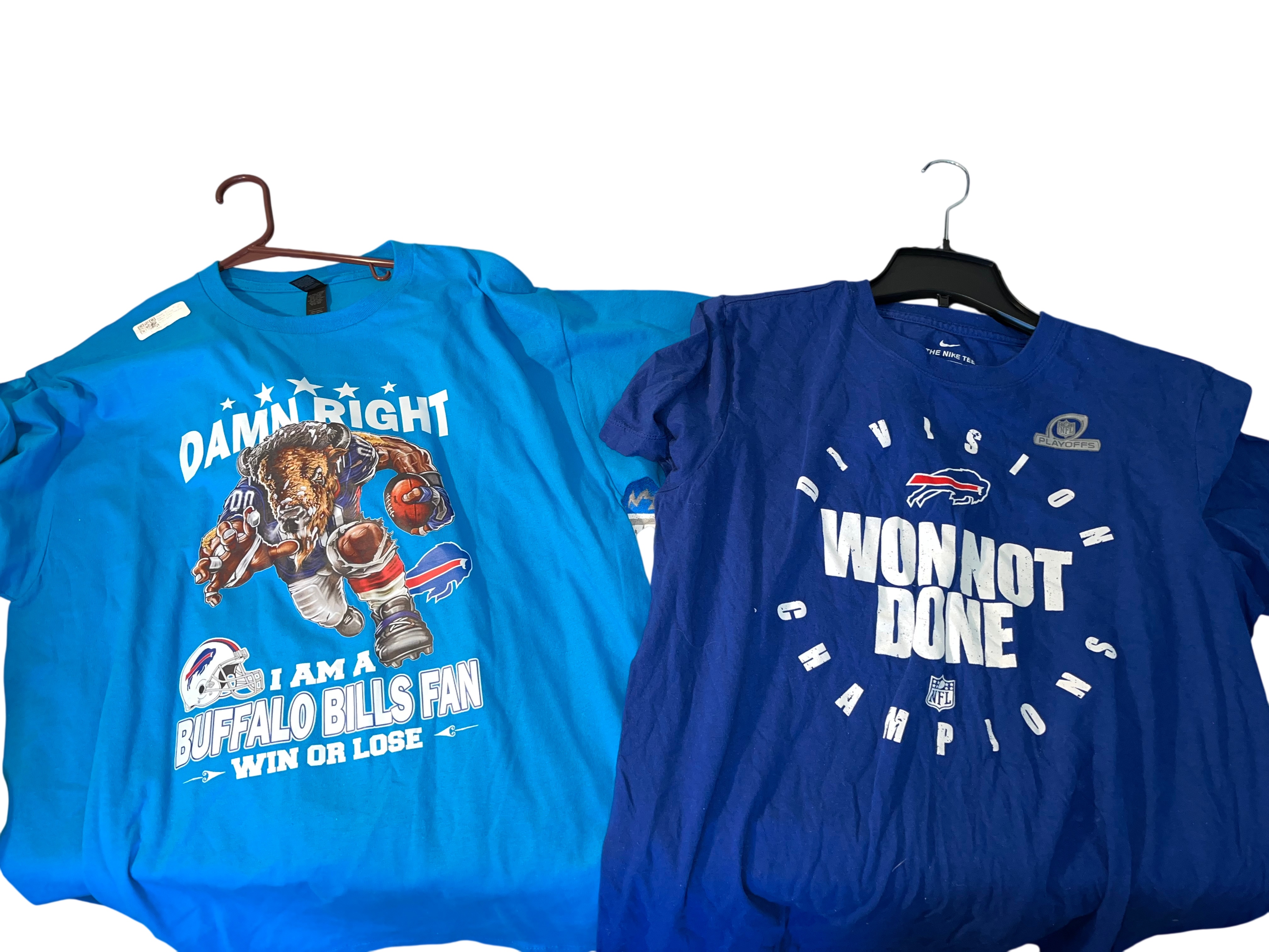 This lot features a collection of Buffalo Bills fan apparel t-shirts showcasing various designs related to the NFL team and its fanbase. The set includes a royal blue Nike brand Division Champions shirt with Won Not Done text and an NFL Playoffs graphic. Also included is a bright blue graphic tee featuring a stylized anthropomorphic buffalo mascot with the slogan Damn Right I Am A Buffalo Bills Fan – Win or Lose. The collection further contains a heather grey Mafia For Life Buffalo, NY shirt, a light grey commemorative tee featuring a vintage-style illustration of Rich Stadium in Orchard Park, NY, and a navy blue Bills Football shirt featuring the iconic charging buffalo logo. These items are standard retail-grade fan merchandise. No signatures, game-use indicators, or photo matches are present.