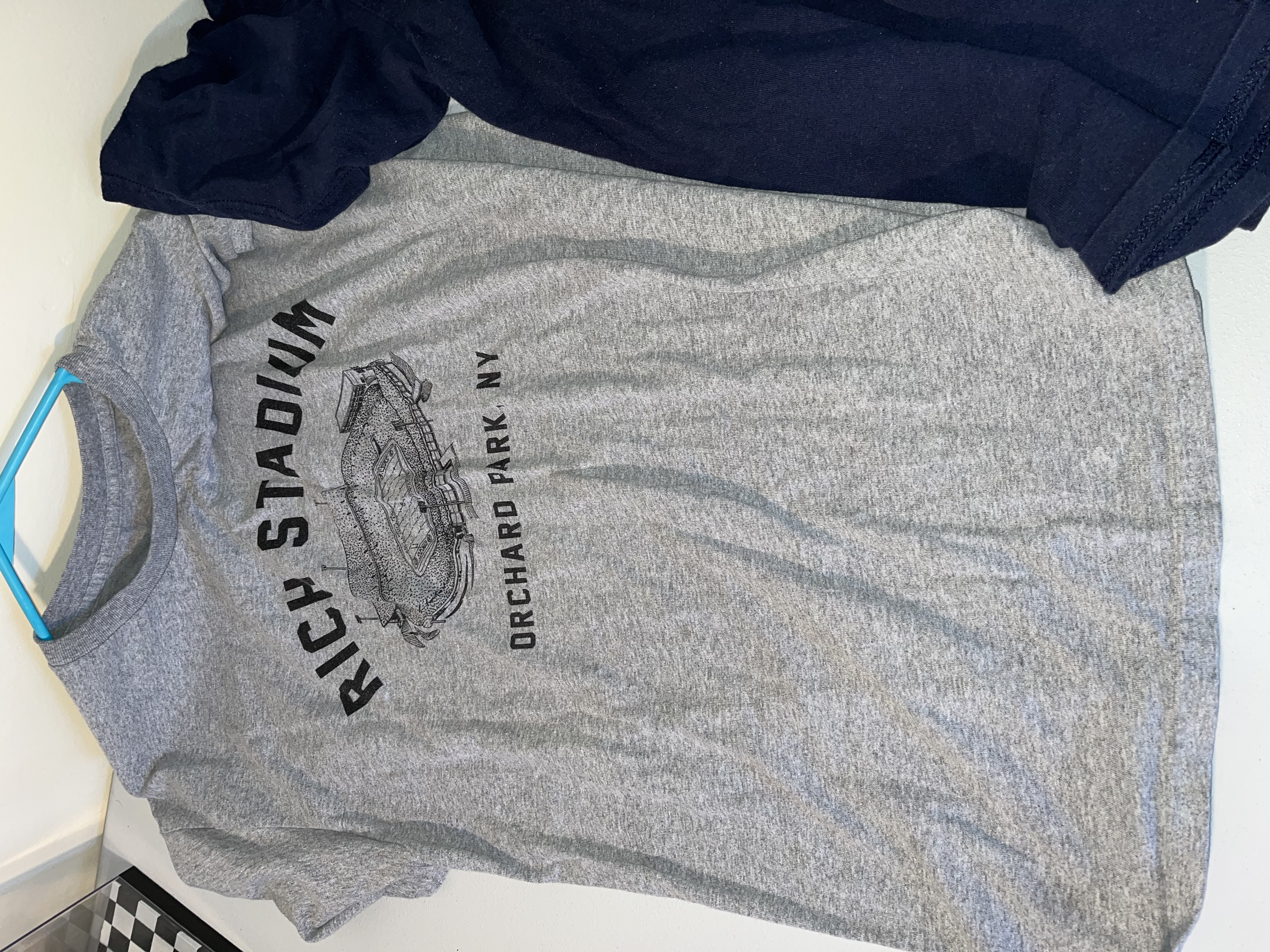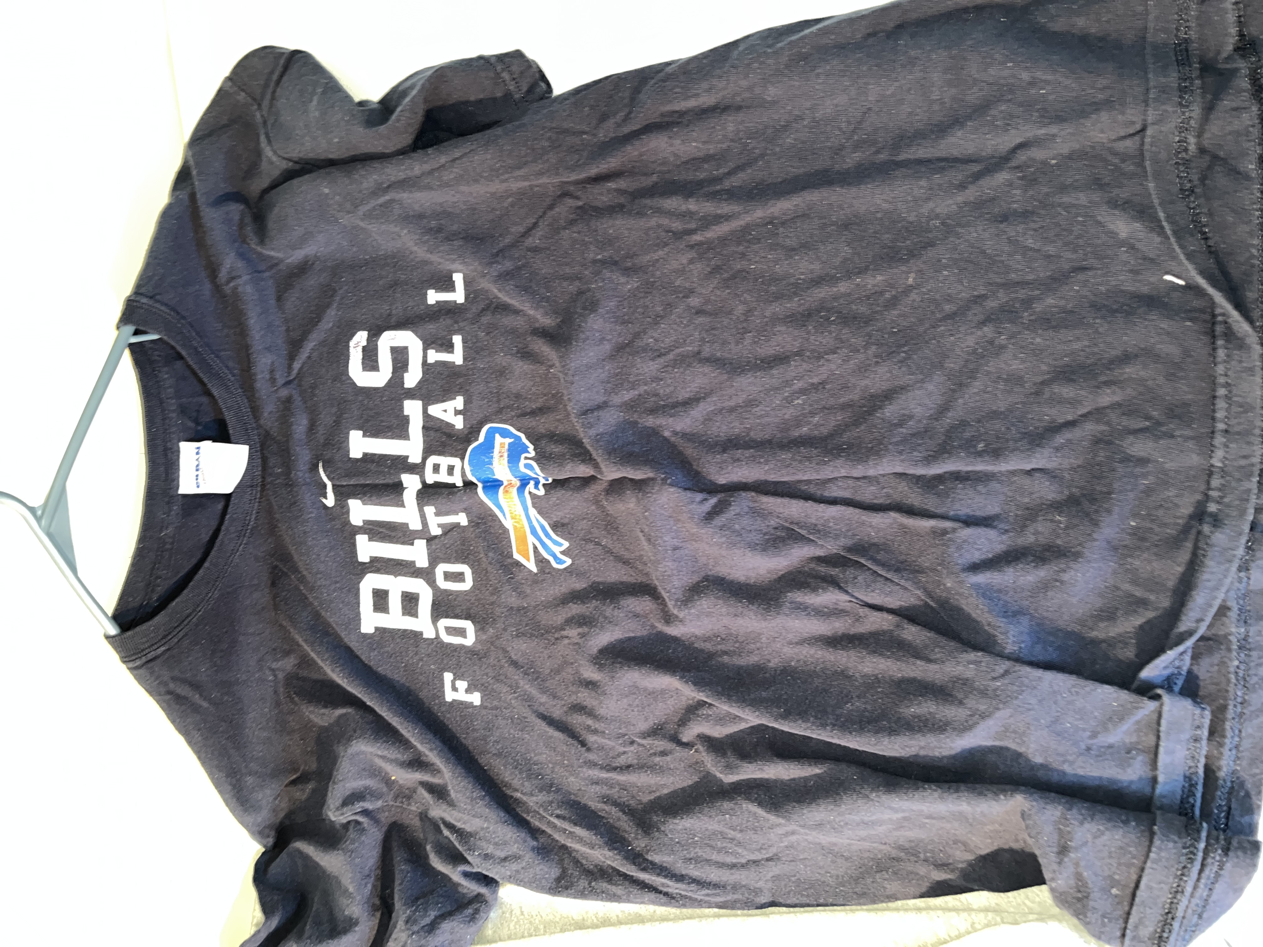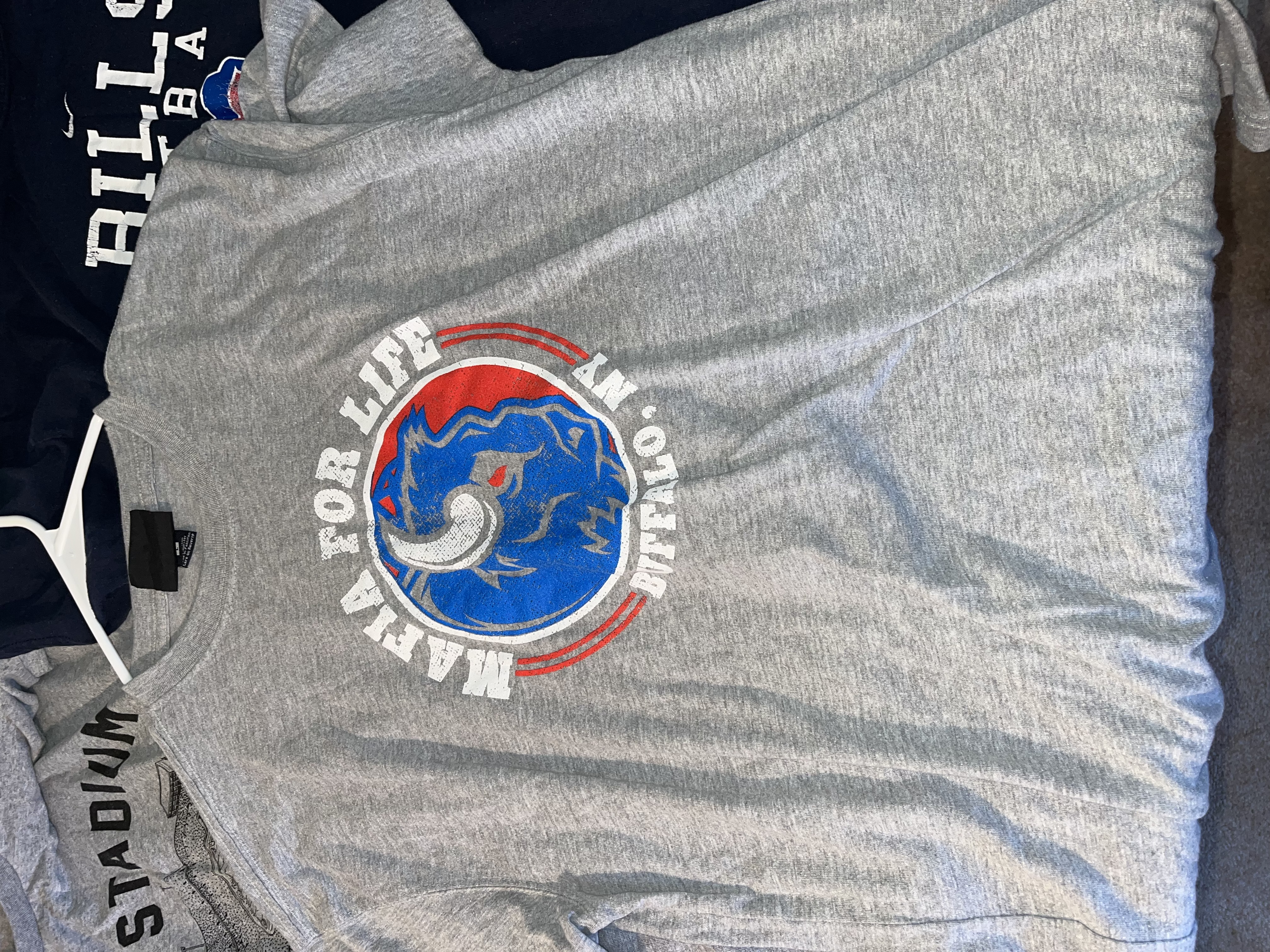 This lot features a collection of Buffalo Bills fan apparel t-shirts showcasing various designs related to the NFL team and its fanbase. The set includes a royal blue Nike brand Division Champions shirt with Won Not Done text and an NFL Playoffs graphic. Also included is a bright blue graphic tee featuring a stylized anthropomorphic buffalo mascot with the slogan Damn Right I Am A Buffalo Bills Fan – Win or Lose. The collection further contains a heather grey Mafia For Life Buffalo, NY shirt, a light grey commemorative tee featuring a vintage-style illustration of Rich Stadium in Orchard Park, NY, and a navy blue Bills Football shirt featuring the iconic charging buffalo logo. These items are standard retail-grade fan merchandise. No signatures, game-use indicators, or photo matches are present.