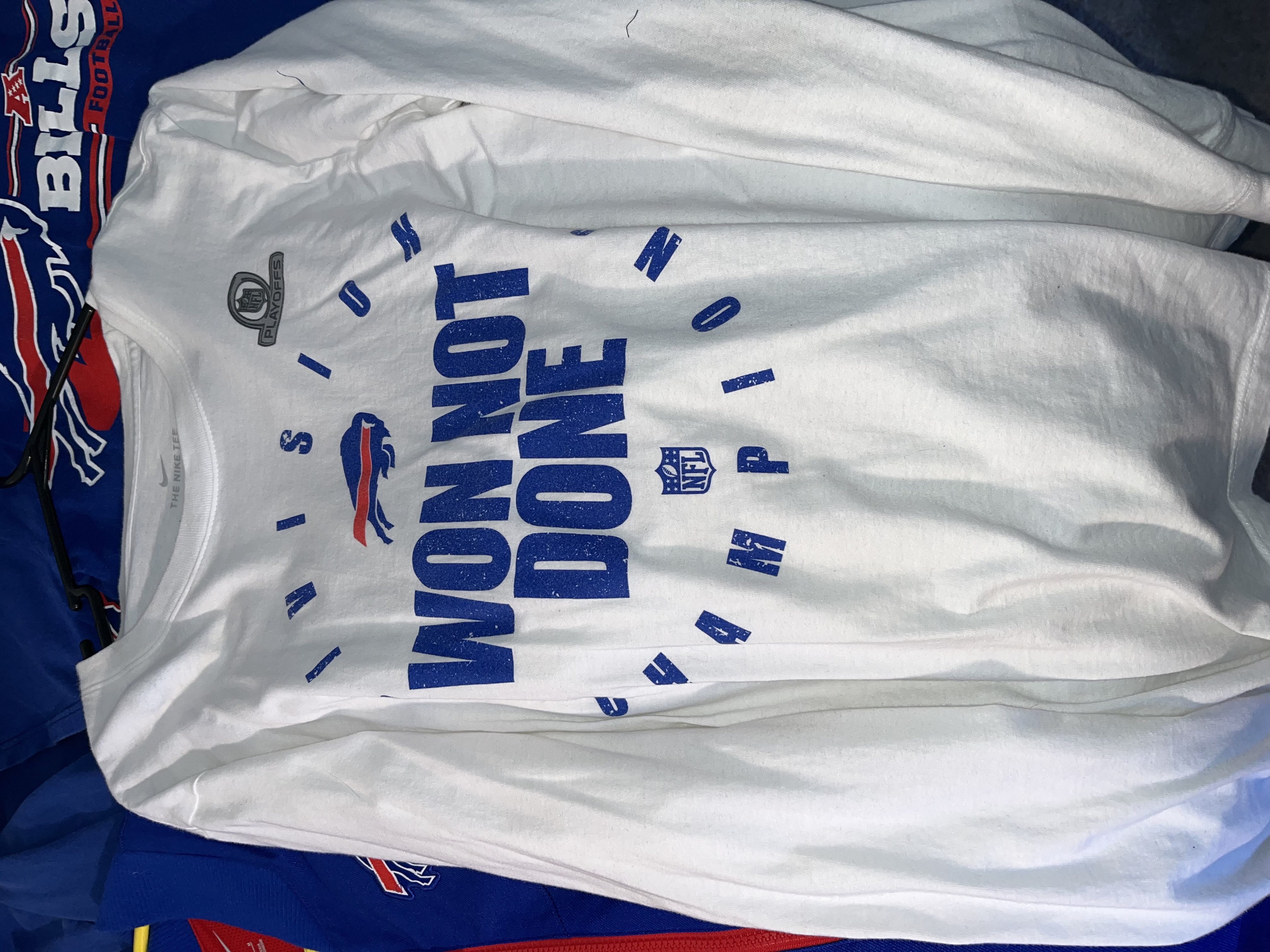 This lot features a collection of five pieces of Buffalo Bills (NFL) fan apparel. The centerpiece of the collection is a Nike royal blue full-zip jacket with a contrasting red zipper and white ribbed shoulder accents, featuring a heat-sealed Buffalo Bills logo on the left chest and a Nike swoosh on the right (Size: Medium). Also included is a Nike “Won Not Done” white long-sleeve t-shirt, which was released as official 2020 AFC East Division Champions gear and features the NFL Playoffs logo. The lot is rounded out by two ’47 Brand royal blue short-sleeve t-shirts featuring “BILLS FOOTBALL” and vertical “BUFFALO BILLS” graphics, and one royal blue long-sleeve t-shirt with large red “BILLS” block lettering. These items are standard retail fan apparel and do not contain signatures, game-use evidence, or specific provenance.