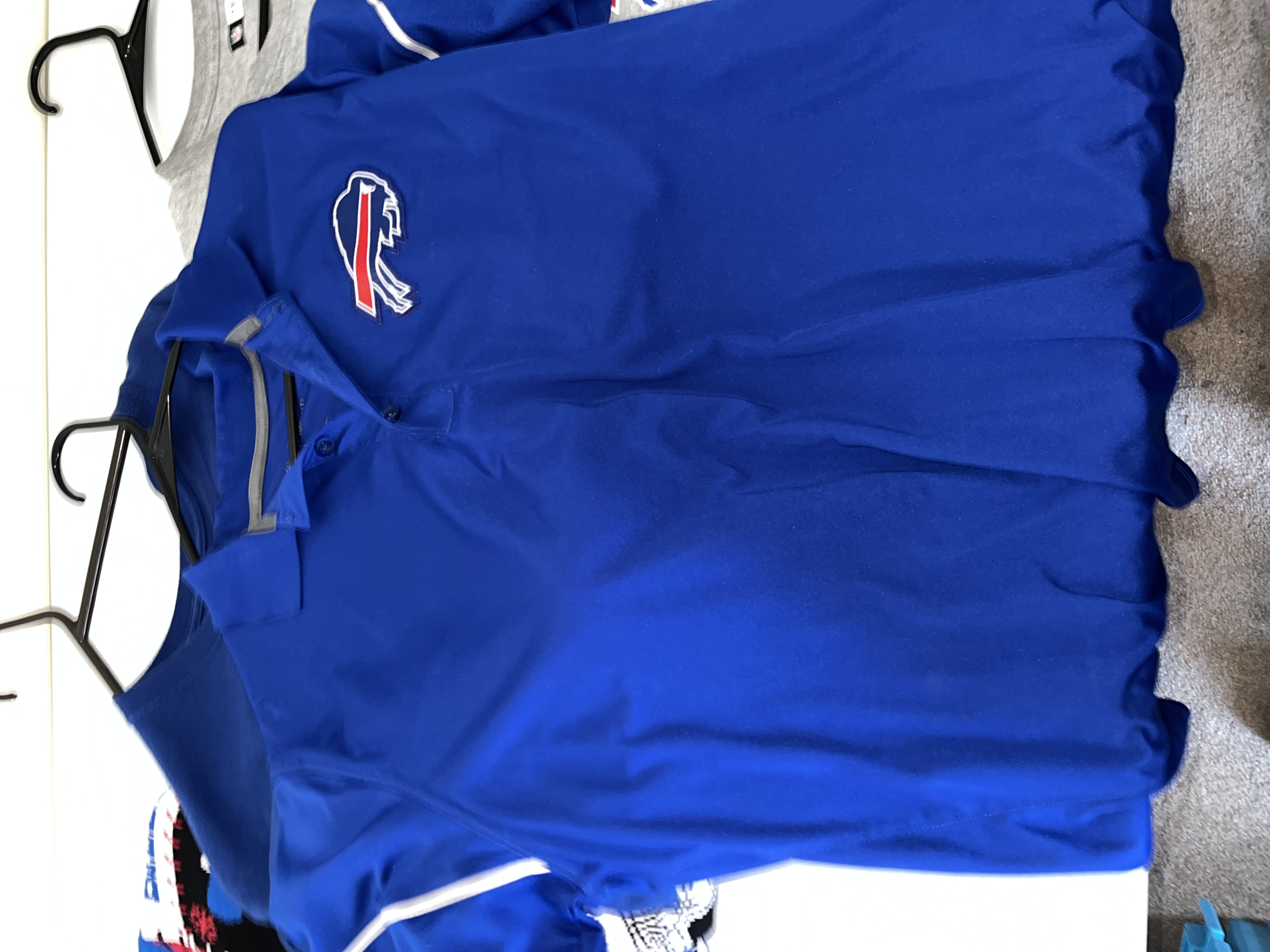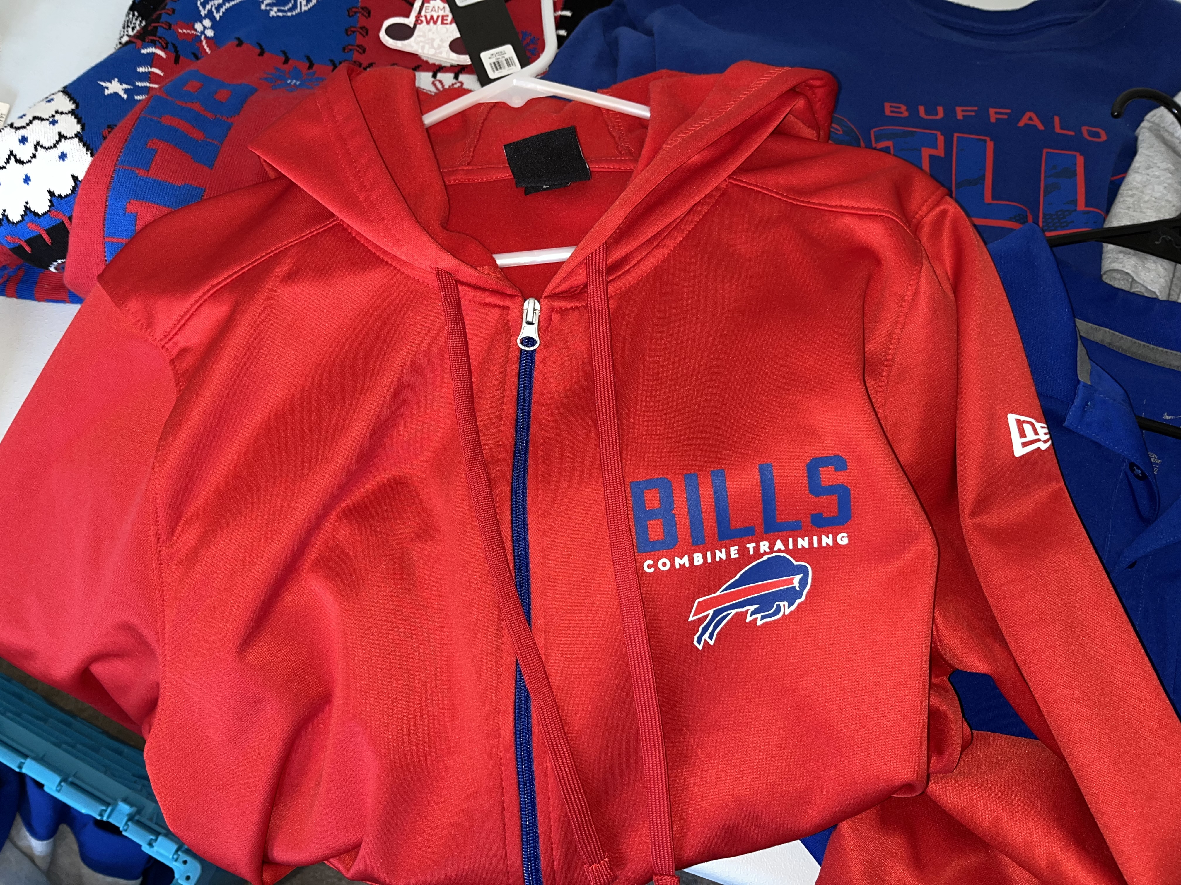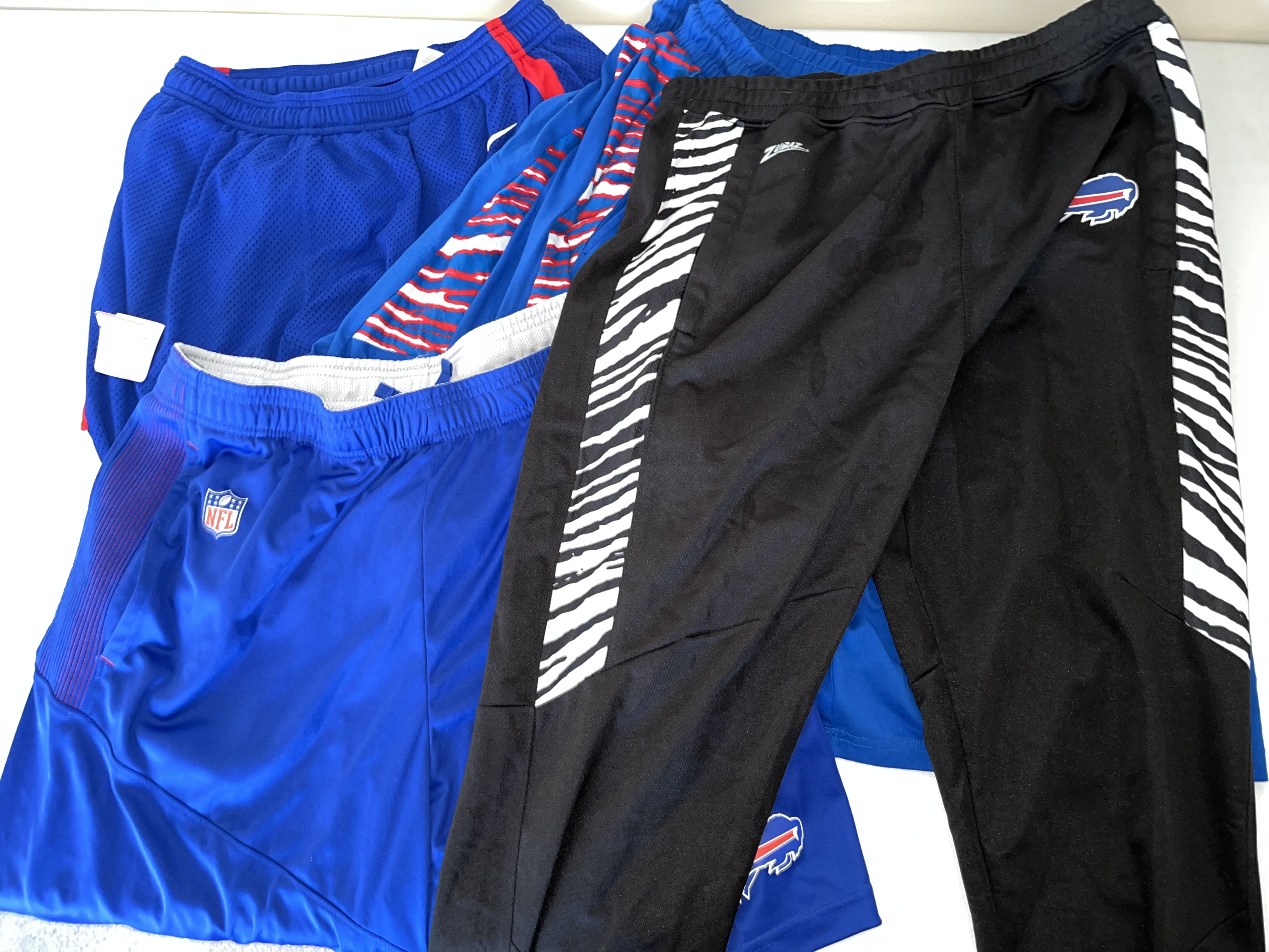 This lot features a diverse collection of Buffalo Bills (NFL) fan apparel and performance wear. The assortment includes a red New Era full-zip hoodie from the Combine Training line with blue zipper and drawstring details. Also included is a blue Nike performance polo with an embroidered team logo and a white Nike Swoosh on the sleeve. The collection contains two t-shirts: a grey NFL Team Apparel graphic tee and a blue stylized logo tee. A highlight of the lot is a New With Tags (NWT) holiday knit sweater in a patchwork design with team logos, helmets, and winter motifs, size Large. The bottoms include a pair of black athletic pants with white zebra-style side panels and a team logo, along with multiple pairs of blue athletic shorts, one featuring the NFL shield. This is a retail apparel lot; no items are game-used or player-worn.
