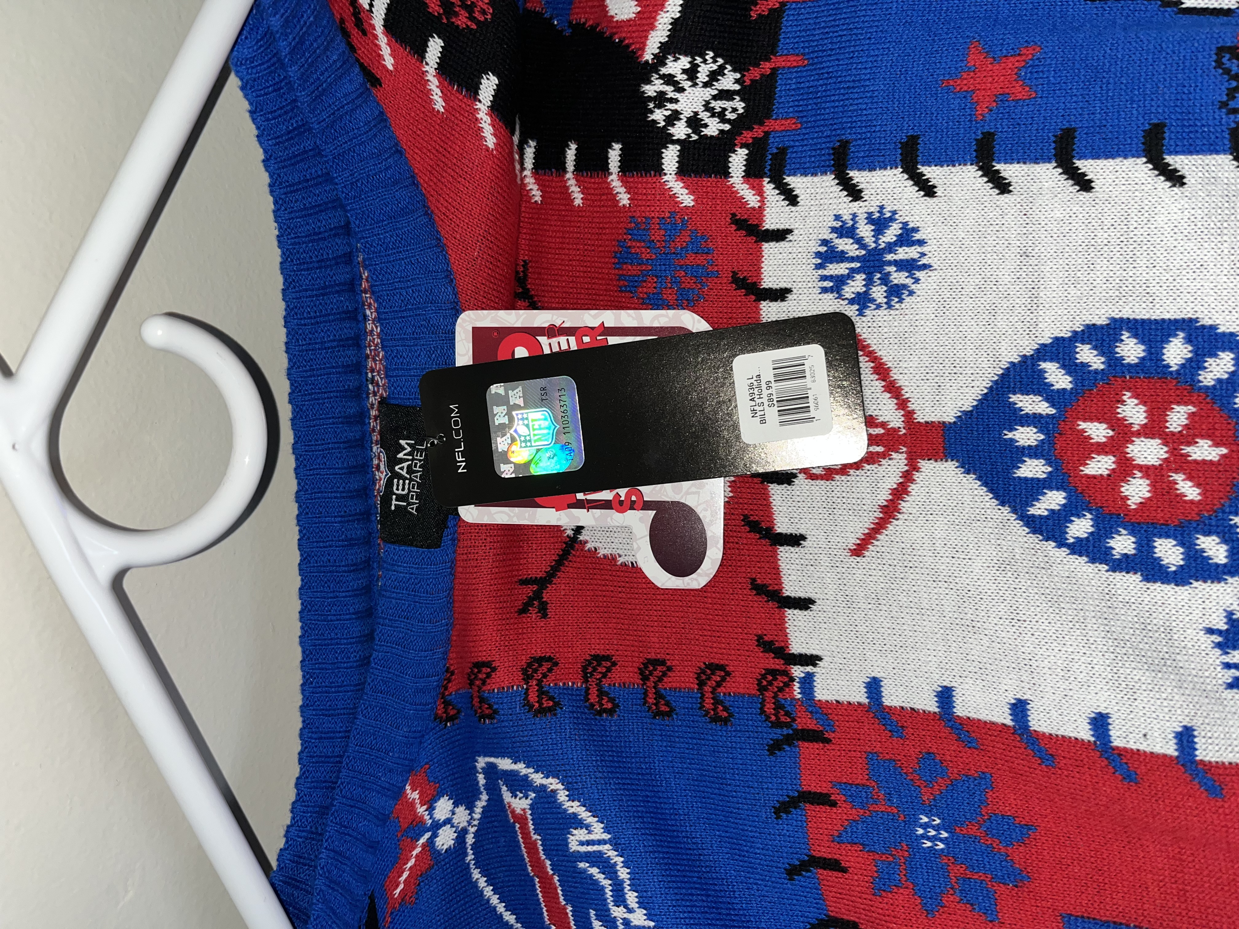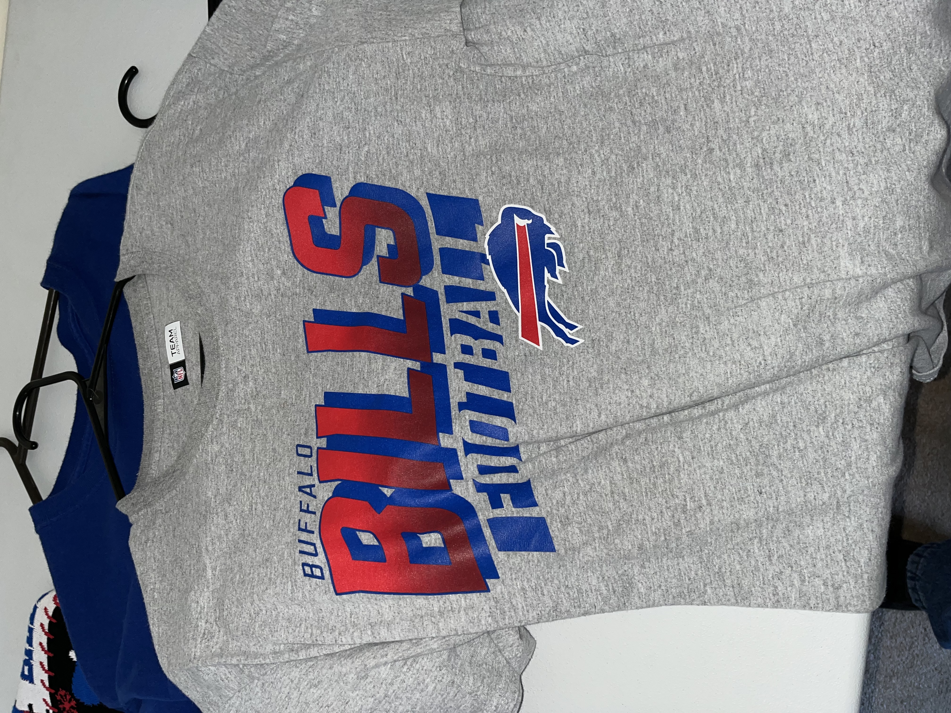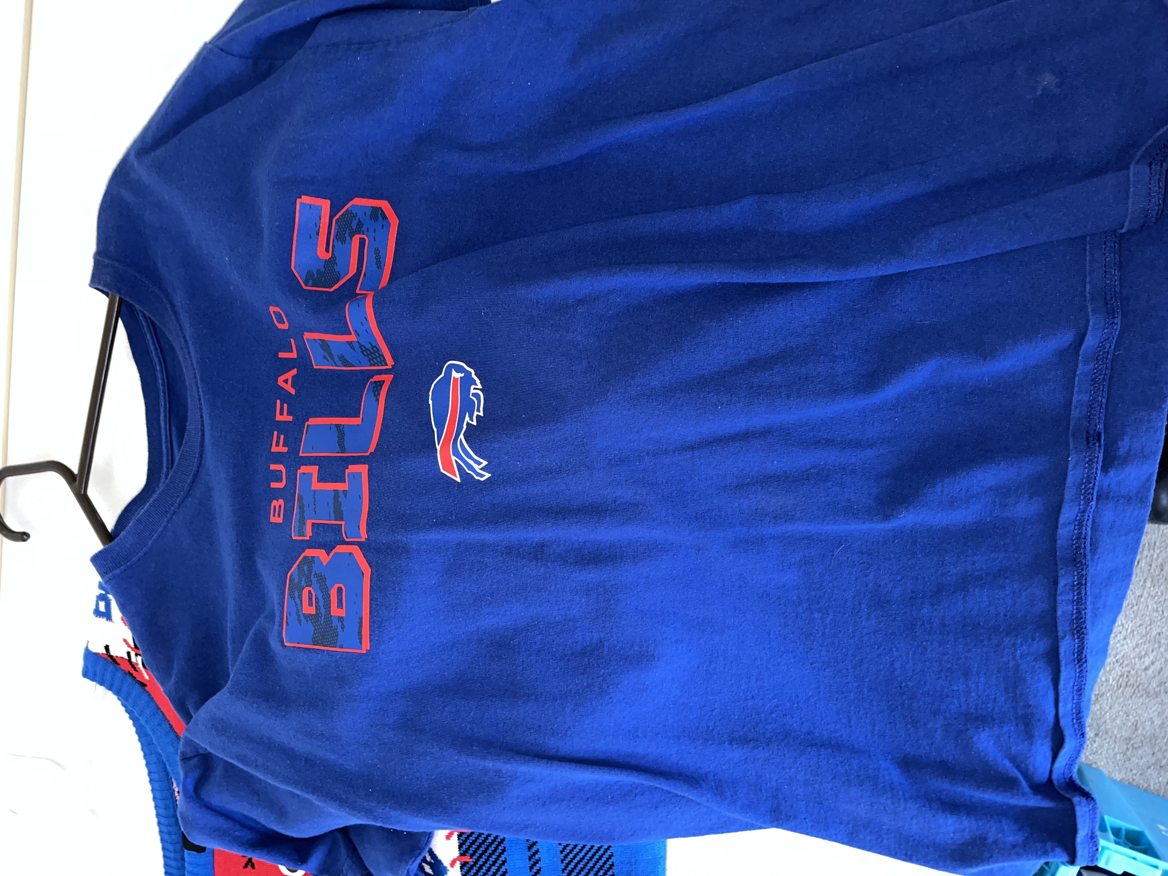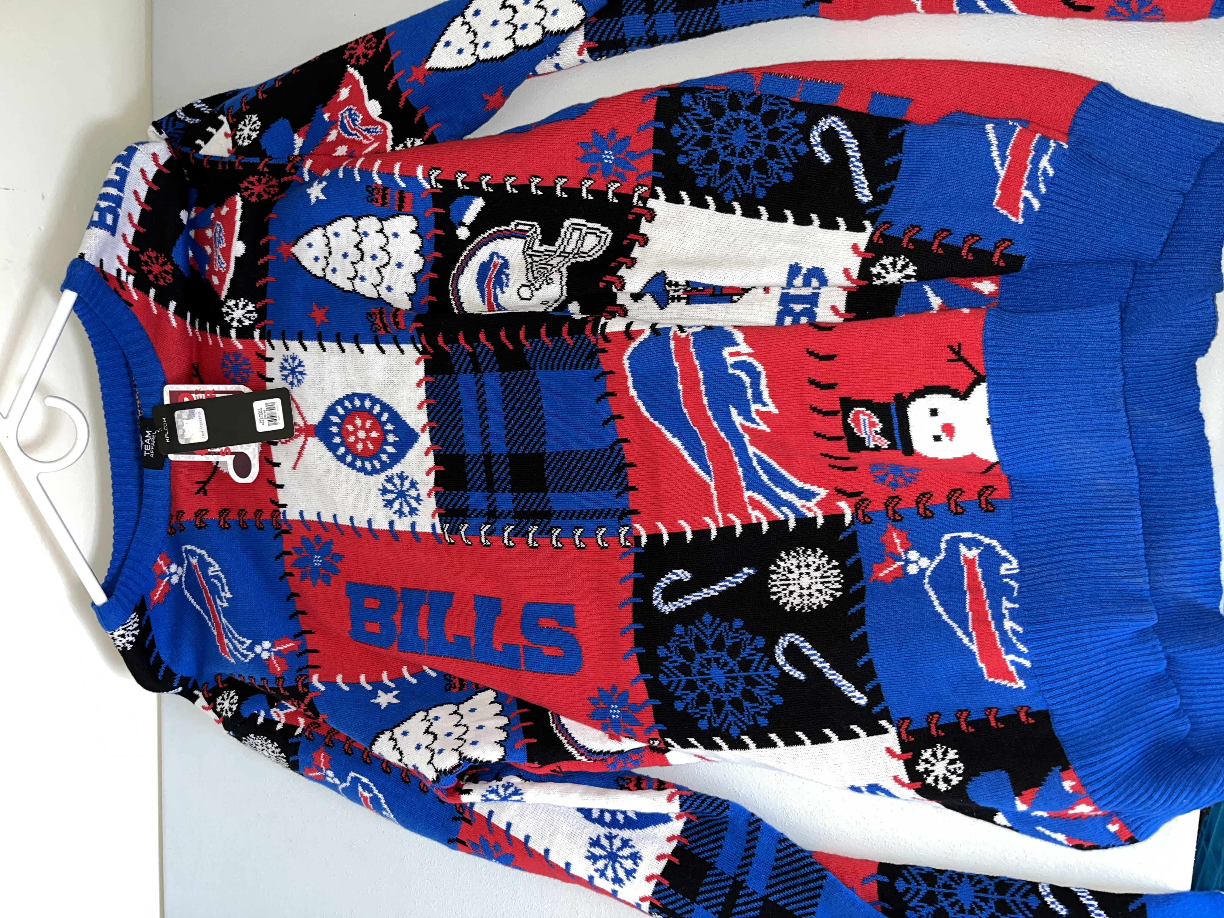 This lot features a diverse collection of Buffalo Bills (NFL) fan apparel and performance wear. The assortment includes a red New Era full-zip hoodie from the Combine Training line with blue zipper and drawstring details. Also included is a blue Nike performance polo with an embroidered team logo and a white Nike Swoosh on the sleeve. The collection contains two t-shirts: a grey NFL Team Apparel graphic tee and a blue stylized logo tee. A highlight of the lot is a New With Tags (NWT) holiday knit sweater in a patchwork design with team logos, helmets, and winter motifs, size Large. The bottoms include a pair of black athletic pants with white zebra-style side panels and a team logo, along with multiple pairs of blue athletic shorts, one featuring the NFL shield. This is a retail apparel lot; no items are game-used or player-worn.