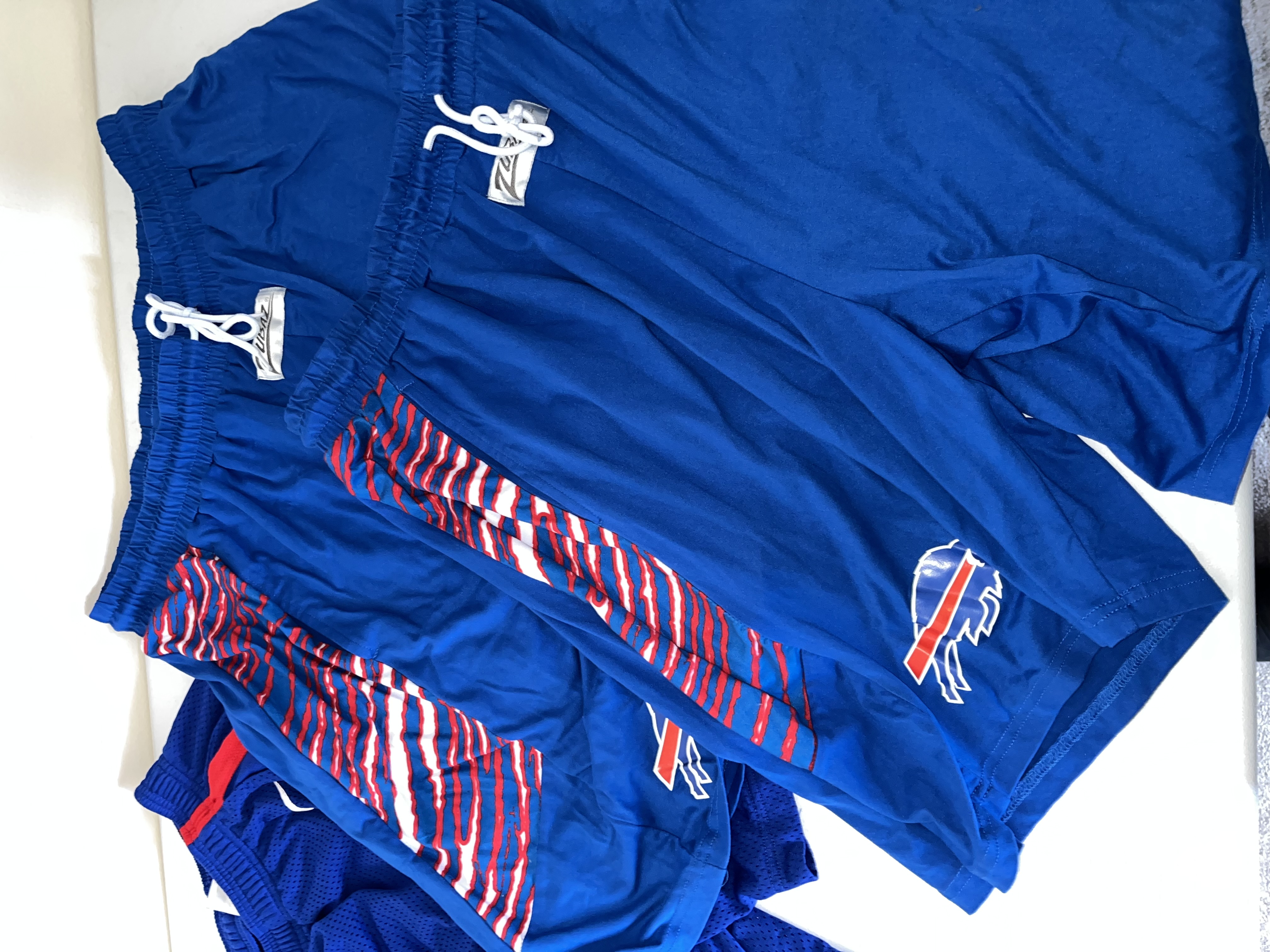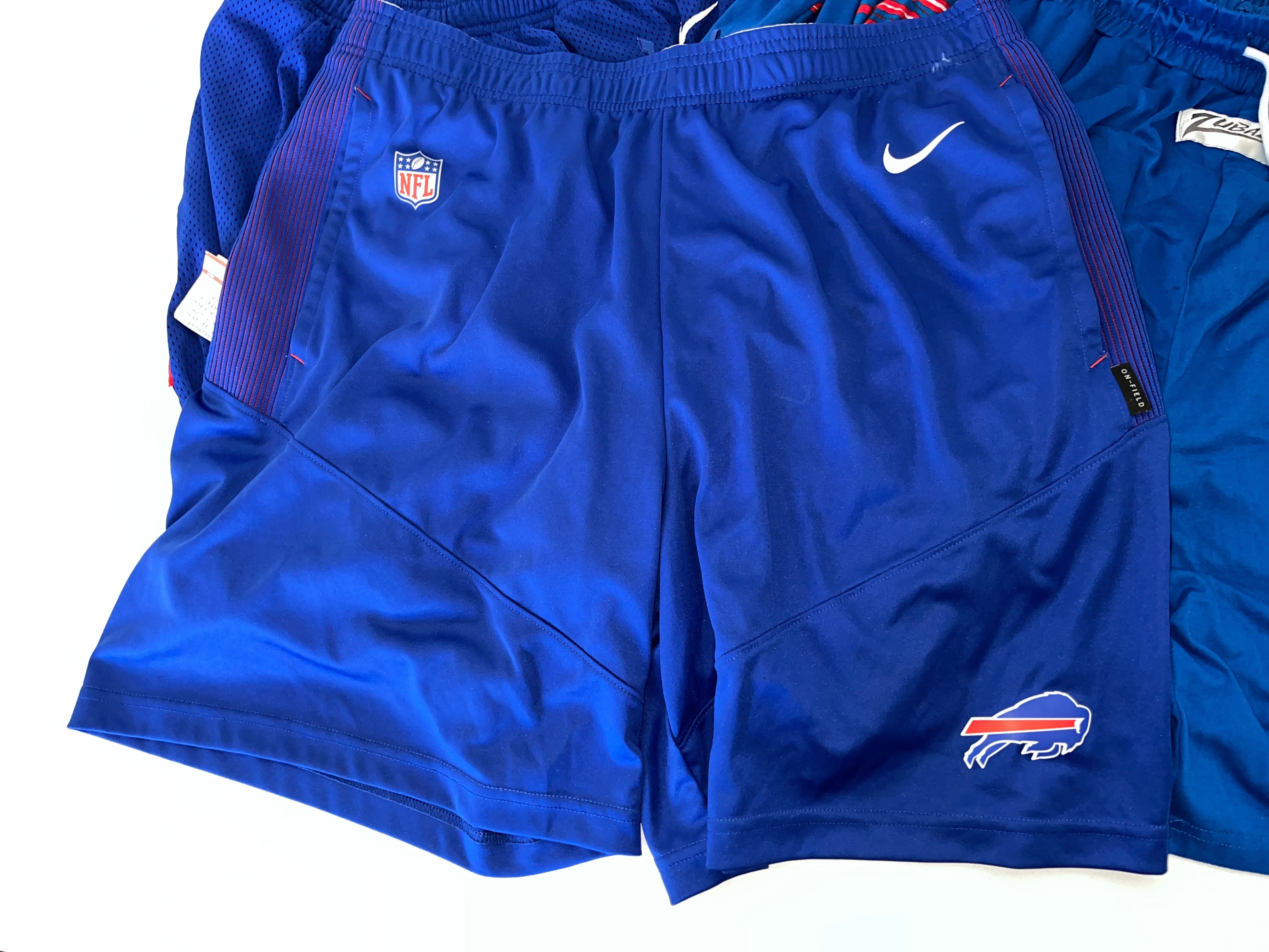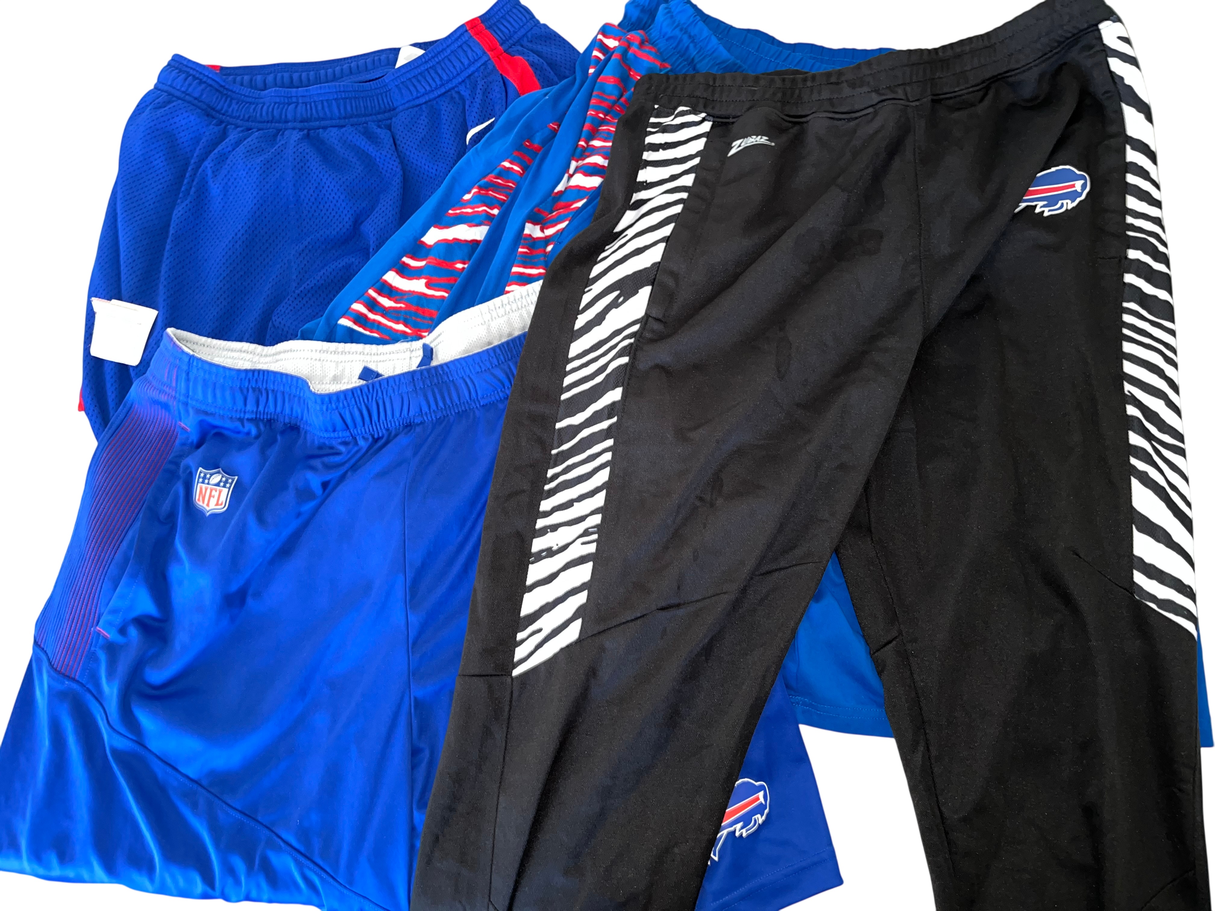 This comprehensive lot of Buffalo Bills apparel consists of approximately 17 pieces of official team-issued and fan gear. The collection features a variety of athletic wear, including Nike On-Field and NFL Equipment performance shorts and track pants. Also included are iconic Zubaz brand items, such as royal blue shorts with red and white zebra print side panels and black performance pants with white zebra accents. The outerwear component features a blue long-sleeved v-neck pullover windbreaker with a large centered Bills logo and sleeve stripe detailing. The selection of tops is comprised of a blue performance polo branded with BILLS FOOTBALL and approximately eight graphic t-shirts in blue, grey, and black, featuring various team logos and Bills Mafia designs. The lot represents a broad range of official NFL merchandise from manufacturers like Nike and Zubaz.