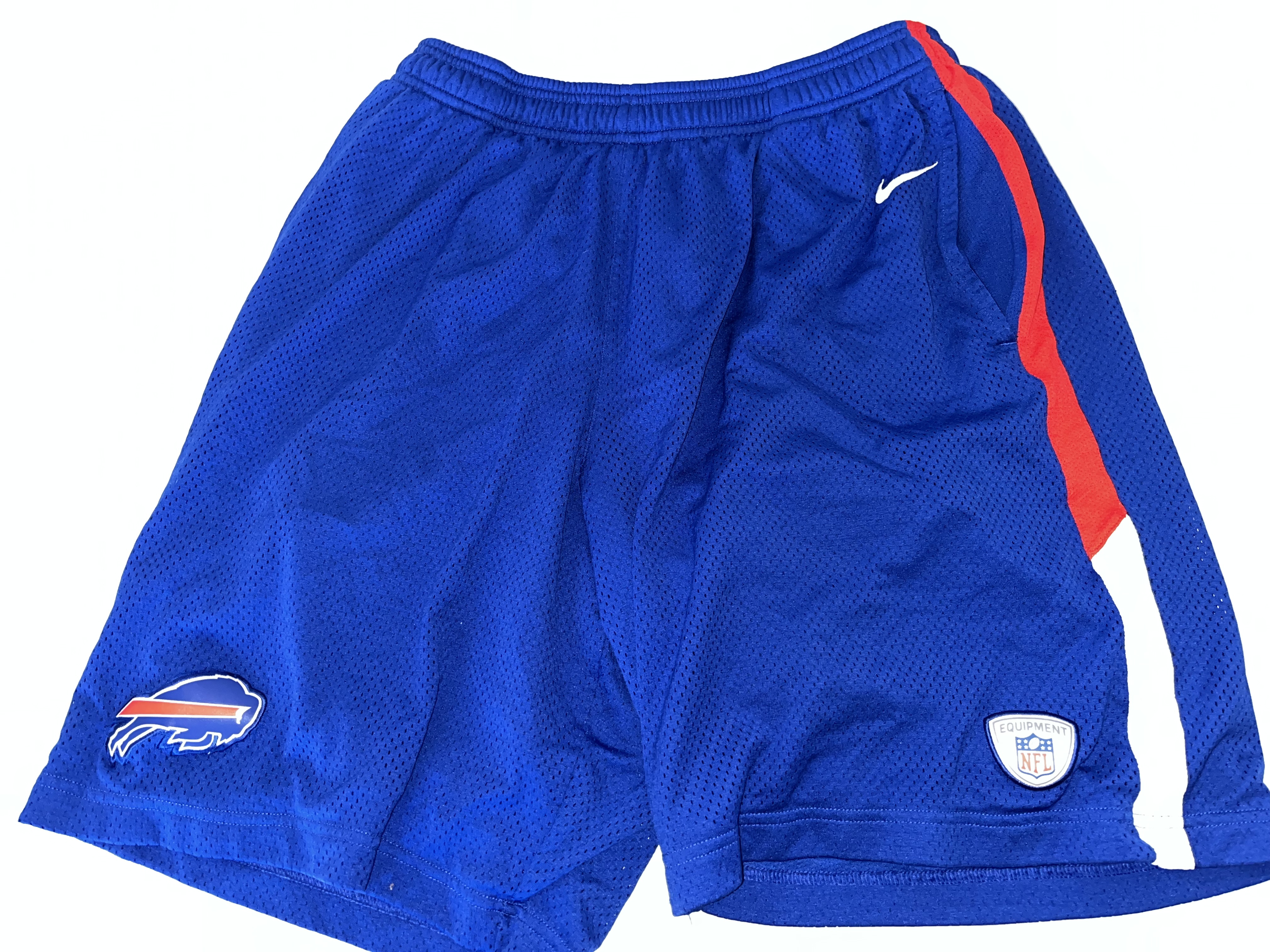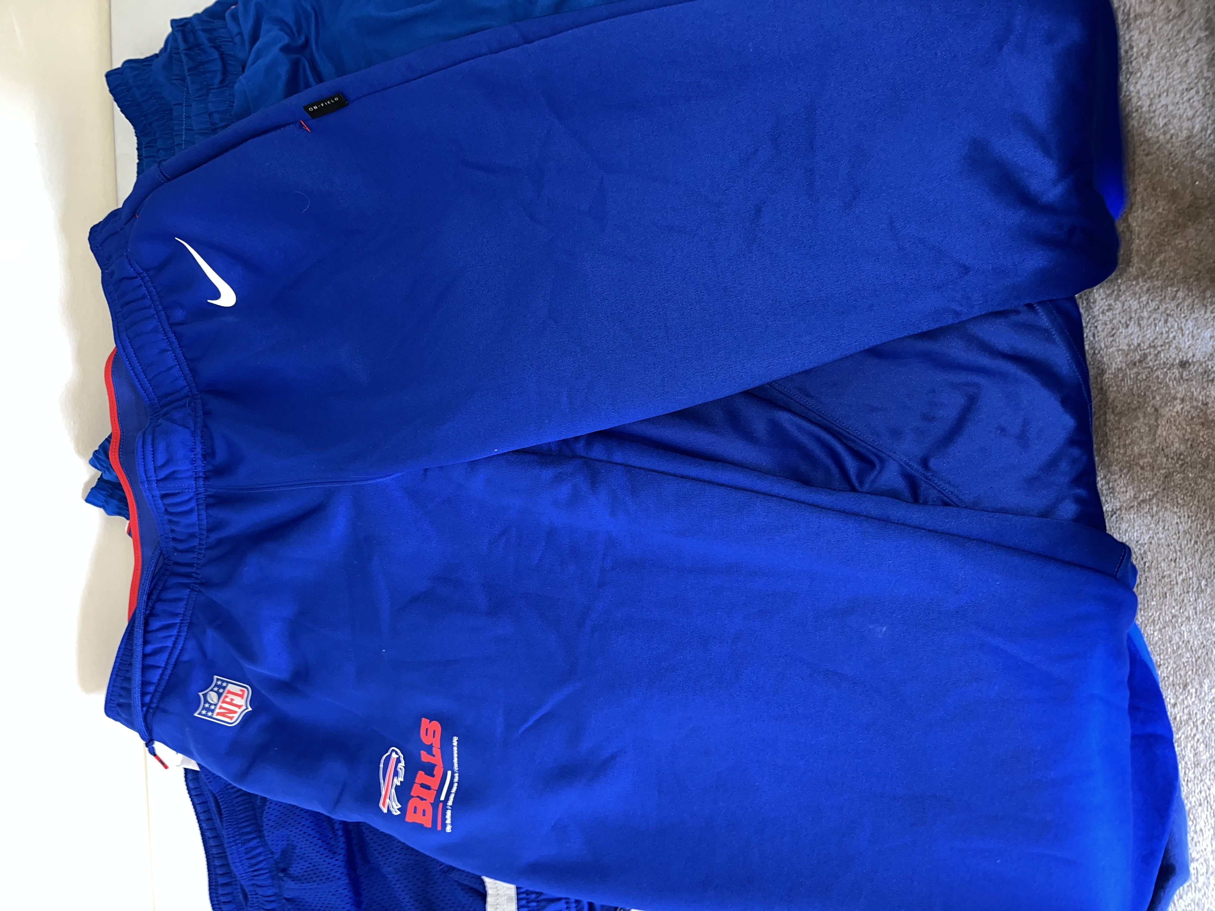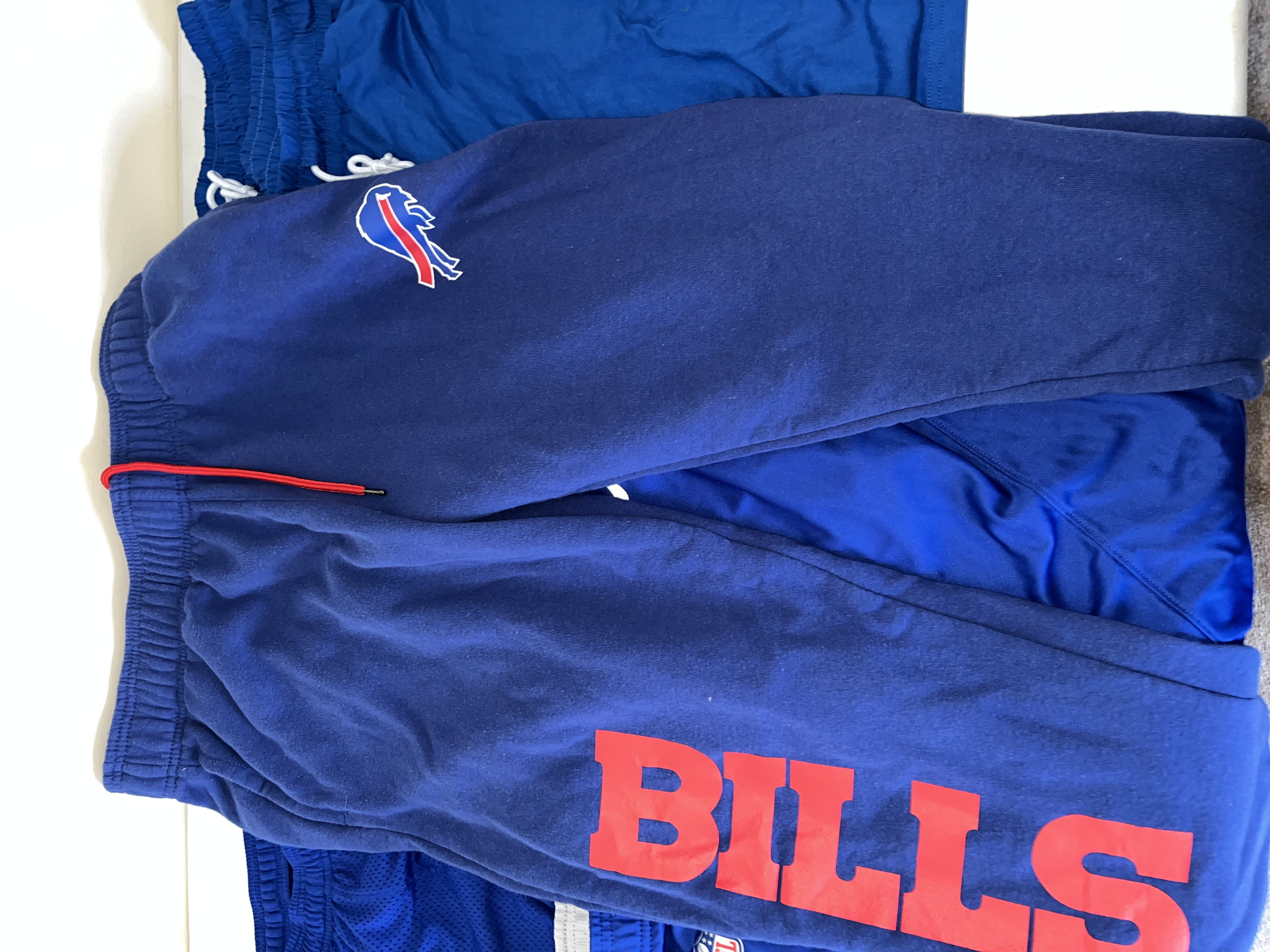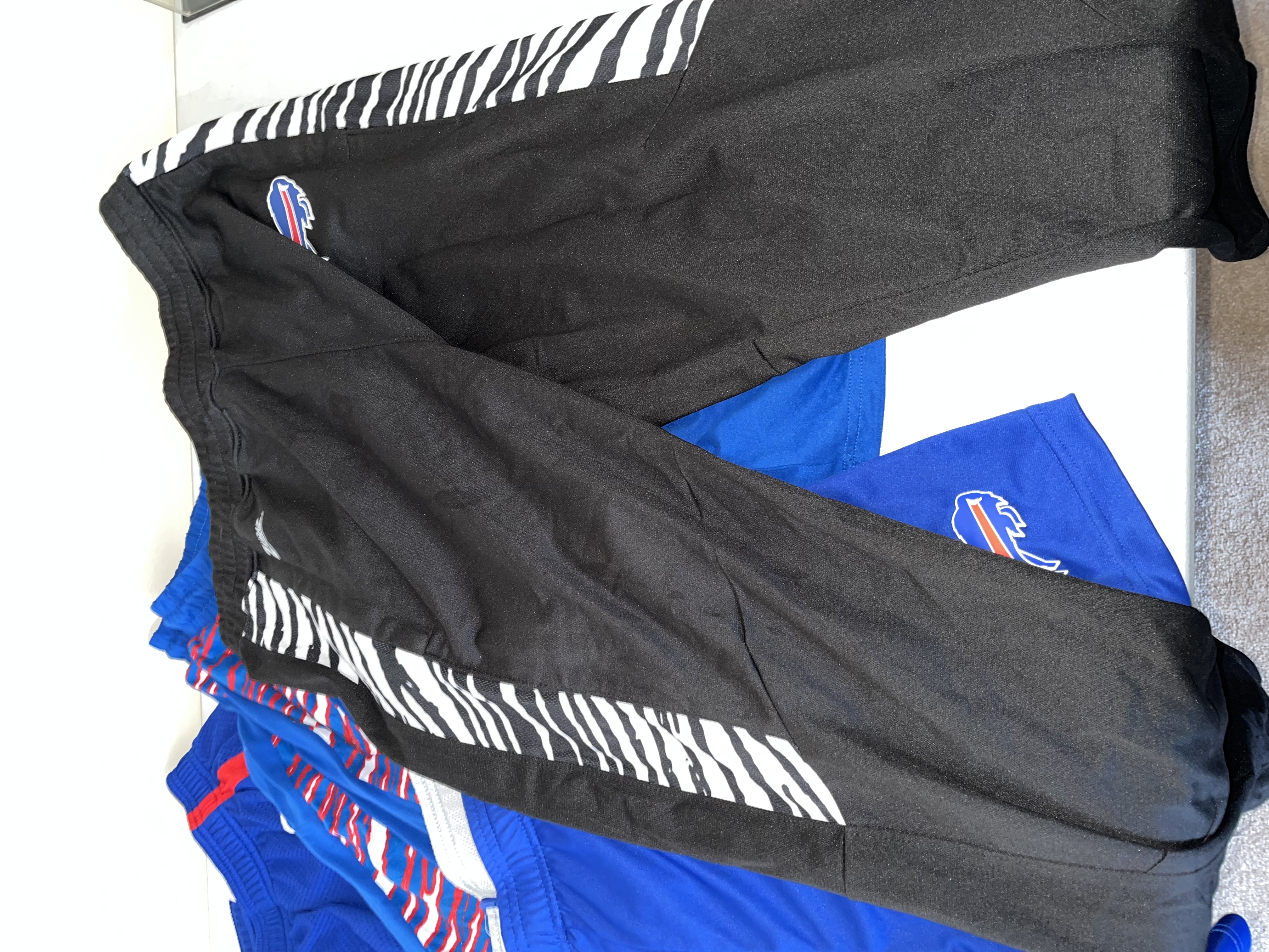 This comprehensive lot of Buffalo Bills apparel consists of approximately 17 pieces of official team-issued and fan gear. The collection features a variety of athletic wear, including Nike On-Field and NFL Equipment performance shorts and track pants. Also included are iconic Zubaz brand items, such as royal blue shorts with red and white zebra print side panels and black performance pants with white zebra accents. The outerwear component features a blue long-sleeved v-neck pullover windbreaker with a large centered Bills logo and sleeve stripe detailing. The selection of tops is comprised of a blue performance polo branded with BILLS FOOTBALL and approximately eight graphic t-shirts in blue, grey, and black, featuring various team logos and Bills Mafia designs. The lot represents a broad range of official NFL merchandise from manufacturers like Nike and Zubaz.