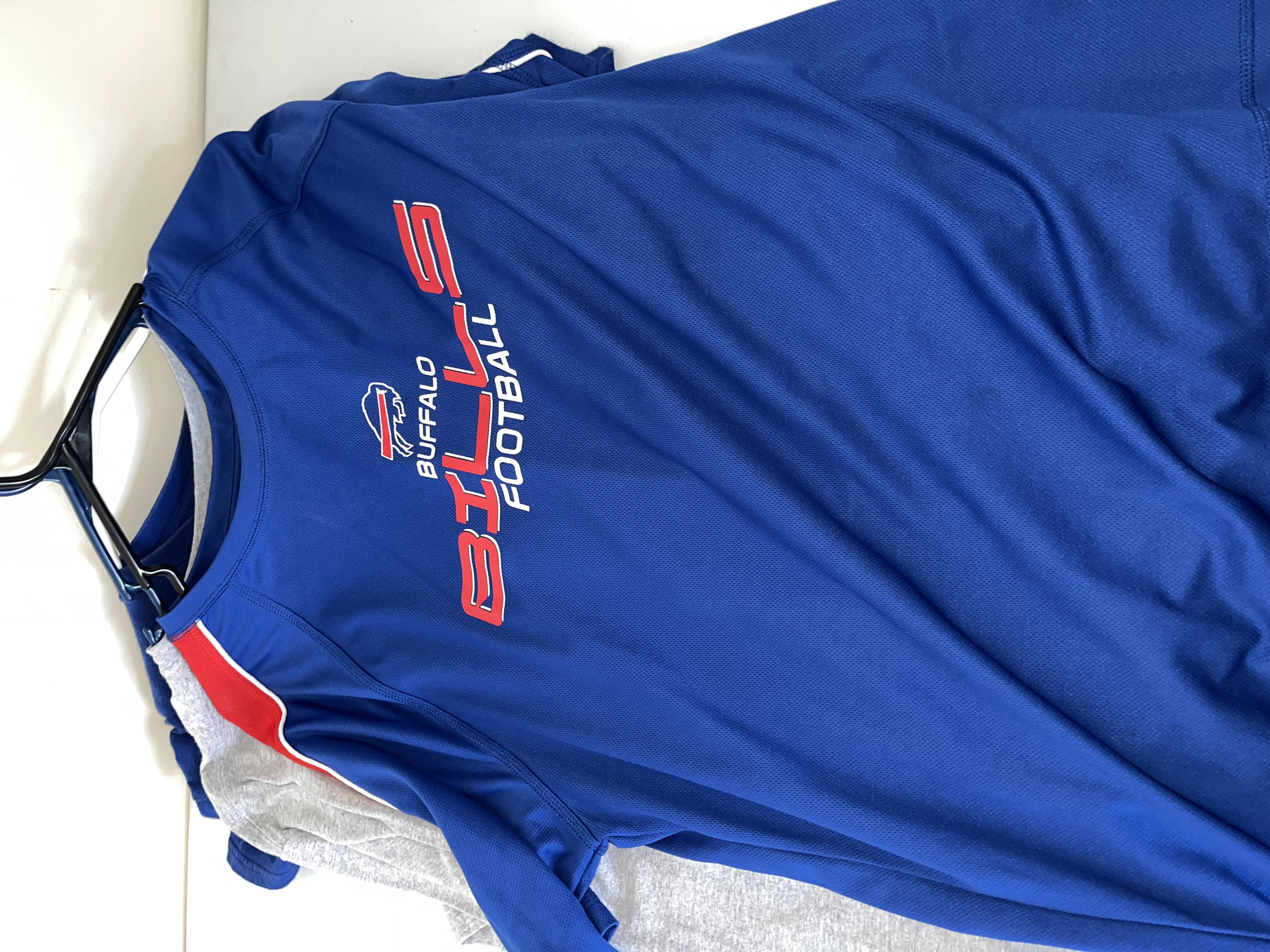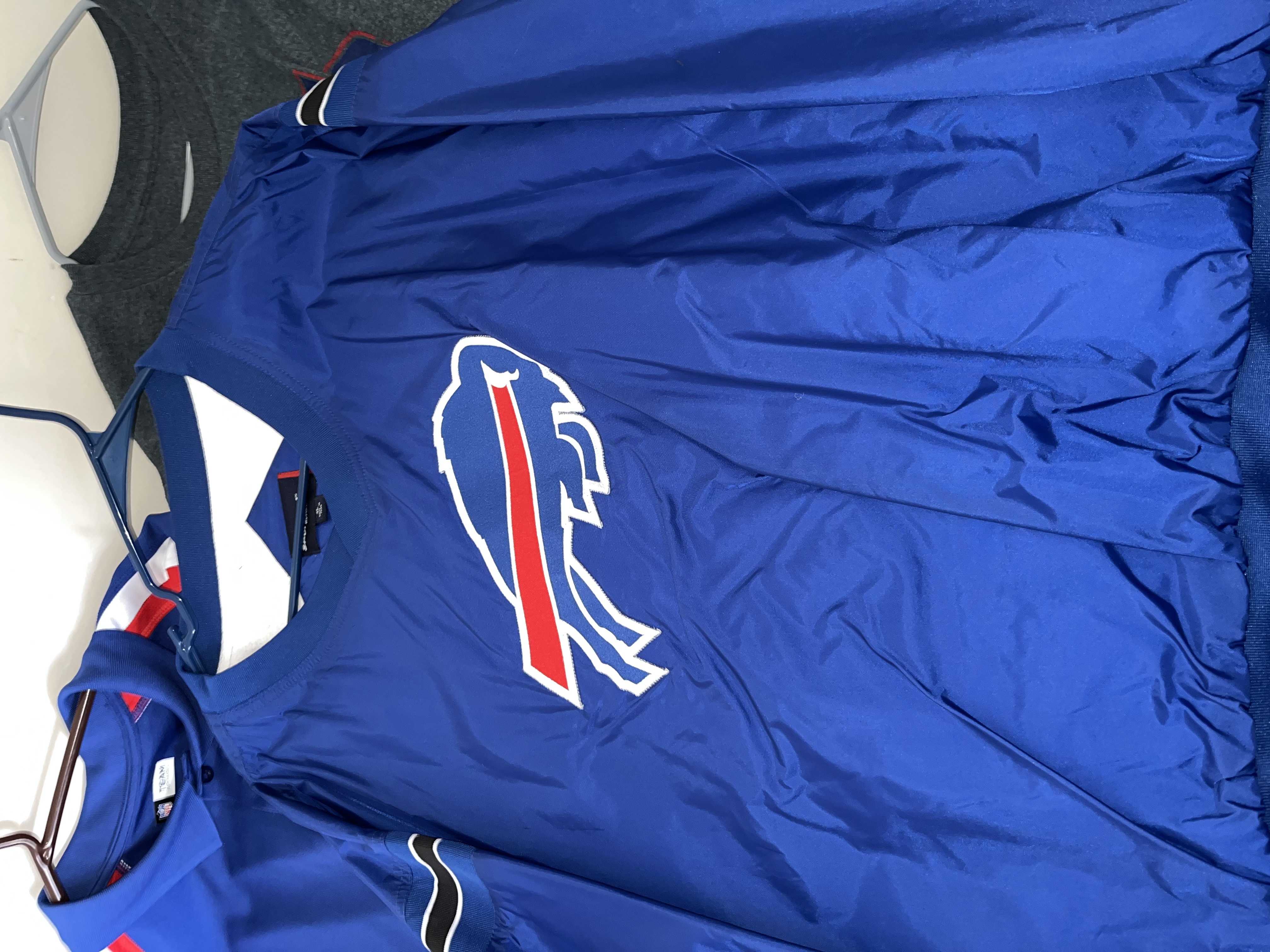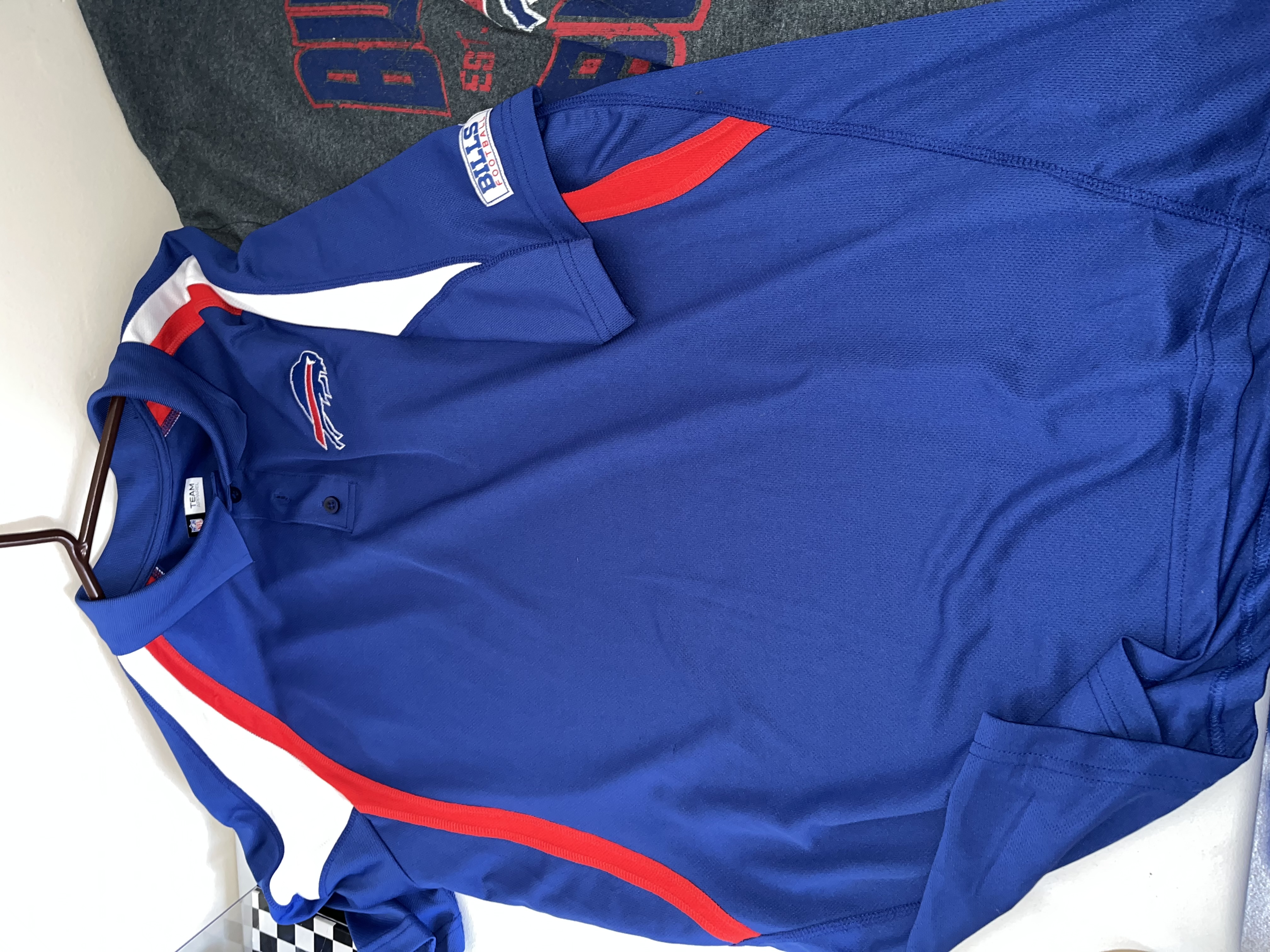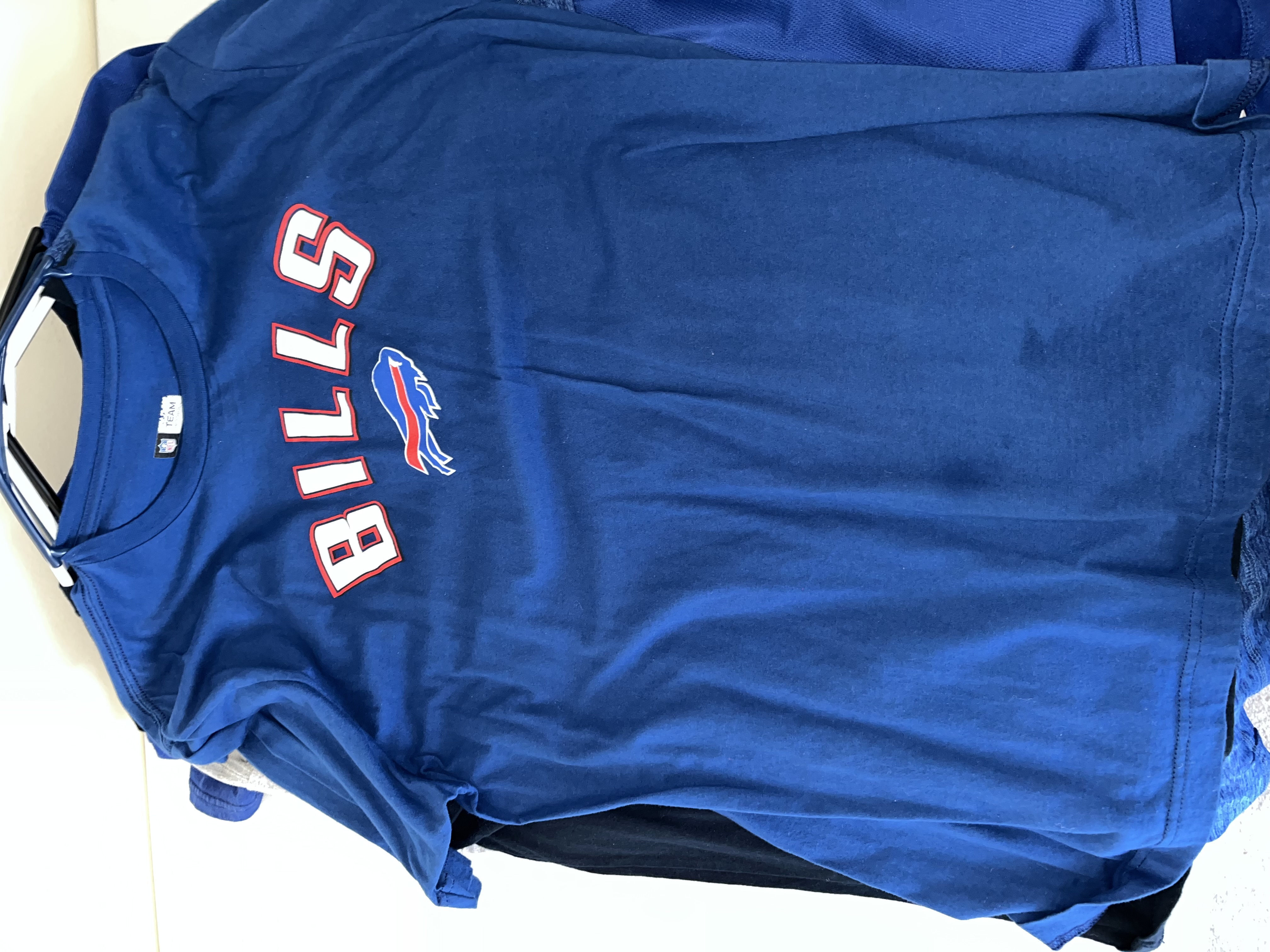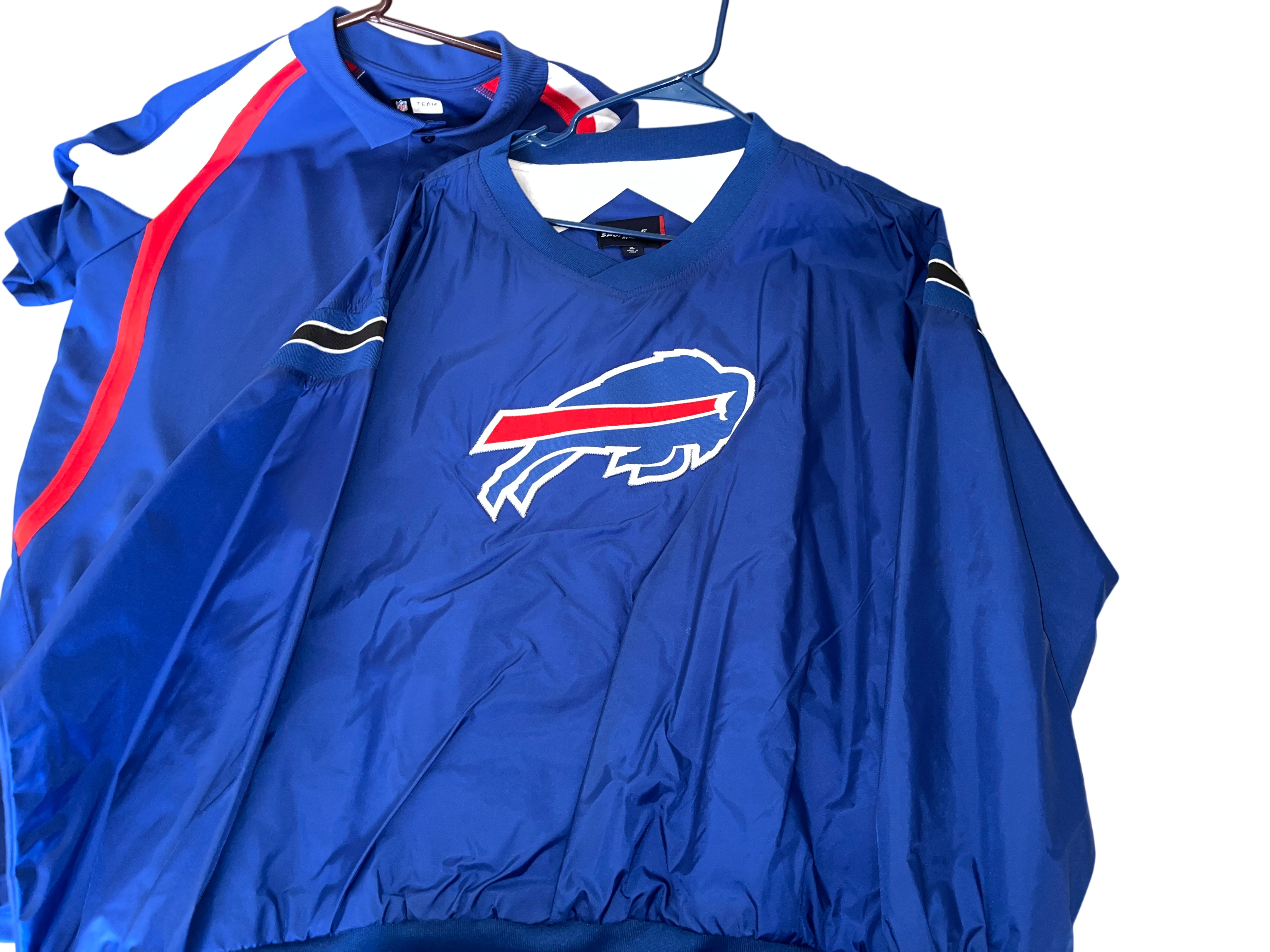 This lot features a comprehensive collection of Buffalo Bills fan apparel. The primary item is a blue nylon v-neck pullover windbreaker with a large embroidered charging buffalo logo on the center chest and white and black striped accents on the sleeves. The collection includes a blue short-sleeve performance polo shirt by NFL Team Apparel, featuring red and white side-panel accents and a Bills Football patch on the right sleeve. Also included are seven assorted t-shirts: a grey distressed Established 1960 graphic tee, a royal blue Bills block lettering tee, a black Mafia Football shield graphic tee, a heathered royal blue chest logo tee, a blue performance-style Buffalo Bills Football tee, a light grey Buffalo Football graphic tee, and a navy vertical graphic team logo tee. These items are standard retail fan apparel and do not include signatures, game-use evidence, or third-party authentication.