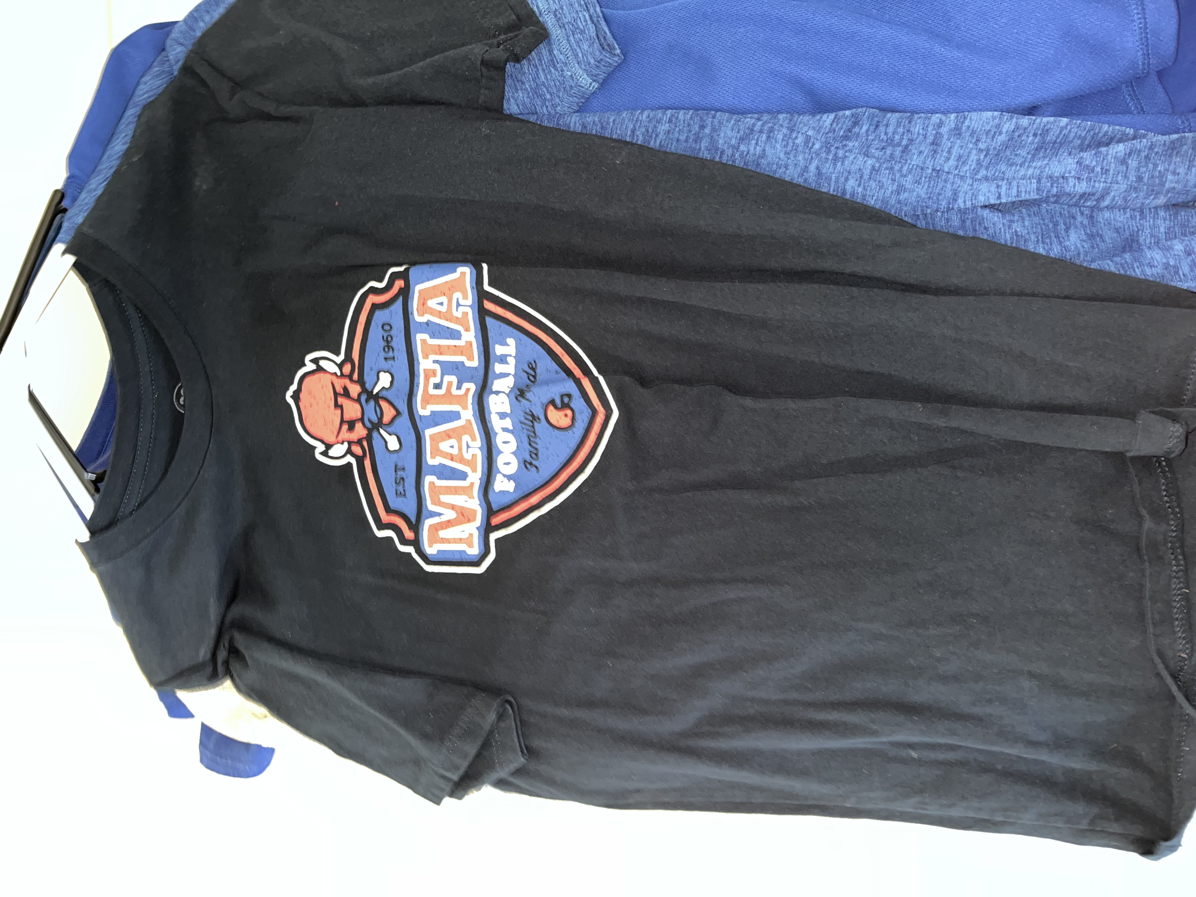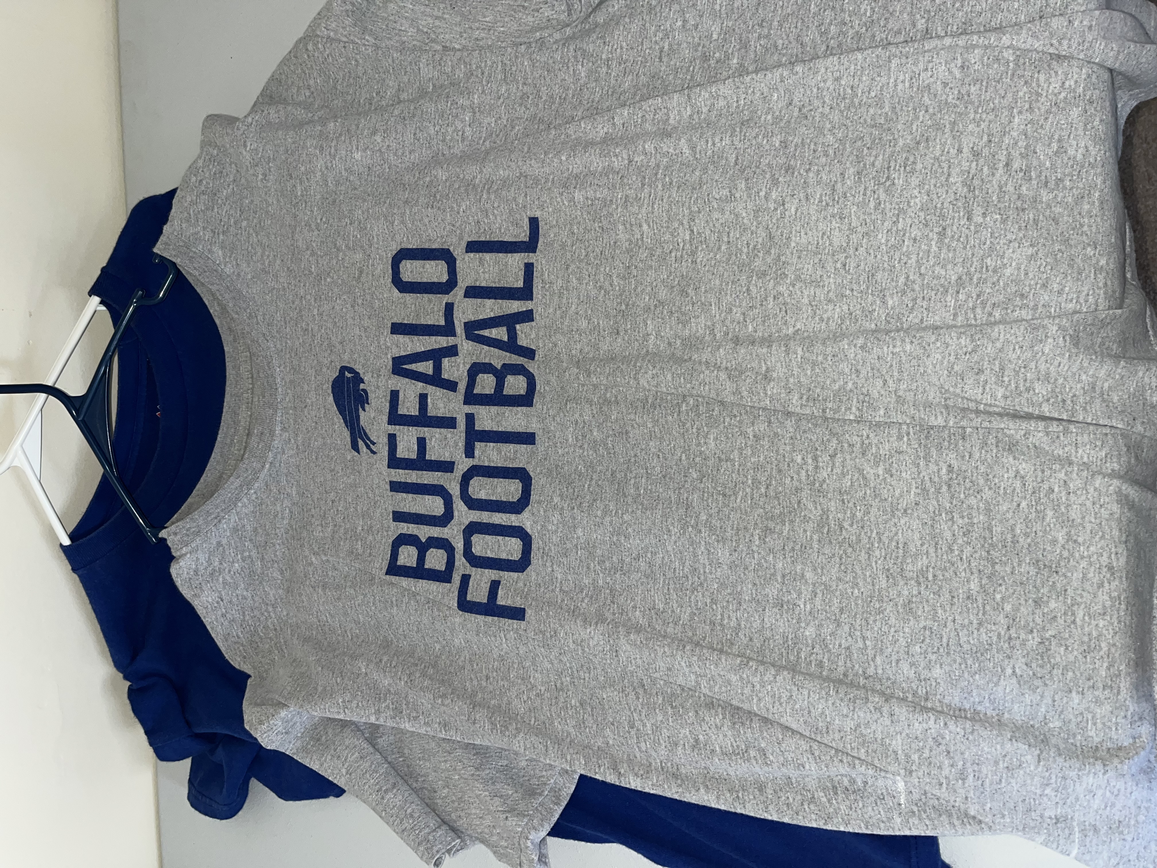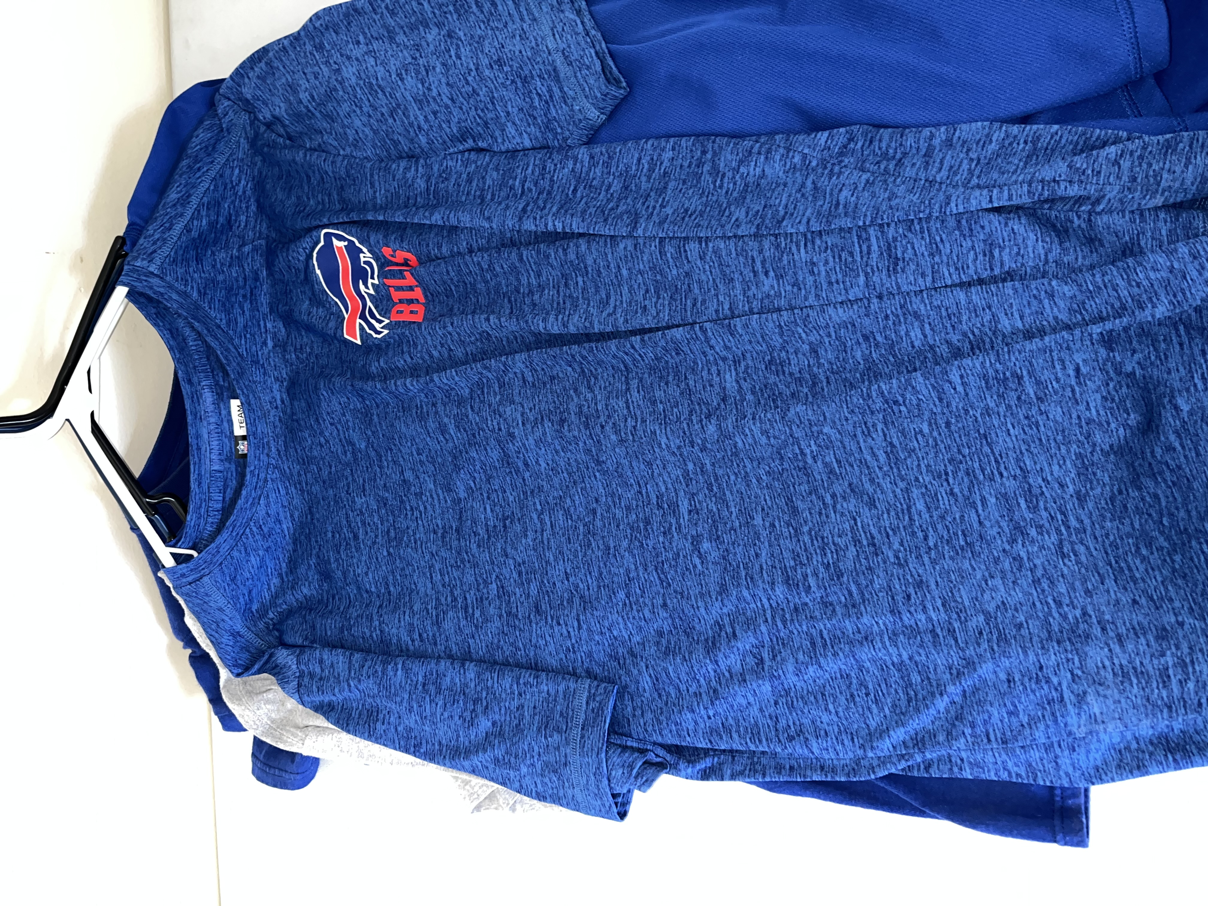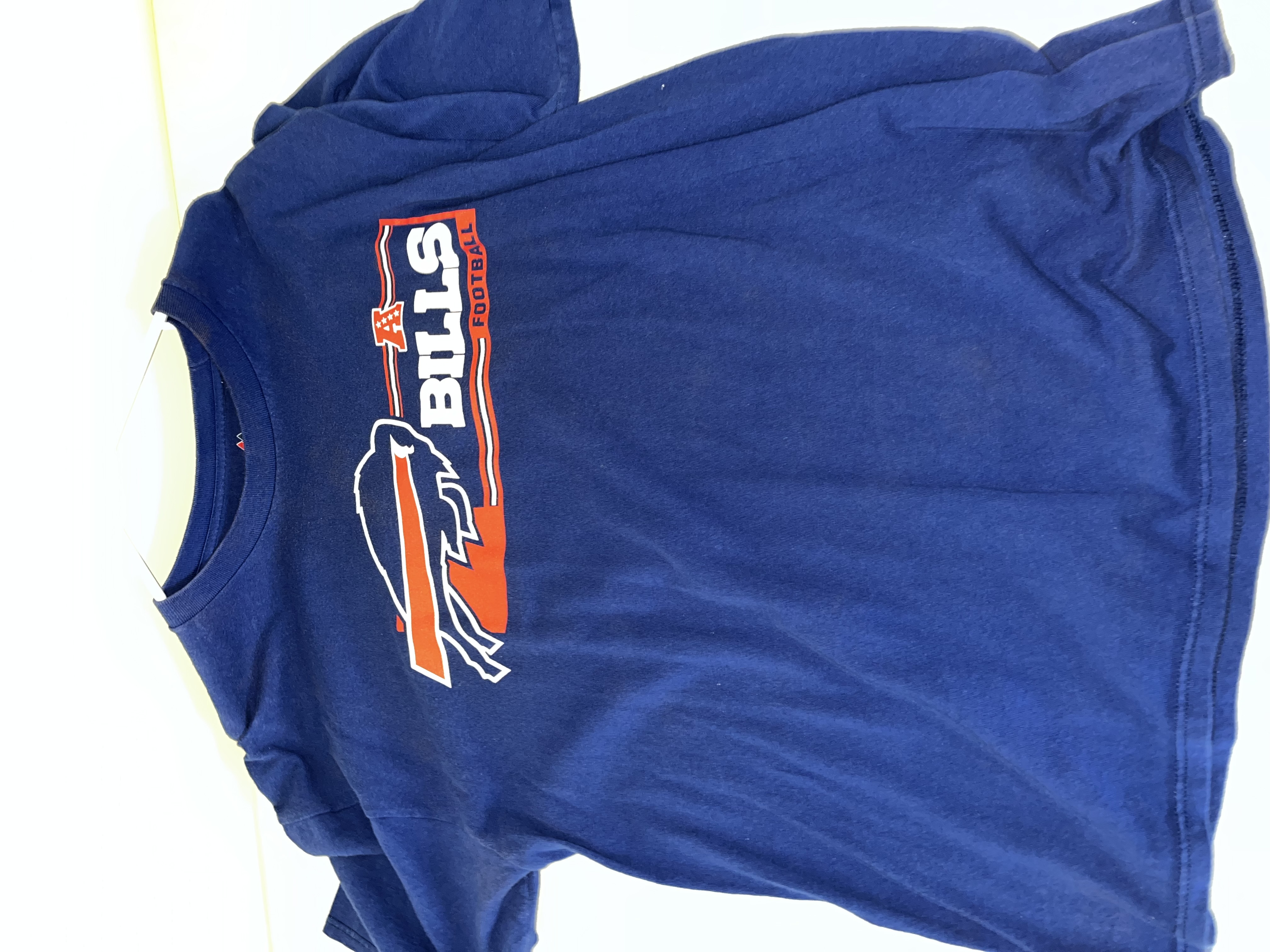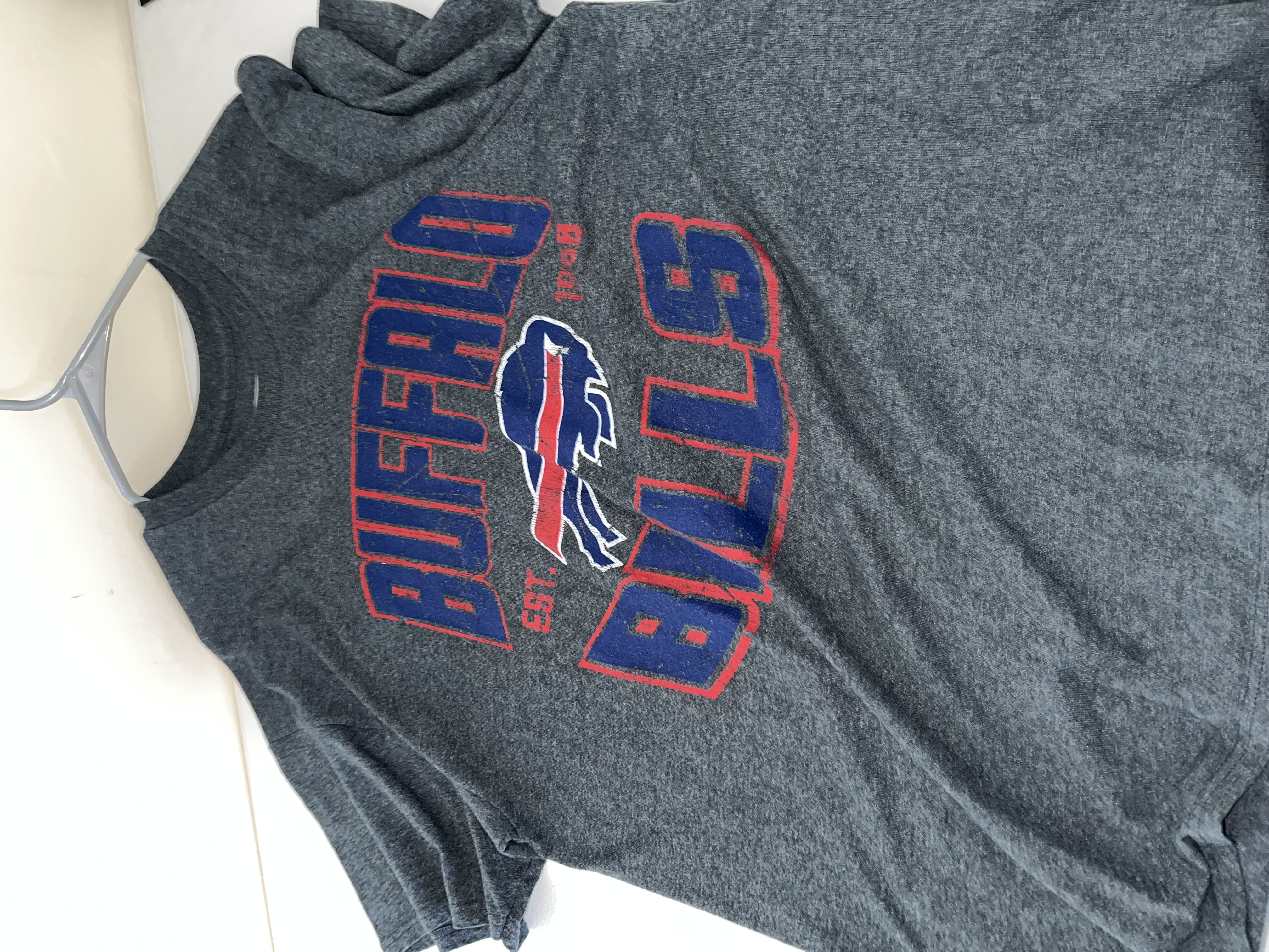 This lot features a comprehensive collection of Buffalo Bills fan apparel. The primary item is a blue nylon v-neck pullover windbreaker with a large embroidered charging buffalo logo on the center chest and white and black striped accents on the sleeves. The collection includes a blue short-sleeve performance polo shirt by NFL Team Apparel, featuring red and white side-panel accents and a Bills Football patch on the right sleeve. Also included are seven assorted t-shirts: a grey distressed Established 1960 graphic tee, a royal blue Bills block lettering tee, a black Mafia Football shield graphic tee, a heathered royal blue chest logo tee, a blue performance-style Buffalo Bills Football tee, a light grey Buffalo Football graphic tee, and a navy vertical graphic team logo tee. These items are standard retail fan apparel and do not include signatures, game-use evidence, or third-party authentication.