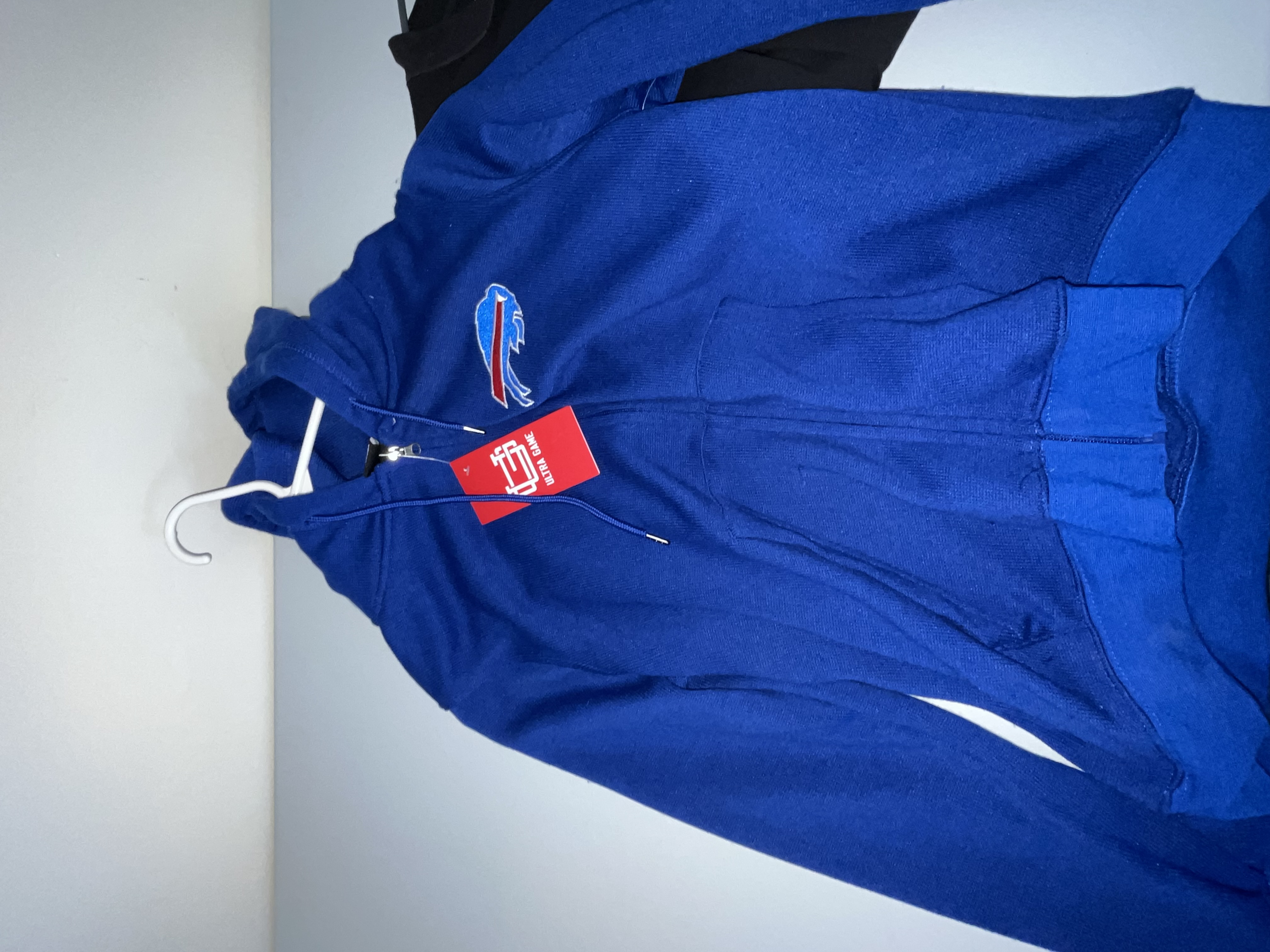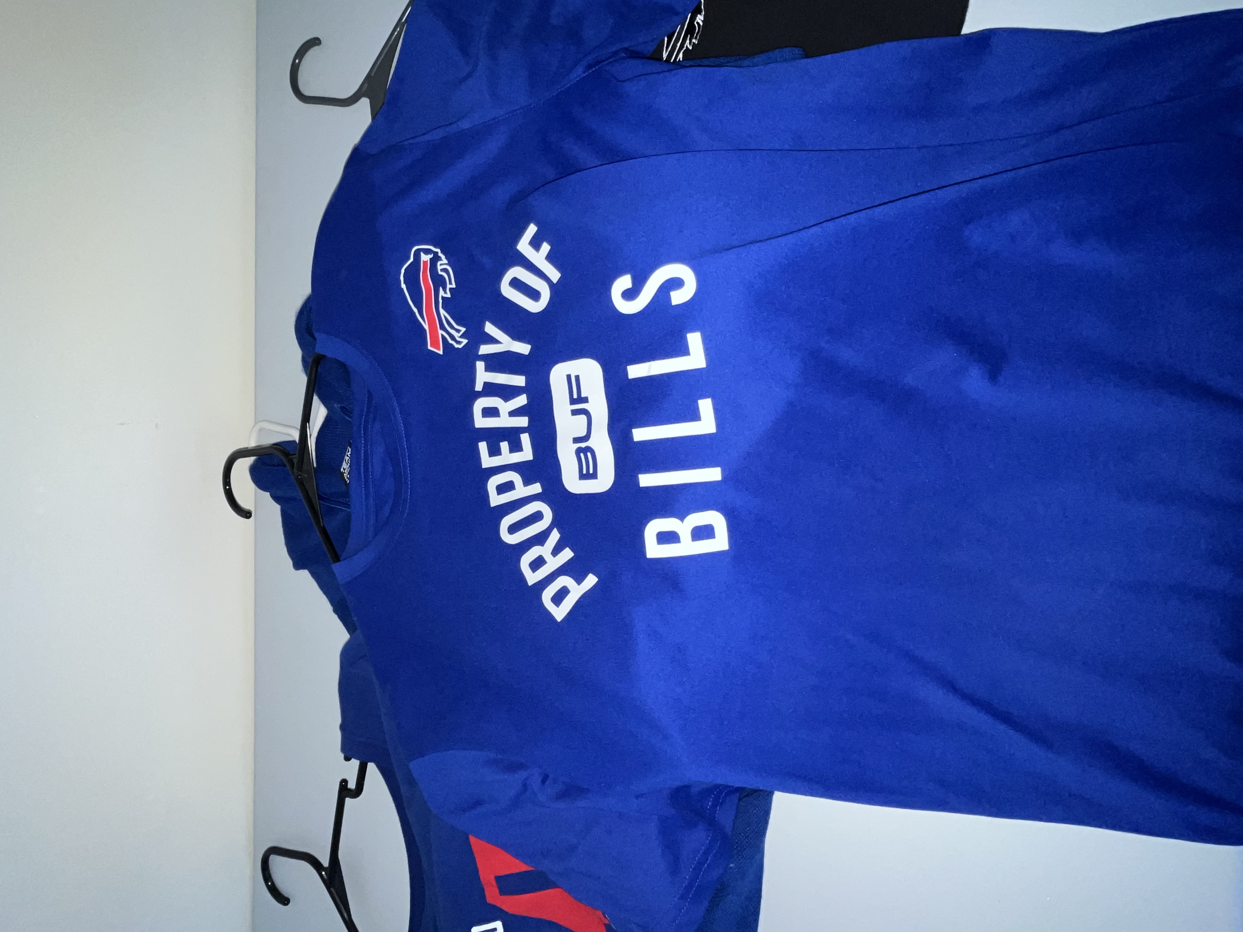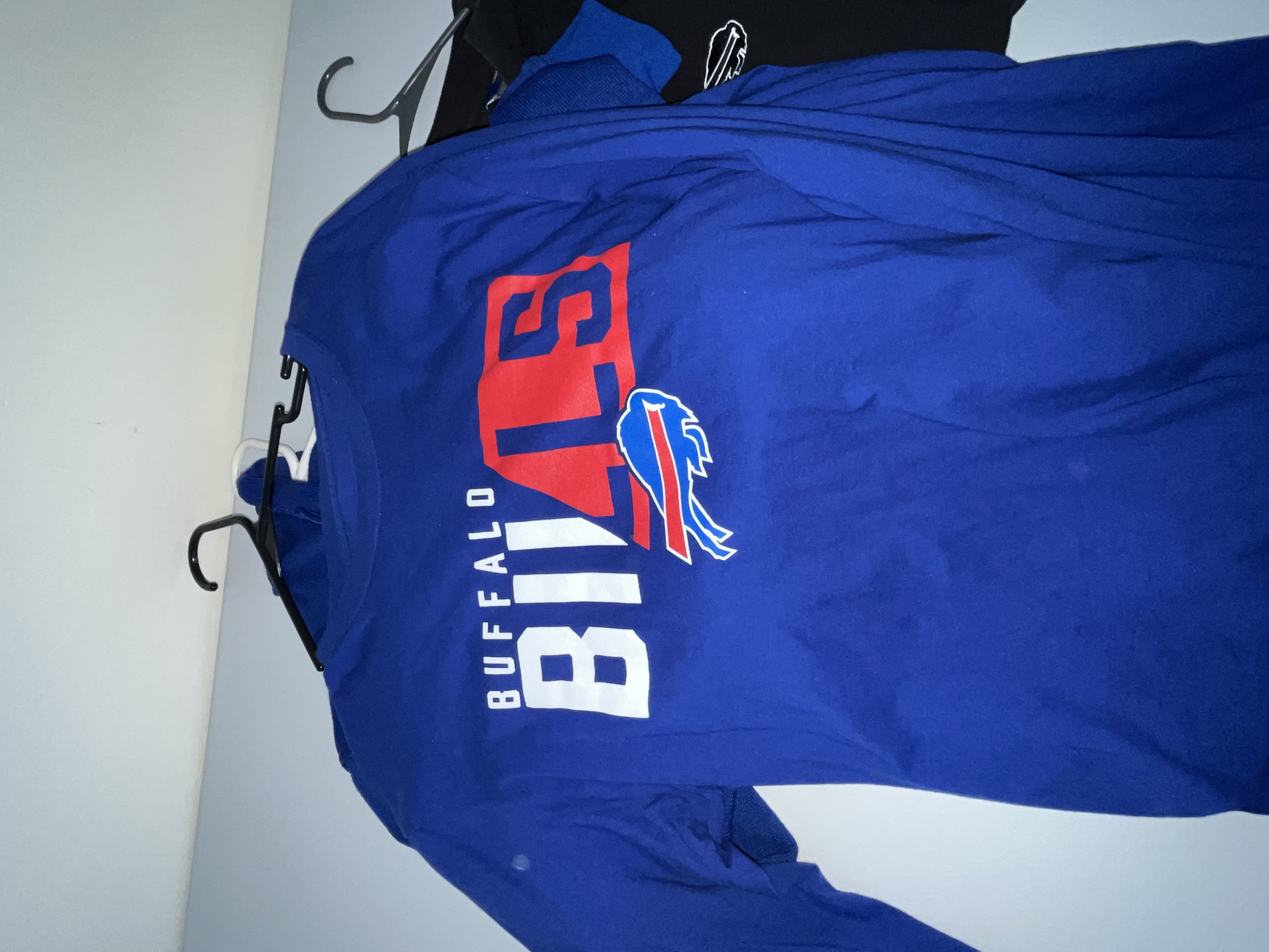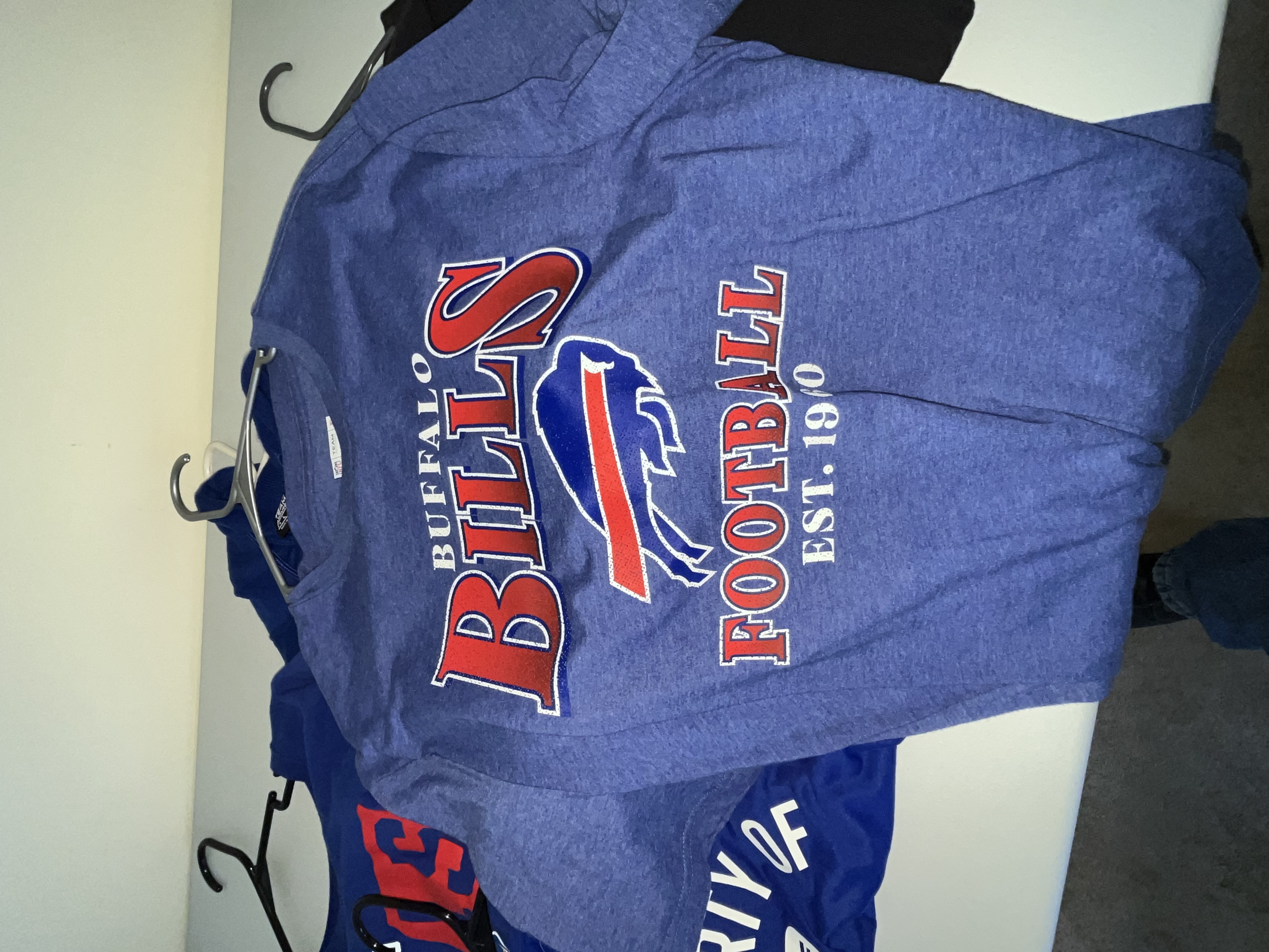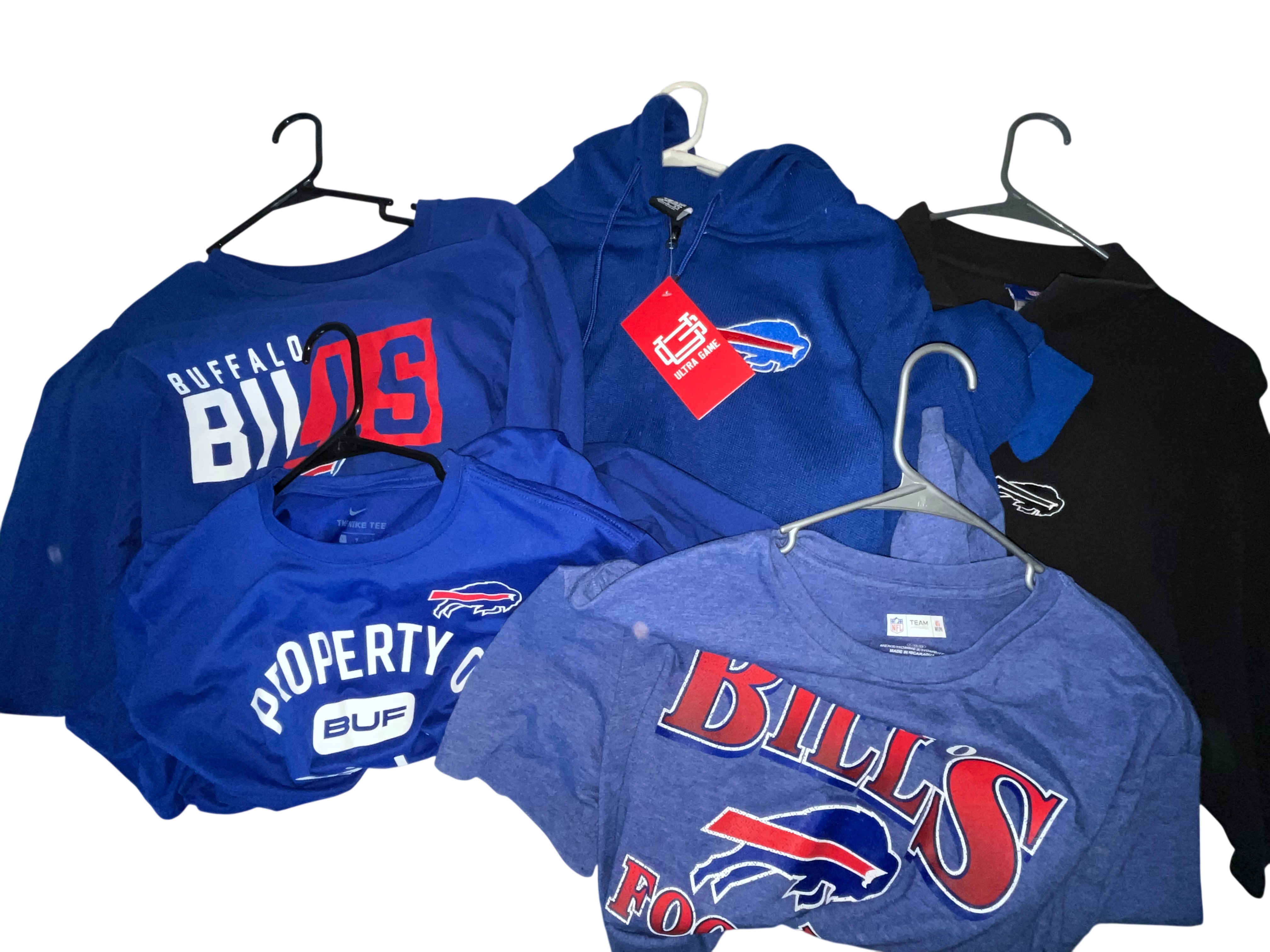 This lot consists of five pieces of Buffalo Bills NFL apparel. The collection includes one royal blue Ultra Game full-zip hoodie featuring an embroidered team logo and original retail tags. Also included is one black short-sleeve polo shirt with a small embroidered white logo outline and NFL Team Apparel labeling; one heather blue t-shirt with a Buffalo Bills Football Est. 1960 graphic; one royal blue Nike Property Of BUF Bills t-shirt; and one royal blue long-sleeve shirt featuring a large block-letter Buffalo Bills graphic. These items represent a mix of contemporary fan wear from recognized brands including Nike and Ultra Game.