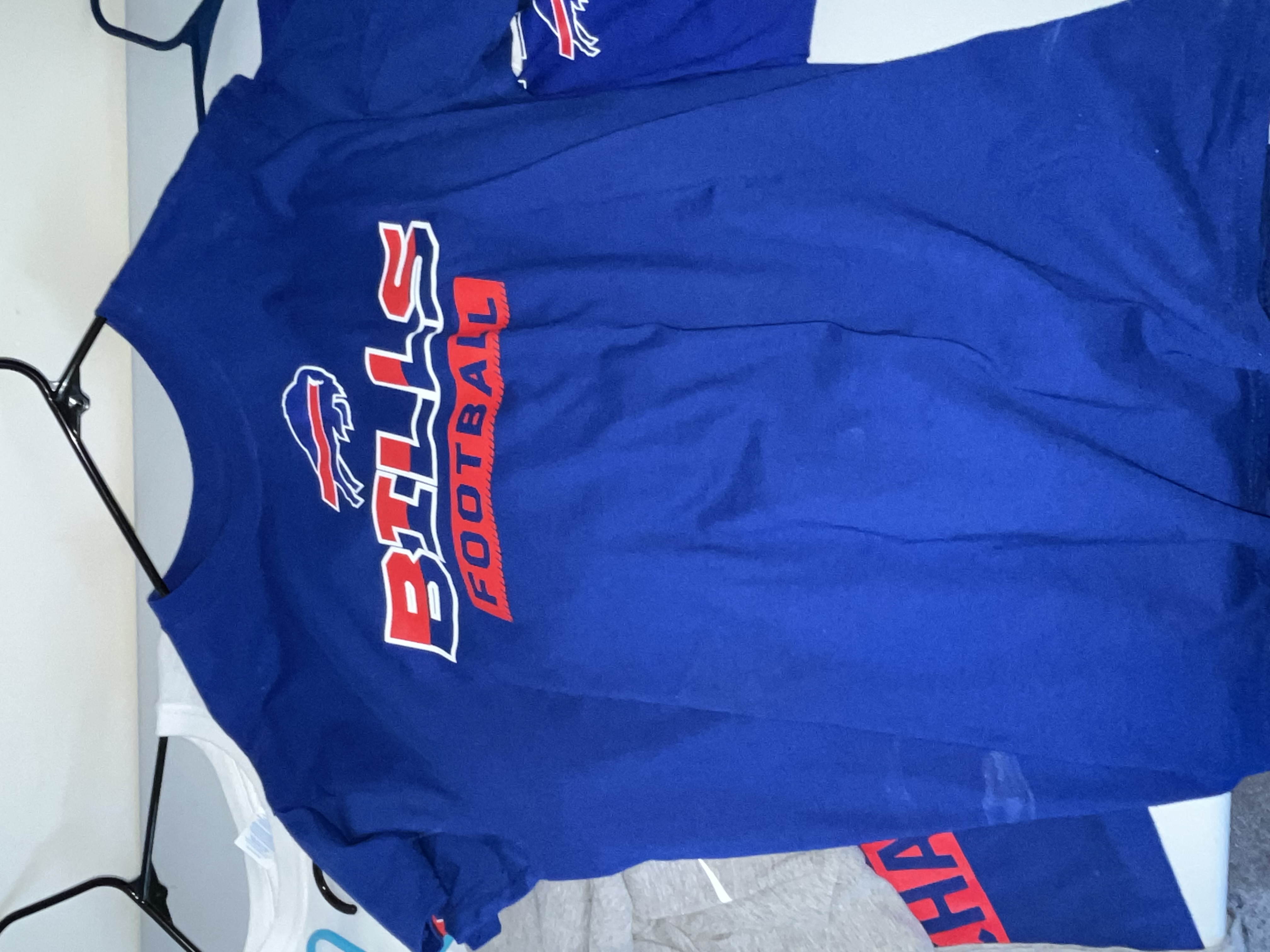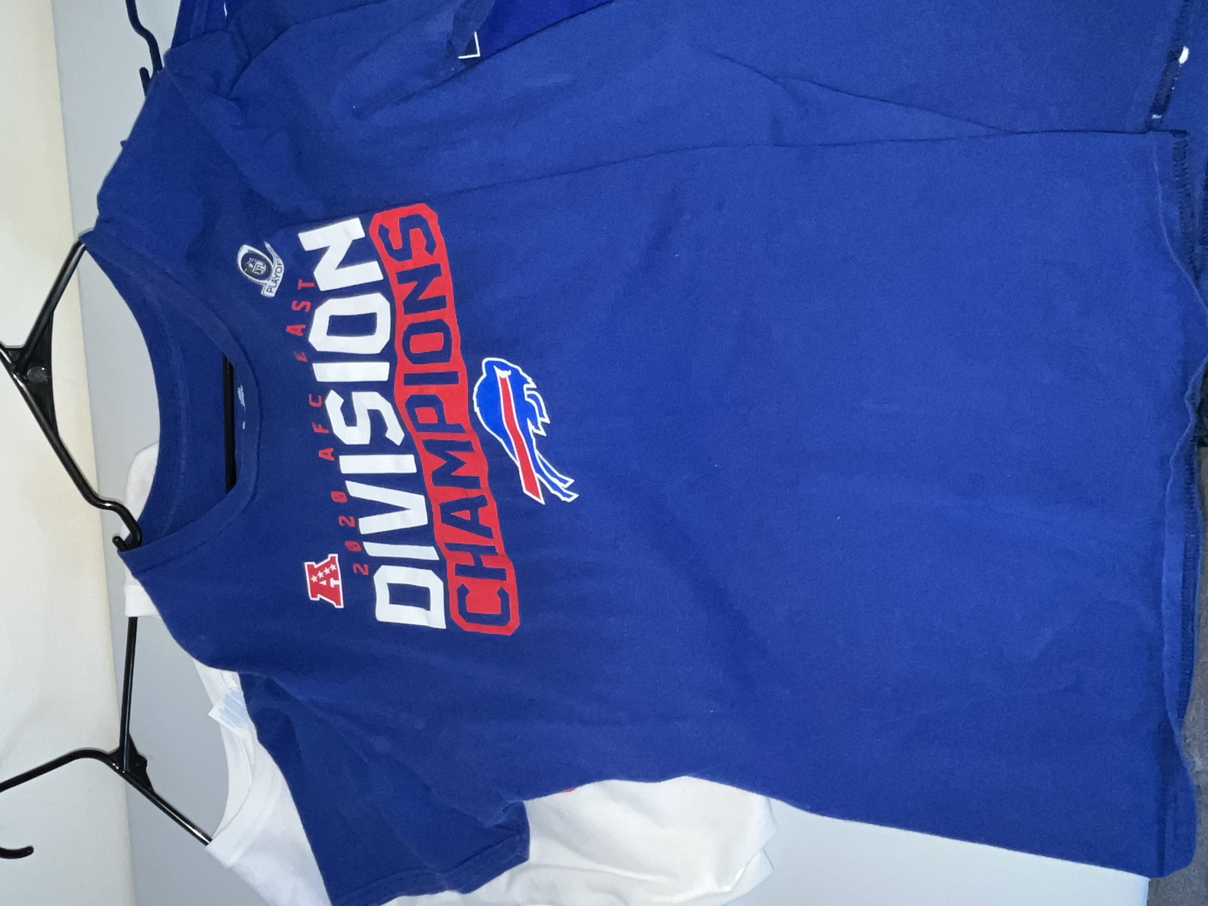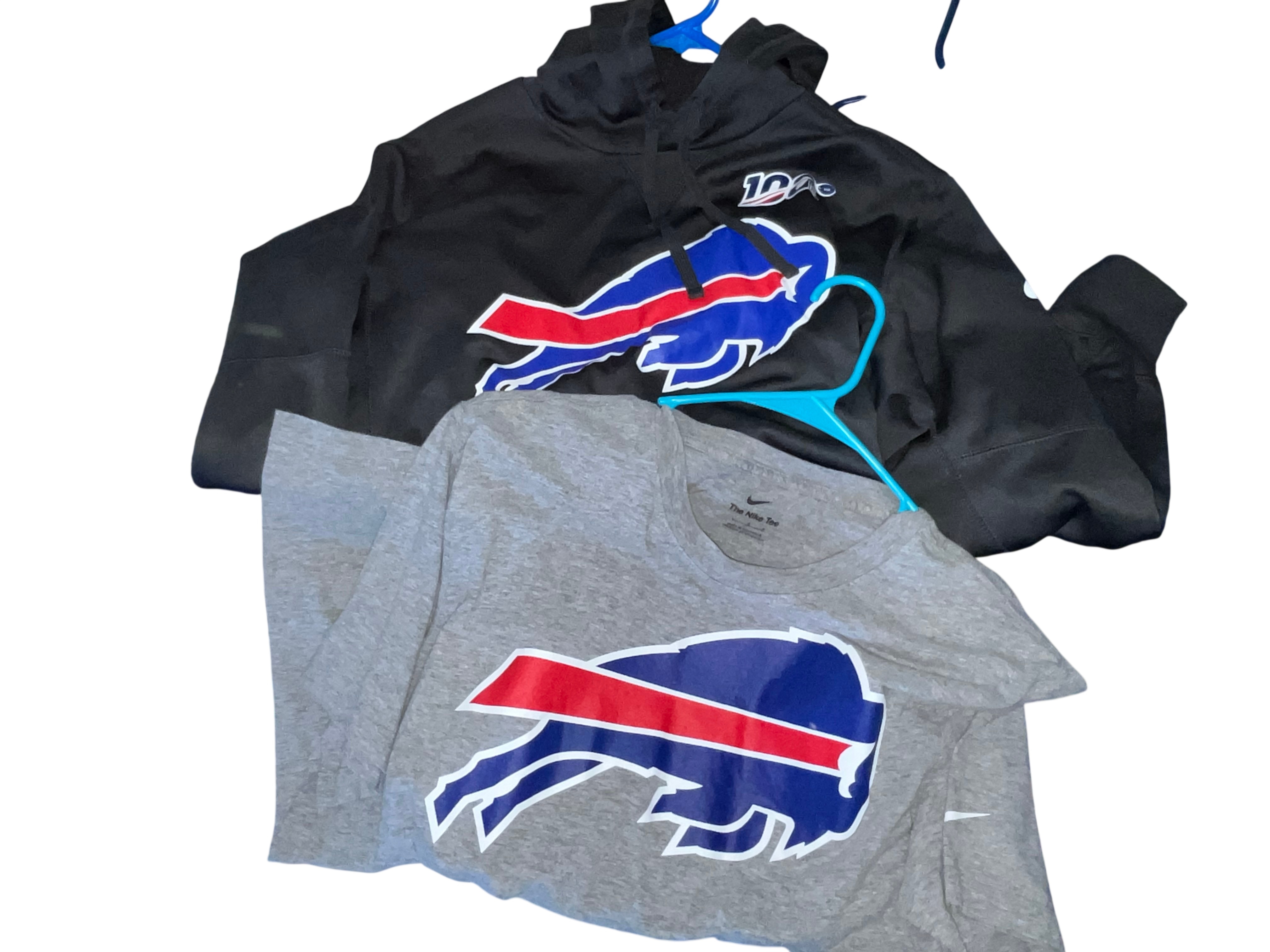 This collection of Buffalo Bills fan apparel includes six individual pieces of team-branded clothing. The lot features one black hoodie with a large charging buffalo logo and the official NFL 100th Anniversary logo on the upper left chest. Included are three short-sleeve t-shirts: a grey Nike brand shirt with a centered logo, a blue commemorative shirt celebrating the 2020 AFC East Division Champions, and a blue shirt featuring the text graphic BILLS FOOTBALL. The lot is completed by two long-sleeve t-shirts: a white Buffalo Mafia shirt by Extreme Streetwear featuring the text Reckless Fearless Victorious and a royal blue shirt with vertical BUFFALO BILLS block lettering. These items are standard retail fan apparel and do not contain signatures, game-use evidence, or third-party authentication.