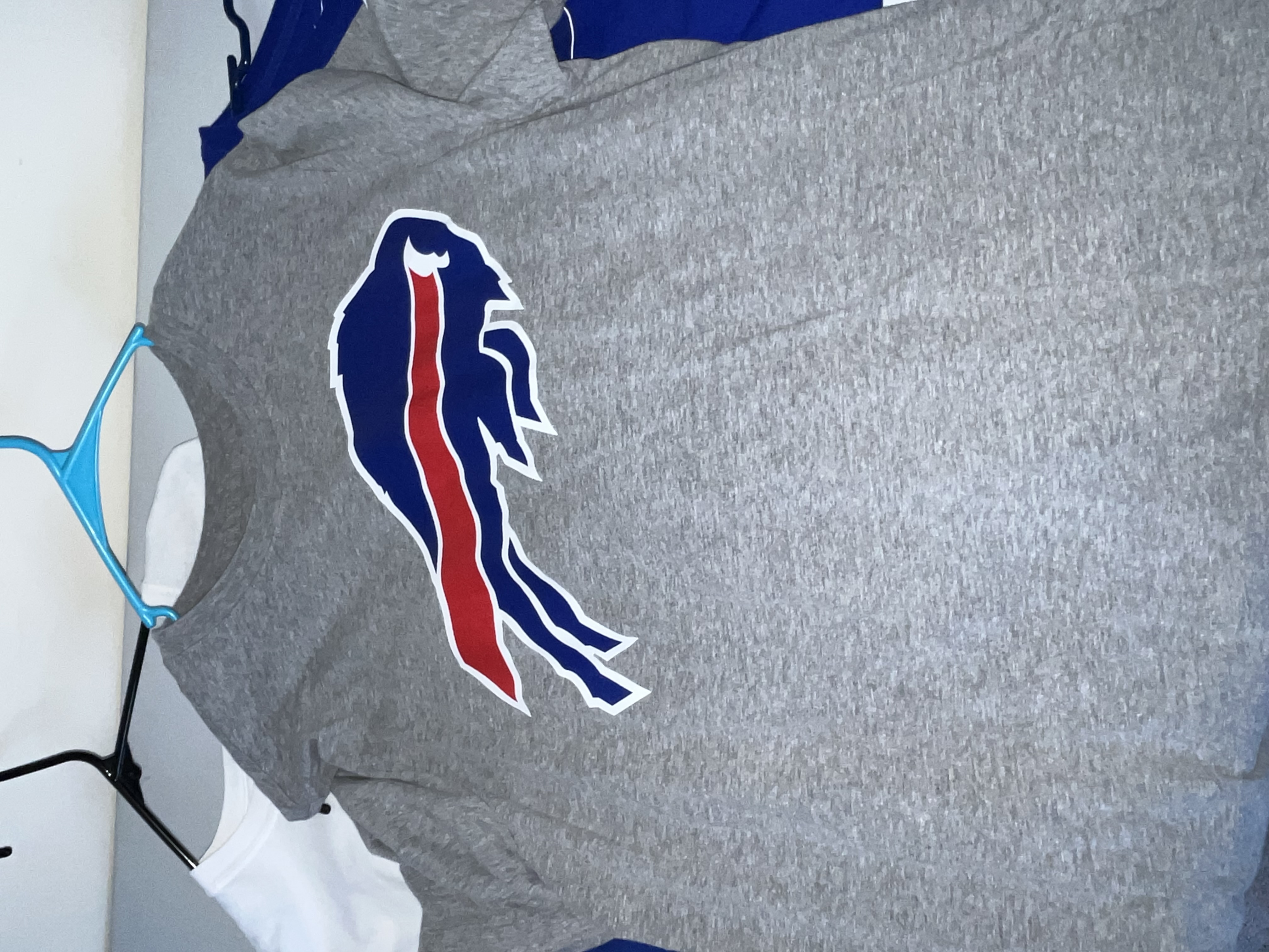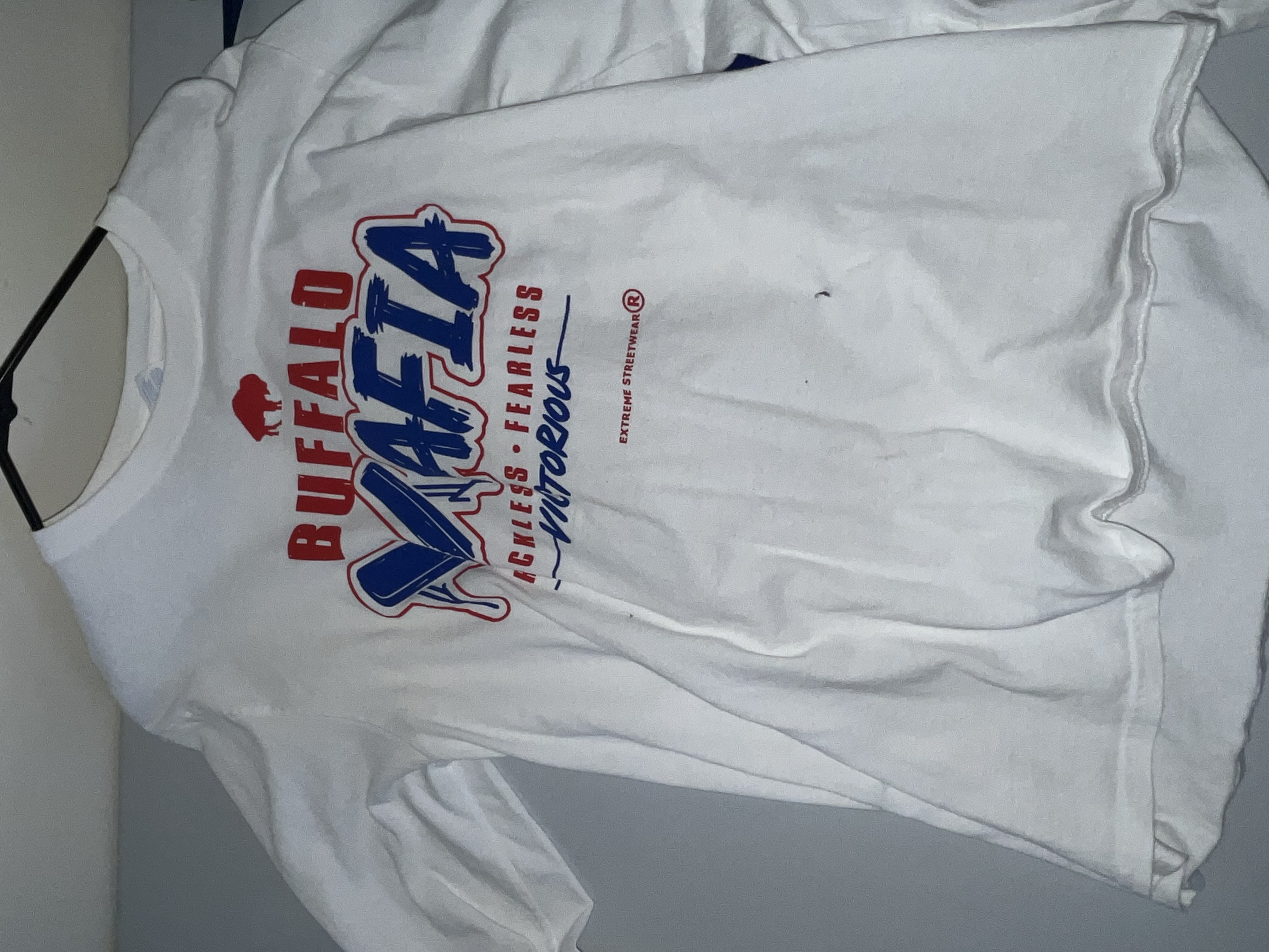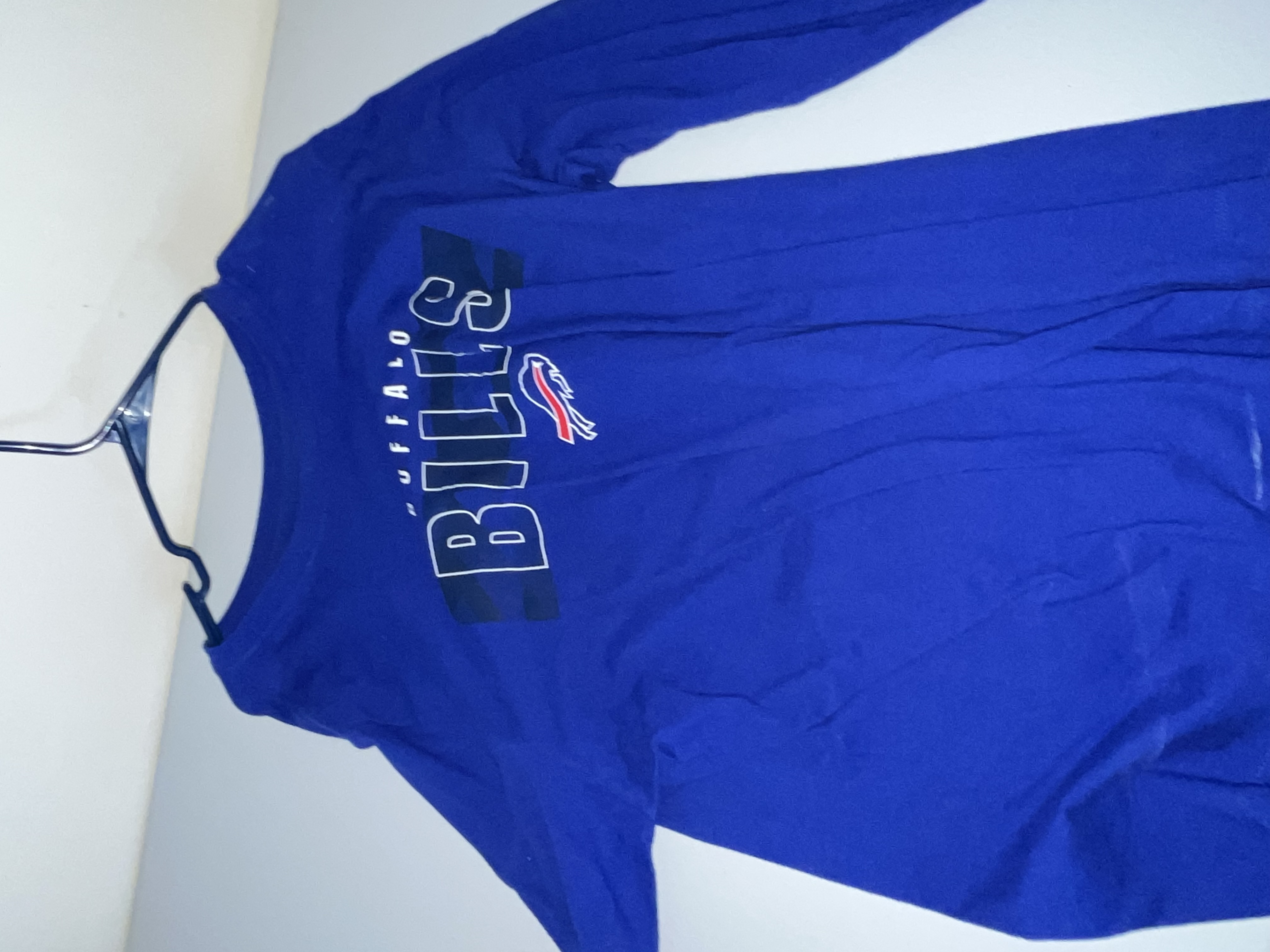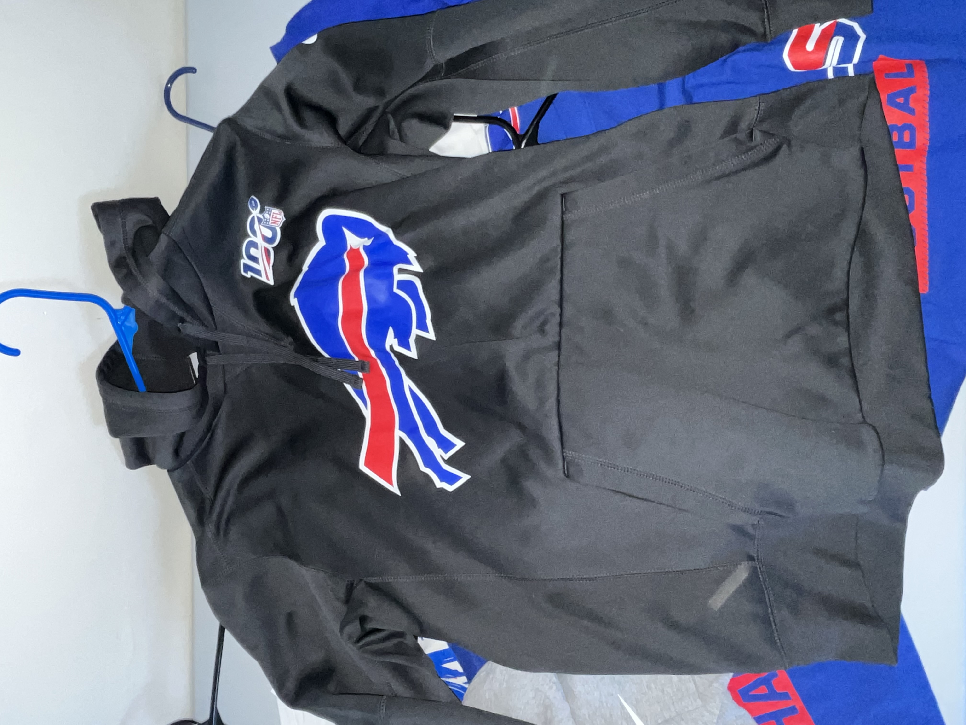 This collection of Buffalo Bills fan apparel includes six individual pieces of team-branded clothing. The lot features one black hoodie with a large charging buffalo logo and the official NFL 100th Anniversary logo on the upper left chest. Included are three short-sleeve t-shirts: a grey Nike brand shirt with a centered logo, a blue commemorative shirt celebrating the 2020 AFC East Division Champions, and a blue shirt featuring the text graphic BILLS FOOTBALL. The lot is completed by two long-sleeve t-shirts: a white Buffalo Mafia shirt by Extreme Streetwear featuring the text Reckless Fearless Victorious and a royal blue shirt with vertical BUFFALO BILLS block lettering. These items are standard retail fan apparel and do not contain signatures, game-use evidence, or third-party authentication.