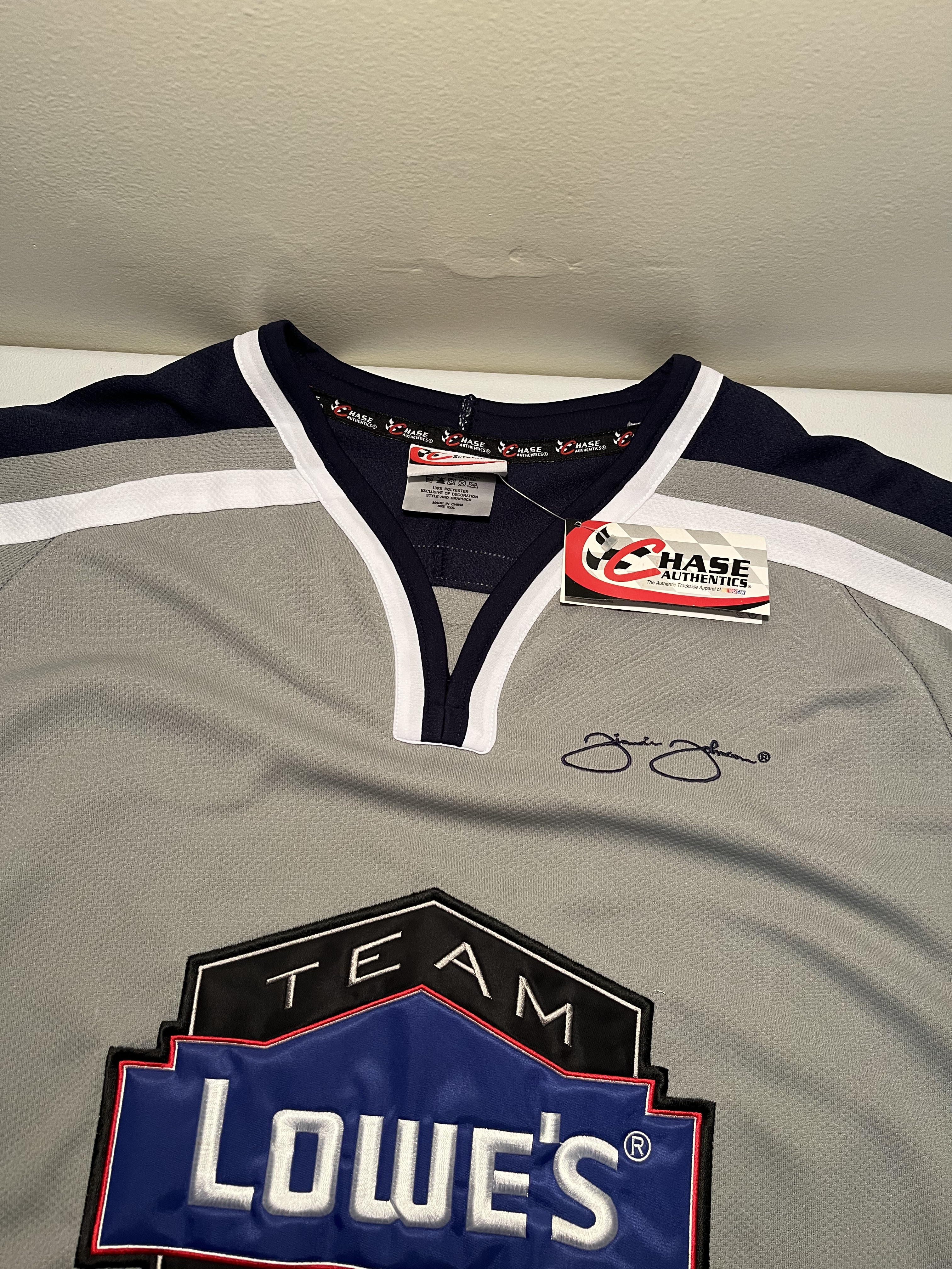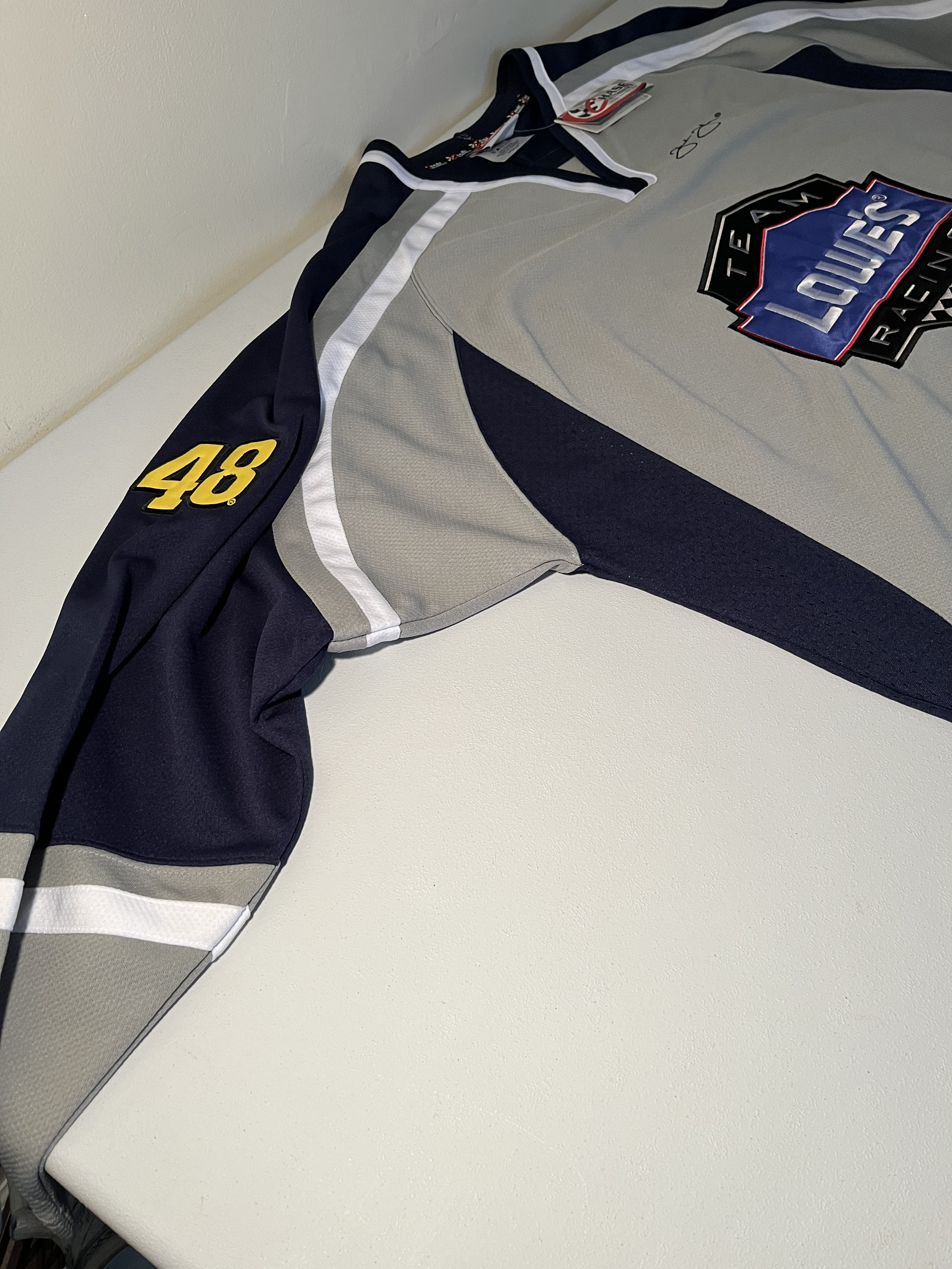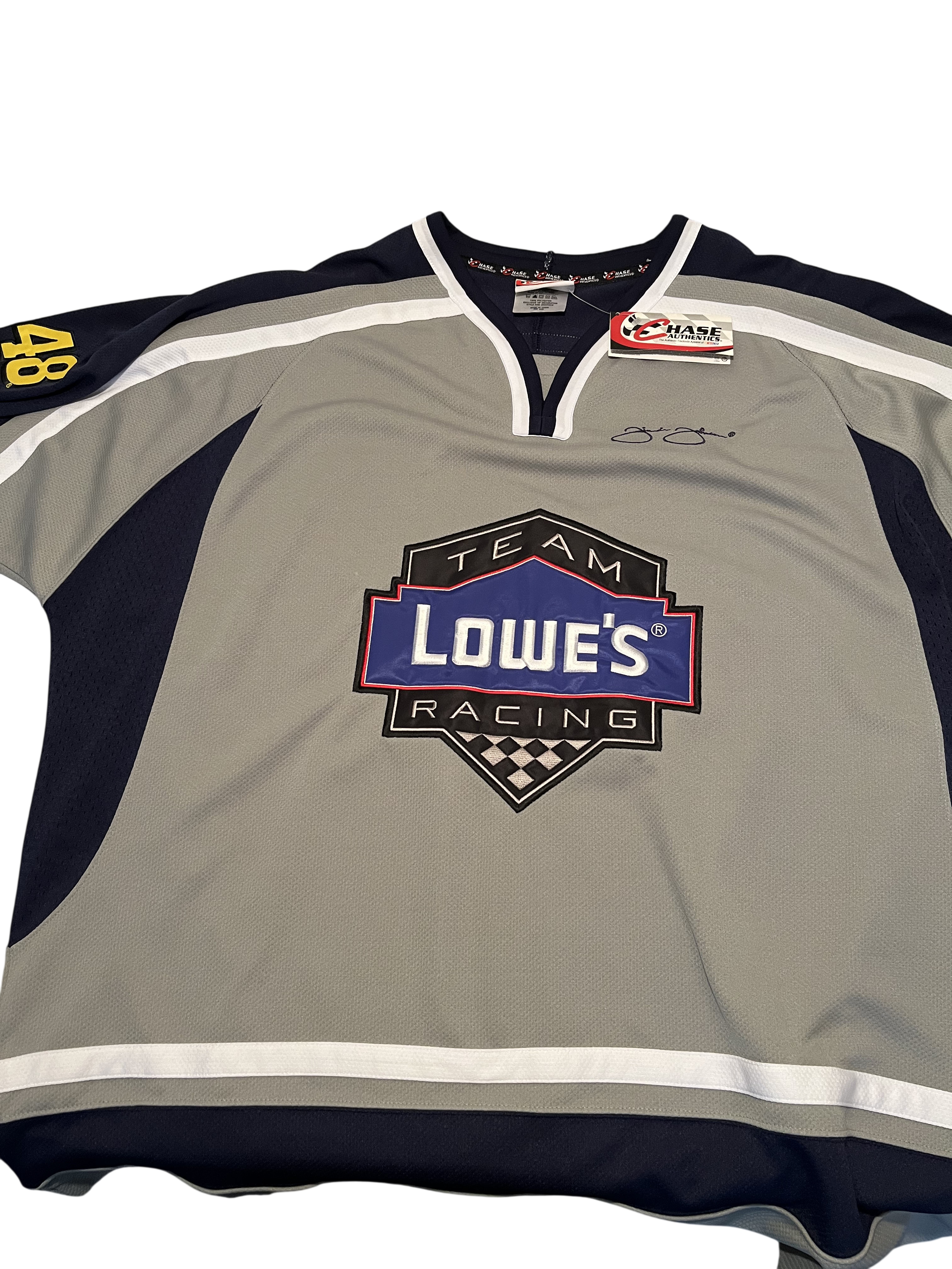This is a licensed Chase Authentics long-sleeved fan apparel jersey representing seven-time NASCAR Cup Series champion Jimmie Johnson and the Hendrick Motorsports No. 48 Team Lowe’s Racing program. The jersey is constructed from 100 percent polyester and styled similarly to a hockey sweater, featuring a grey body with navy blue side panels and white stripe accents. The front of the garment displays a large, multi-layered embroidered Team Lowe’s Racing logo centered on the chest. A navy blue facsimile signature of Jimmie Johnson is positioned on the upper left chest. The right sleeve features an embroidered yellow number 48 with a black outline, consistent with the driver’s car number during the 2005 season. The interior neck contains Chase Authentics brand tape and a manufacturer label indicating size XXXL. This is a retail commemorative item and does not carry third-party authentication as the signature is a facsimile.