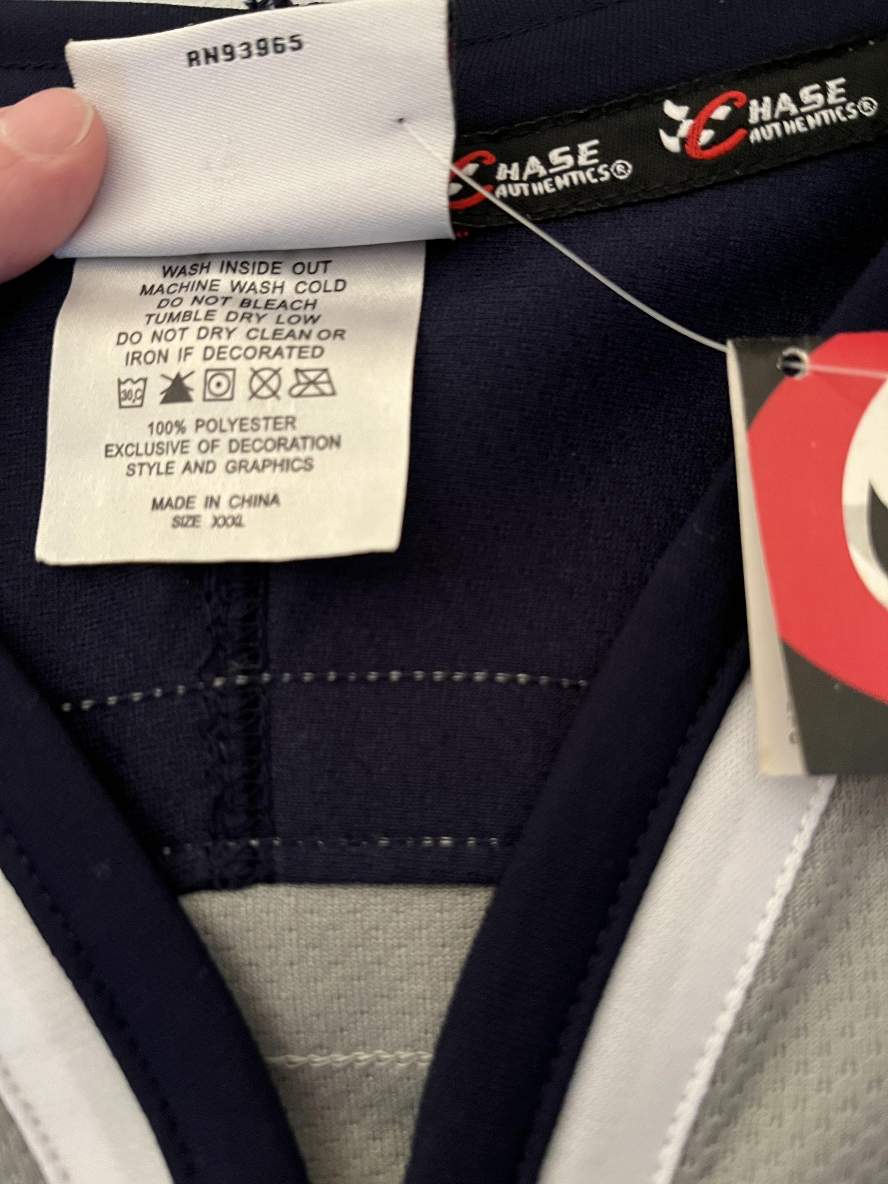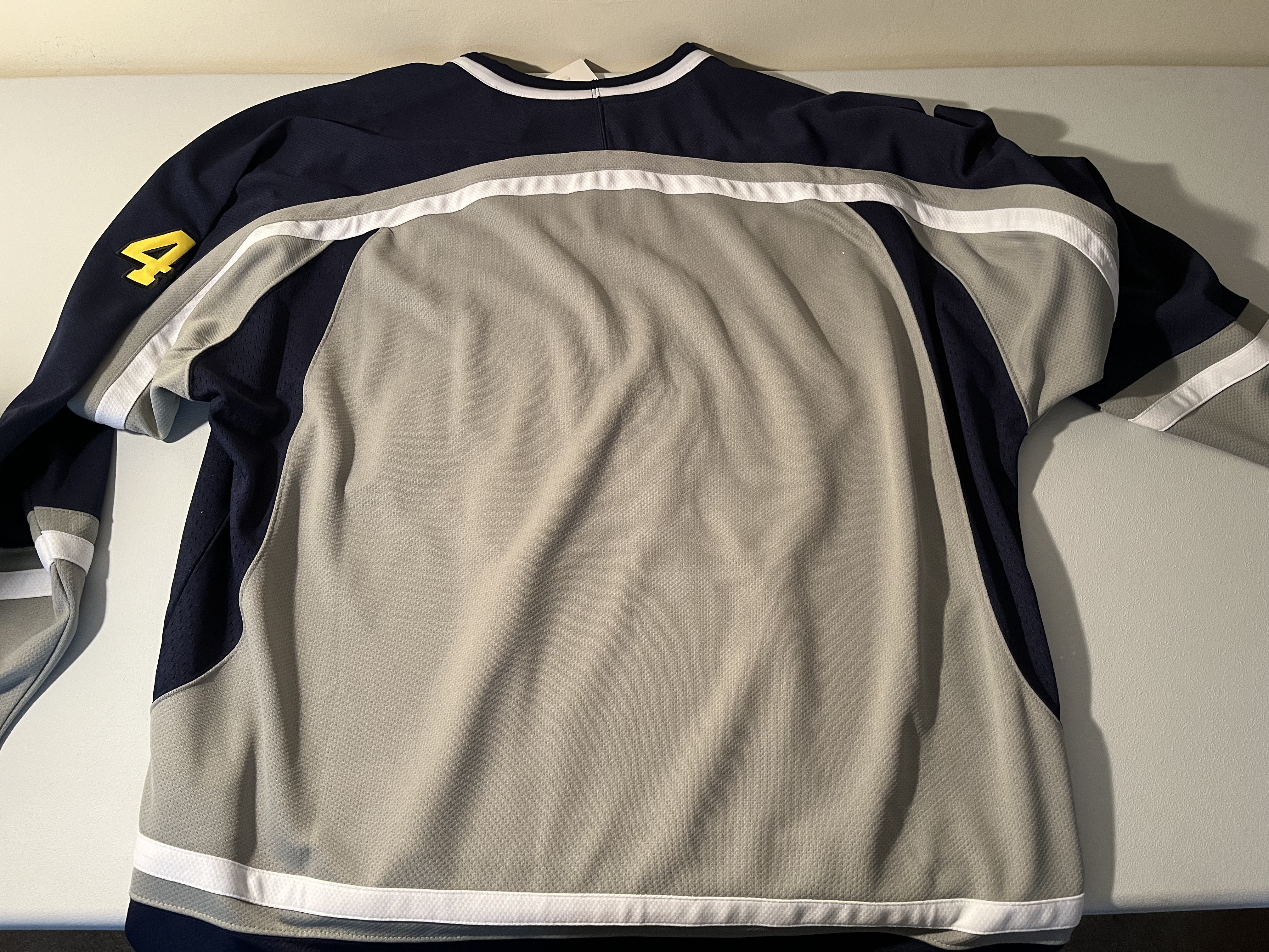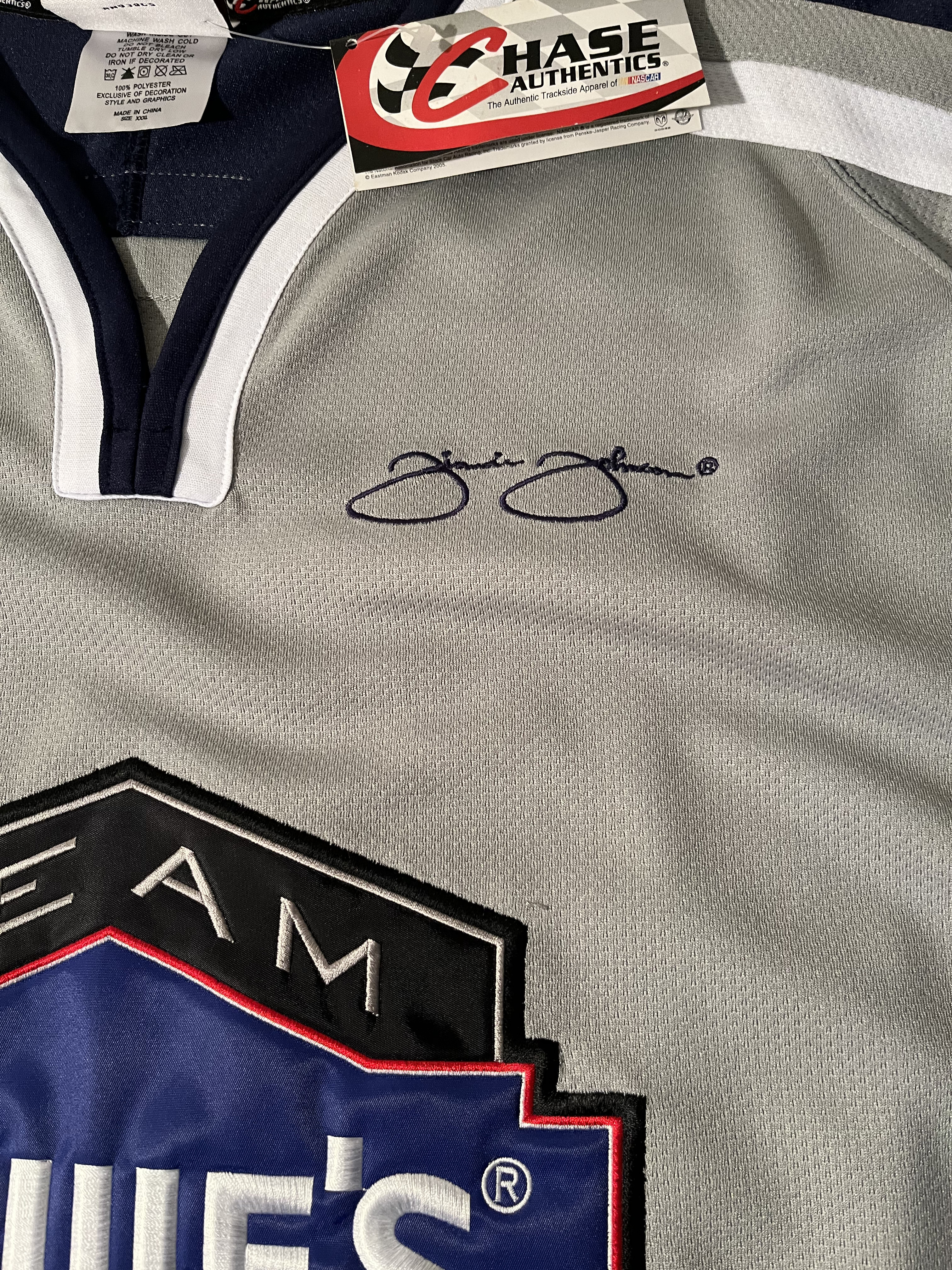 This is a licensed Chase Authentics long-sleeved fan apparel jersey representing seven-time NASCAR Cup Series champion Jimmie Johnson and the Hendrick Motorsports No. 48 Team Lowe’s Racing program. The jersey is constructed from 100 percent polyester and styled similarly to a hockey sweater, featuring a grey body with navy blue side panels and white stripe accents. The front of the garment displays a large, multi-layered embroidered Team Lowe’s Racing logo centered on the chest. A navy blue facsimile signature of Jimmie Johnson is positioned on the upper left chest. The right sleeve features an embroidered yellow number 48 with a black outline, consistent with the driver’s car number during the 2005 season. The interior neck contains Chase Authentics brand tape and a manufacturer label indicating size XXXL. This is a retail commemorative item and does not carry third-party authentication as the signature is a facsimile.