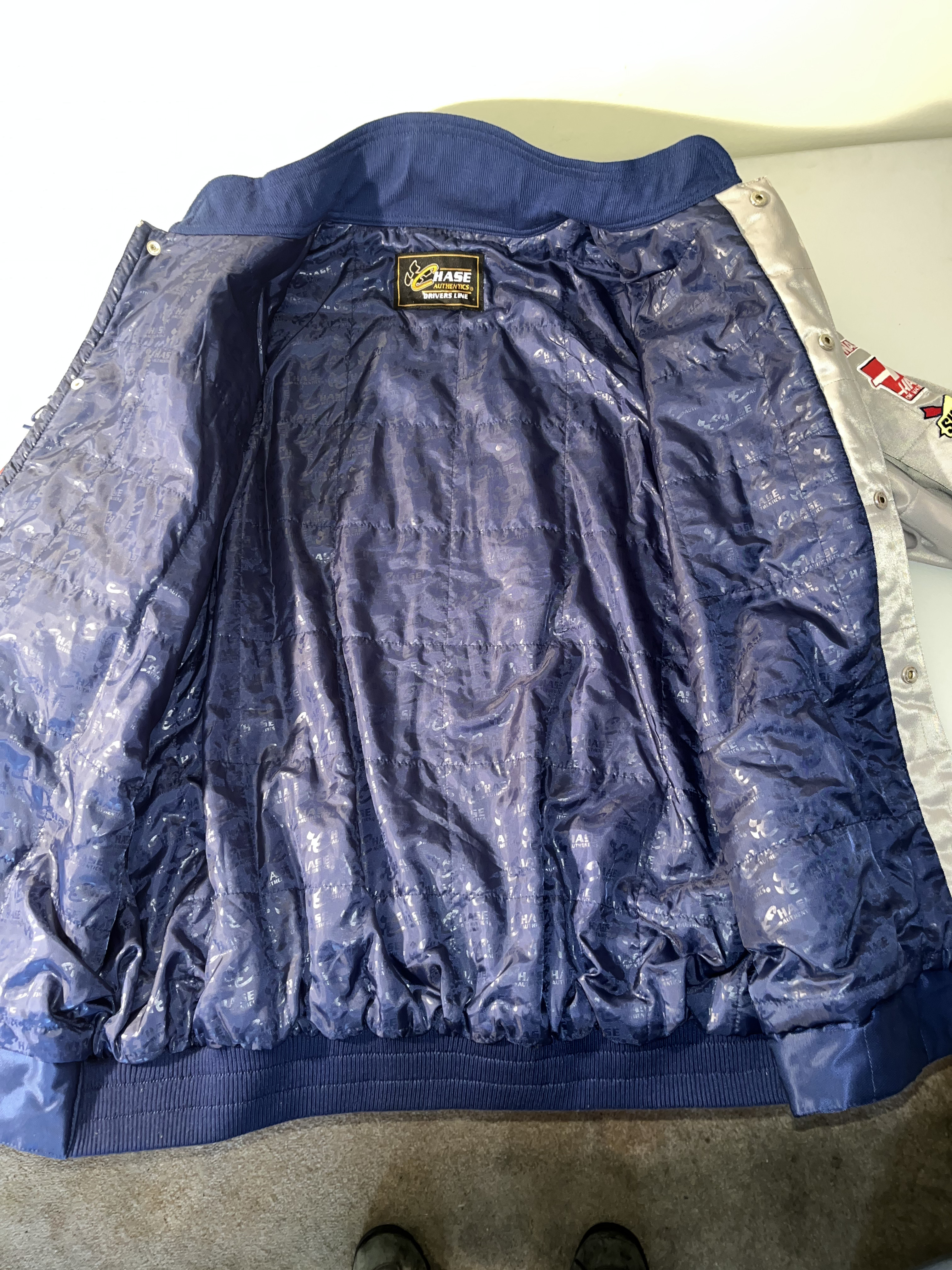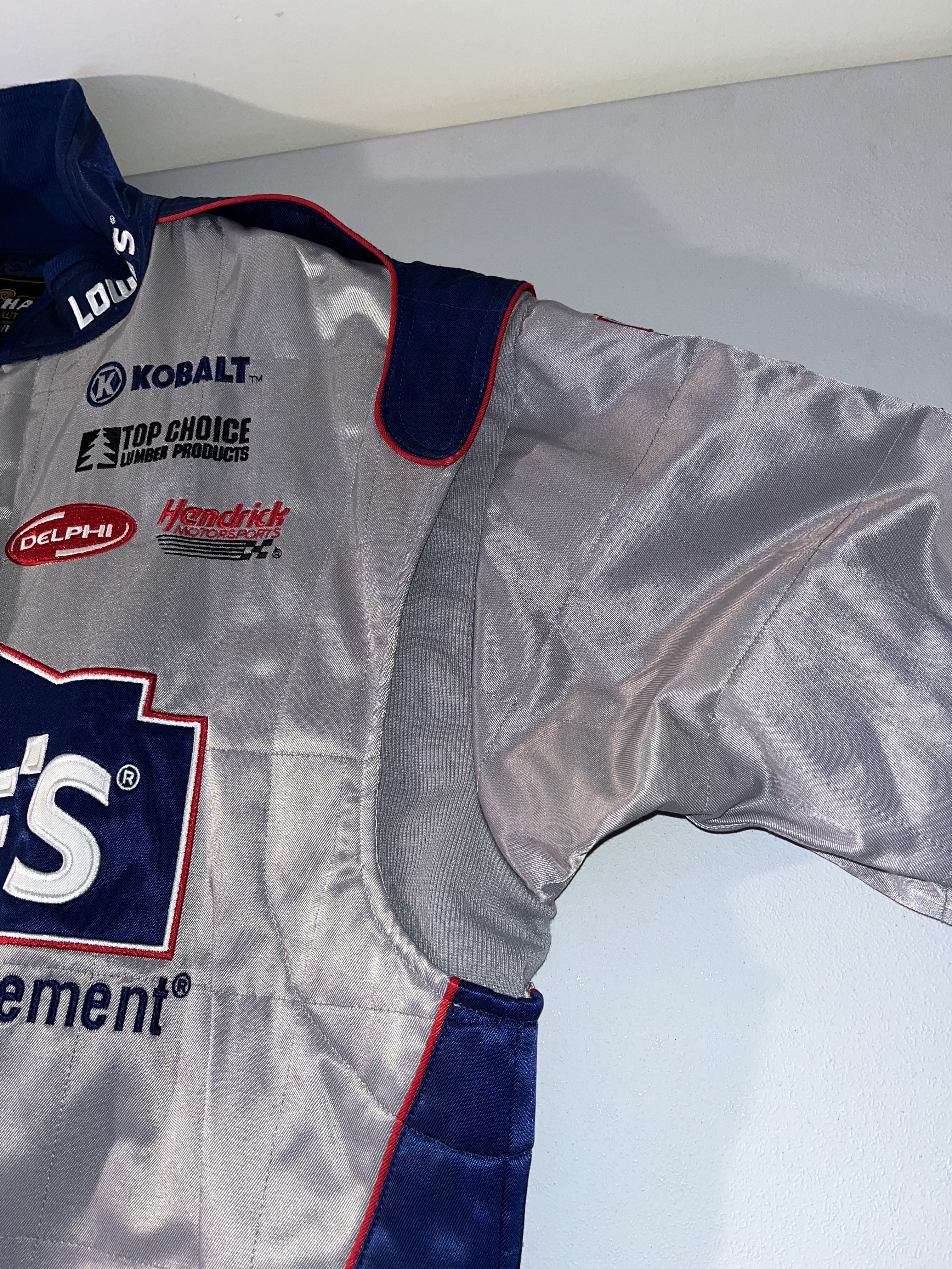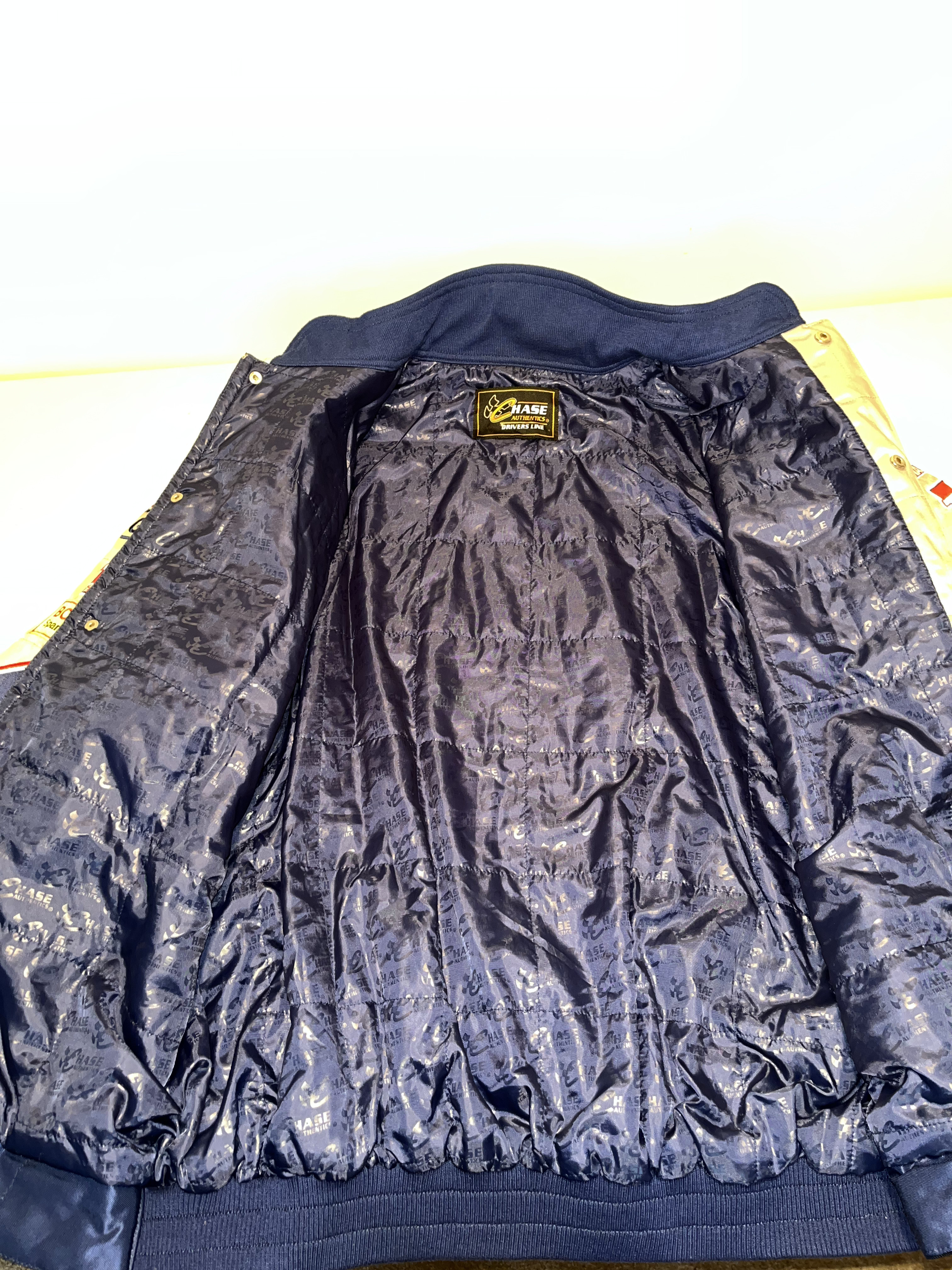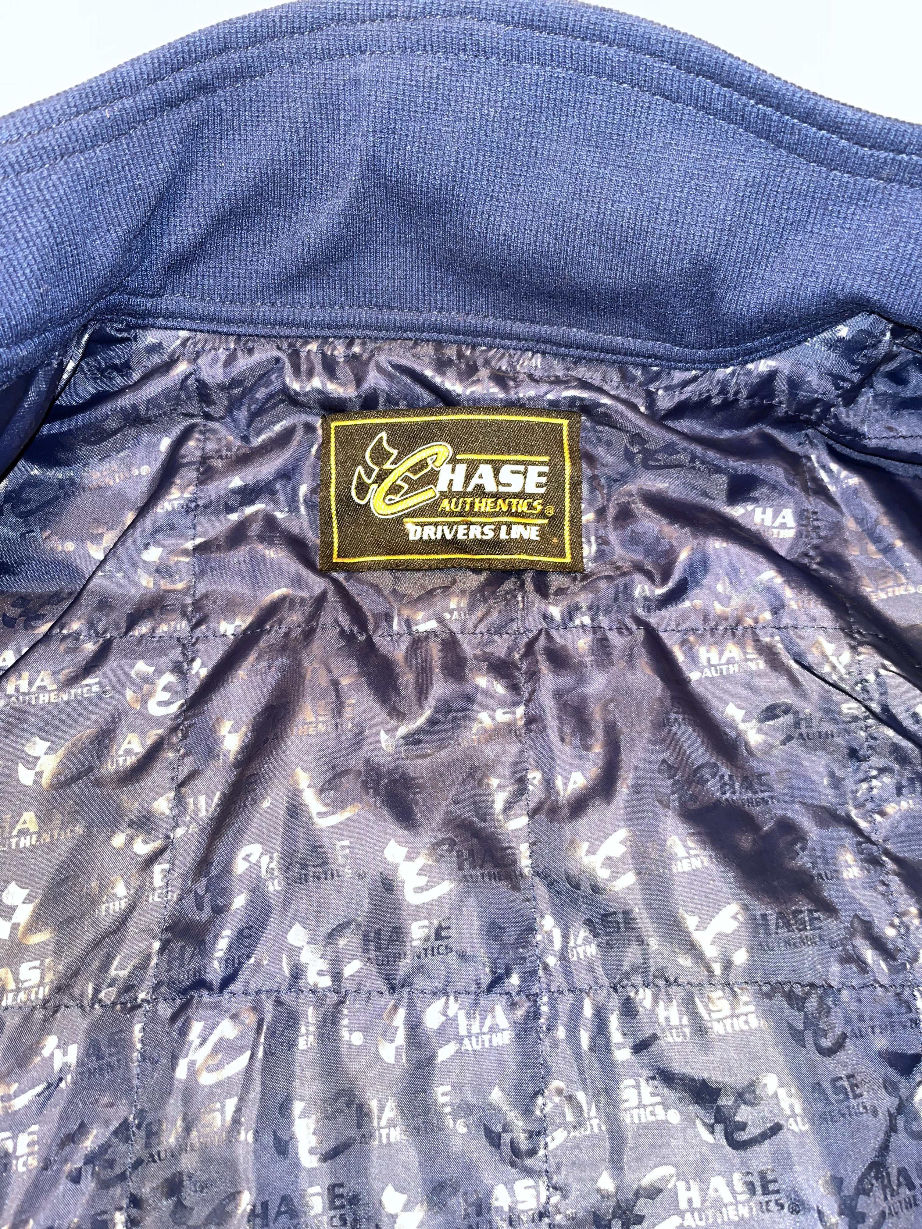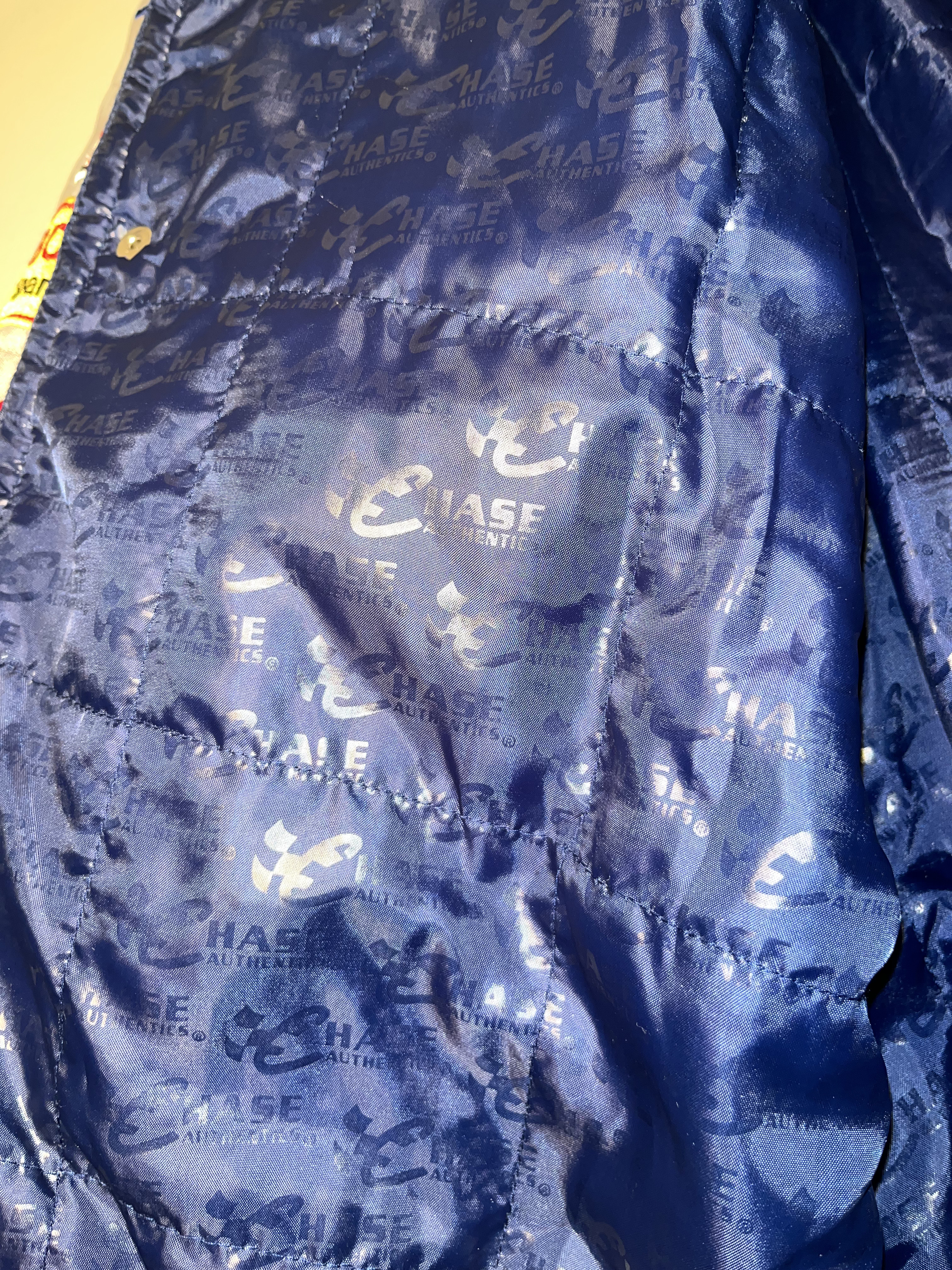 No size but appears to be XL. This is a professionally manufactured NASCAR replica driver’s jacket for seven-time Cup Series champion Jimmie Johnson. Produced by Chase Authentics under the “Drivers Line” label, this garment dates to the Nextel Cup Series era of the mid-2000s. The iconic yellow #48 is featured on the lower right sleeve, while the back includes the official team and driver URLs. The interior is finished with a navy blue quilted lining repeating the Chase Authentics logo. This item is an unsigned commercial replica intended for fan wear and collector display.