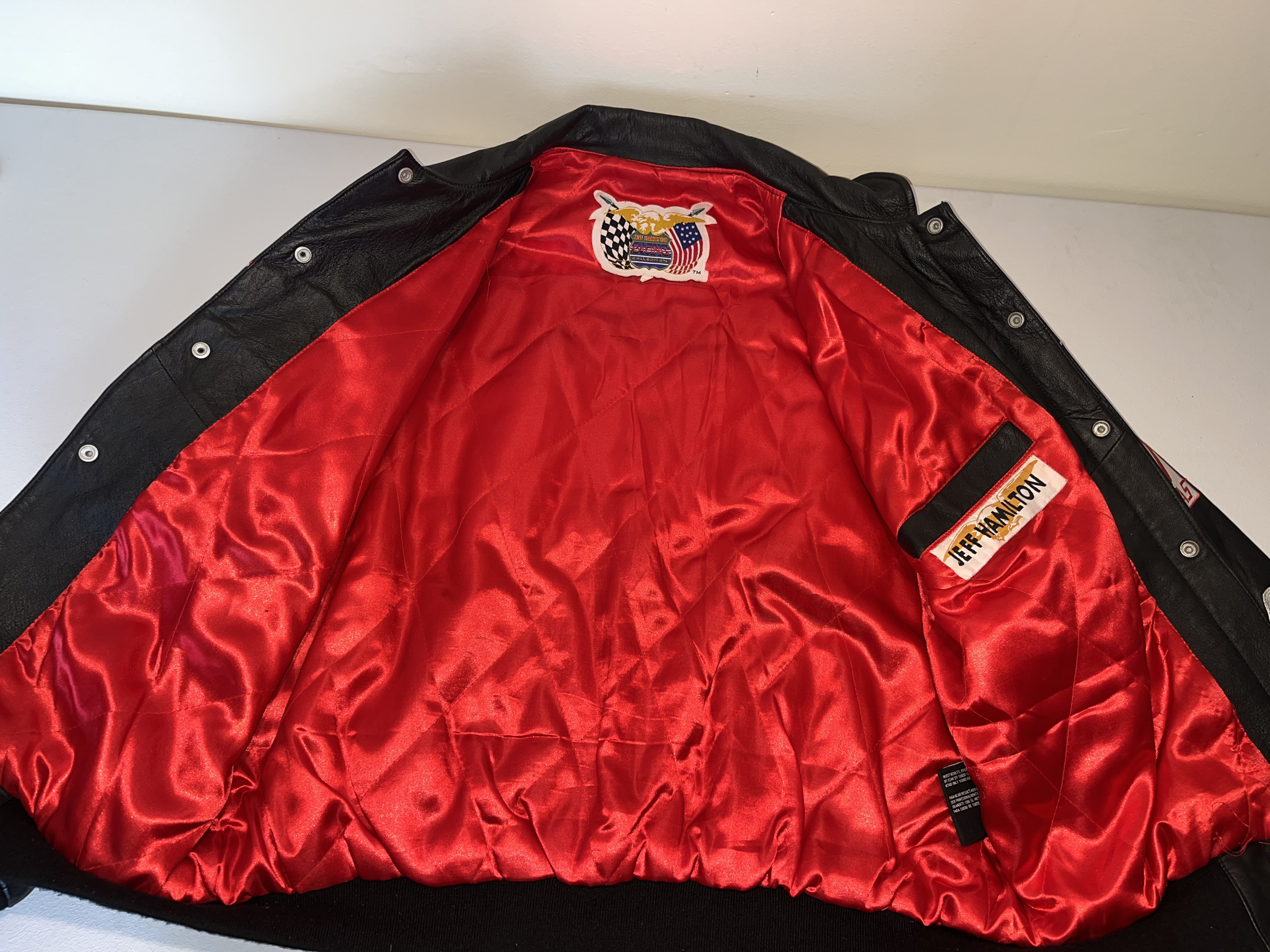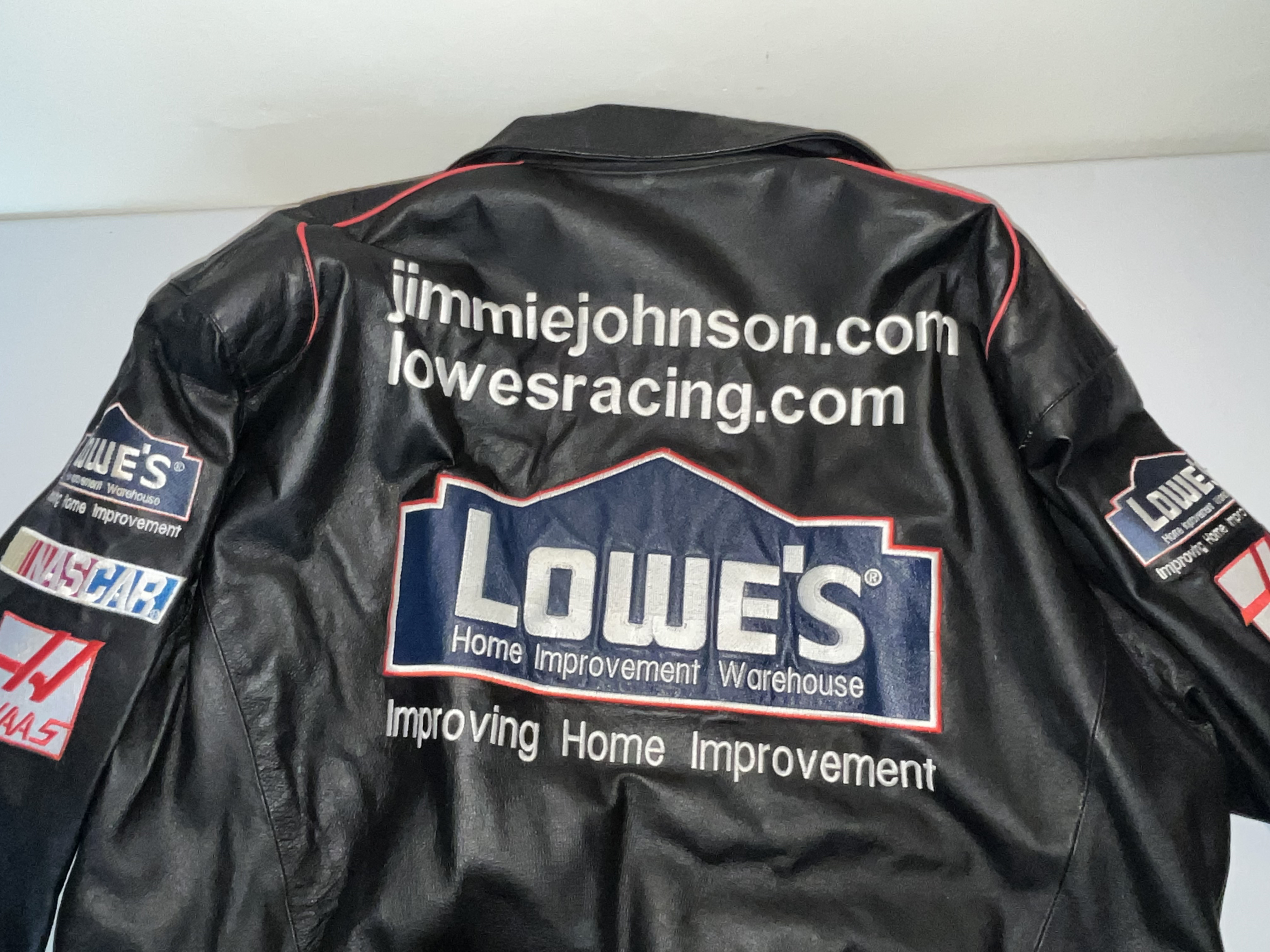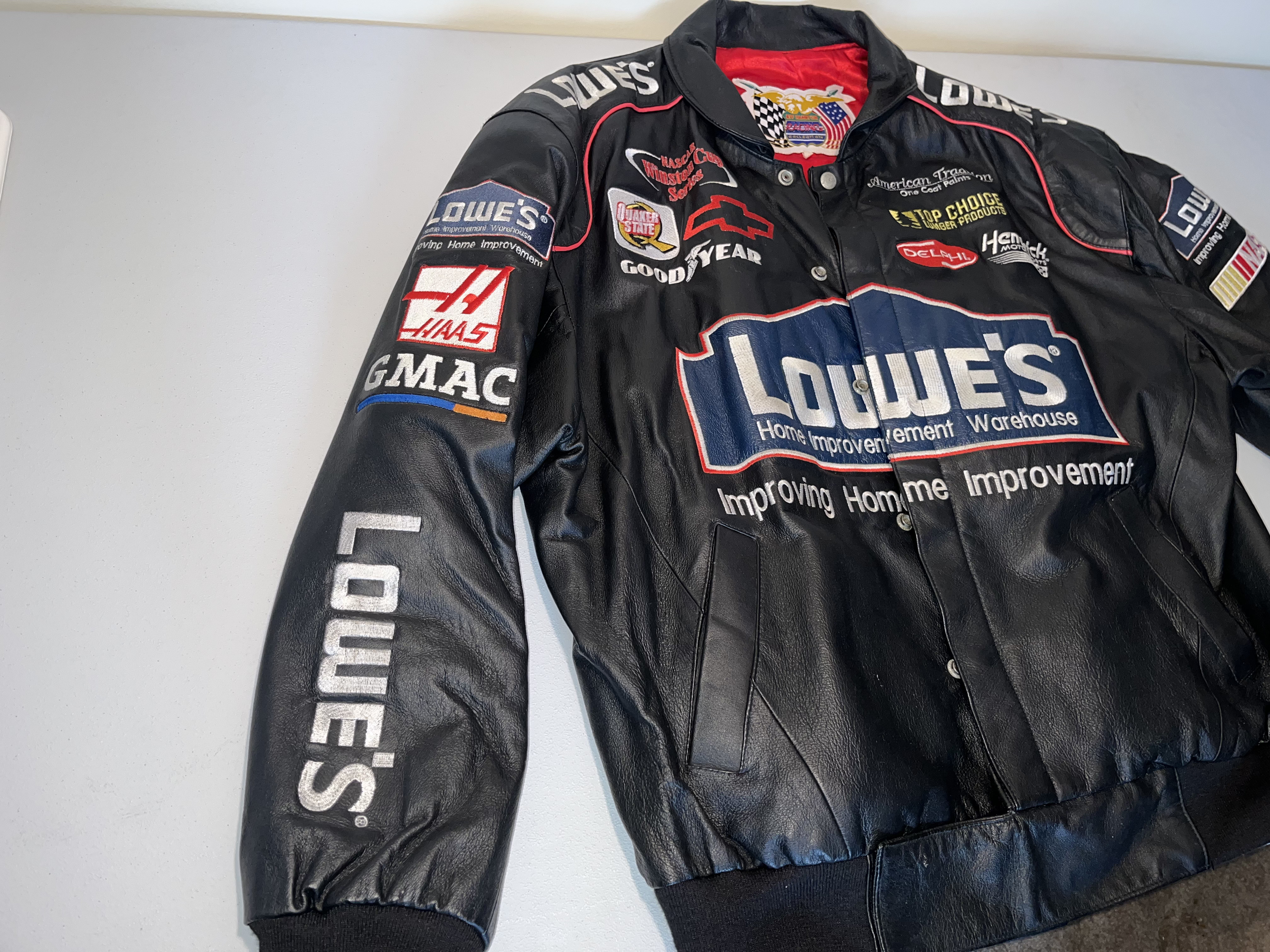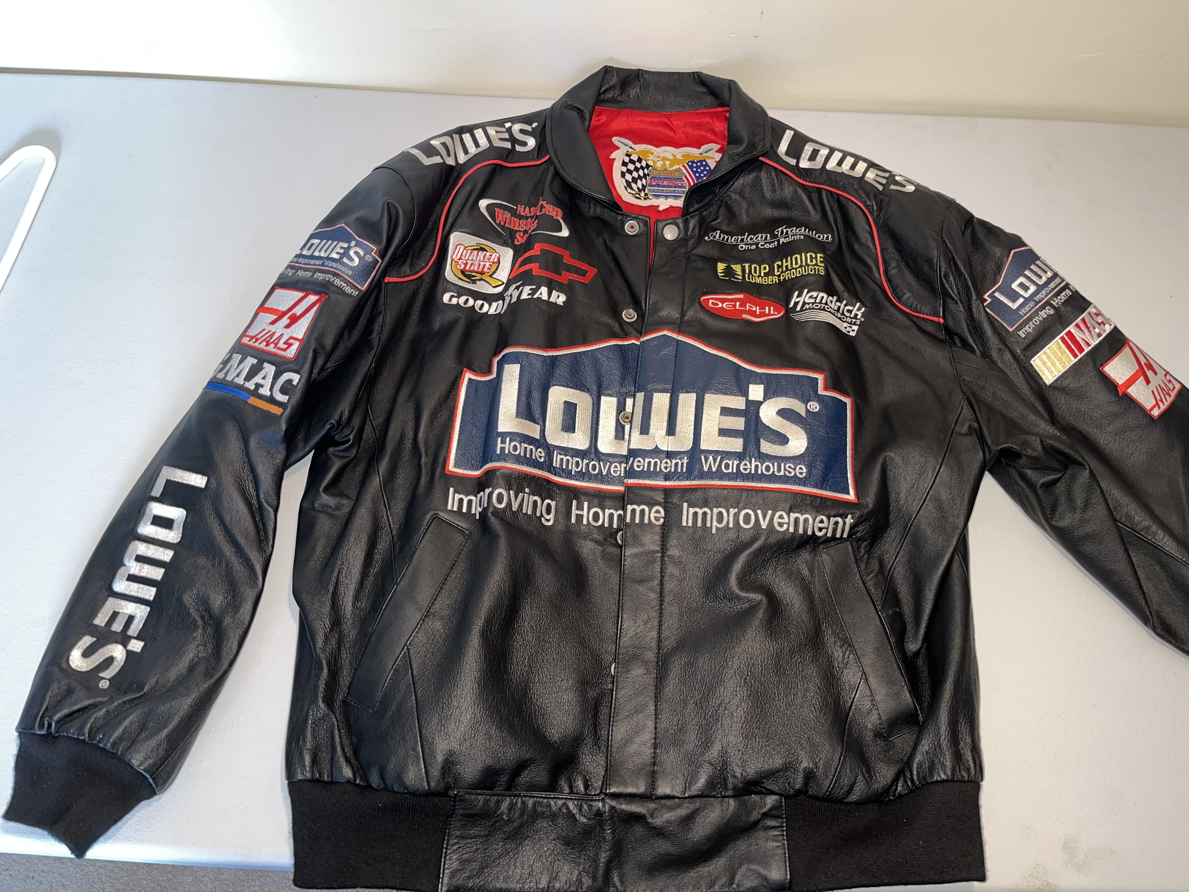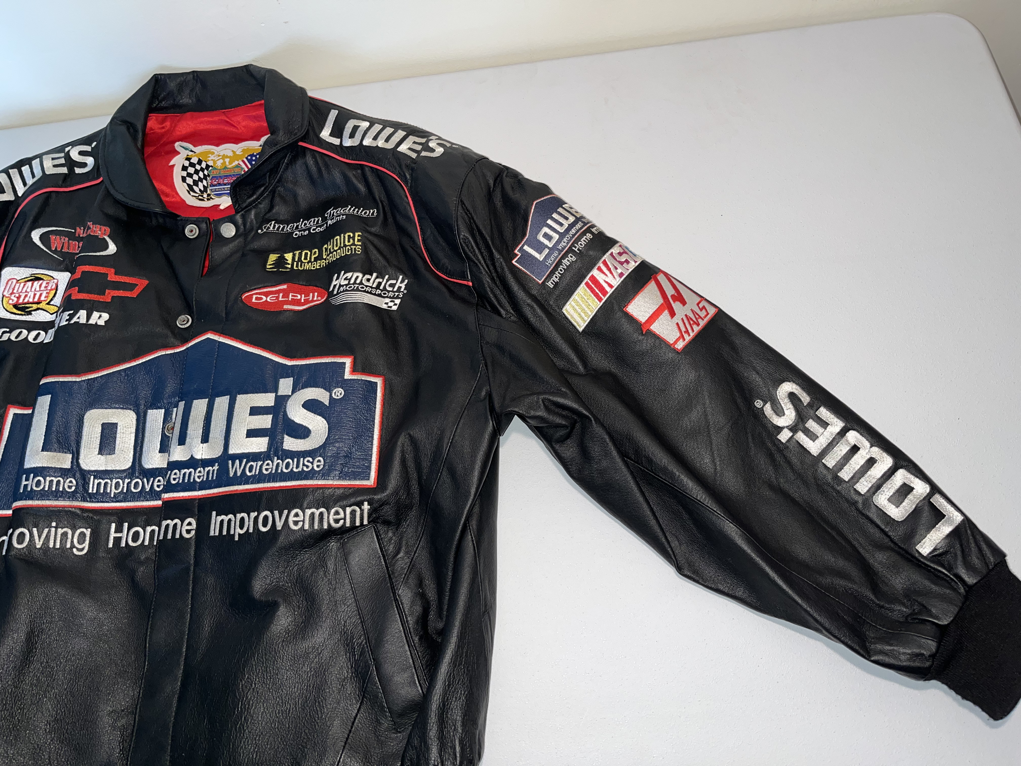 Appears to be XL. This is a premium heavyweight genuine leather racing jacket from the Jeff Hamilton Racing Collection, commemorating seven-time NASCAR Cup Series champion Jimmie Johnson during his tenure with Hendrick Motorsports. The garment dates to the early 2000s, specifically the 2002-2003 seasons, as evidenced by the “NASCAR Winston Cup Series” sponsorship logo. The jacket features a black leather shell with a vibrant red quilted satin lining. The exterior is adorned with high-quality, dense embroidery featuring the primary sponsor “Lowe’s Home Improvement Warehouse” across the chest and back. Additional sponsor patches include Chevrolet, Goodyear, Quaker State, Delphi, Hendrick Motorsports, American Tradition, and Top Choice Lumber Products. The sleeves are detailed with Lowe’s, Haas, and GMAC branding. Authenticity is verified by the “Jeff Hamilton Racing Collection” patch at the neckline and a secondary “Jeff Hamilton” embroidered label on the interior pocket. This item is a high-end fan apparel collectible and not a driver-worn fire suit.