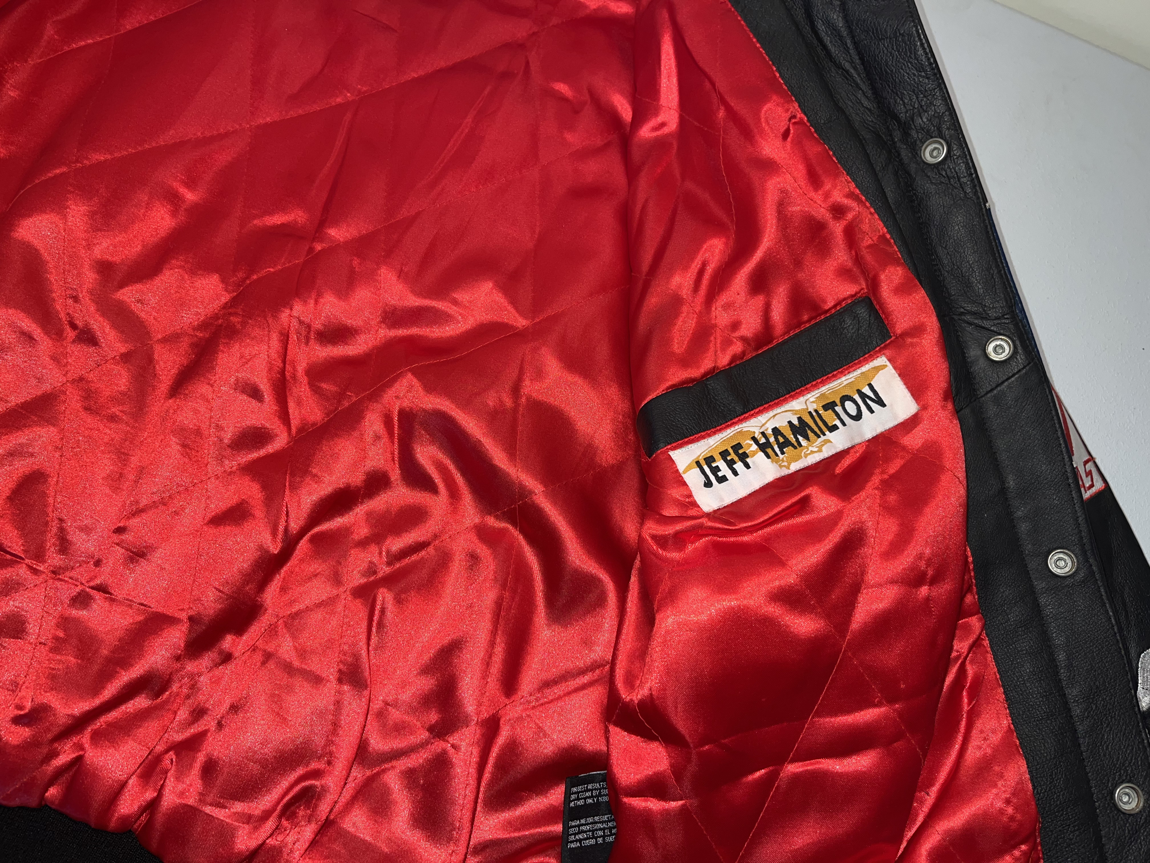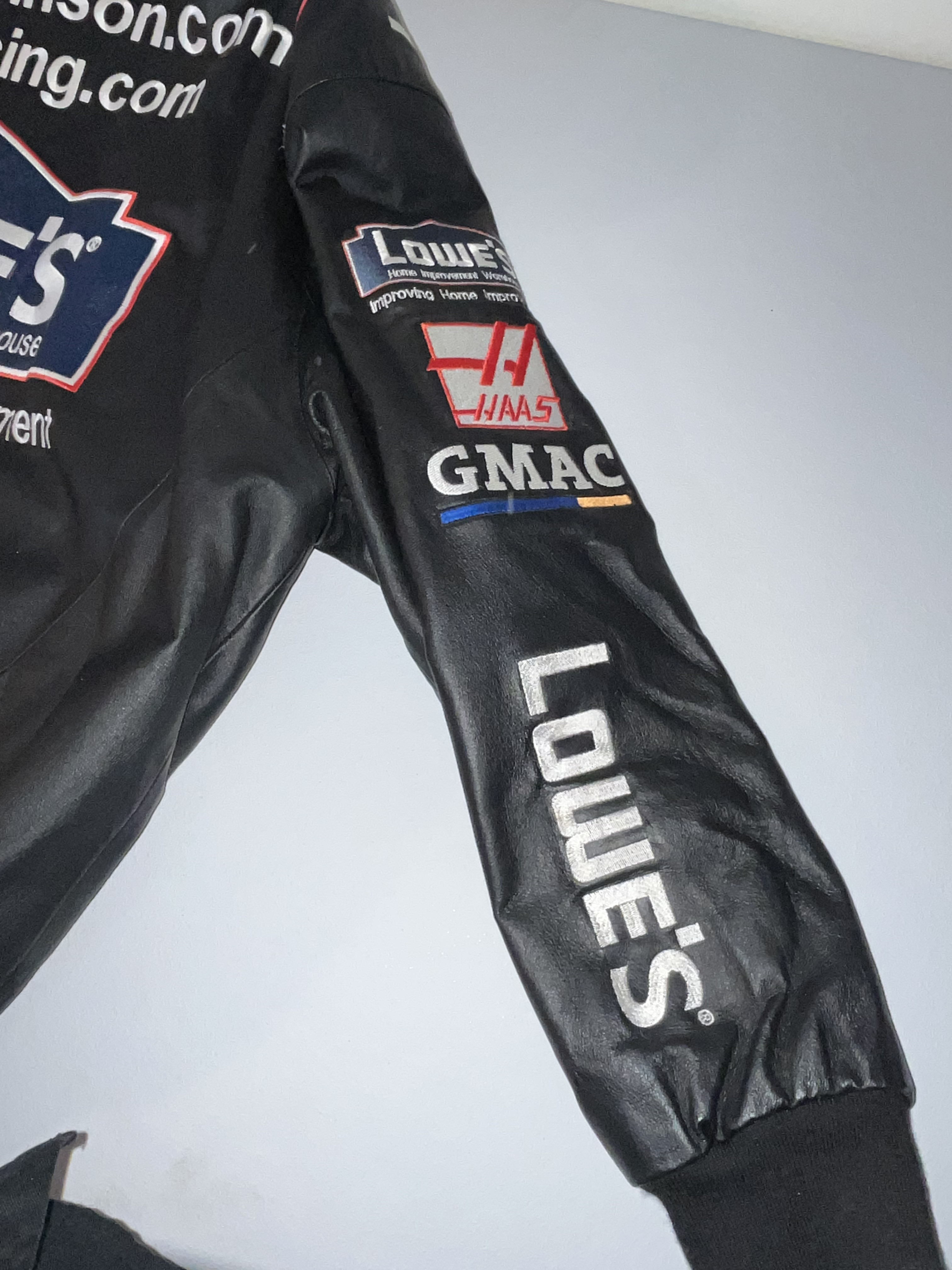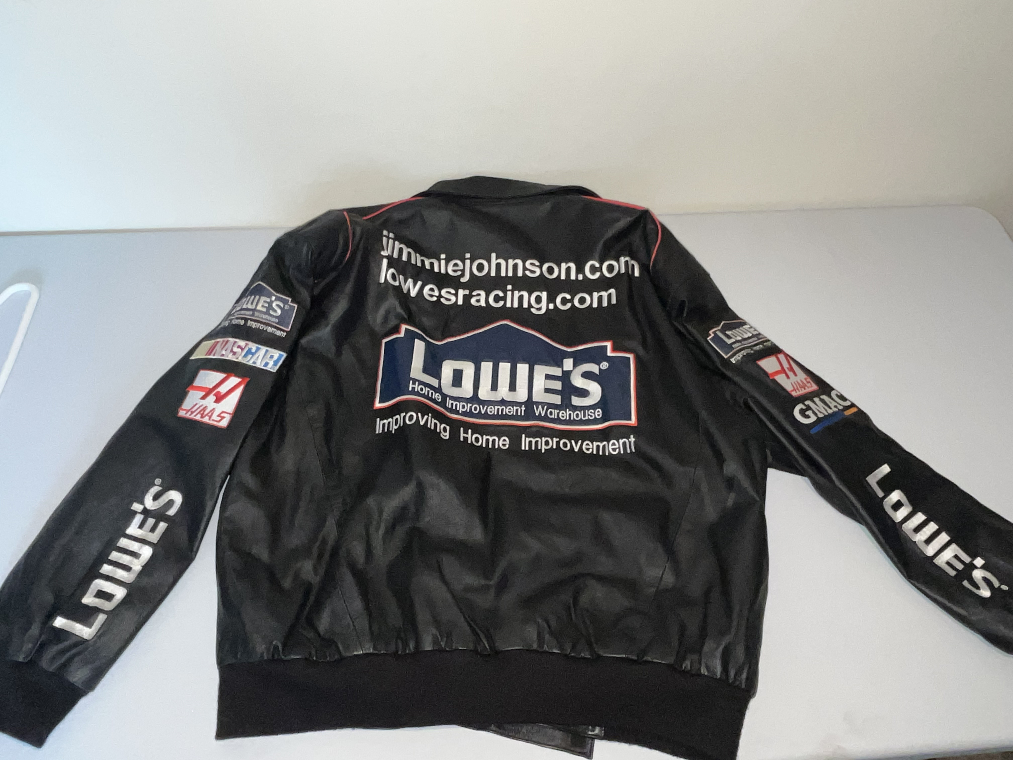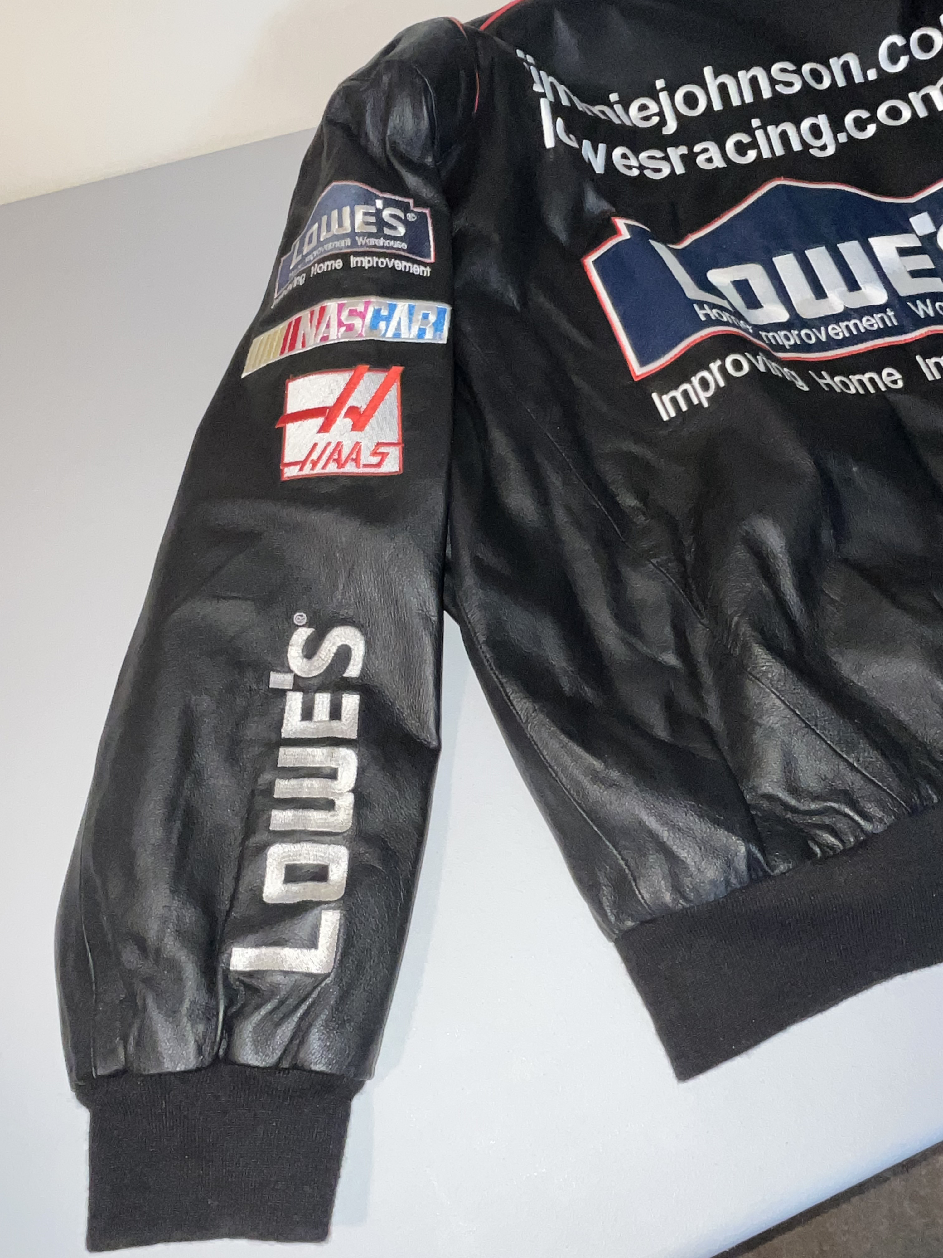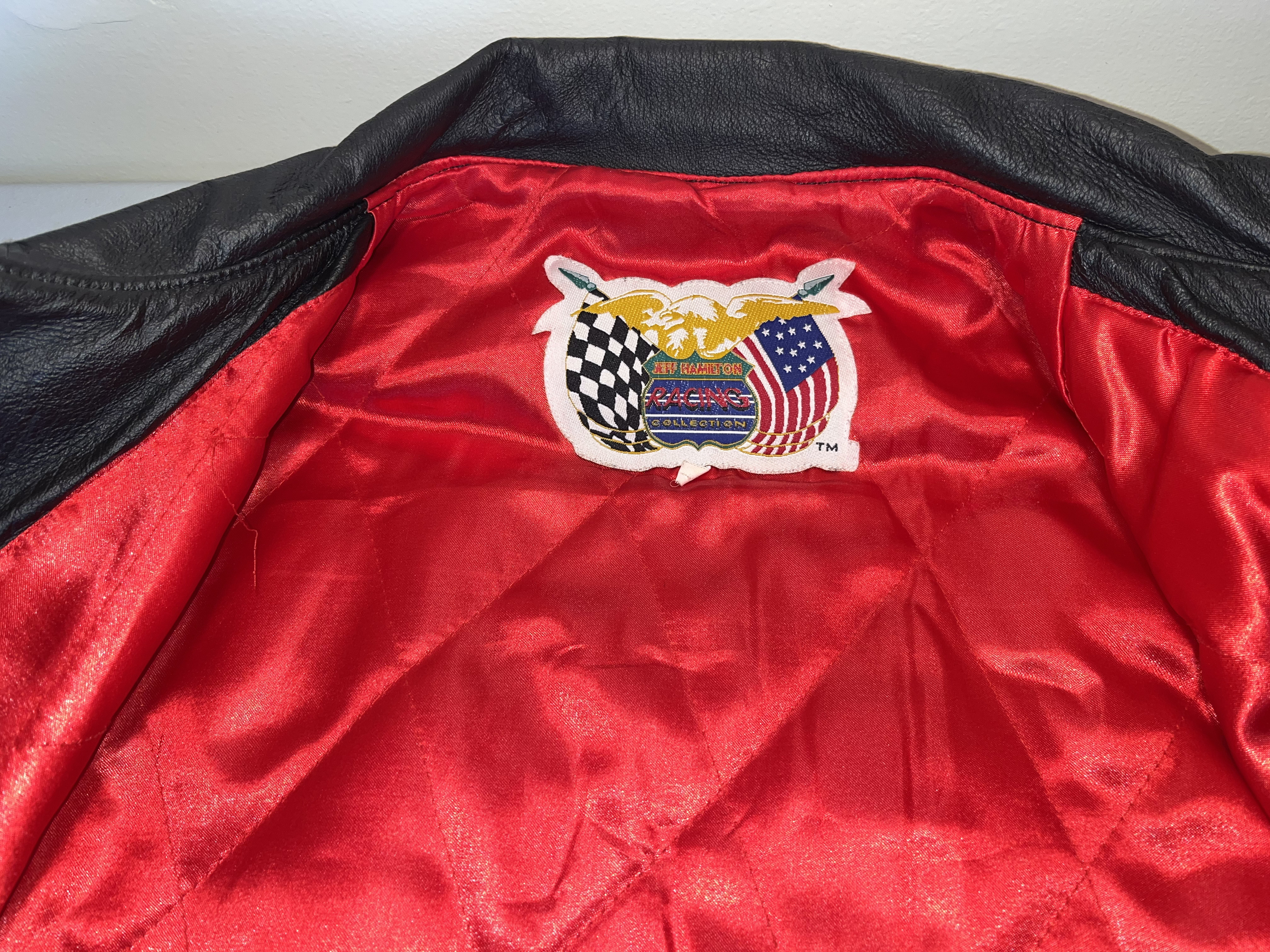 Appears to be XL. This is a premium heavyweight genuine leather racing jacket from the Jeff Hamilton Racing Collection, commemorating seven-time NASCAR Cup Series champion Jimmie Johnson during his tenure with Hendrick Motorsports. The garment dates to the early 2000s, specifically the 2002-2003 seasons, as evidenced by the “NASCAR Winston Cup Series” sponsorship logo. The jacket features a black leather shell with a vibrant red quilted satin lining. The exterior is adorned with high-quality, dense embroidery featuring the primary sponsor “Lowe’s Home Improvement Warehouse” across the chest and back. Additional sponsor patches include Chevrolet, Goodyear, Quaker State, Delphi, Hendrick Motorsports, American Tradition, and Top Choice Lumber Products. The sleeves are detailed with Lowe’s, Haas, and GMAC branding. Authenticity is verified by the “Jeff Hamilton Racing Collection” patch at the neckline and a secondary “Jeff Hamilton” embroidered label on the interior pocket. This item is a high-end fan apparel collectible and not a driver-worn fire suit.