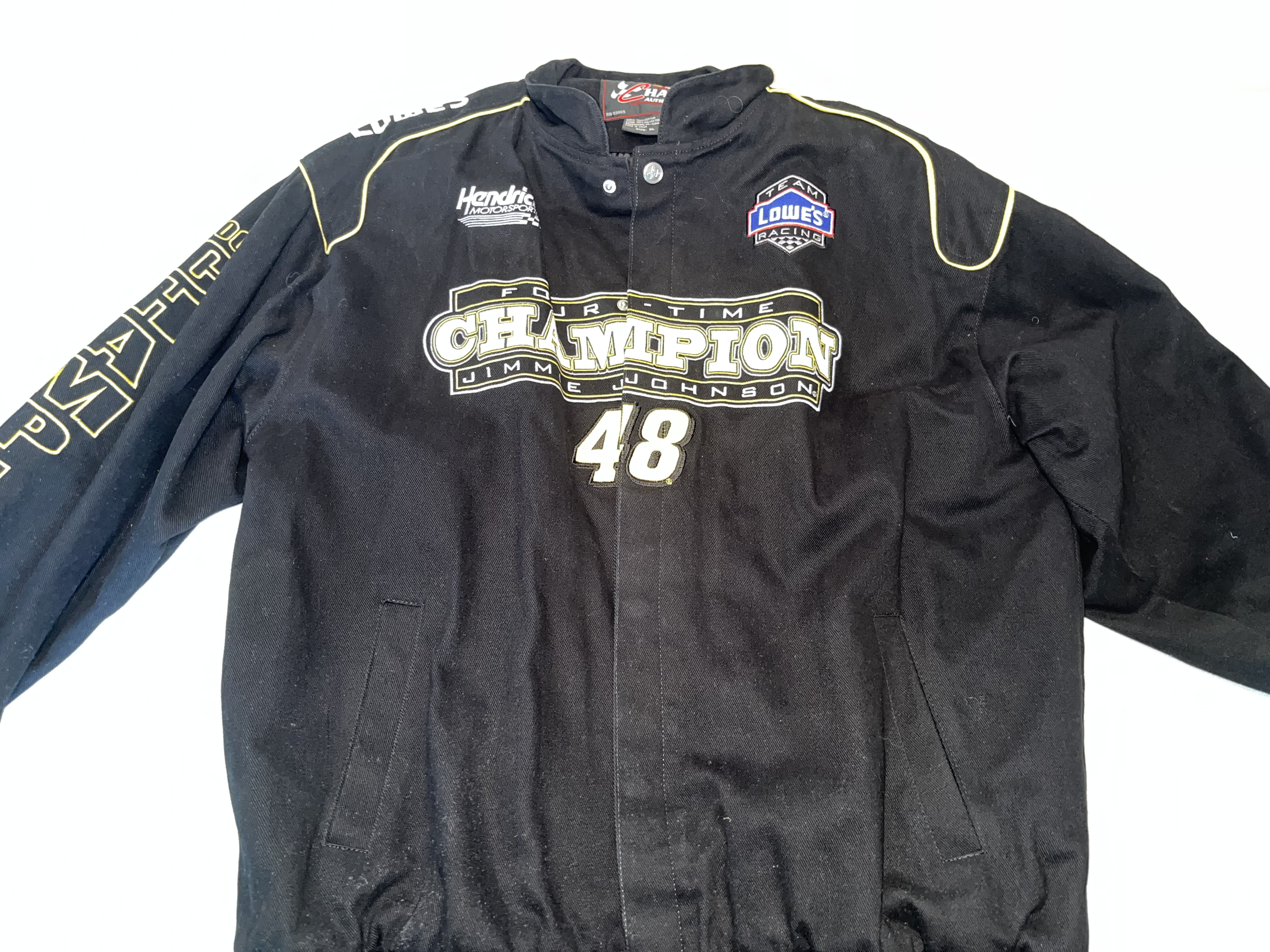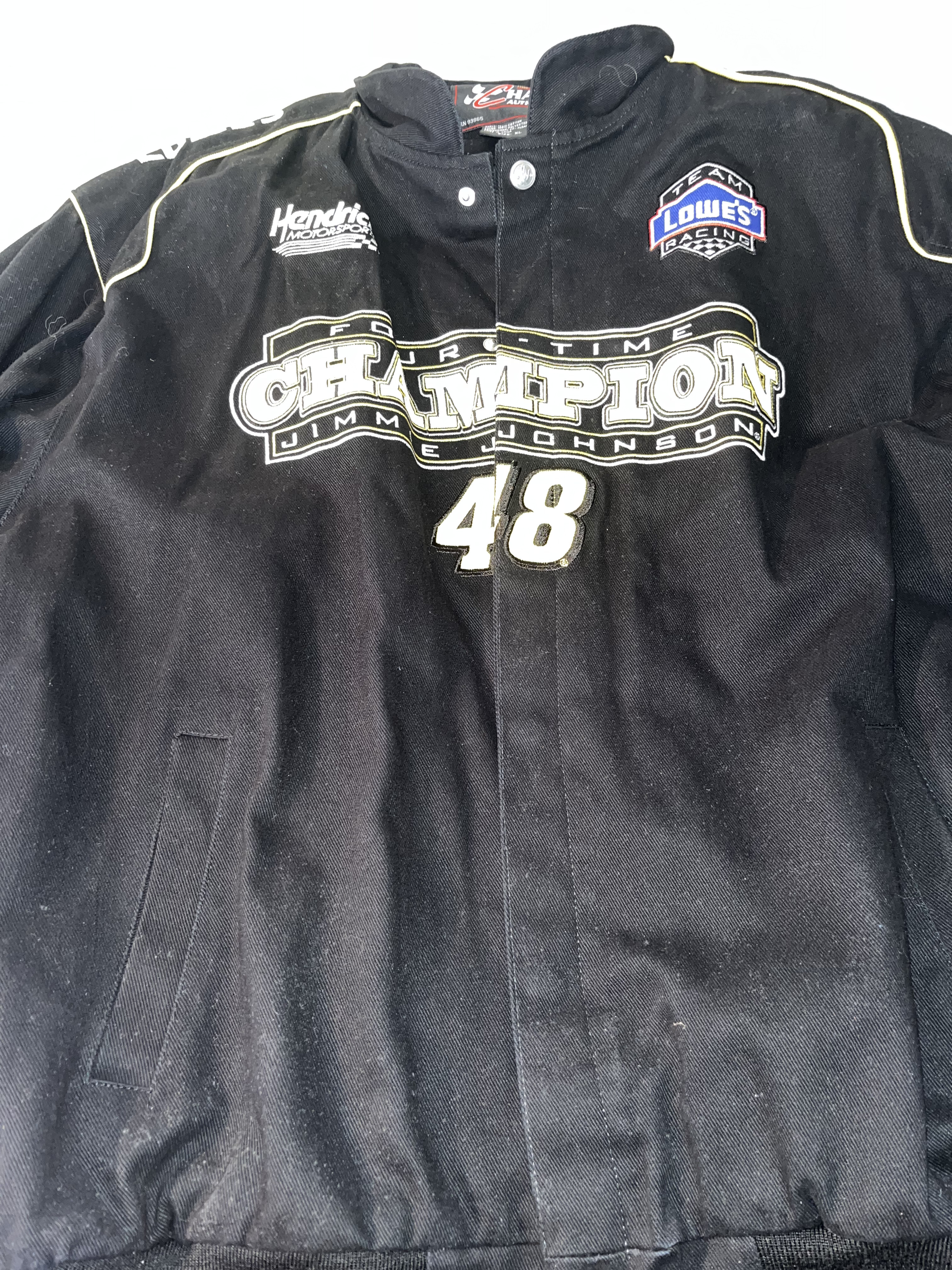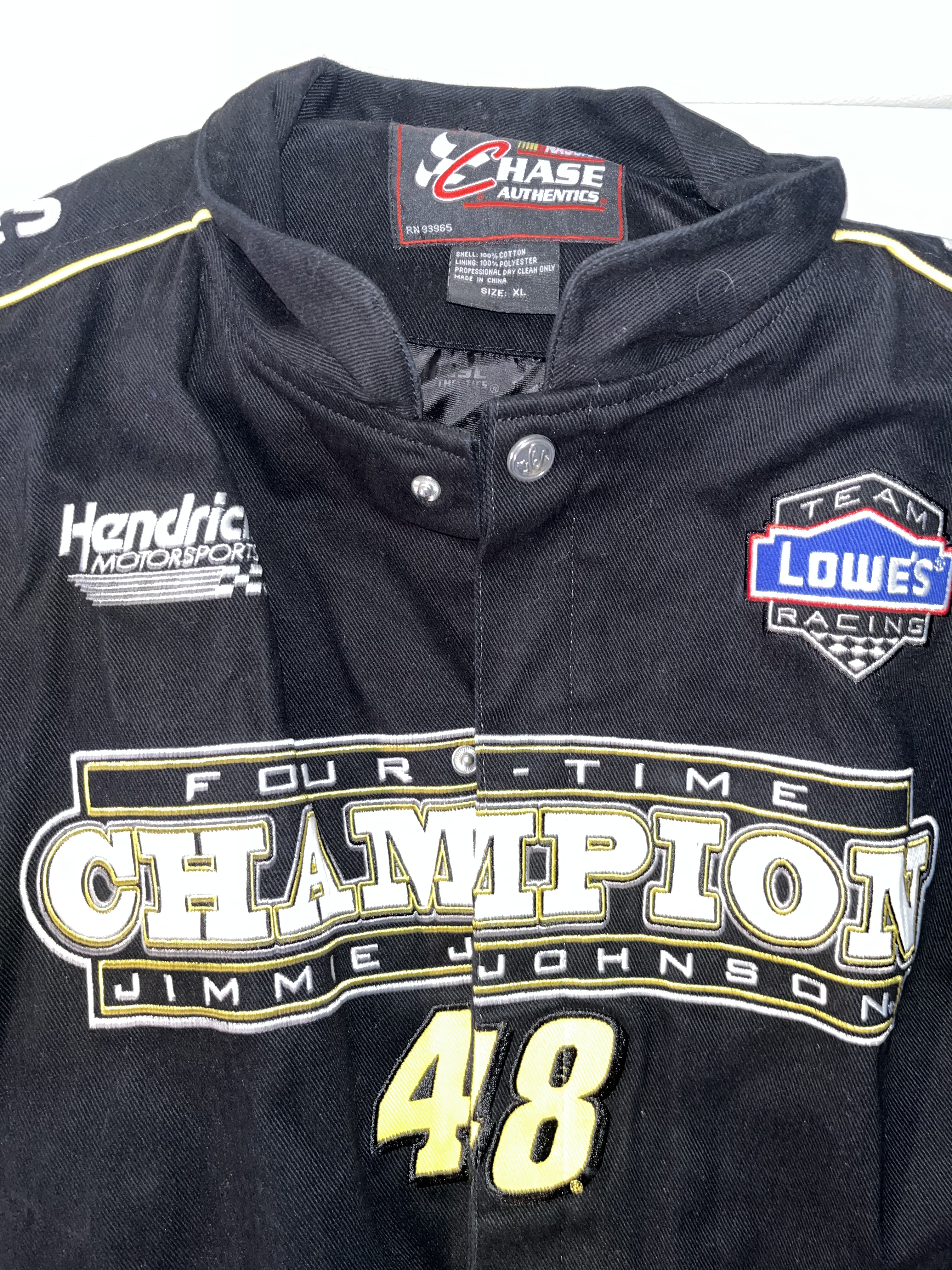 This is a professional-grade NASCAR commemorative twill jacket produced by Chase Authentics in collaboration with Hendrick Motorsports. The garment is constructed with a 100 percent cotton shell and a 100 percent polyester lining. It celebrates Jimmie Johnson’s historic fourth consecutive NASCAR Sprint Cup Series championship. The front of the jacket features high-density embroidery including the Hendrick Motorsports logo on the right chest, the Team Lowe’s Racing logo on the left chest, and a large central graphic reading FOUR-TIME CHAMPION JIMMIE JOHNSON with his signature 48 car number. Both sleeves are adorned with vertical yellow-outlined embroidery reading 2009 CHAMPION. The interior features a sublimated Chase Authentics logo lining and original manufacturer tags (RN 93965). This item was manufactured circa late 2009 or 2010 to commemorate the 2009 season victory. Size: Men’s XL.