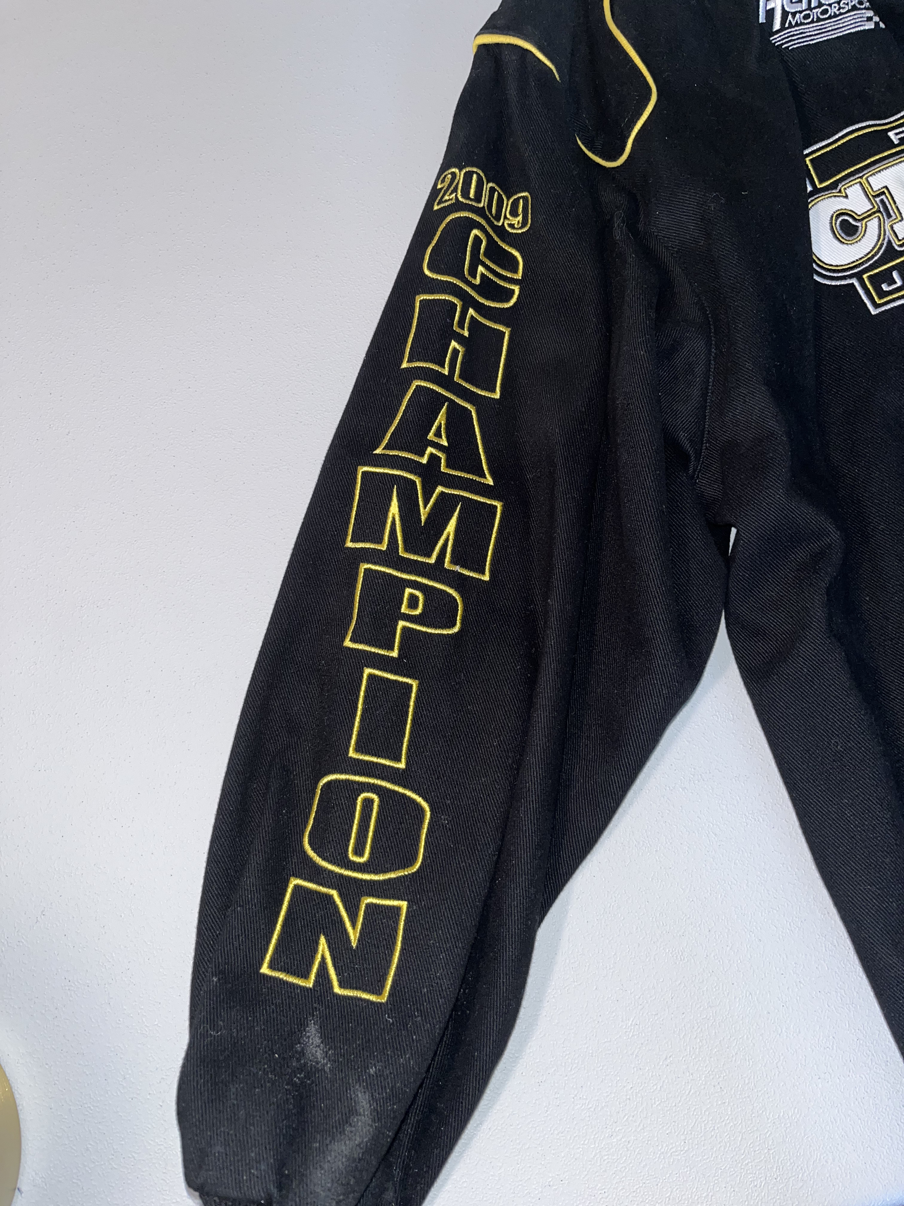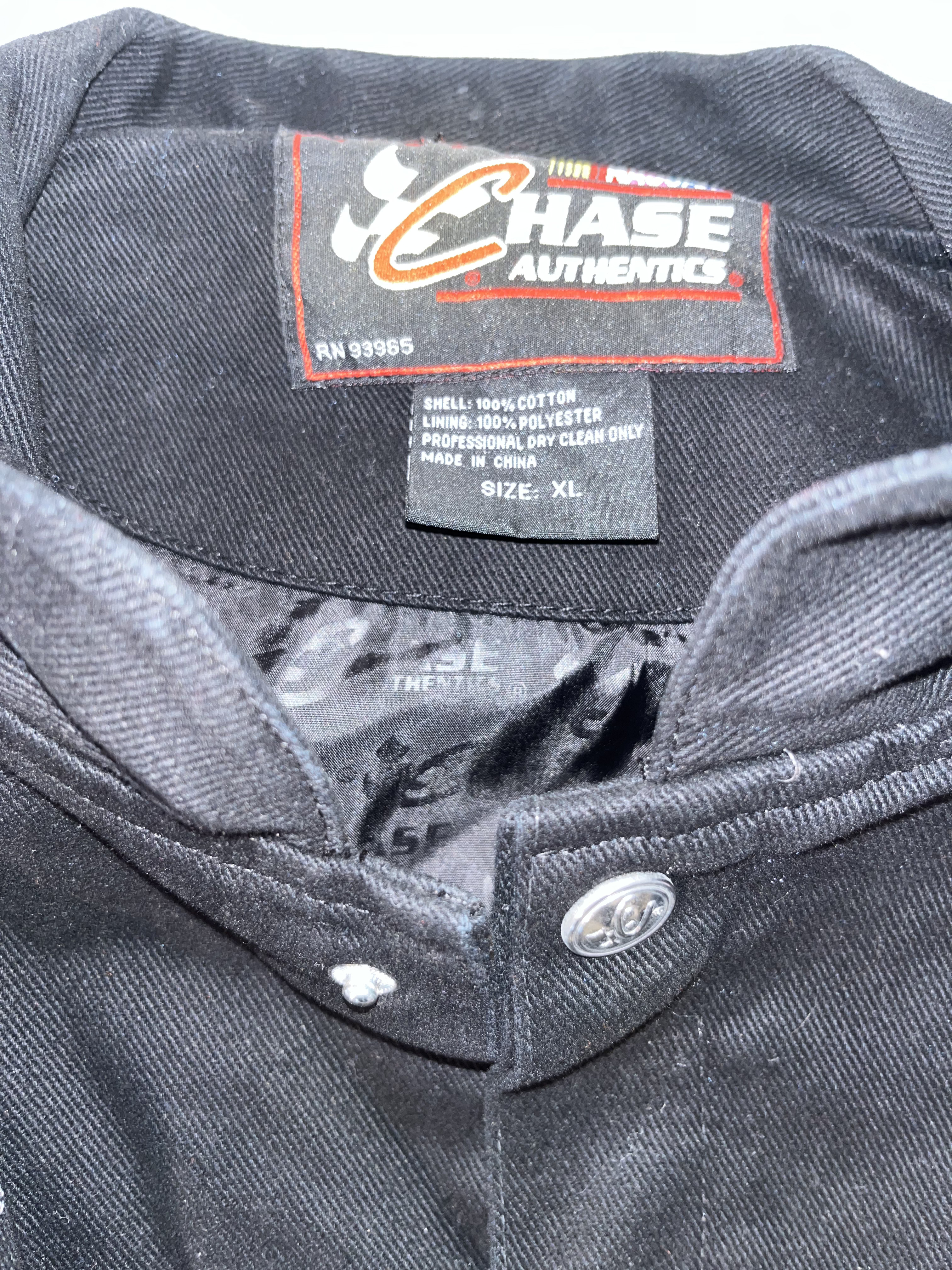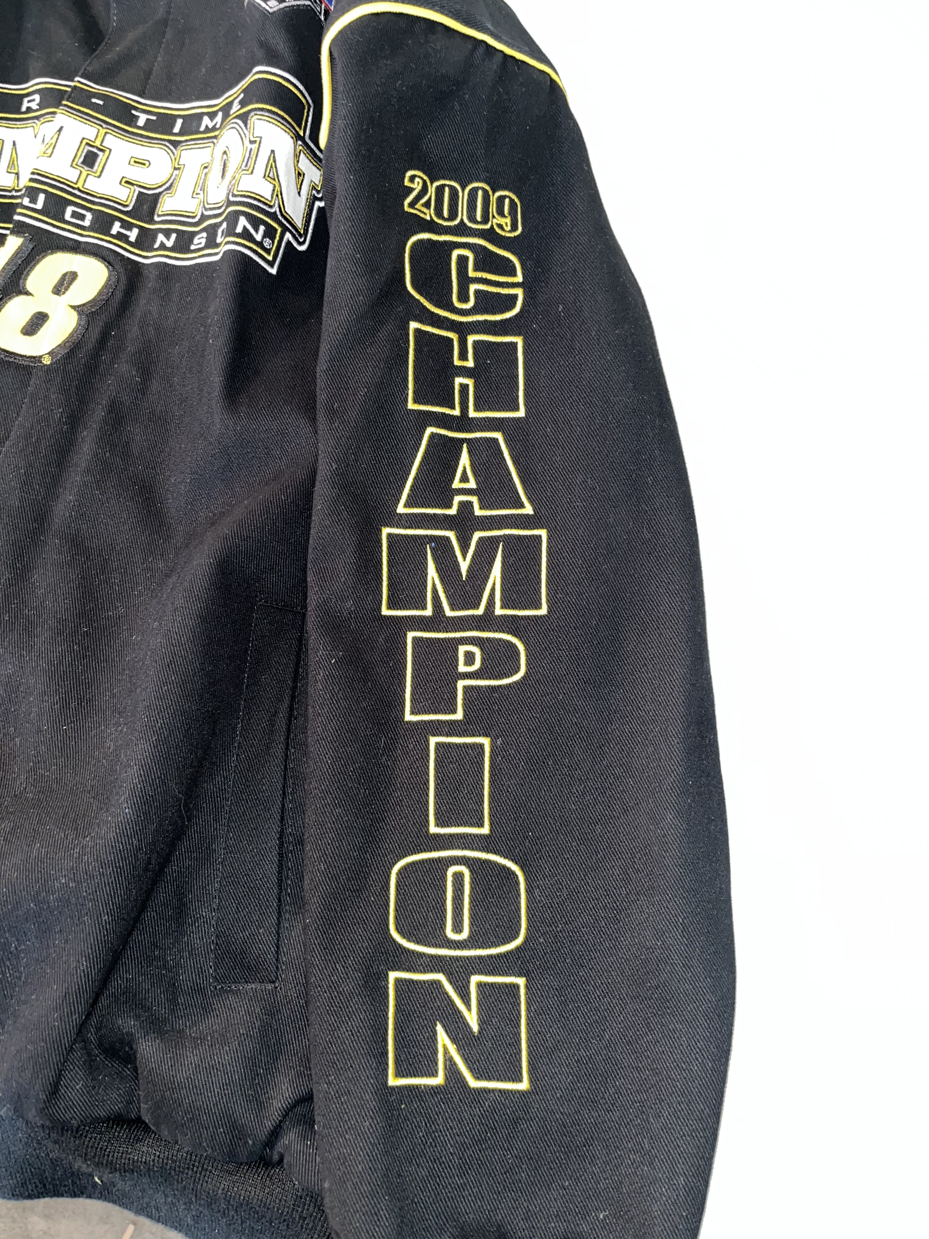 This is a professional-grade NASCAR commemorative twill jacket produced by Chase Authentics in collaboration with Hendrick Motorsports. The garment is constructed with a 100 percent cotton shell and a 100 percent polyester lining. It celebrates Jimmie Johnson’s historic fourth consecutive NASCAR Sprint Cup Series championship. The front of the jacket features high-density embroidery including the Hendrick Motorsports logo on the right chest, the Team Lowe’s Racing logo on the left chest, and a large central graphic reading FOUR-TIME CHAMPION JIMMIE JOHNSON with his signature 48 car number. Both sleeves are adorned with vertical yellow-outlined embroidery reading 2009 CHAMPION. The interior features a sublimated Chase Authentics logo lining and original manufacturer tags (RN 93965). This item was manufactured circa late 2009 or 2010 to commemorate the 2009 season victory. Size: Men’s XL.