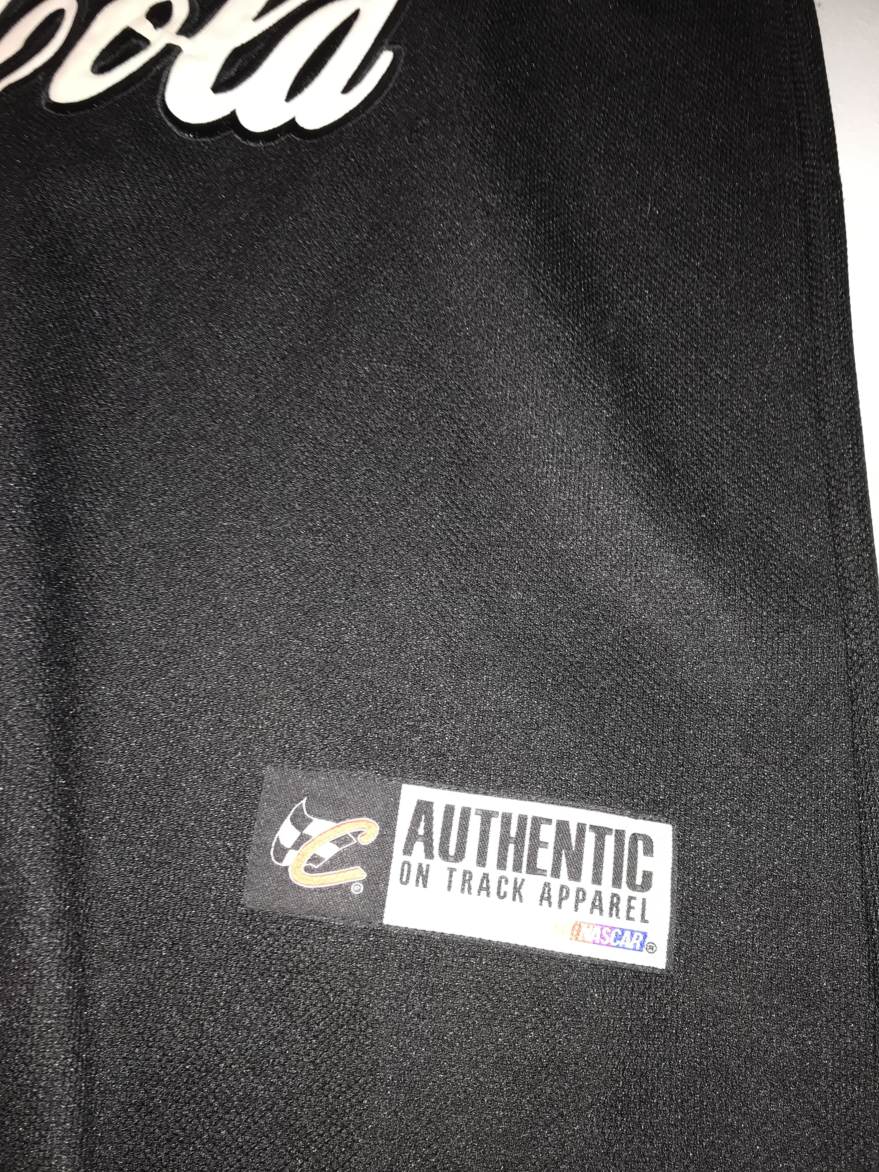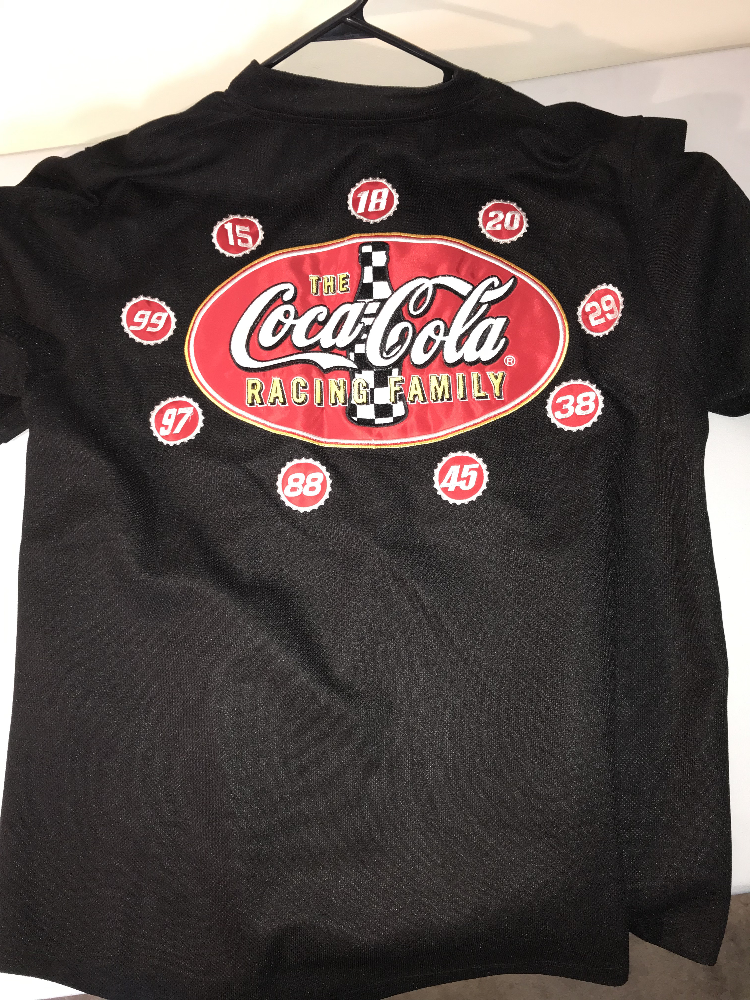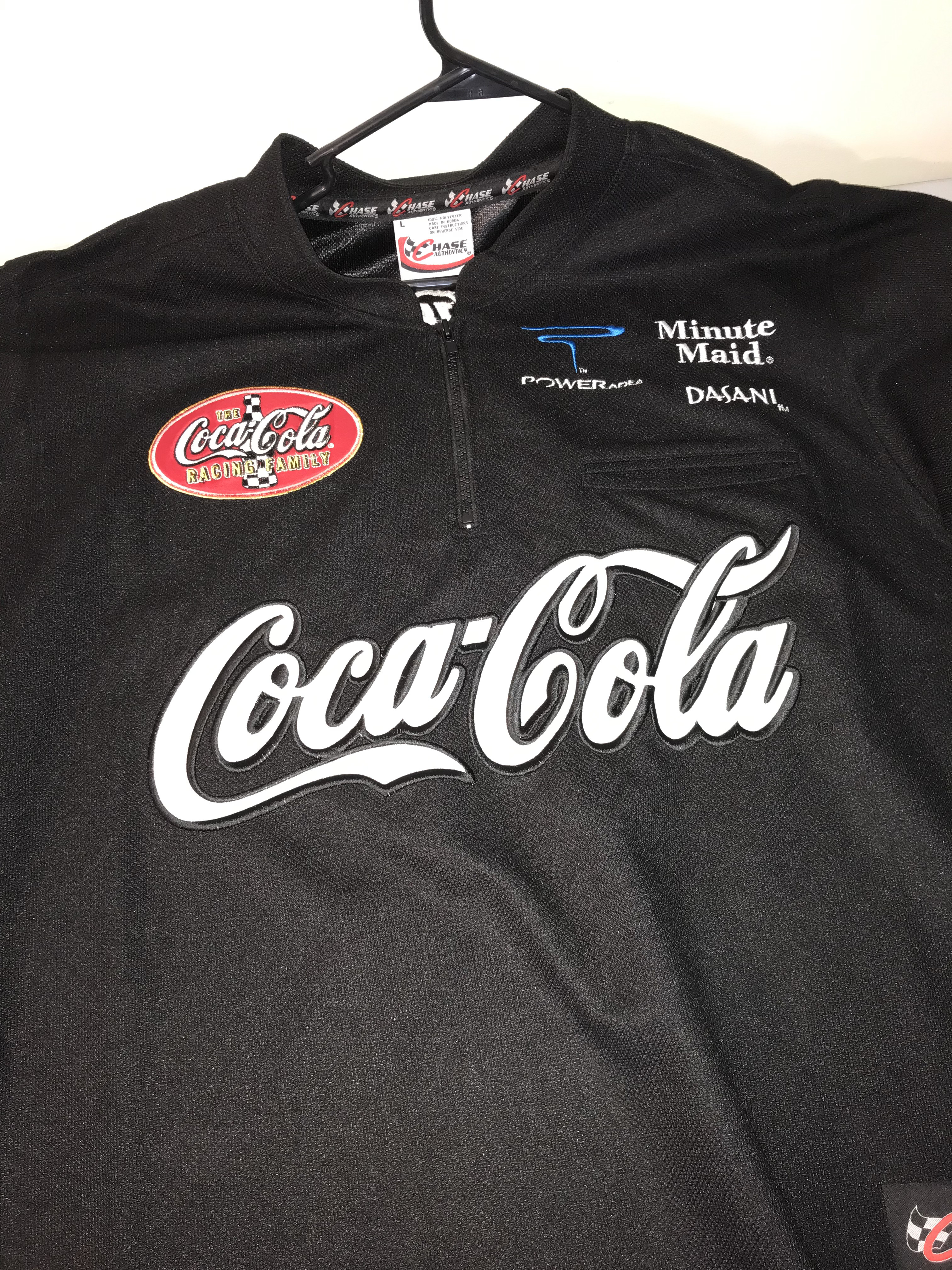 Chase Authentics NASCAR quarter-zip short-sleeve pit shirt from the early 2000s Coca-Cola Racing Family collection. Constructed from black 100% polyester, the garment features embroidered Coca-Cola, Minute Maid, Powerade, and Dasani branding alongside official NASCAR patches. The reverse displays a large central logo surrounded by nine bottle cap graphics representing driver car numbers 15, 18, 20, 29, 38, 45, 88, 97, and 99. Interior neck and lower front jock tags are present with Chase Authentics and NASCAR branding.