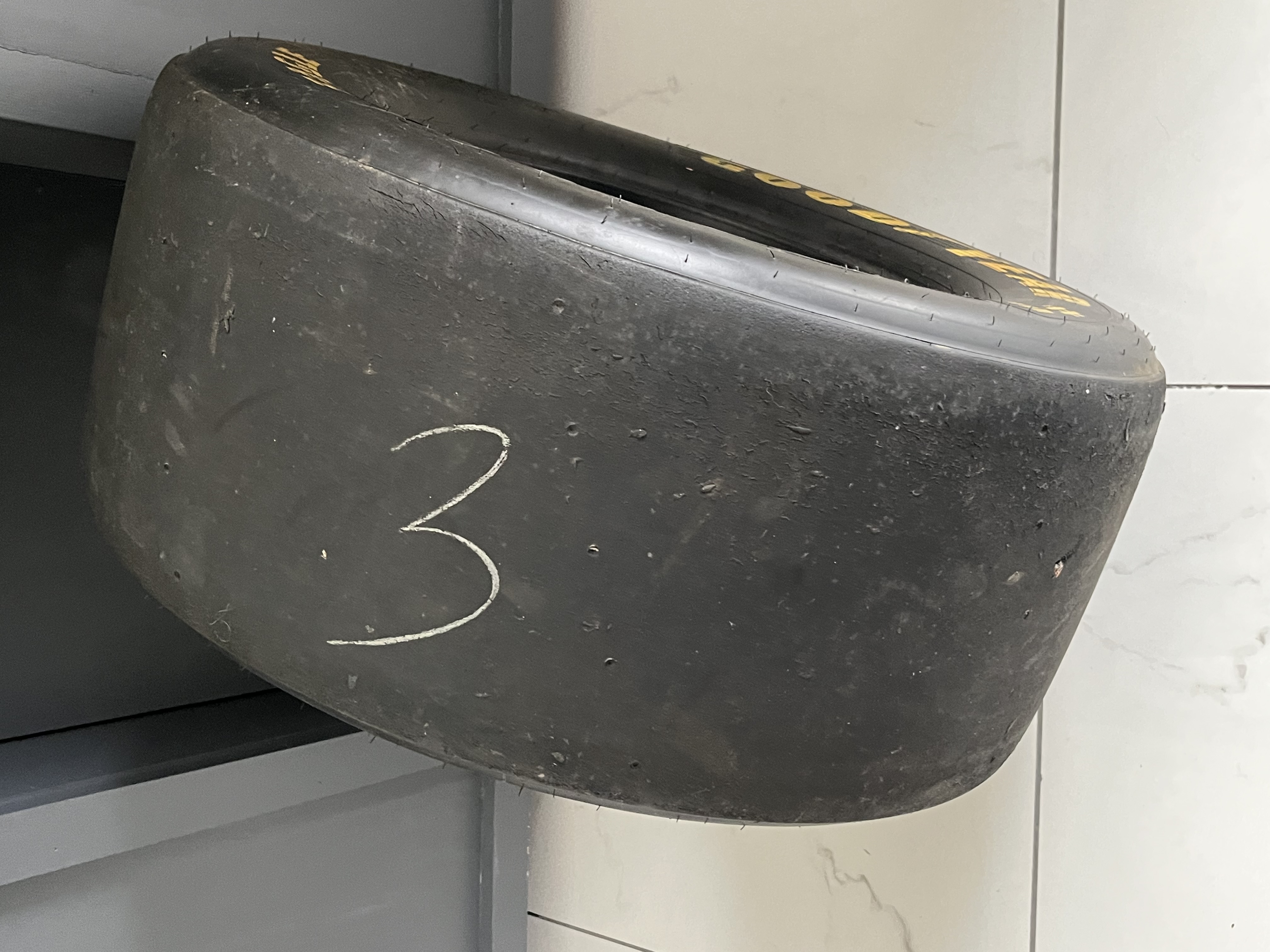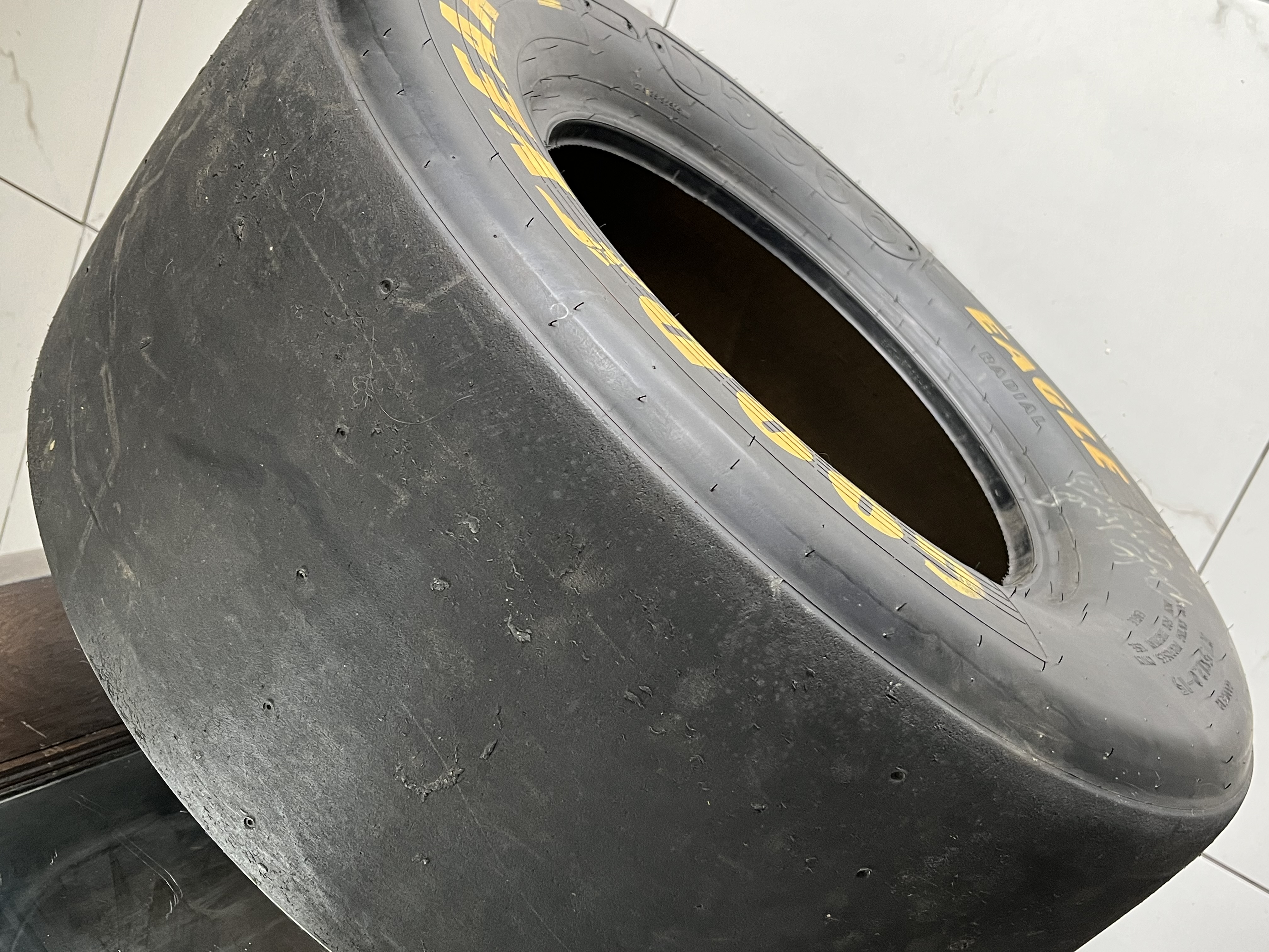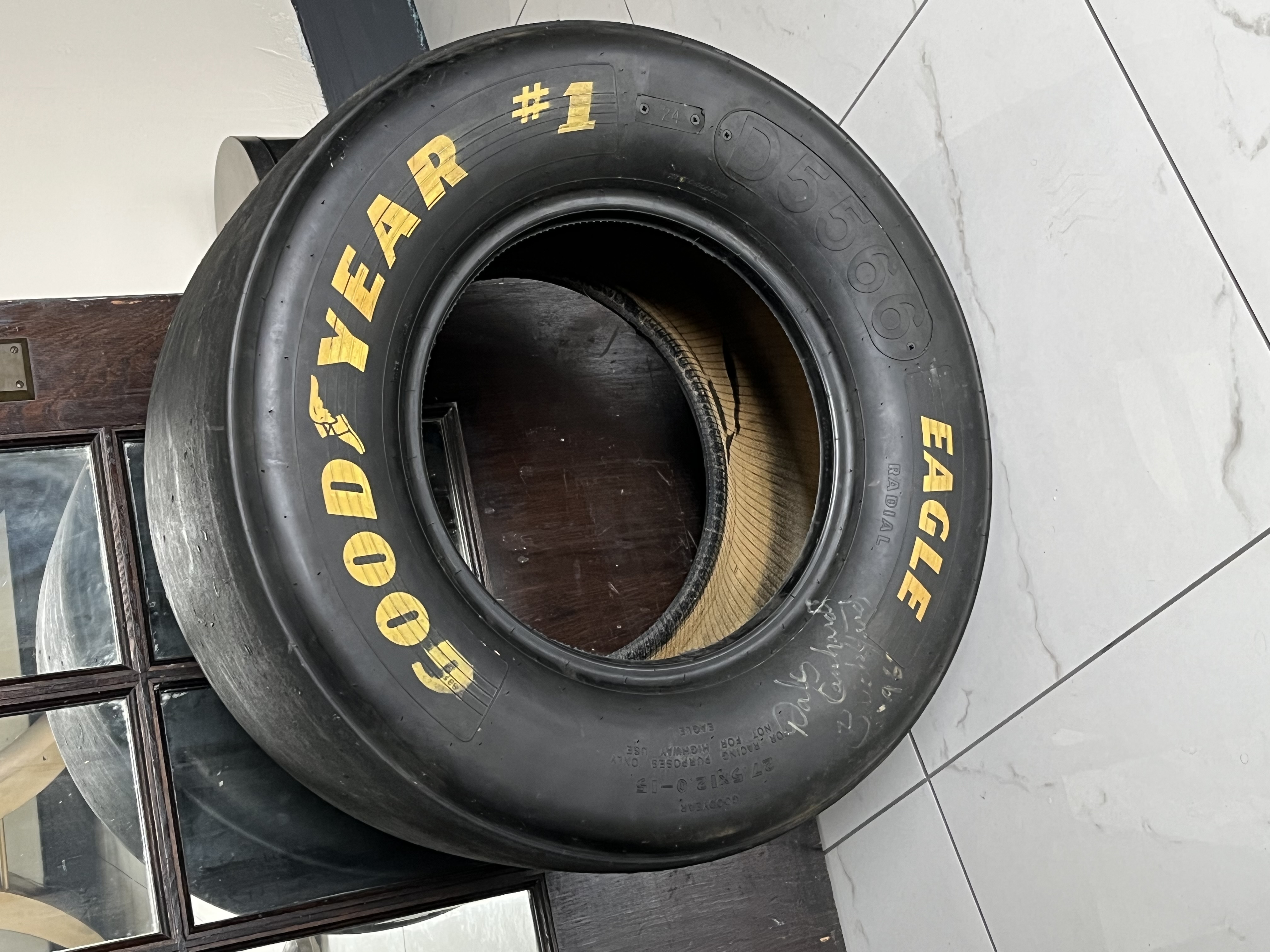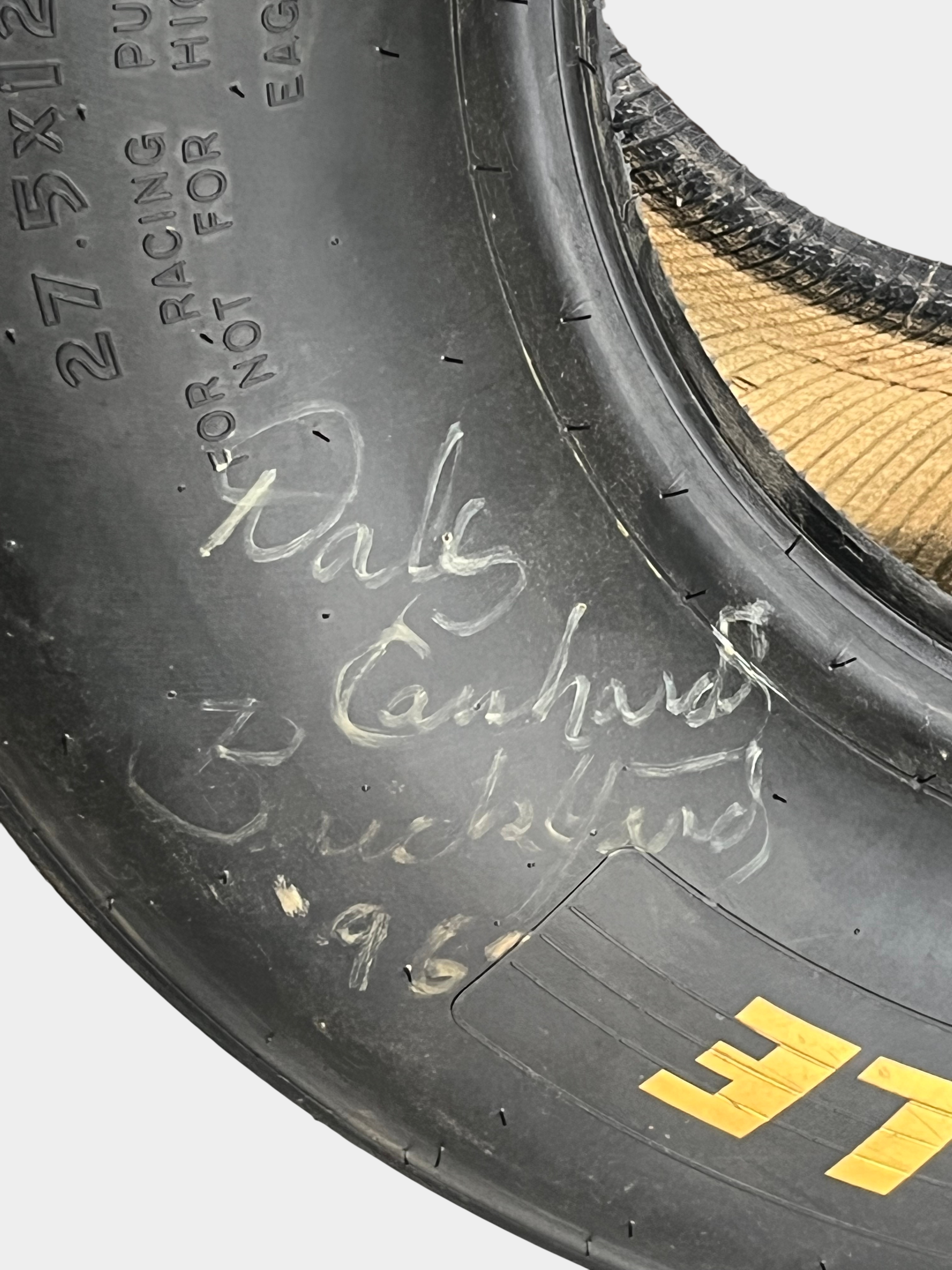 Goodyear Eagle #1 radial slick racing tire, size 27.5×12.0-15, featuring yellow sidewall lettering and embossed technical specifications D5566 and serial code 276785-95S05VW. The sidewall bears an unverified white paint pen signature reading Dale Earnhardt with the inscription B Pocono 96, while the tread surface displays a hand-painted numeral 3. This race-used component includes rubber pickup and surface scuffing consistent with professional track use.
