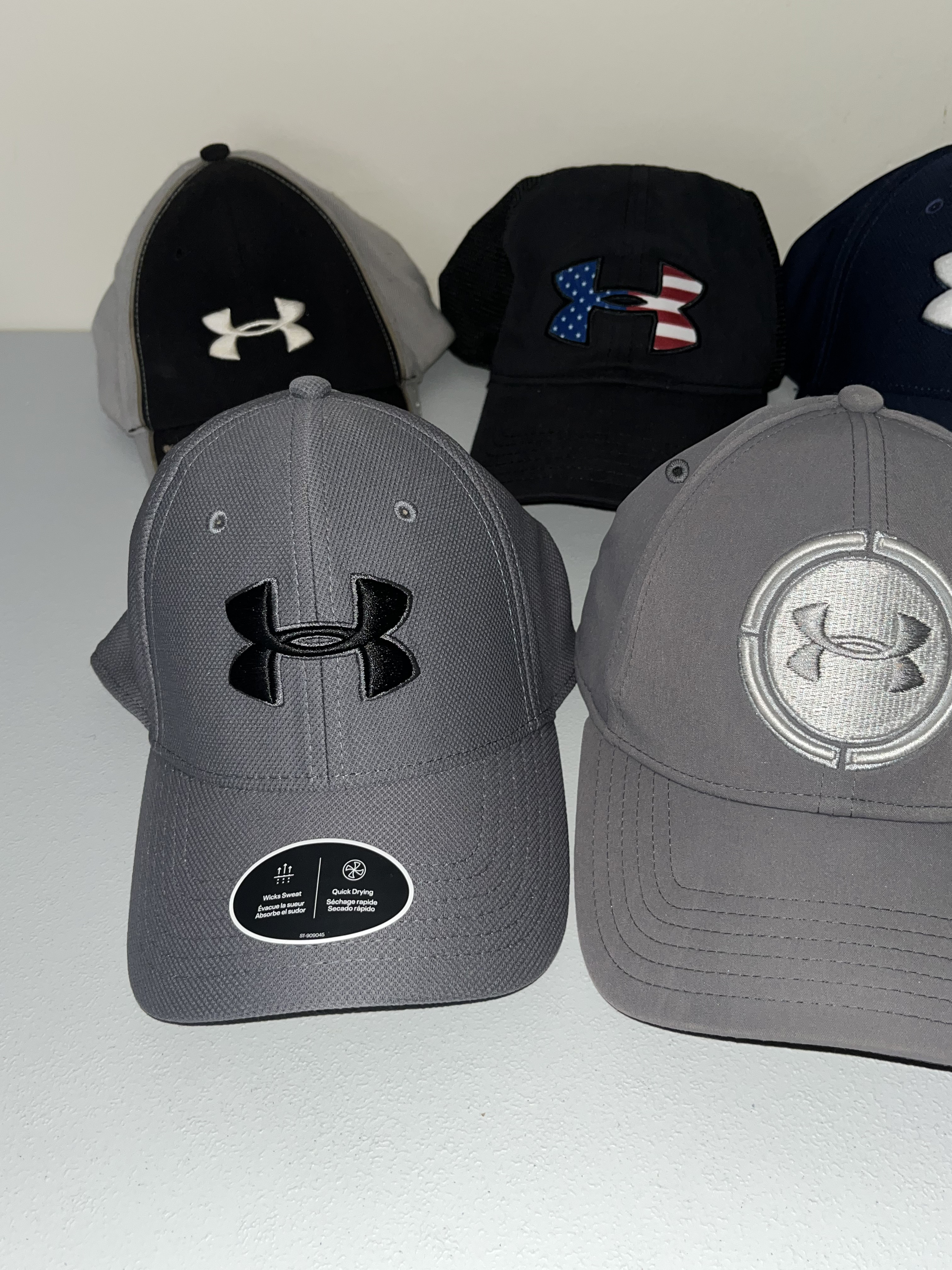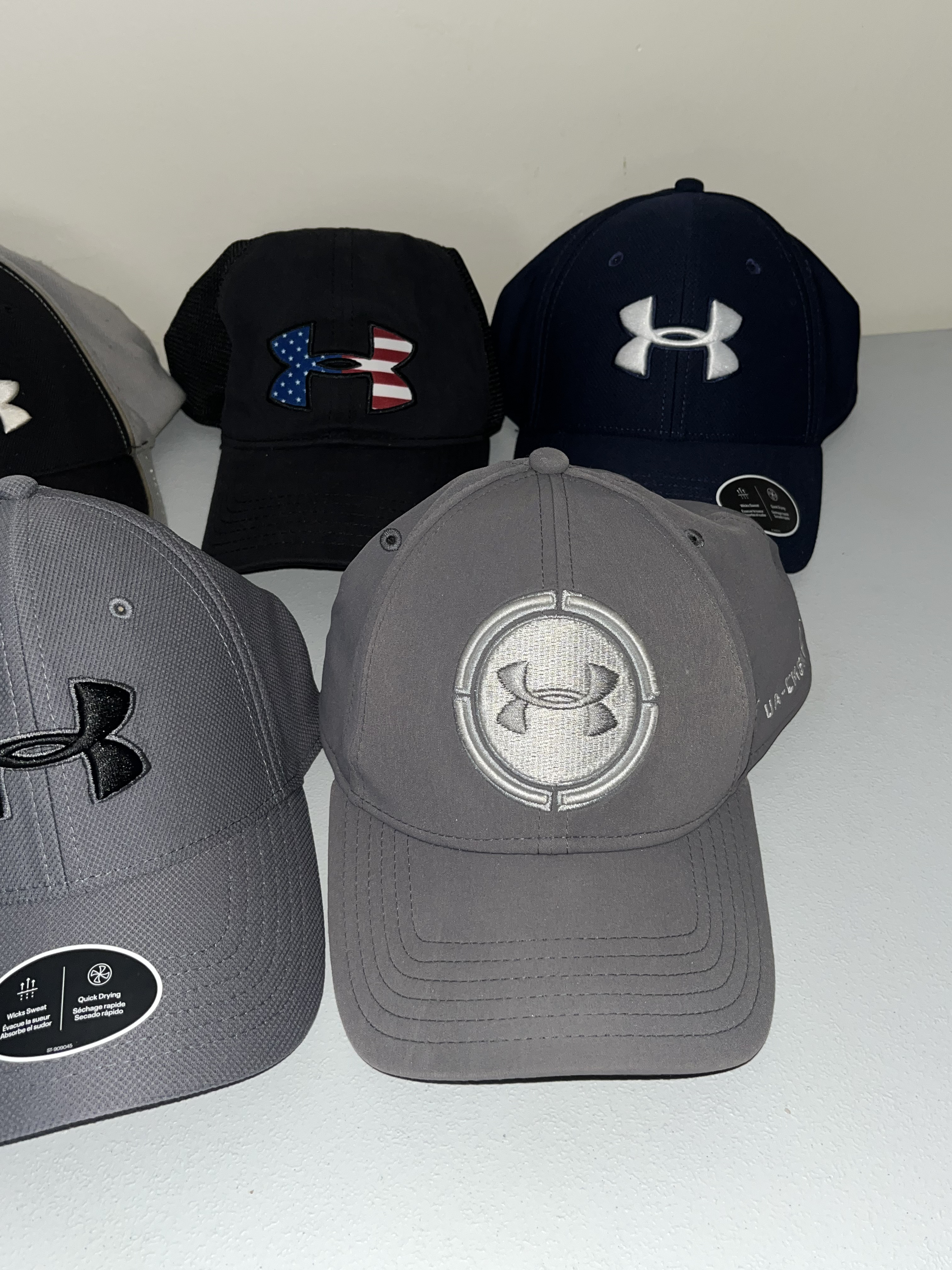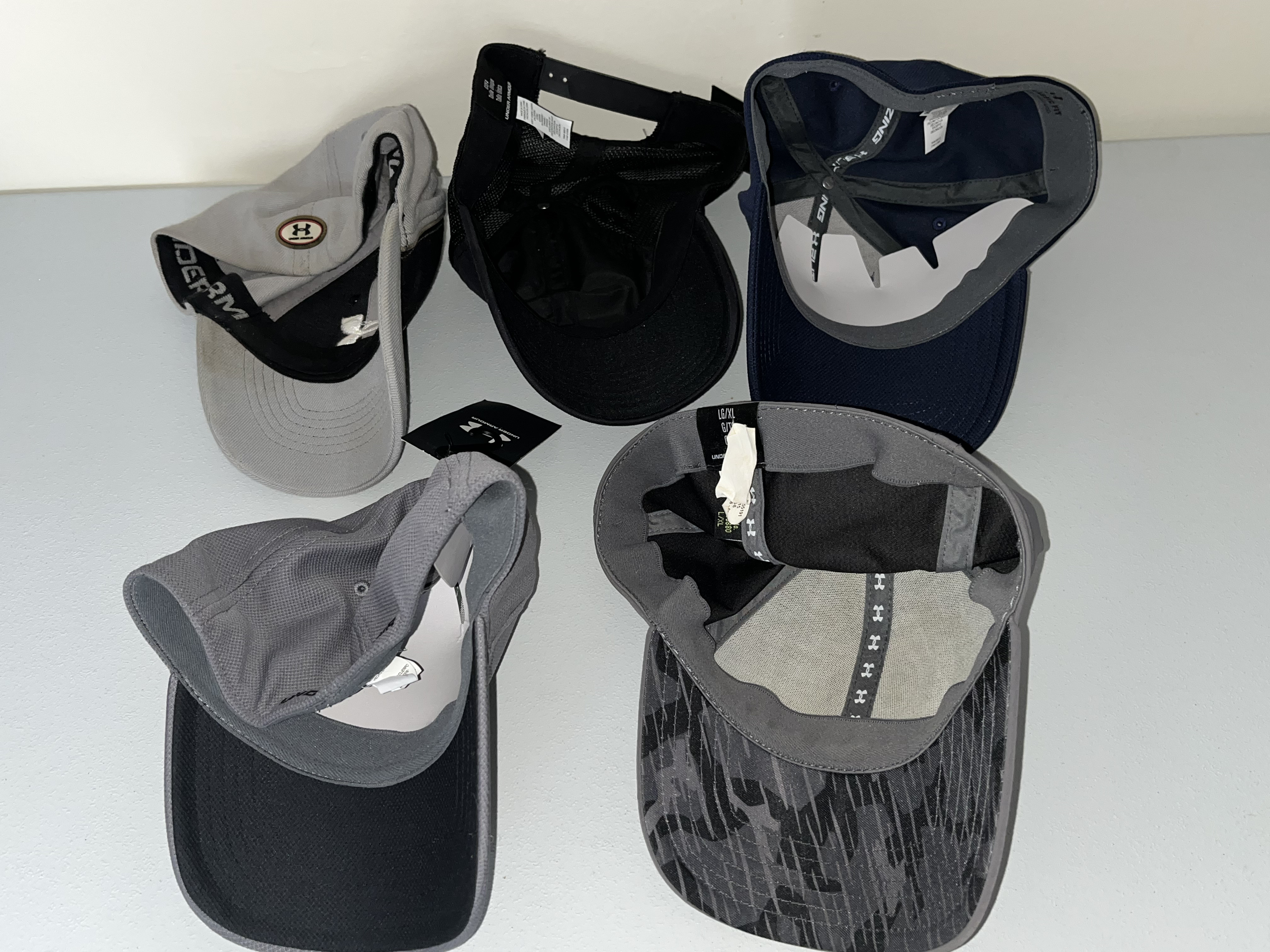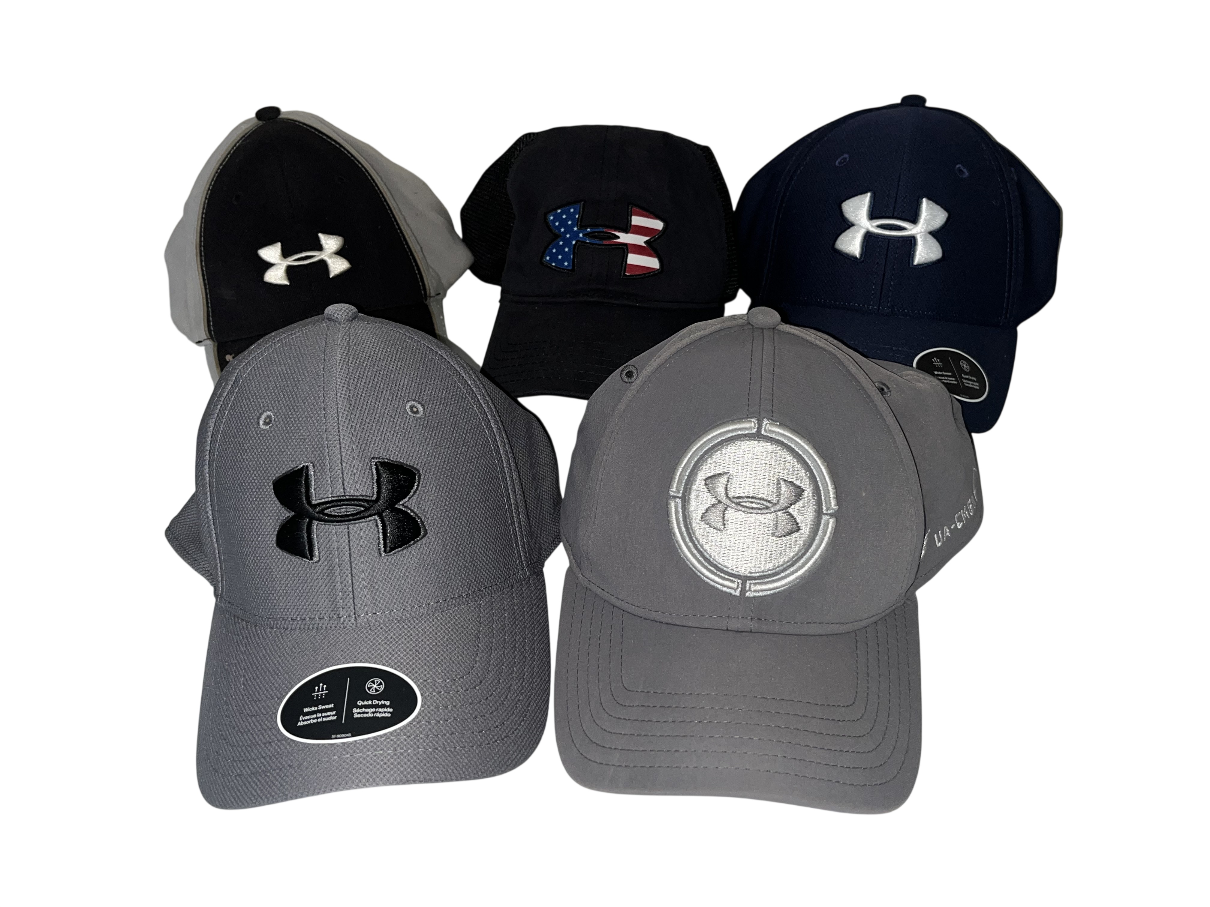 A collection of five Under Armour performance baseball caps in various golf and trucker styles. Look New!