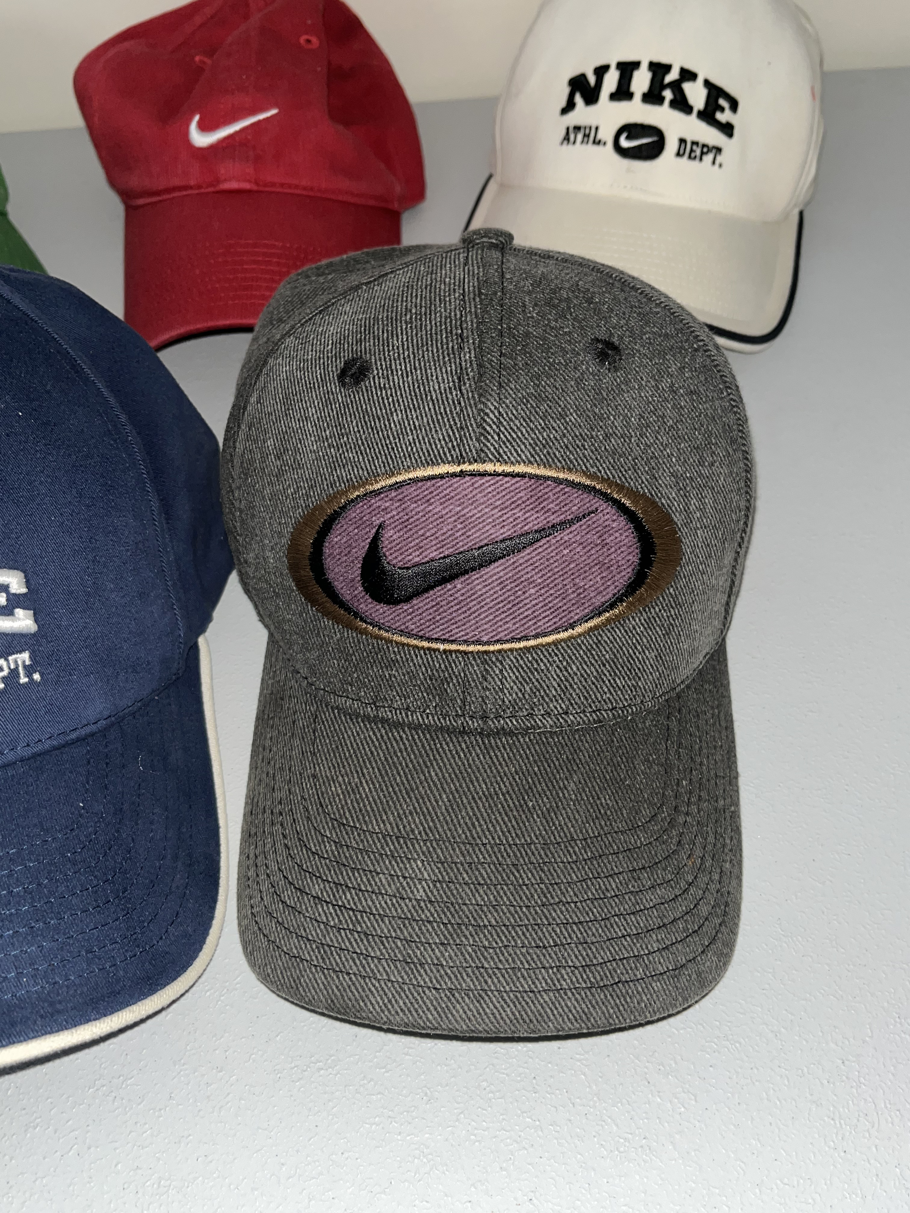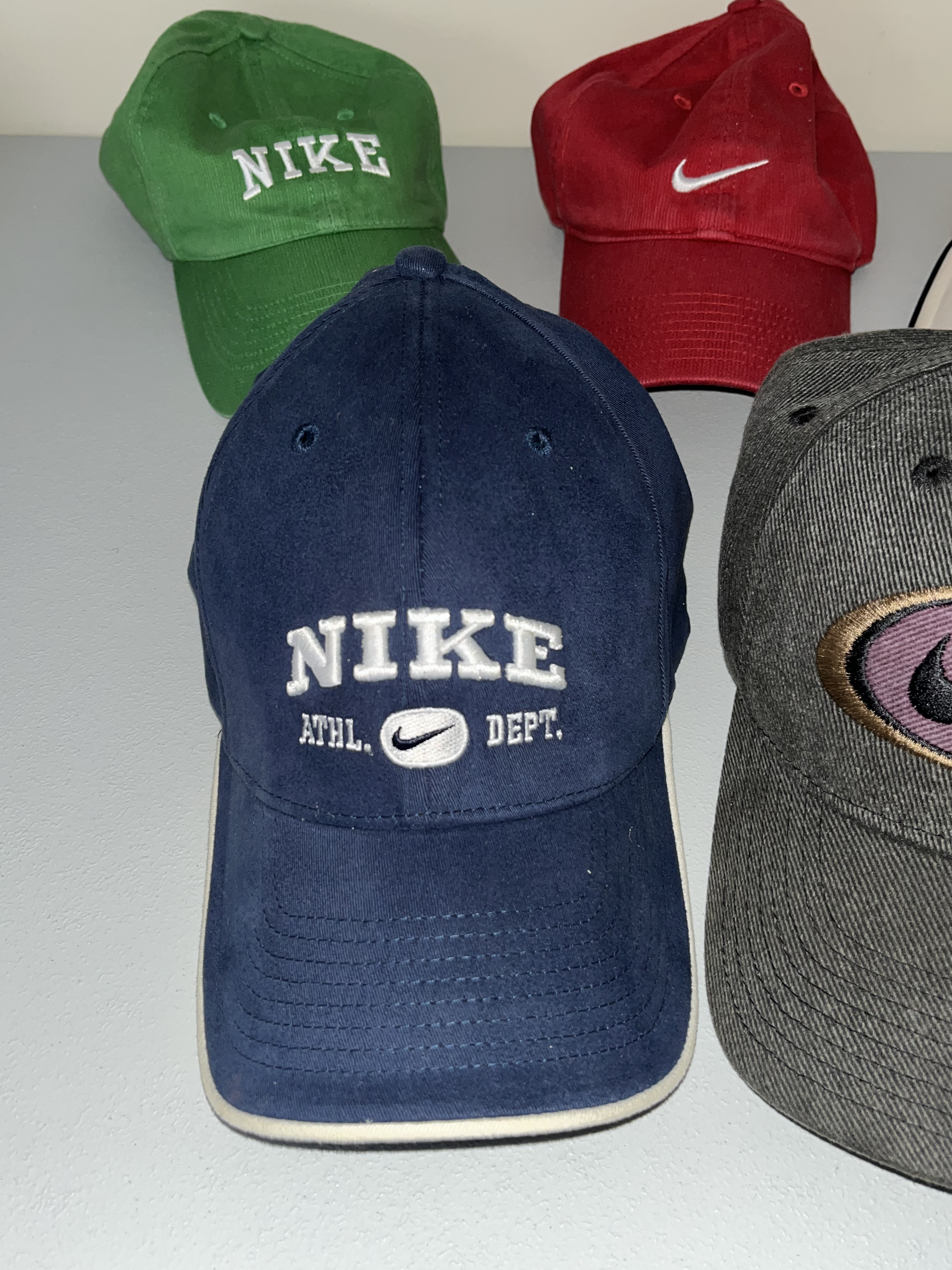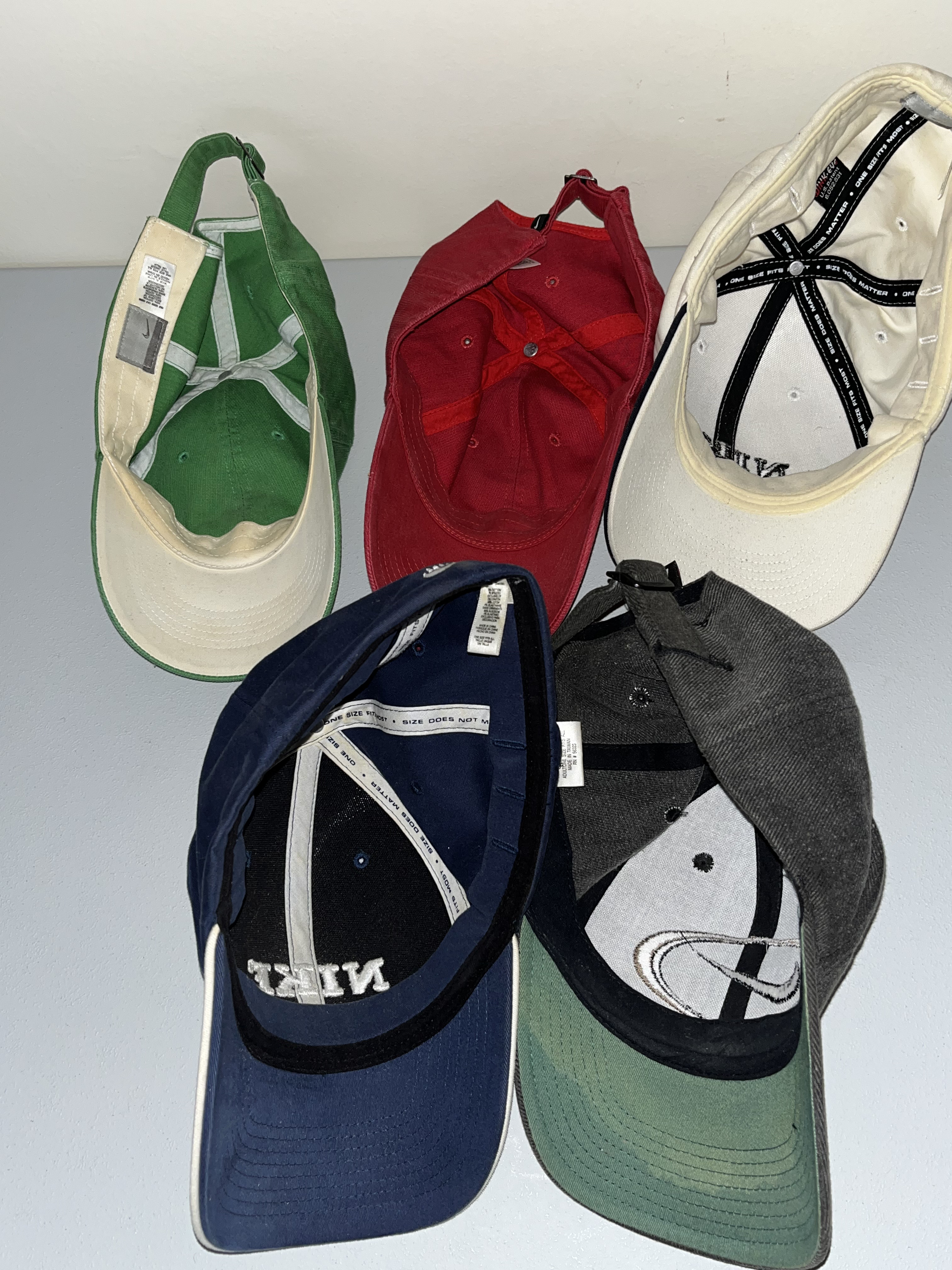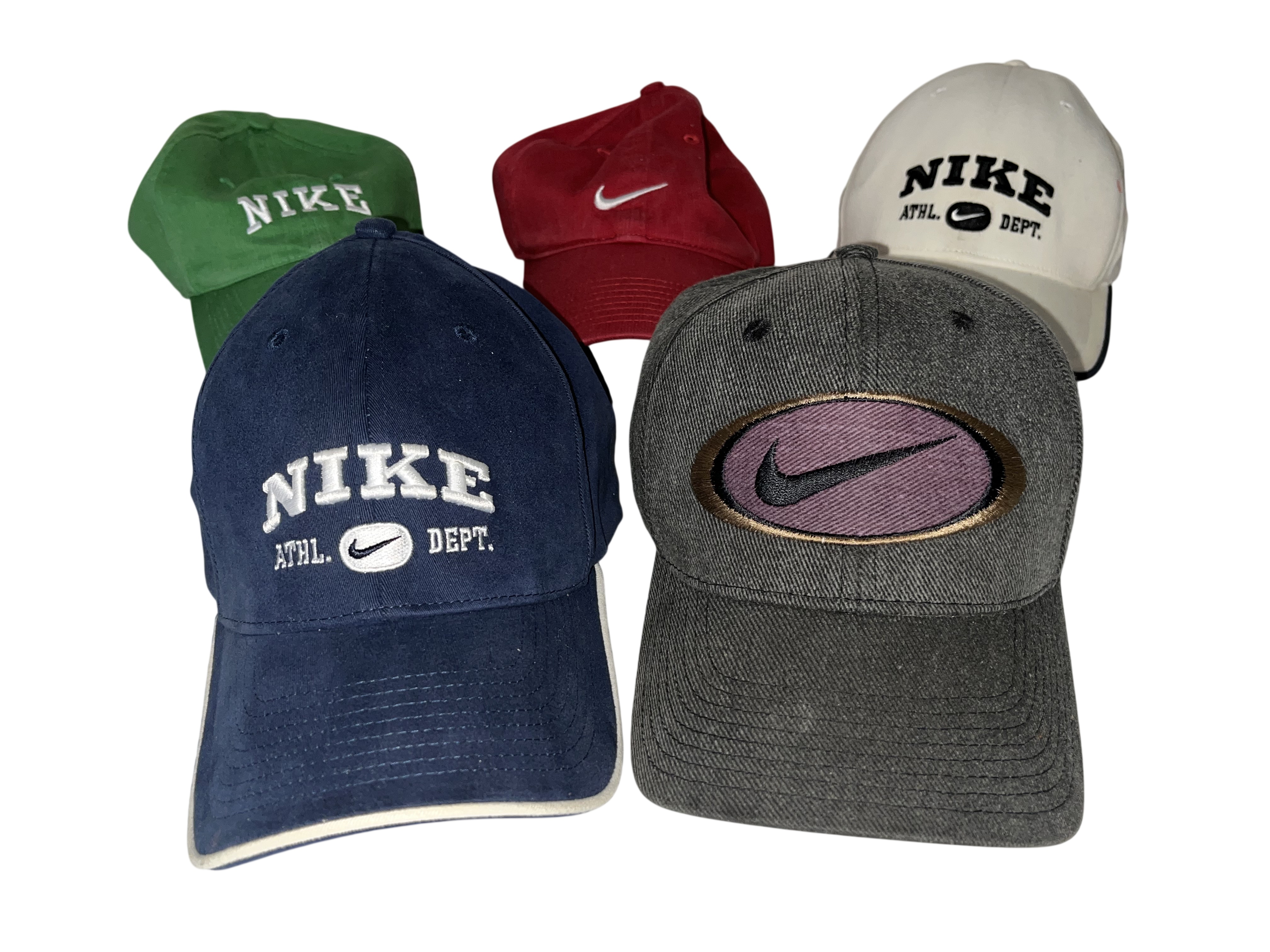 An assortment of five Nike adjustable baseball caps in various colors including green, red, off-white, navy blue, and charcoal gray, circa 1990s. The collection features cotton-blend textile construction with embroidered logos, including NIKE ATHL. DEPT. and the signature swoosh symbol. Notable details include interior branded tape reading ONE SIZE FITS MOST SIZE DOES NOT MATTER on select hats and a charcoal gray cap with a purple oval patch and green under-brim. Each hat includes adjustable metal or plastic strap components.