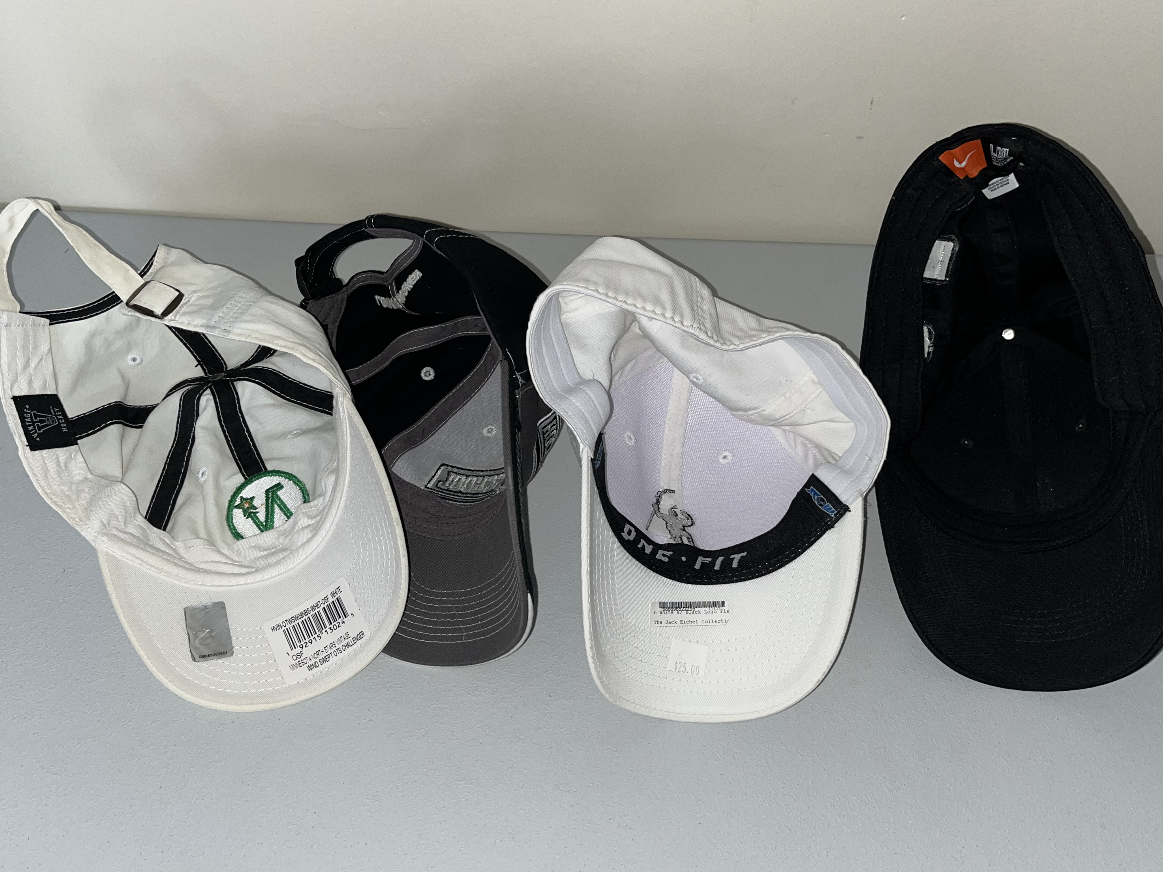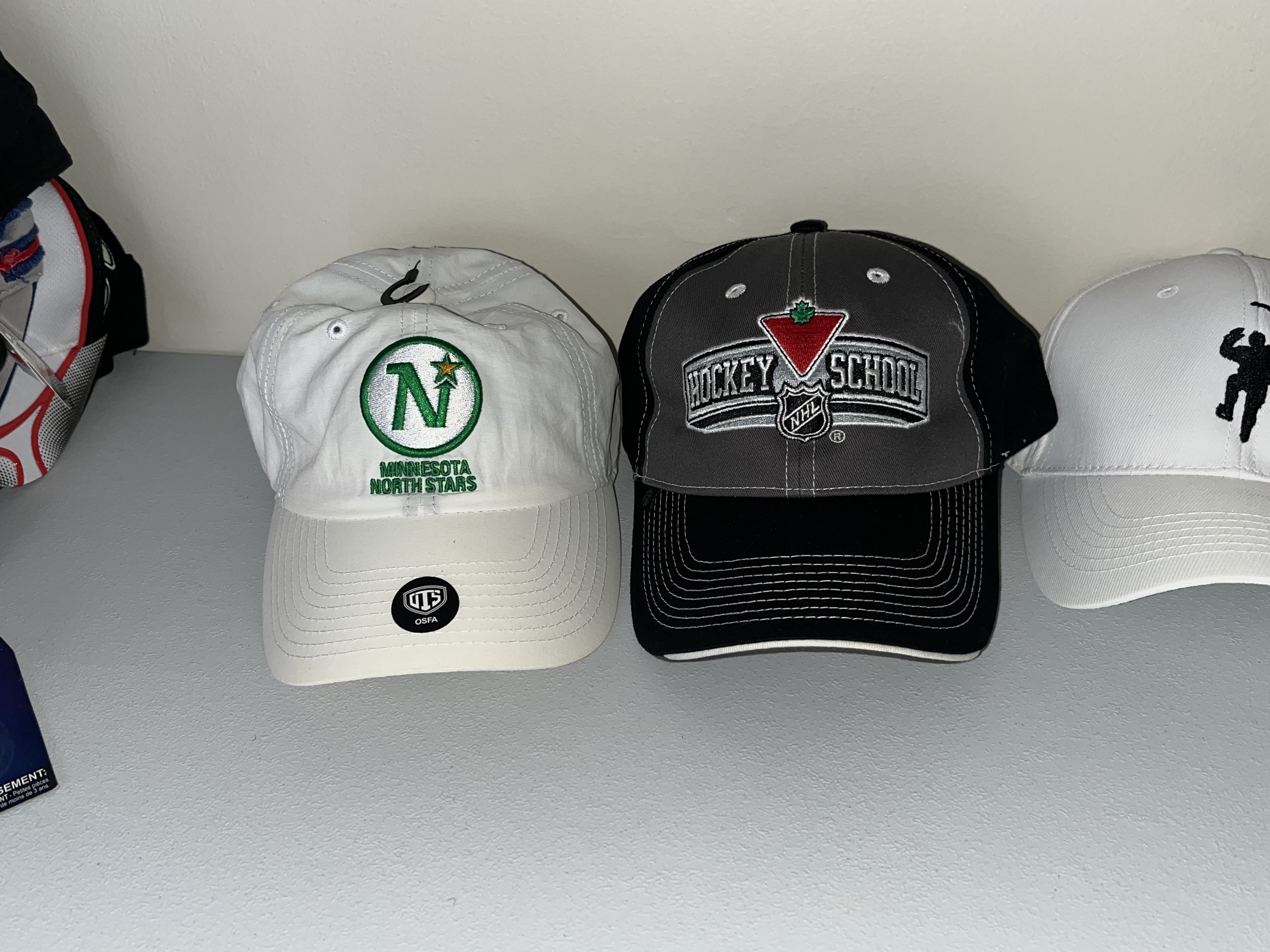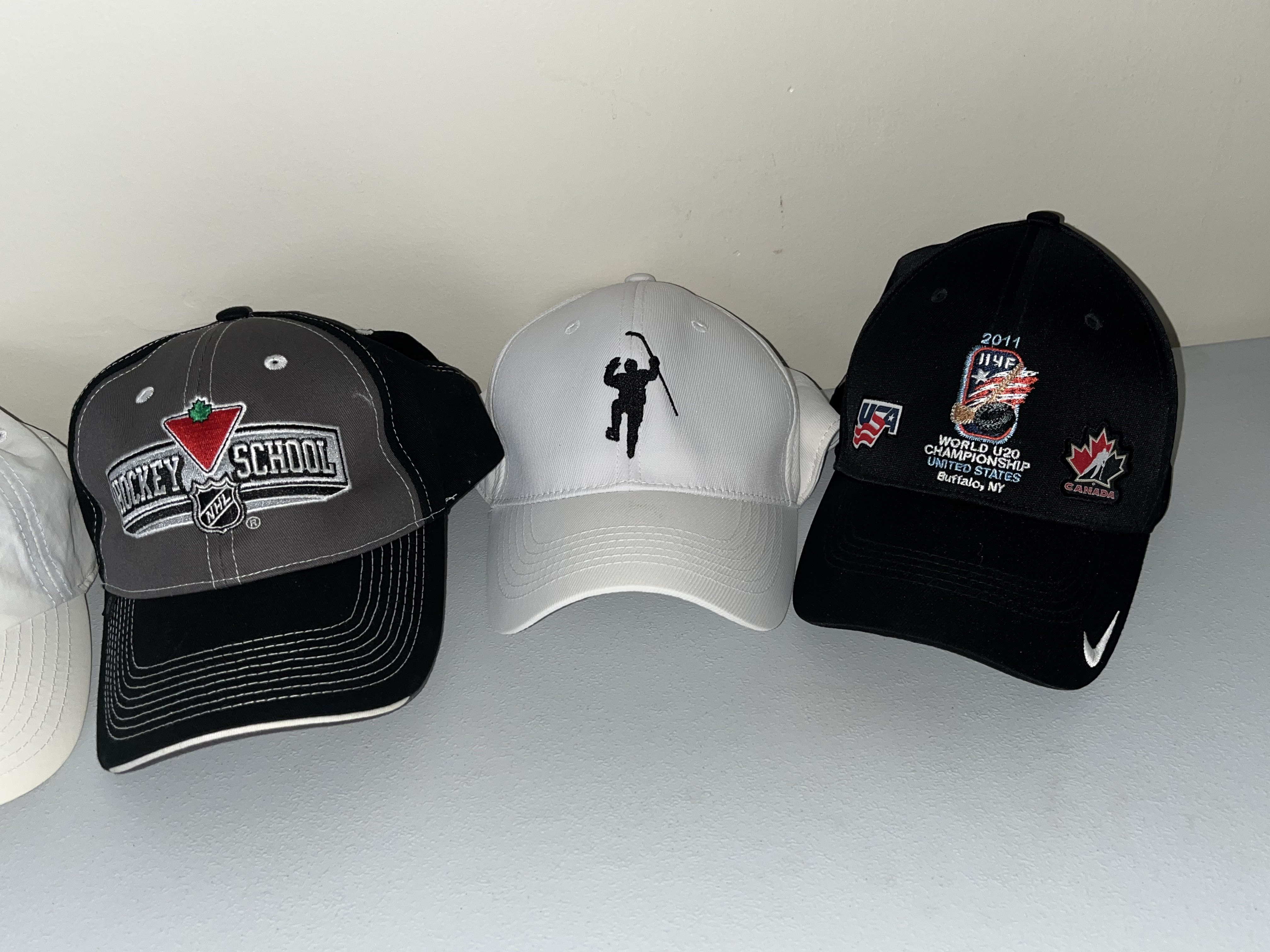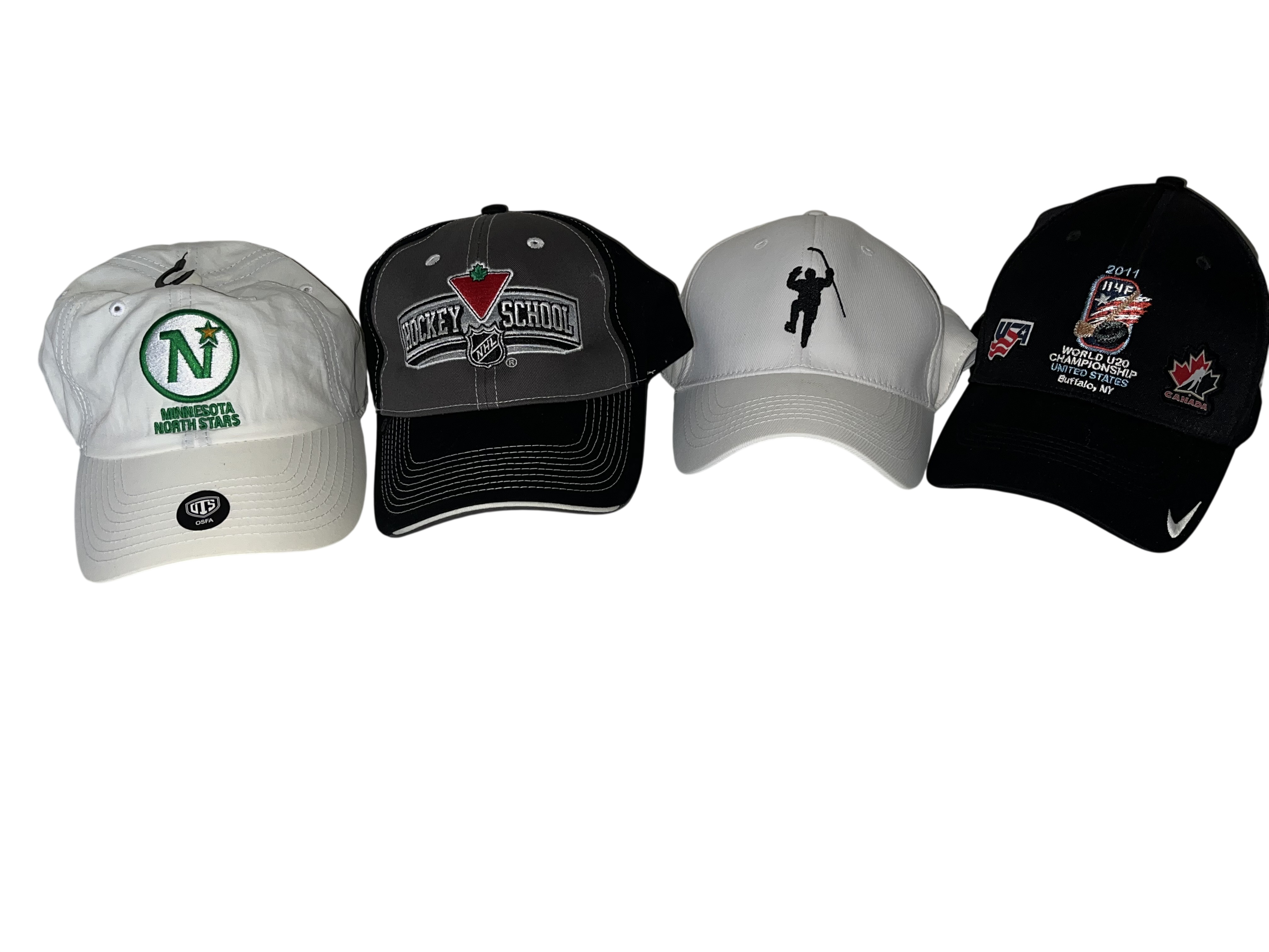 This collection features four hockey-themed caps including a Minnesota North Stars vintage cap by Old Time Sports and a Nike 2011 IIHF World U20 Championship commemorative hat. The group also contains a Canadian Tire Hockey School cap with an NHL shield and a white stretch-style cap from the Jack Eichel Collection.