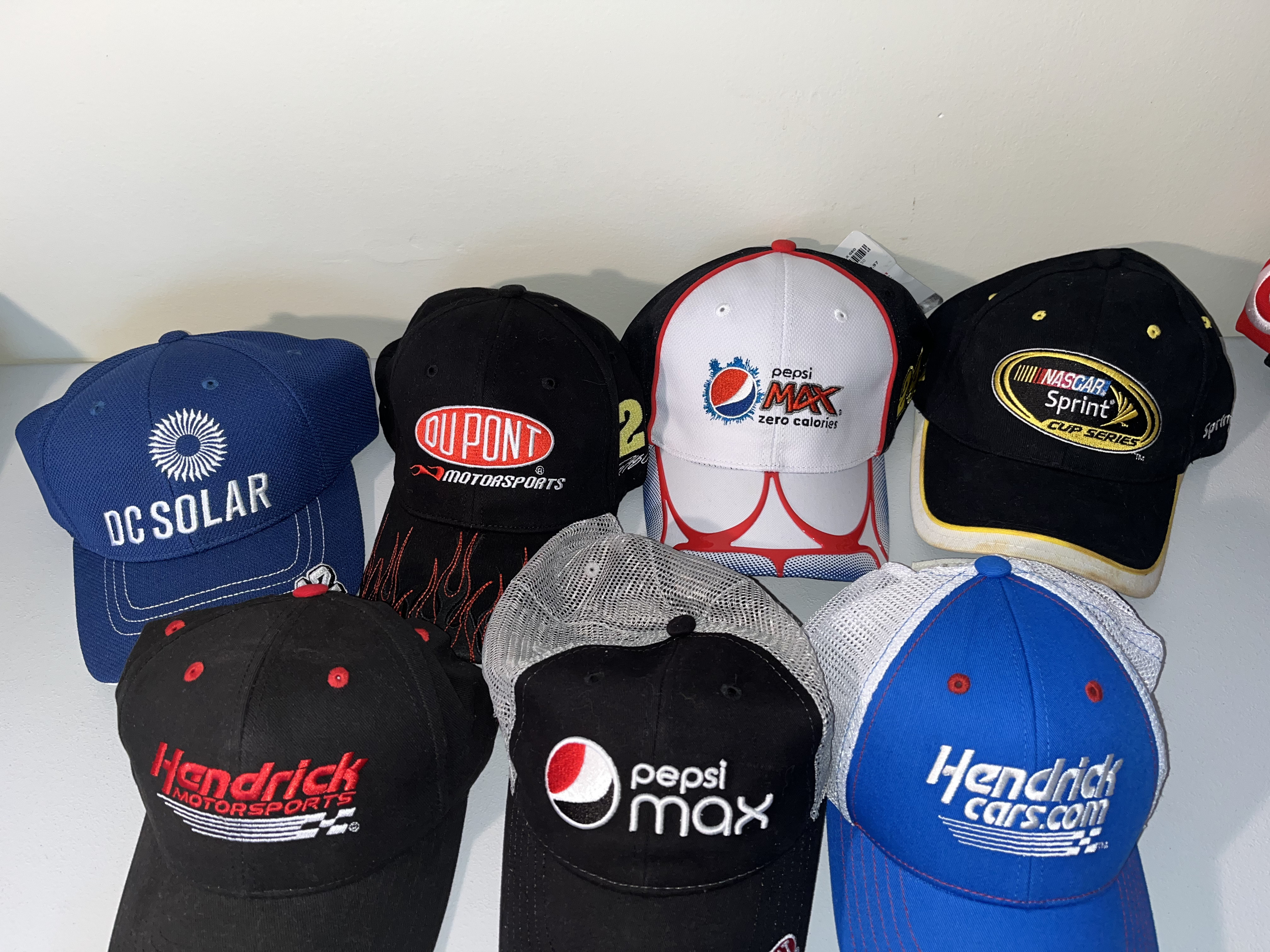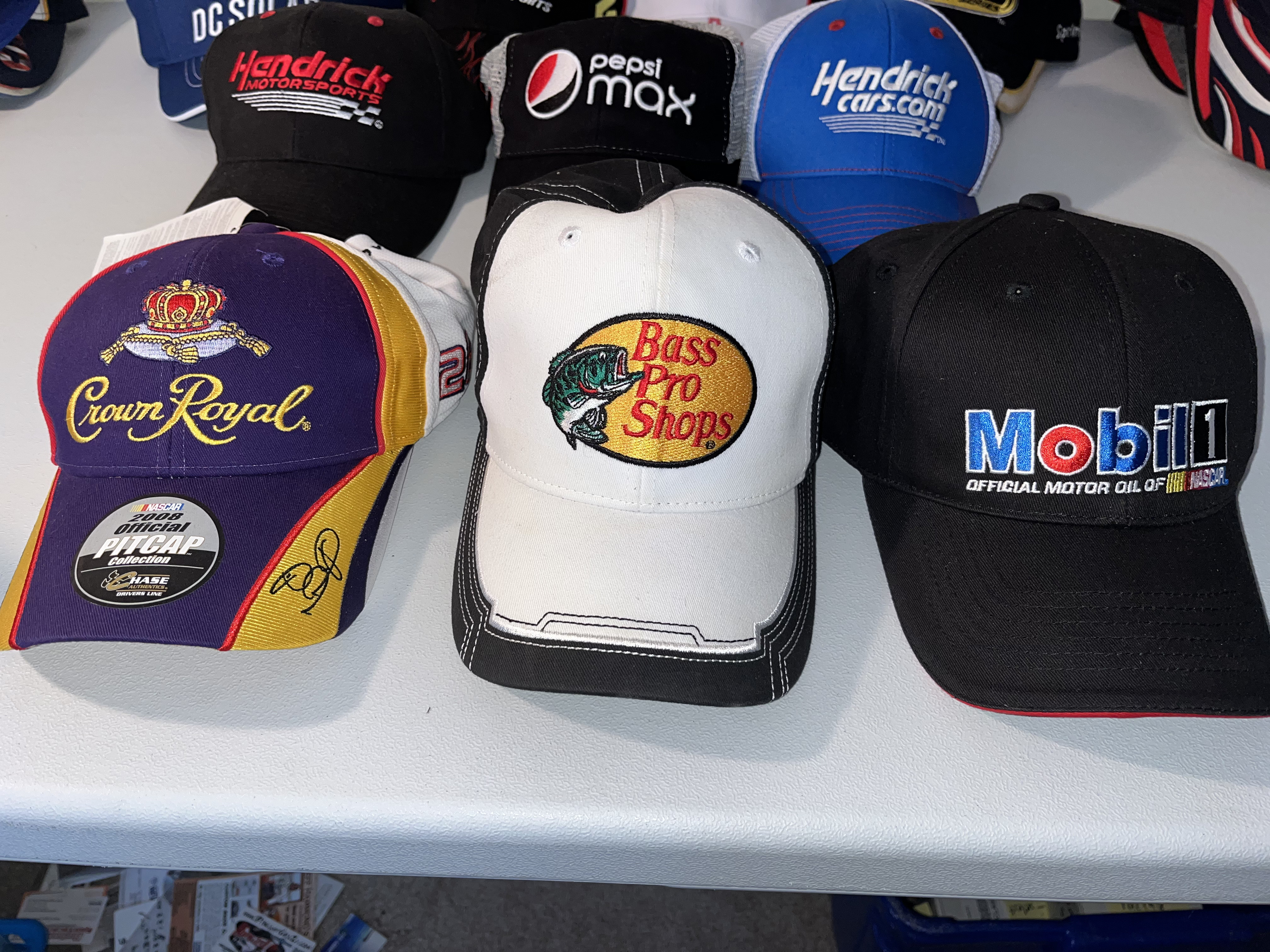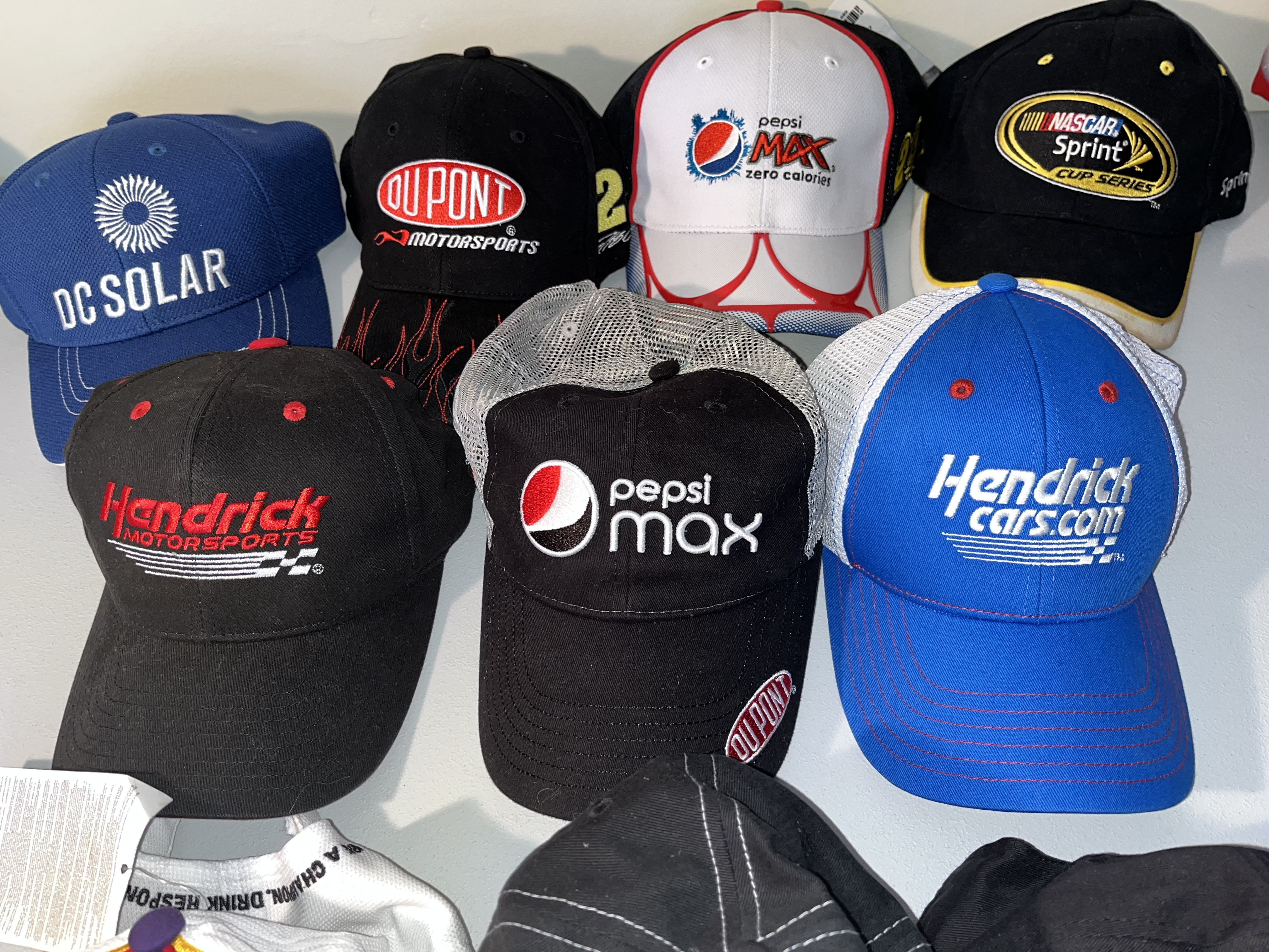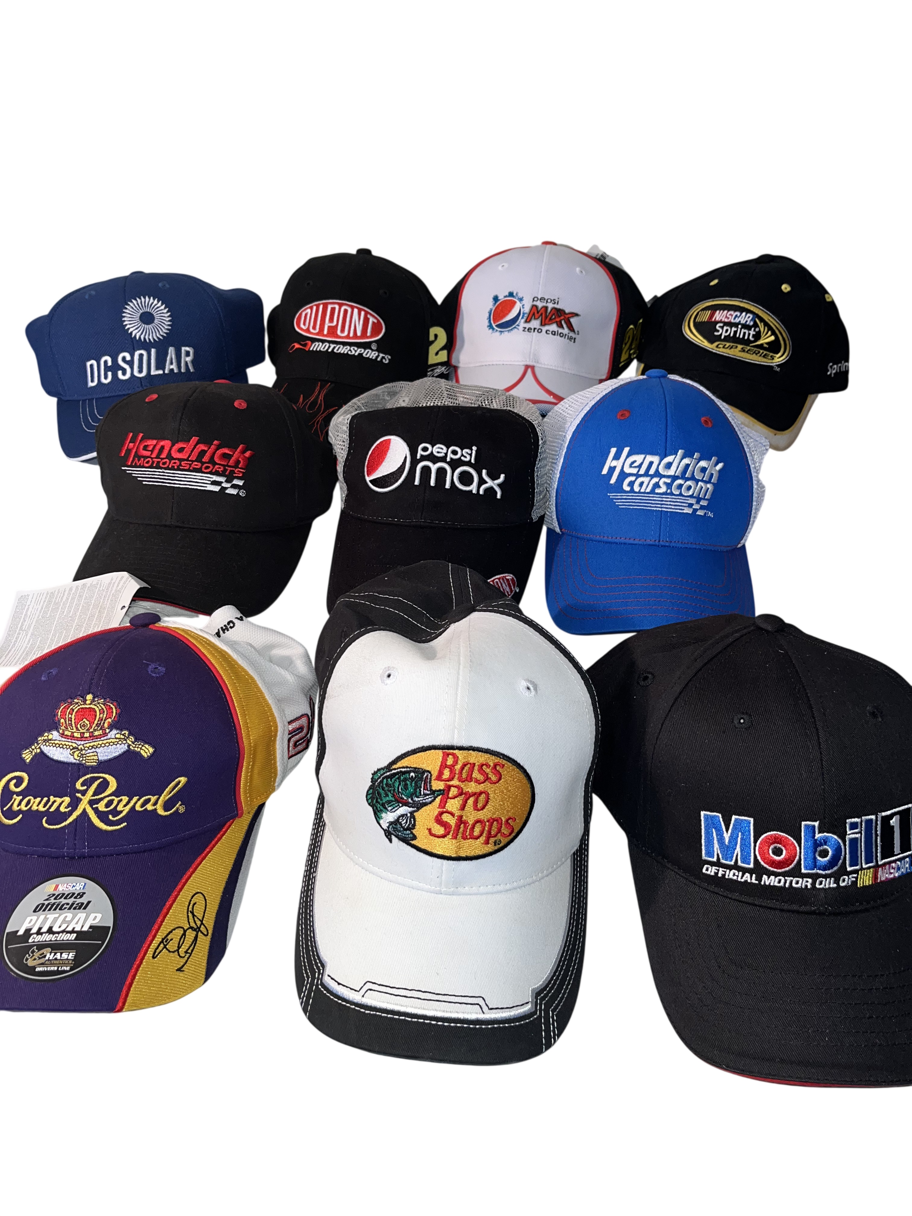 A collection of various NASCAR-themed and corporate sponsor baseball and trucker-style caps, including Bass Pro Shops mesh snapback hats and Chase Authentics apparel. The group features embroidered logos for DC Solar, DuPont Motorsports, Pepsi Max, Hendrick Motorsports, and Mobil 1, constructed from cotton twill and synthetic mesh. Highlights include a 2008 NASCAR Official Pit Cap Collection Crown Royal hat with an embroidered signature and several items retaining original retail tags or stickers.