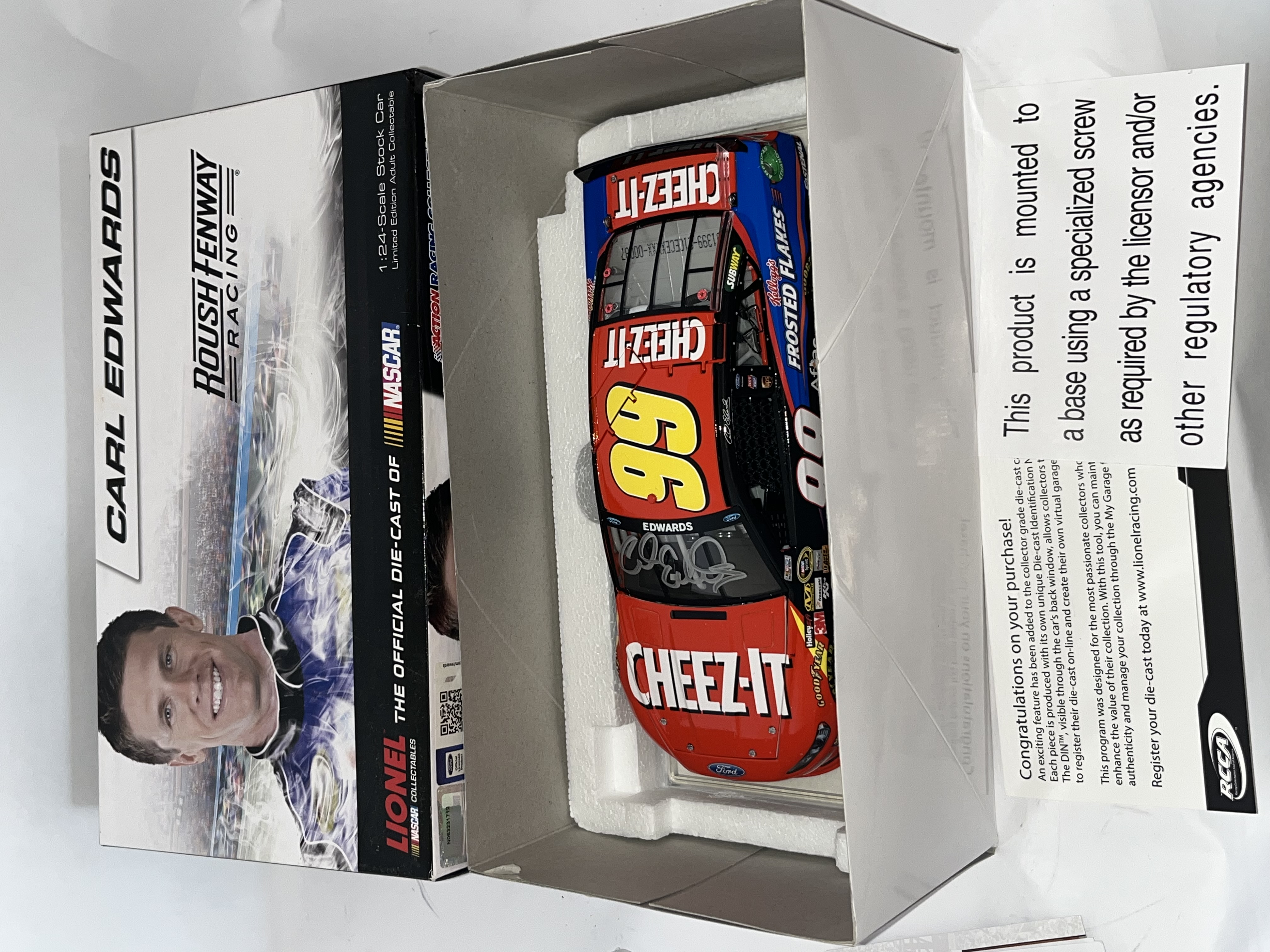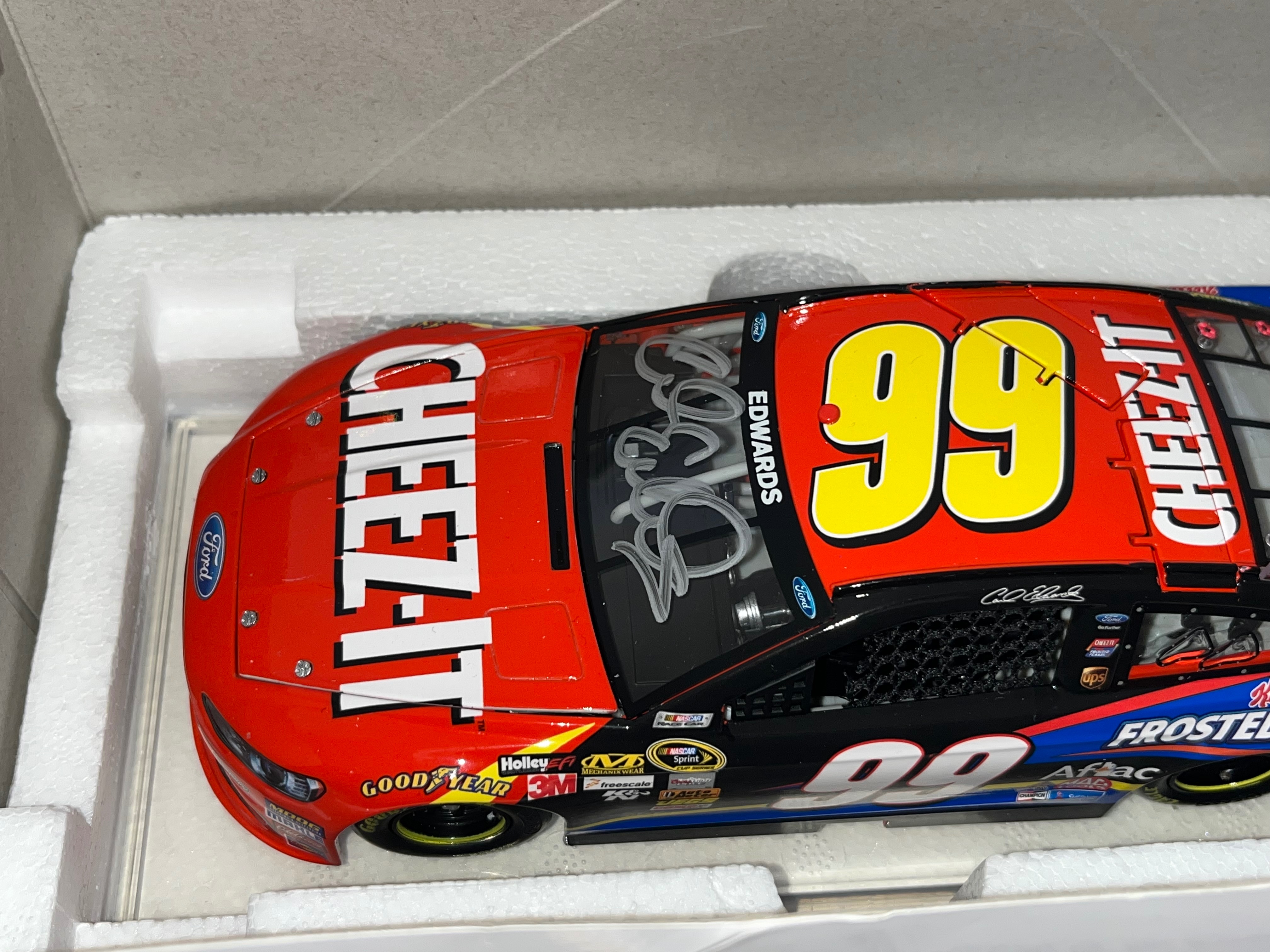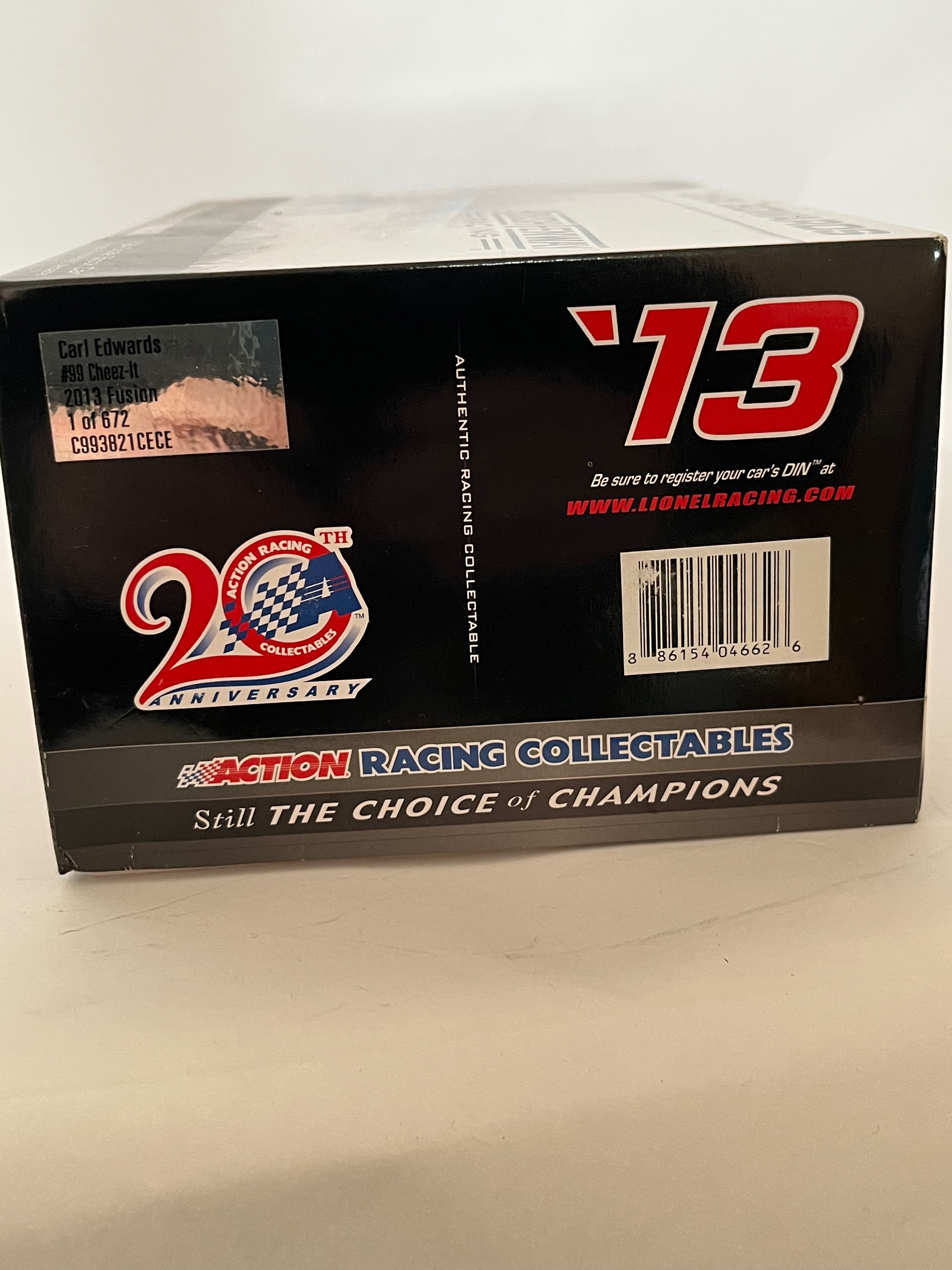 This is a limited-edition 1:24-scale model of the #99 Ford Fusion driven by Carl Edwards for Roush Fenway Racing during the 2013 NASCAR season. Manufactured by Lionel NASCAR Collectables under the Action Racing Collectables brand, the piece features a die-cast metal body and chassis with plastic and rubber components. The livery showcases primary sponsorship from Cheez-It. The front windshield features a signature in silver marker attributed to driver Carl Edwards. This model is part of a limited production run of 1 of 672 units, as indicated by the manufacturer sticker on the original packaging. Manufacturer identifiers include item number C993821CECE and UPC 886154046626. The box carries the Action Racing Collectables 20th Anniversary branding and official NASCAR licensed product hologram N063231712.