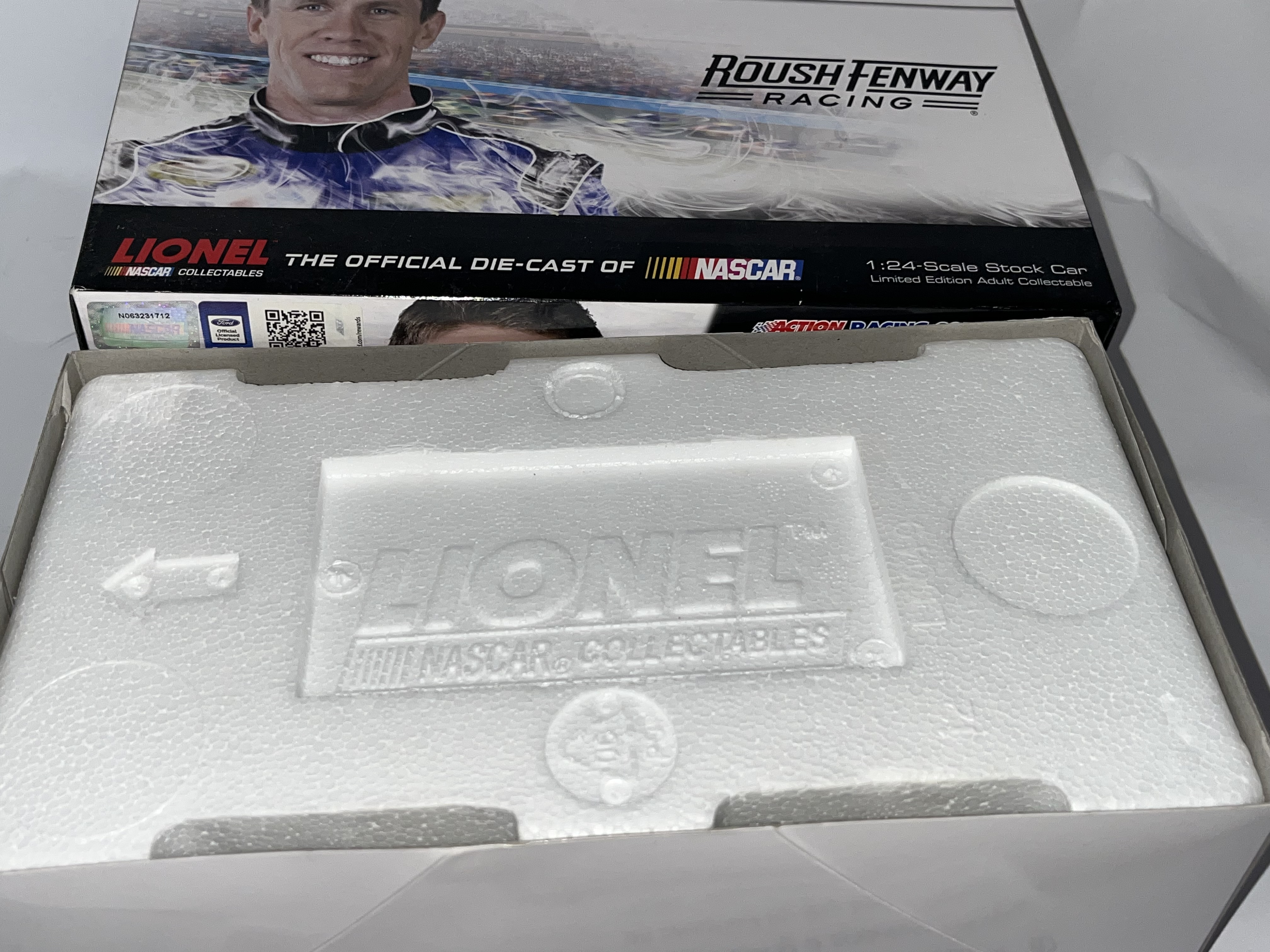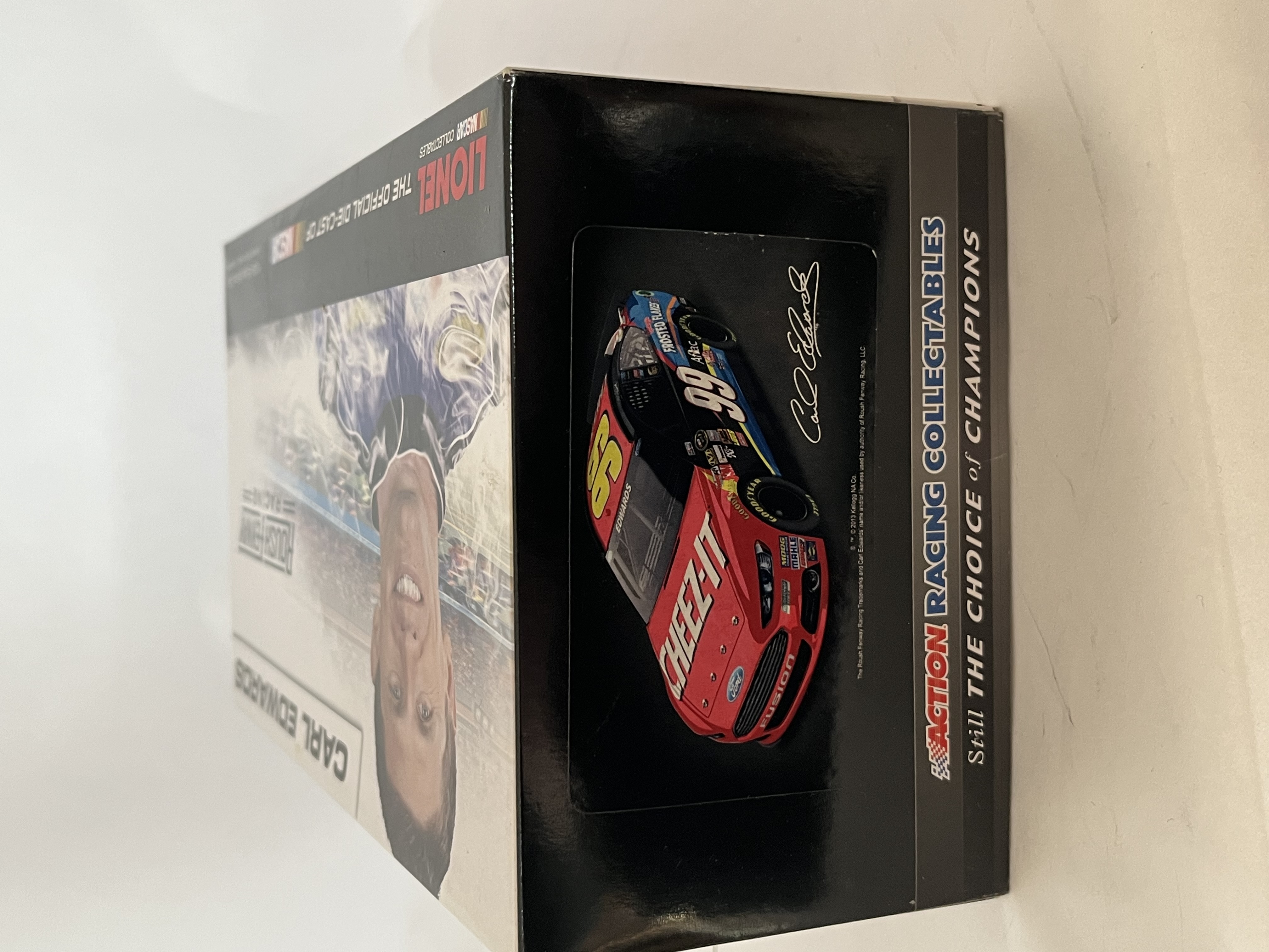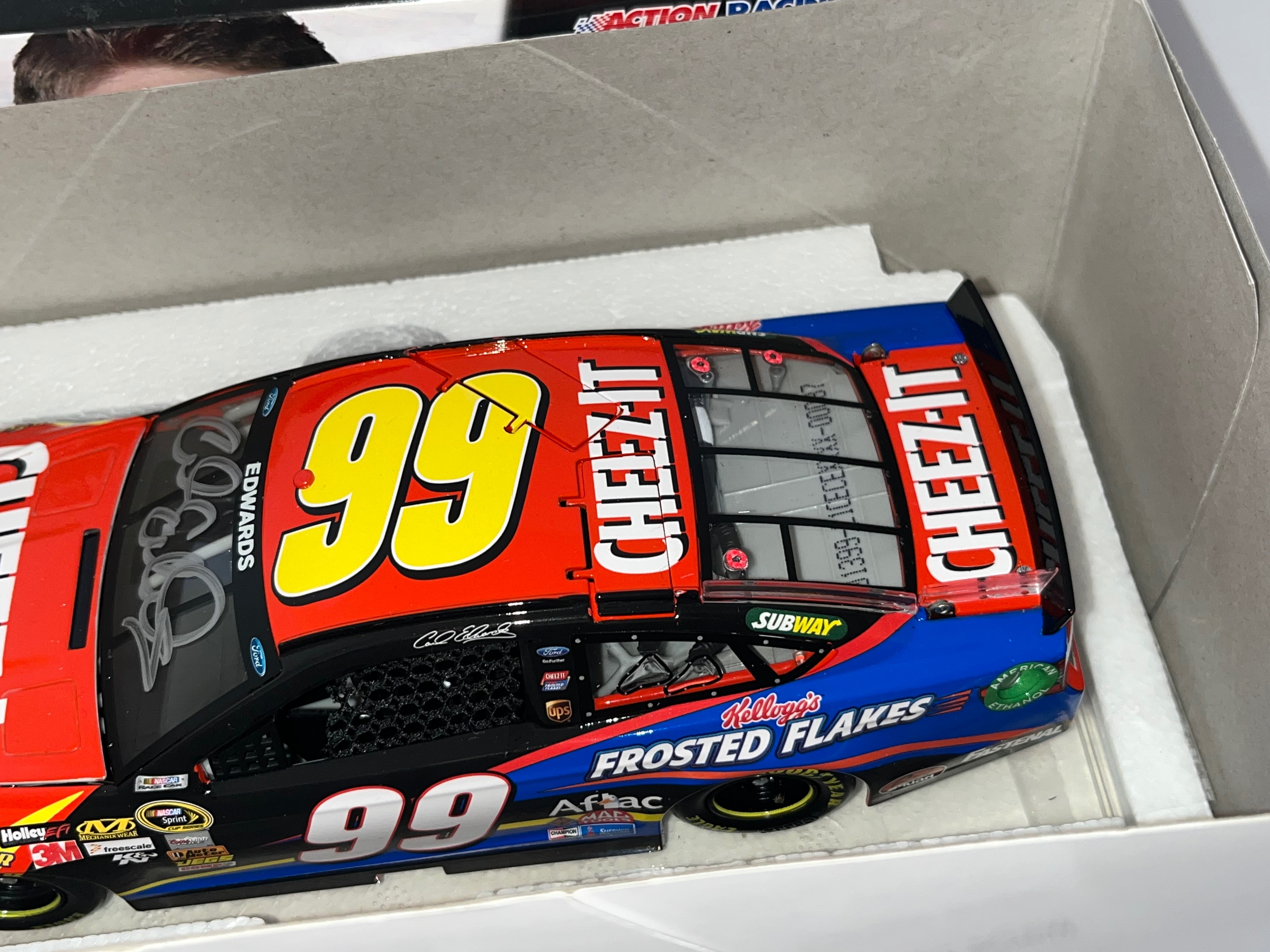 This is a limited-edition 1:24-scale model of the #99 Ford Fusion driven by Carl Edwards for Roush Fenway Racing during the 2013 NASCAR season. Manufactured by Lionel NASCAR Collectables under the Action Racing Collectables brand, the piece features a die-cast metal body and chassis with plastic and rubber components. The livery showcases primary sponsorship from Cheez-It. The front windshield features a signature in silver marker attributed to driver Carl Edwards. This model is part of a limited production run of 1 of 672 units, as indicated by the manufacturer sticker on the original packaging. Manufacturer identifiers include item number C993821CECE and UPC 886154046626. The box carries the Action Racing Collectables 20th Anniversary branding and official NASCAR licensed product hologram N063231712.