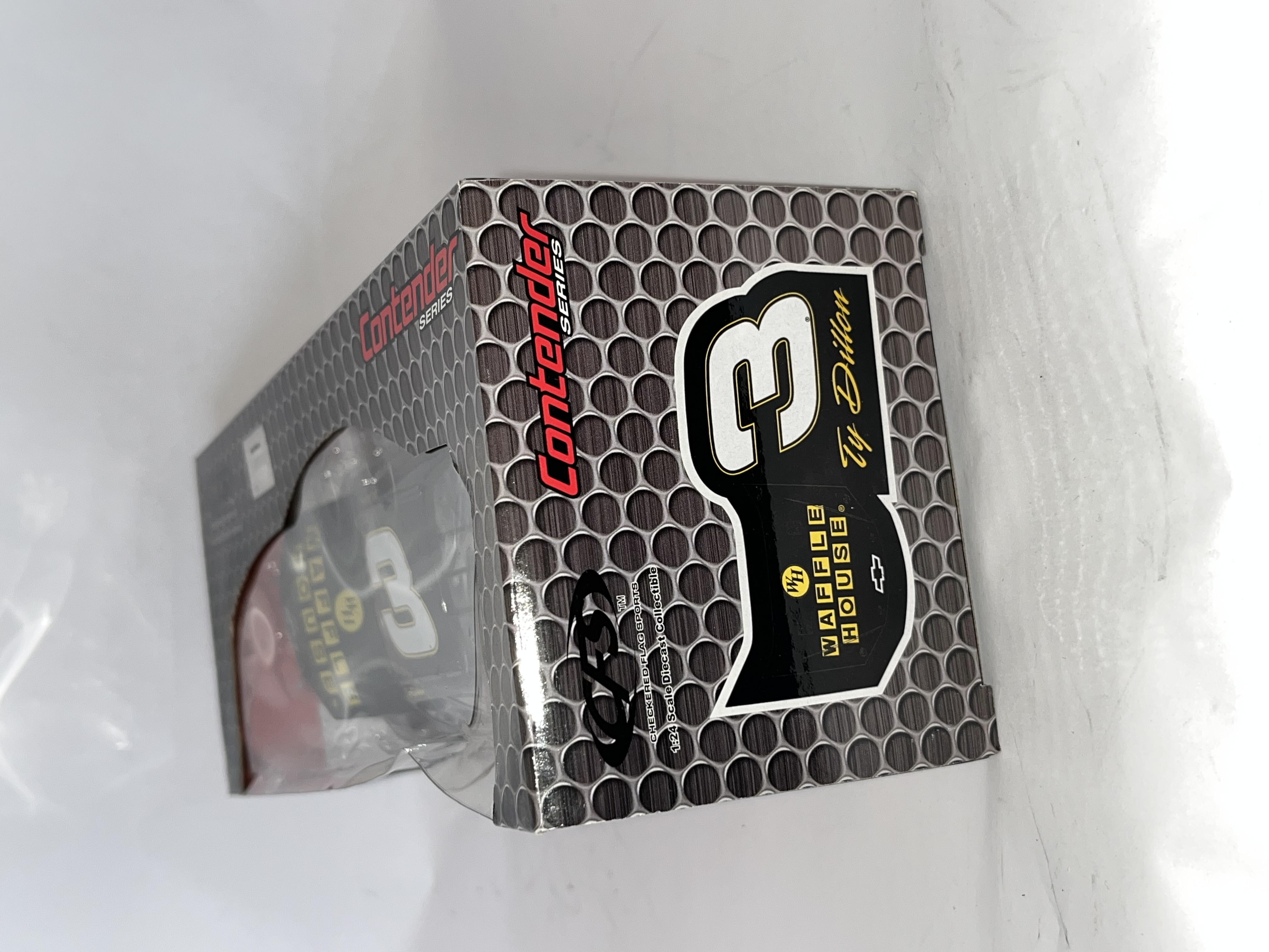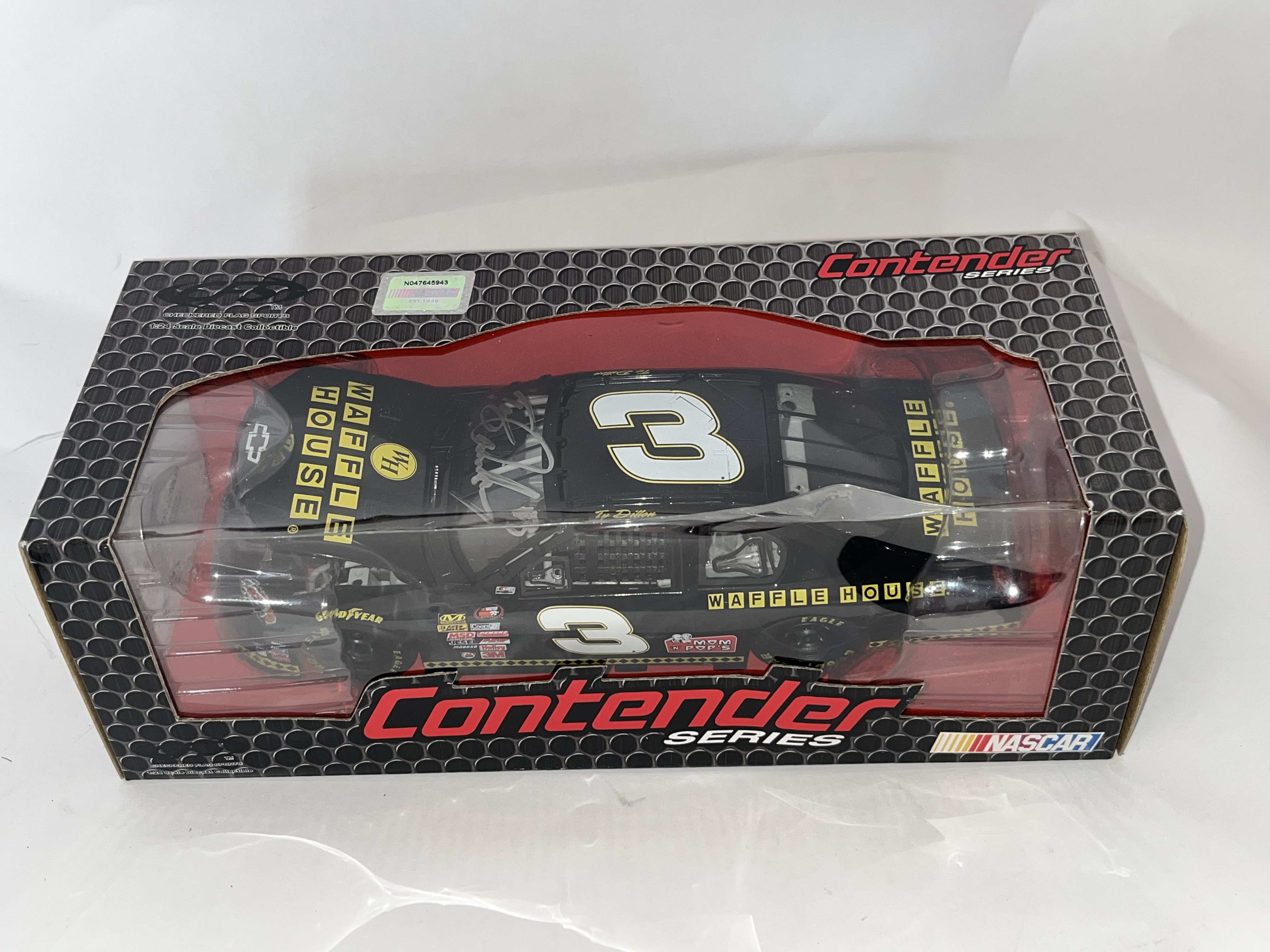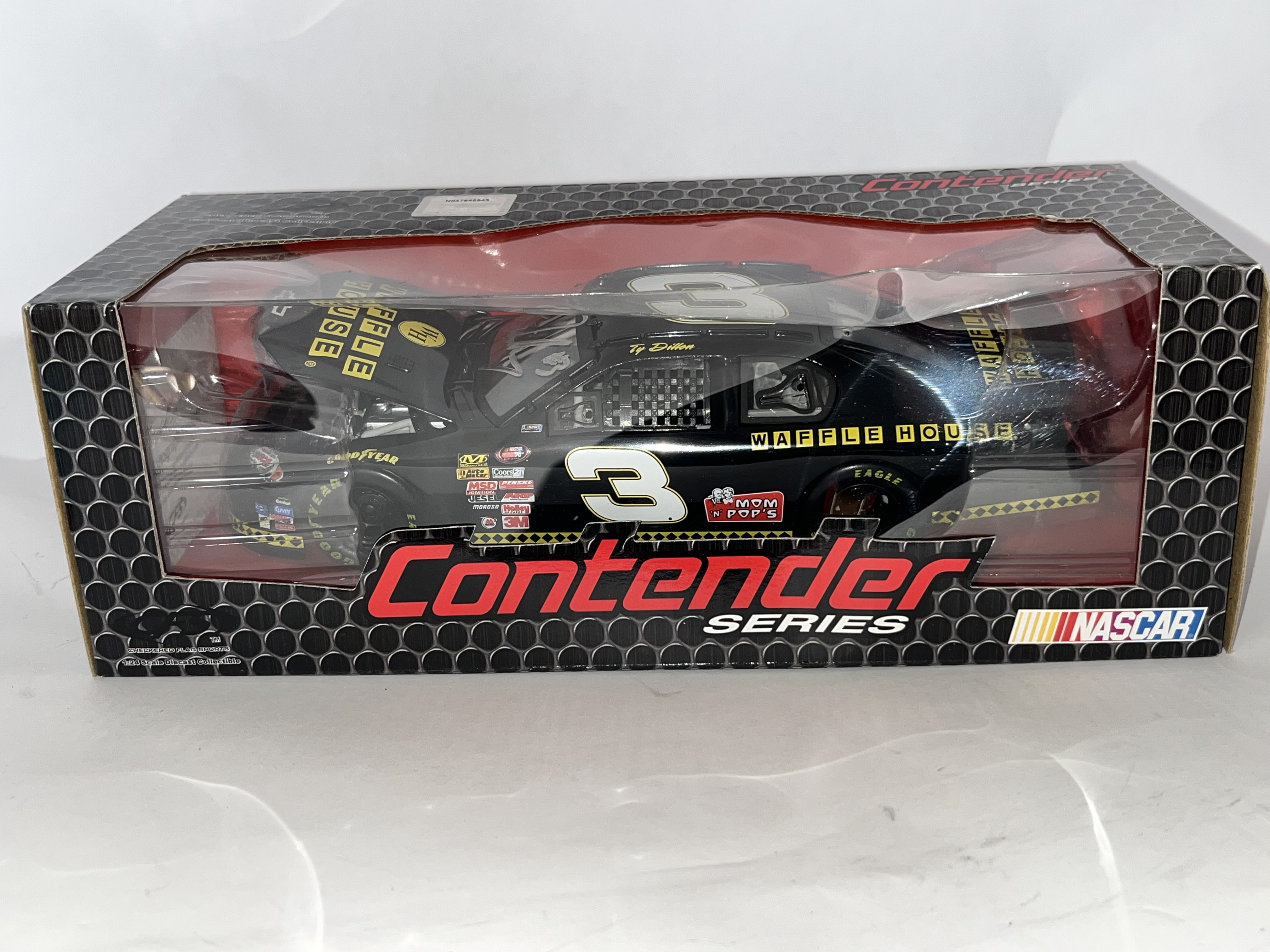 This 1:24 scale die-cast replica features the #3 Chevrolet driven by Ty Dillon with Waffle House sponsorship. Produced by Checkered Flag Sports (CFS) for the Contender Series. The item is contained within its original manufacturer window box and includes an official NASCAR holographic licensing sticker, serial number N047645943. Dimensions: 10 x 4.5 x 3.5 inches.
