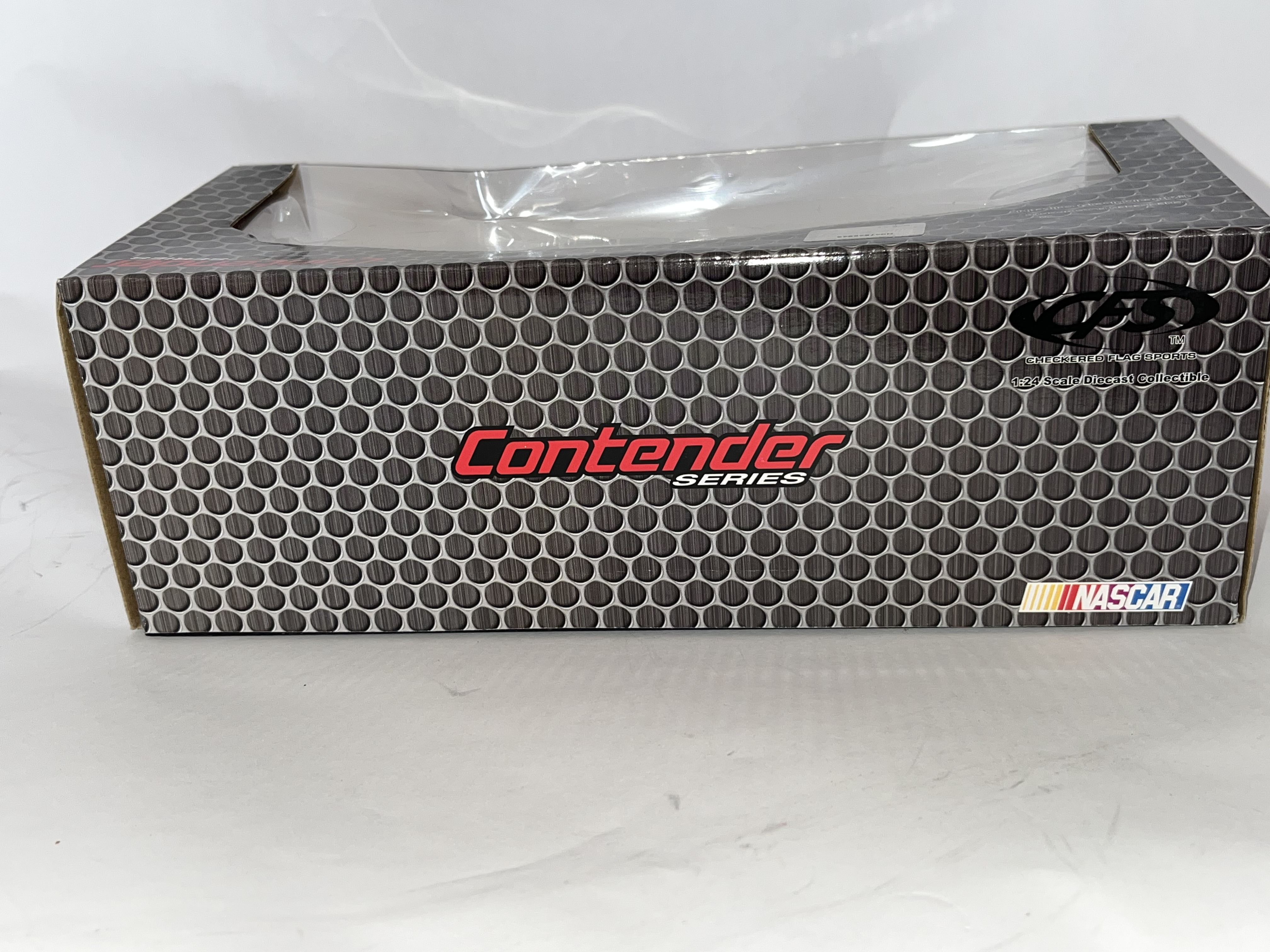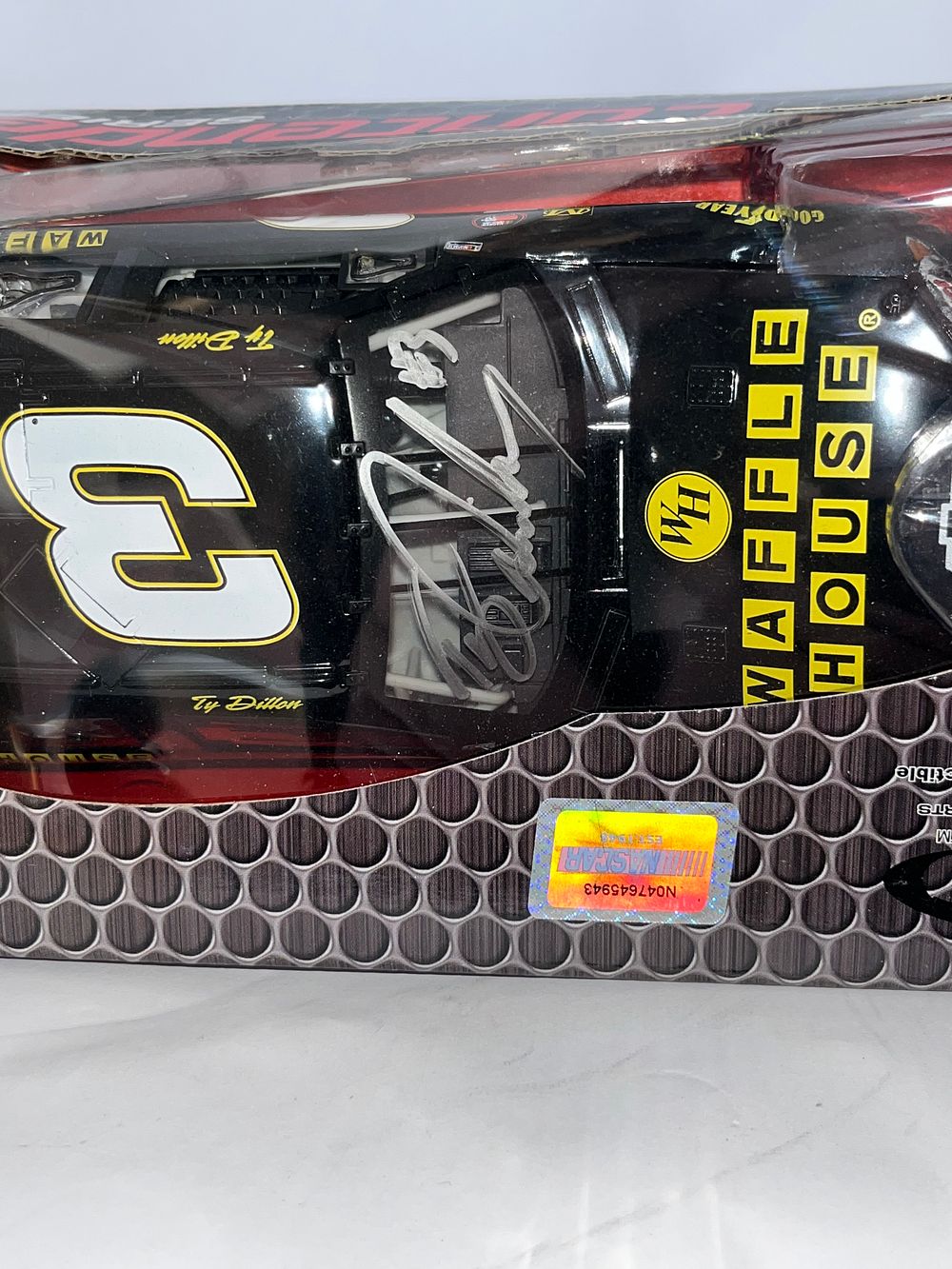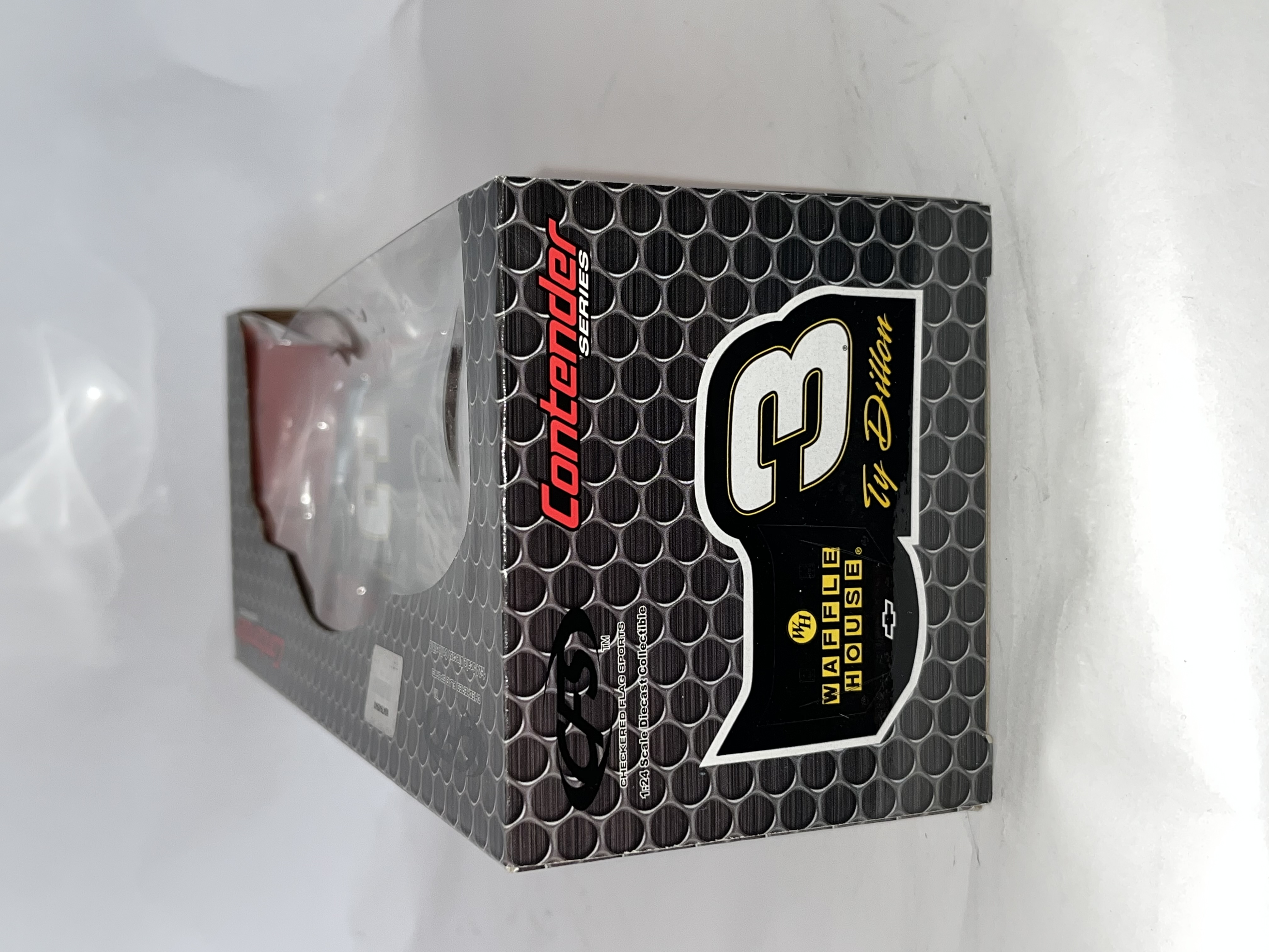 This 1:24 scale die-cast replica features the #3 Chevrolet driven by Ty Dillon with Waffle House sponsorship. Produced by Checkered Flag Sports (CFS) for the Contender Series. The item is contained within its original manufacturer window box and includes an official NASCAR holographic licensing sticker, serial number N047645943. Dimensions: 10 x 4.5 x 3.5 inches.