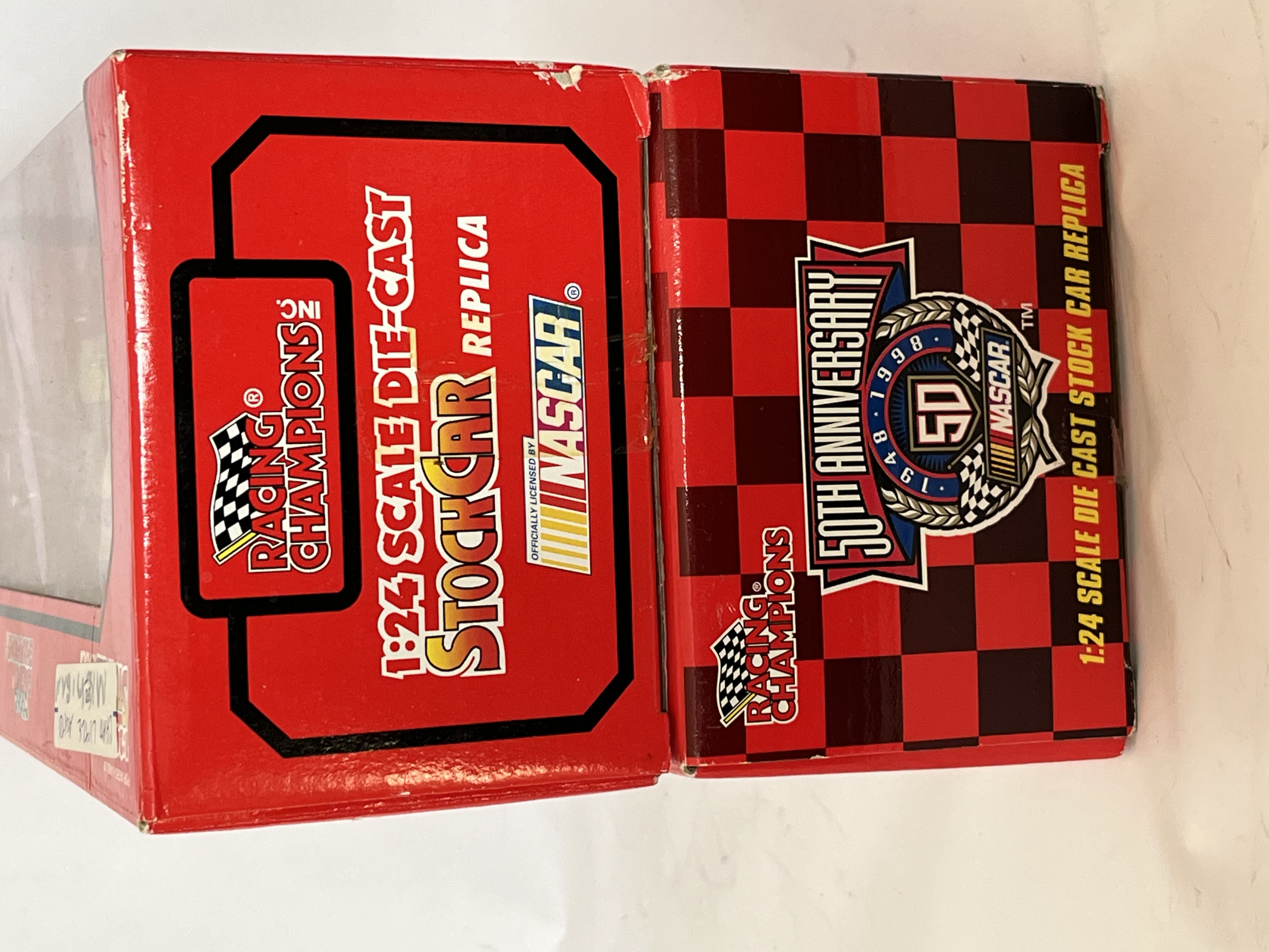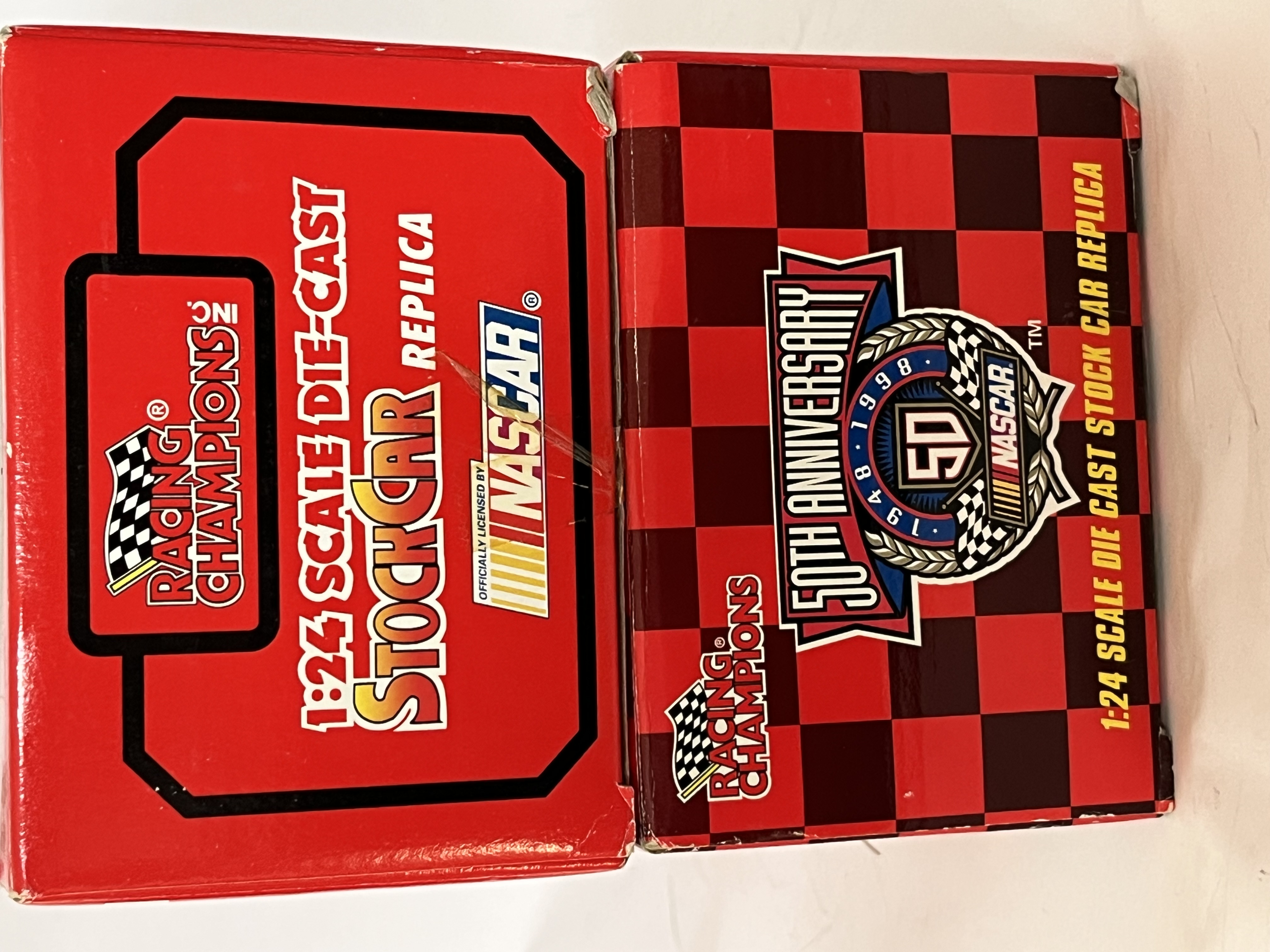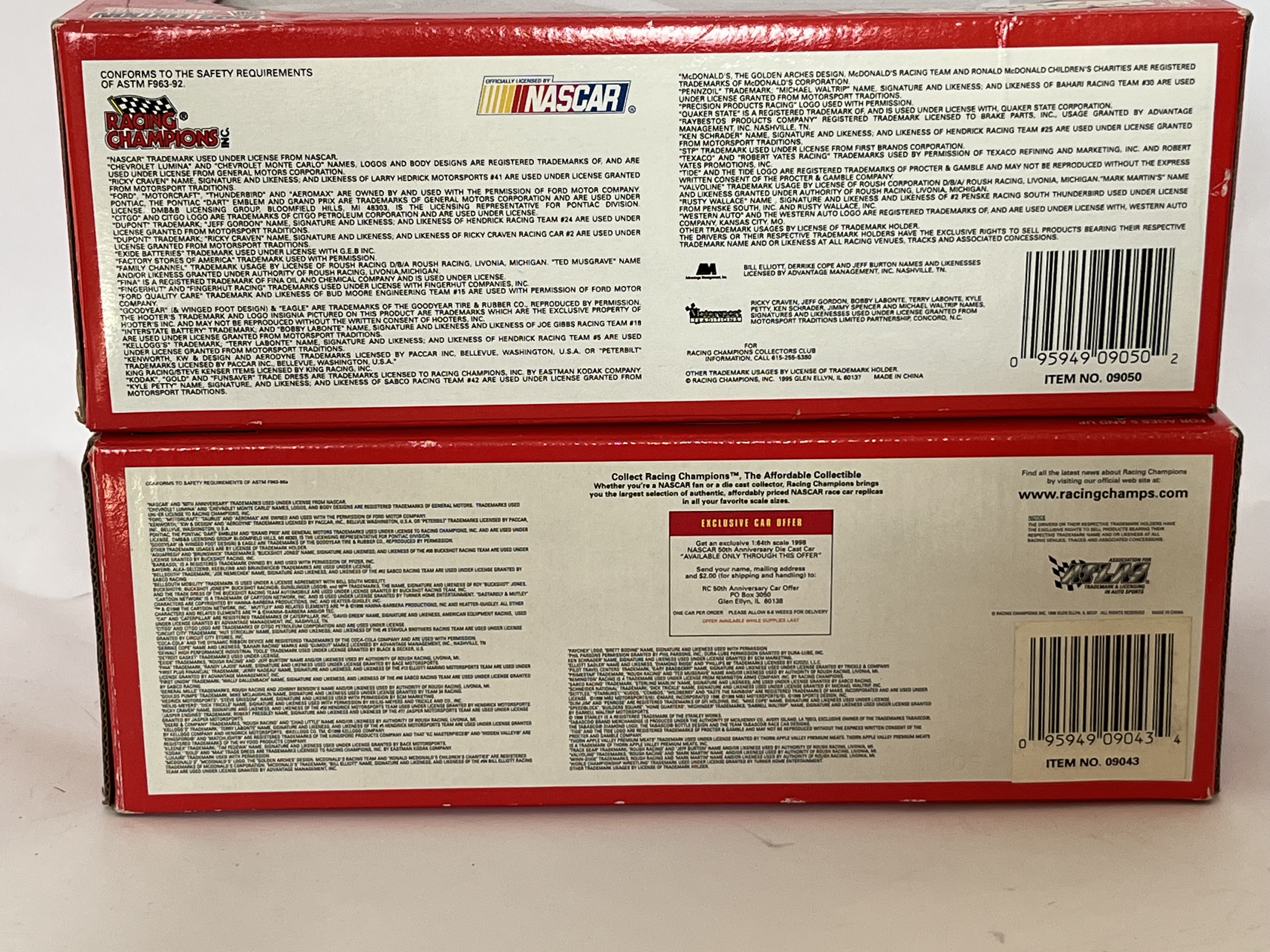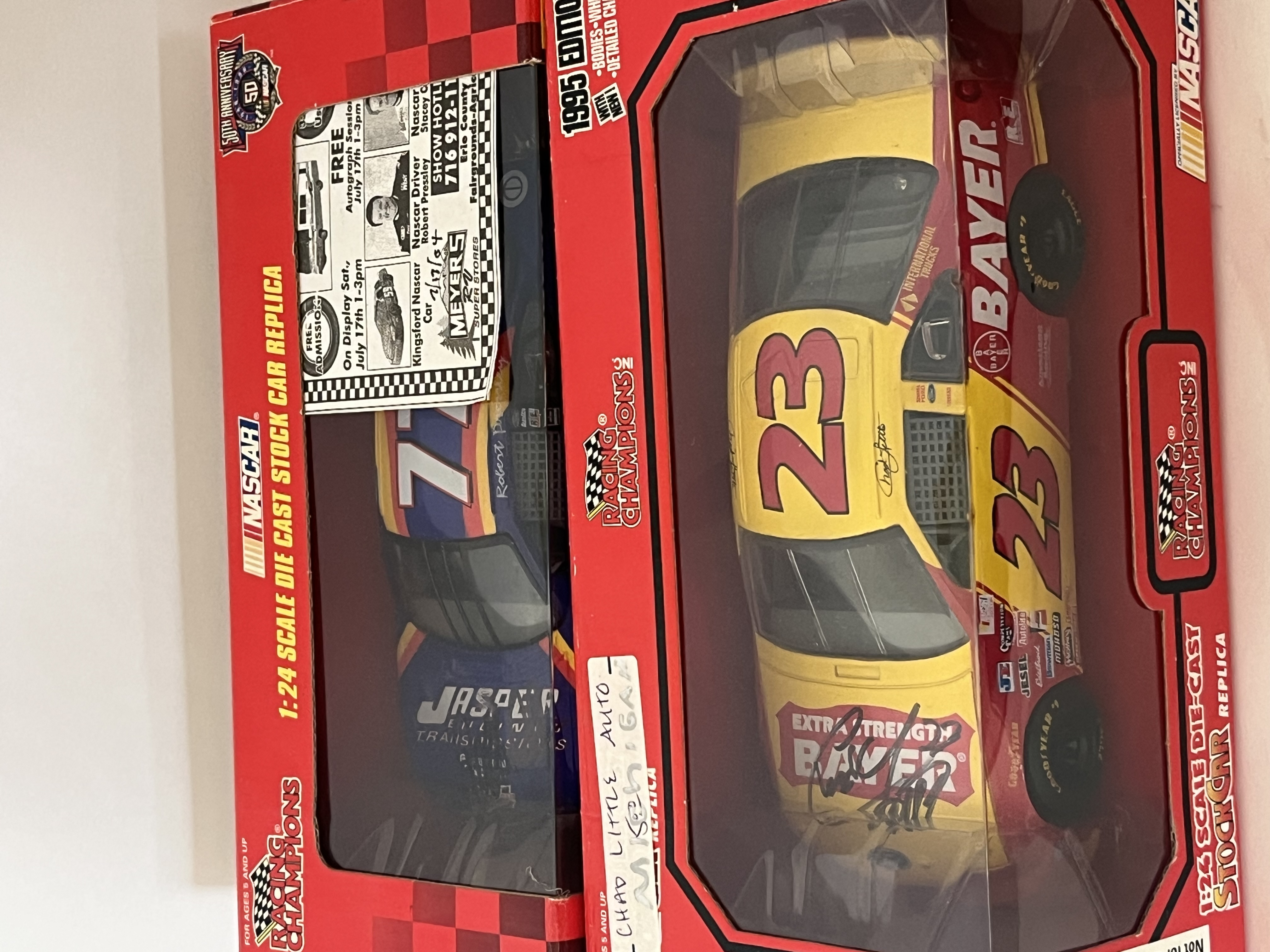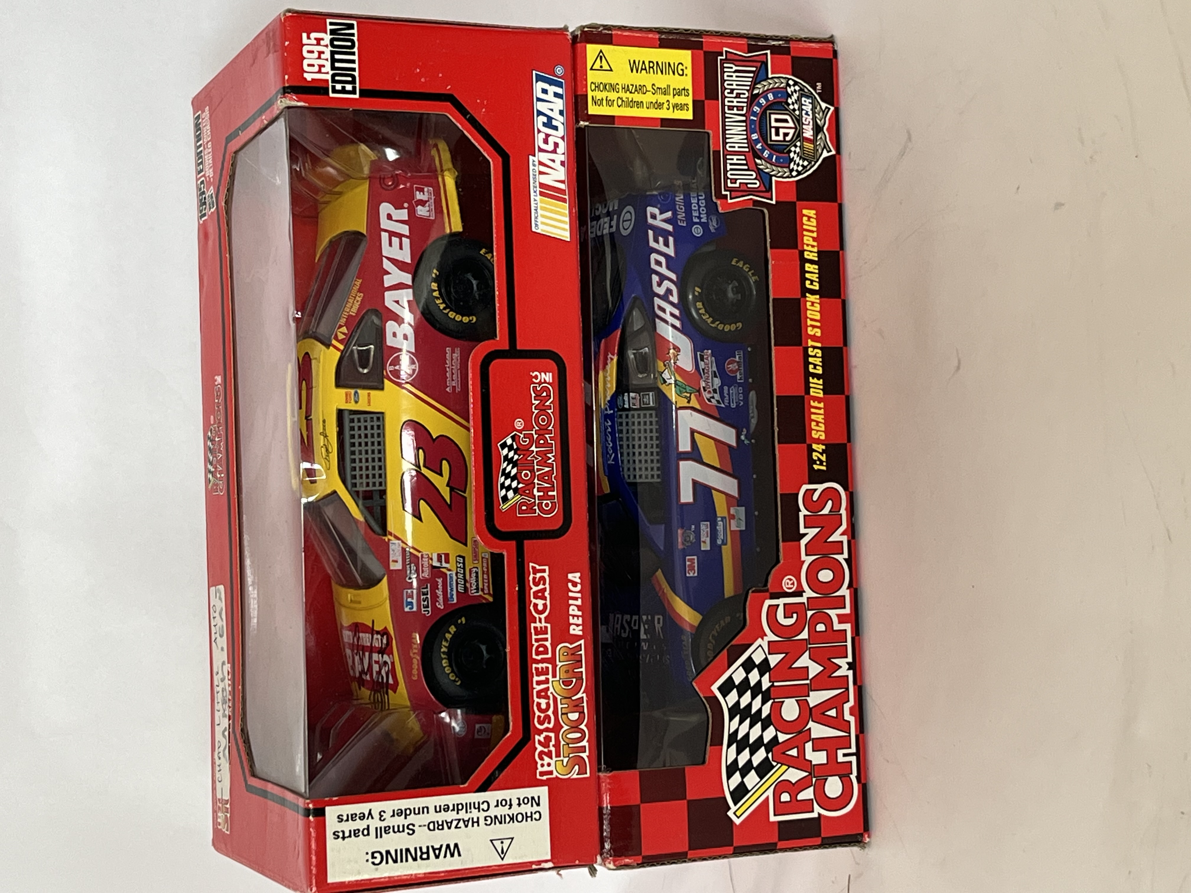 Racing Champions 1:24 scale NASCAR stock car replicas. This lot features two vehicles constructed of die-cast metal with plastic components, both presented in their original window boxes. The first is a 1995 Edition Ford Thunderbird, car #23, in the yellow and red Bayer Extra Strength, The second is a NASCAR 50th Anniversary (1948-1998) Ford Taurus, car #77, Both models include authentic sponsor graphics, detailed interiors, and Goodyear Eagle tires. Boxes are marked with Item No. 09050 and 09043.