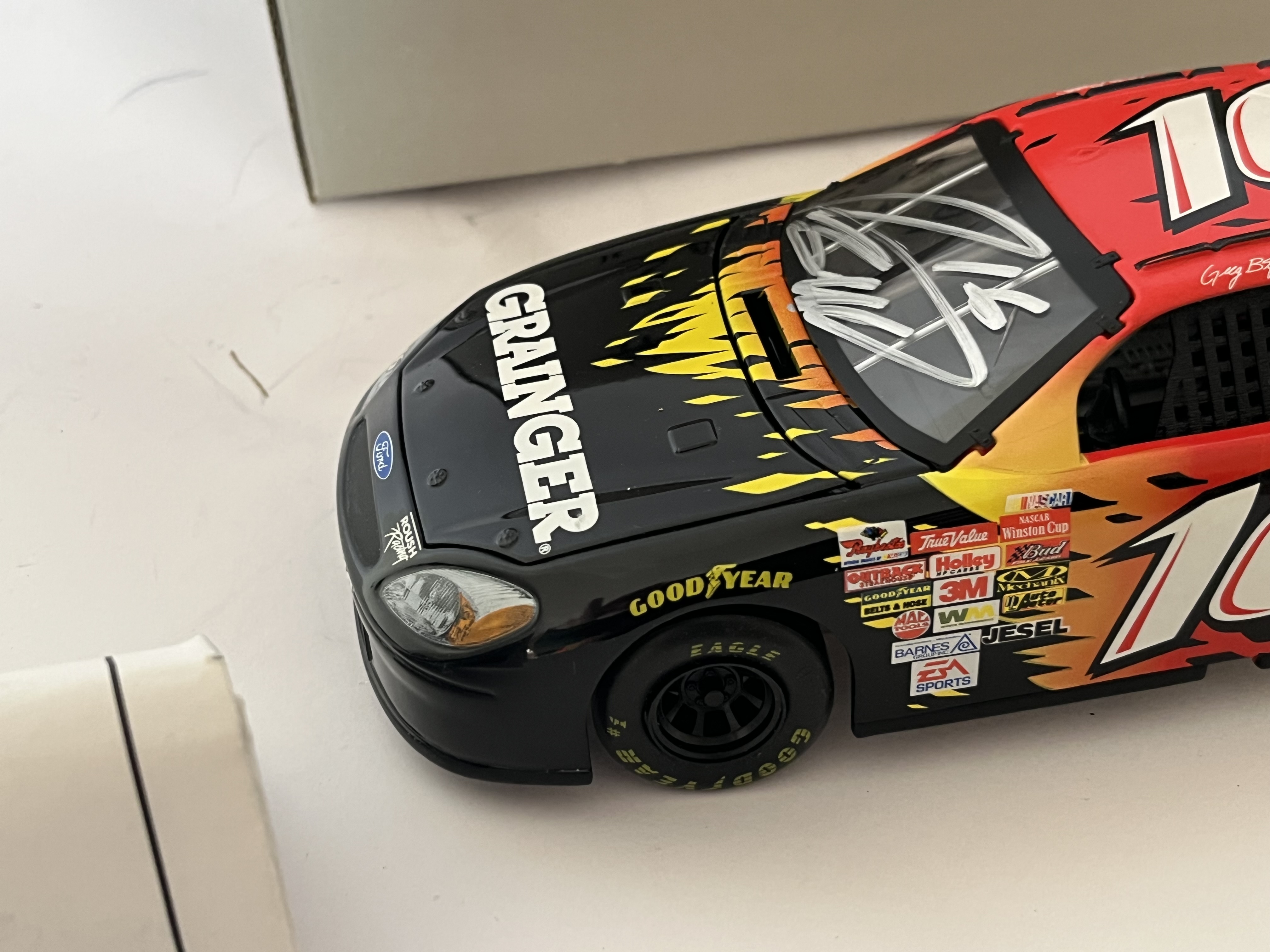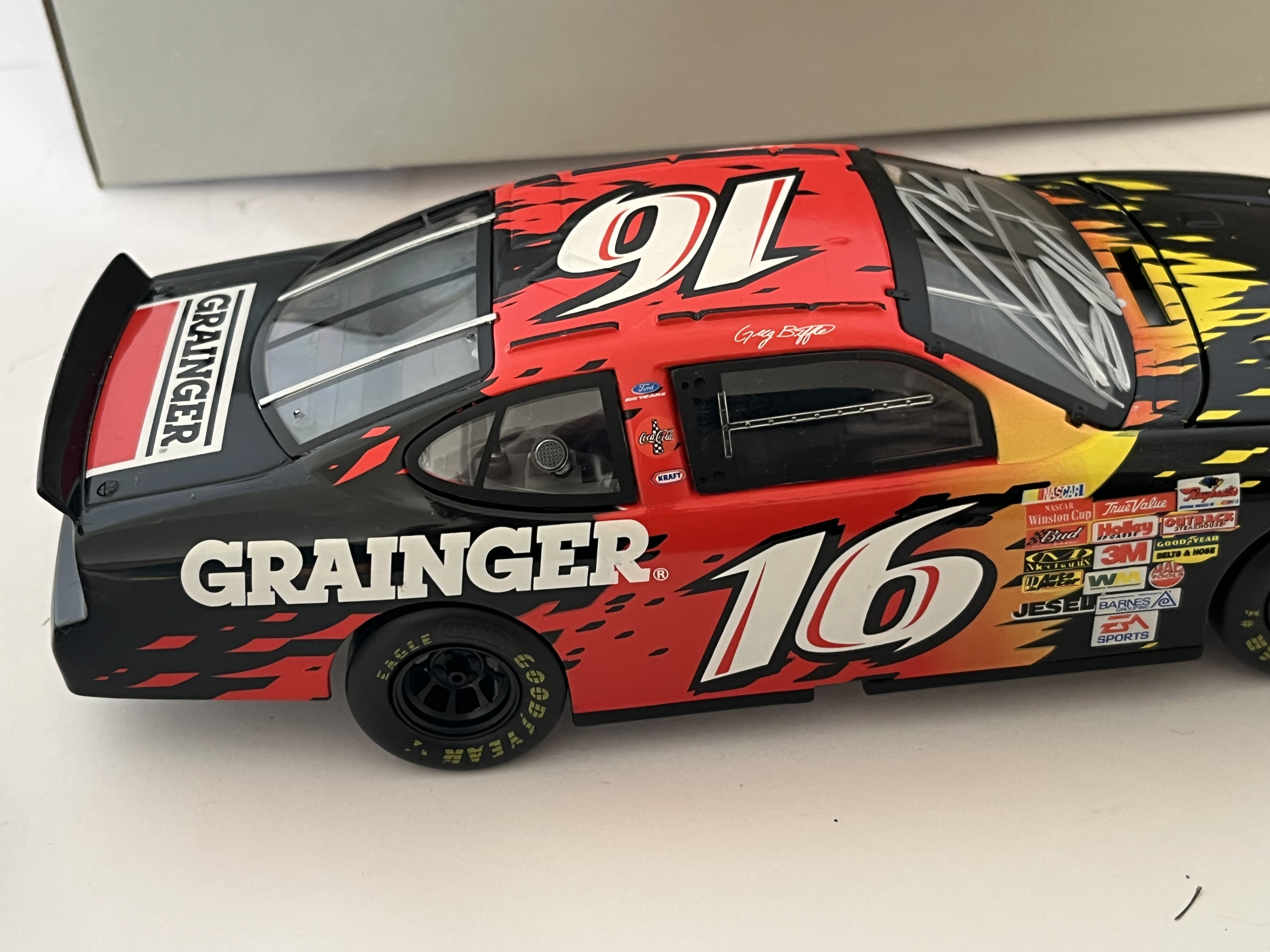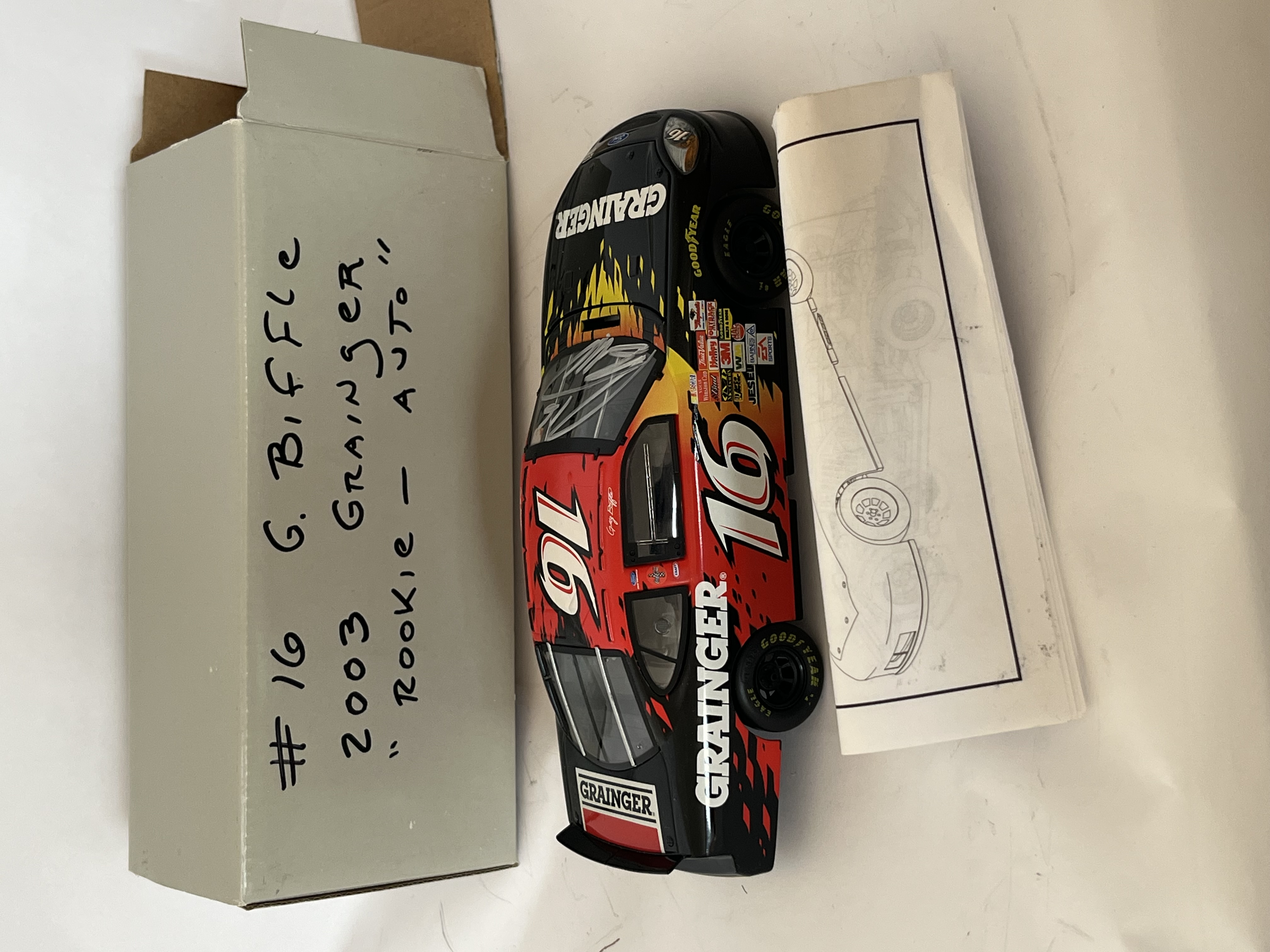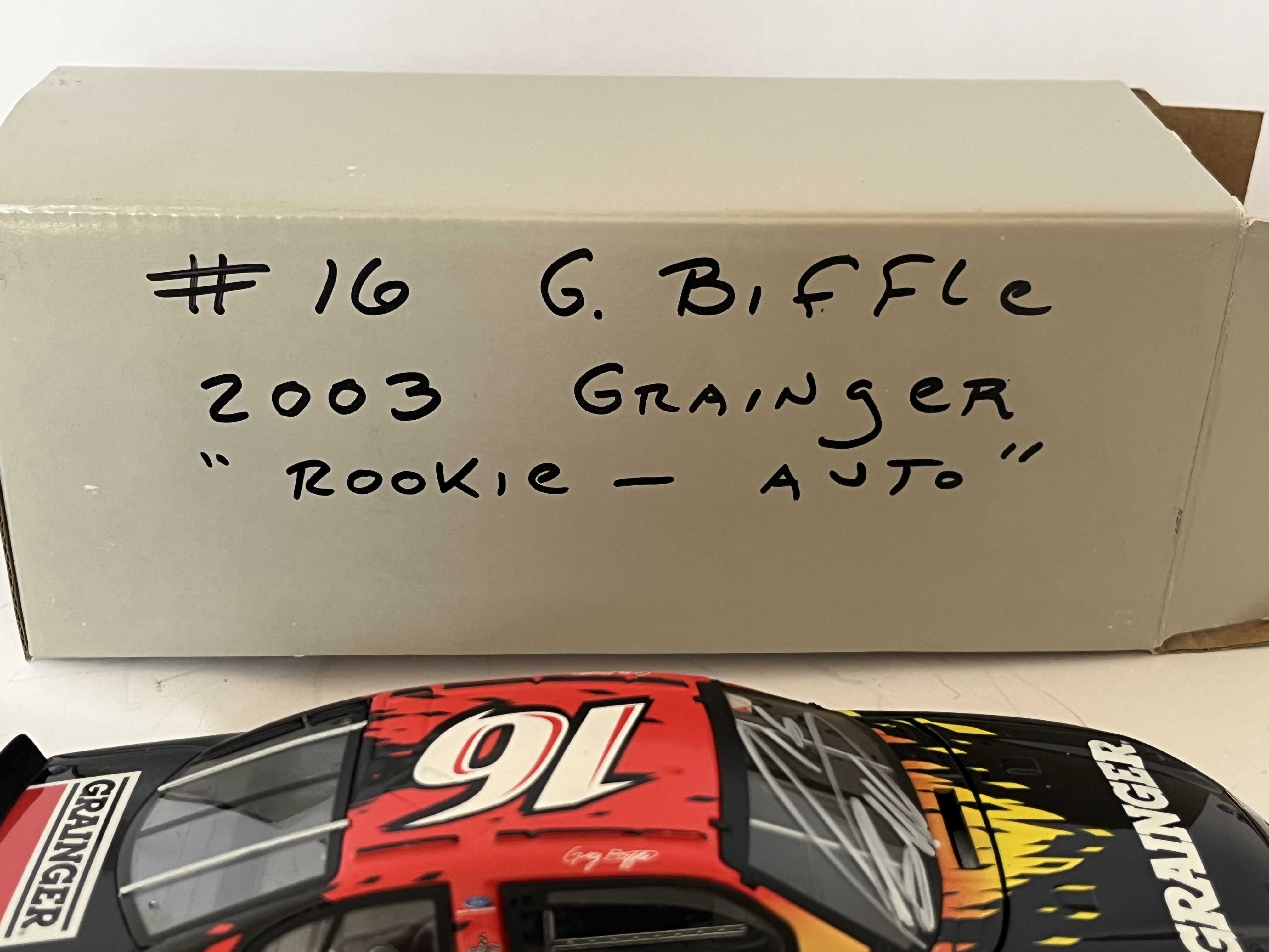 This 1:24 scale model represents the #16 Grainger Ford Taurus driven by Greg Biffle during his 2003 NASCAR Winston Cup Series rookie season. Manufactured by Motorworks. This lot includes the original Motorworks assembly instruction sheet and a non-original grey cardboard storage box with handwritten identification: #16 G. Biffle 2003 Grainger Rookie – Auto. 8.5 inches L x 3 inches W.