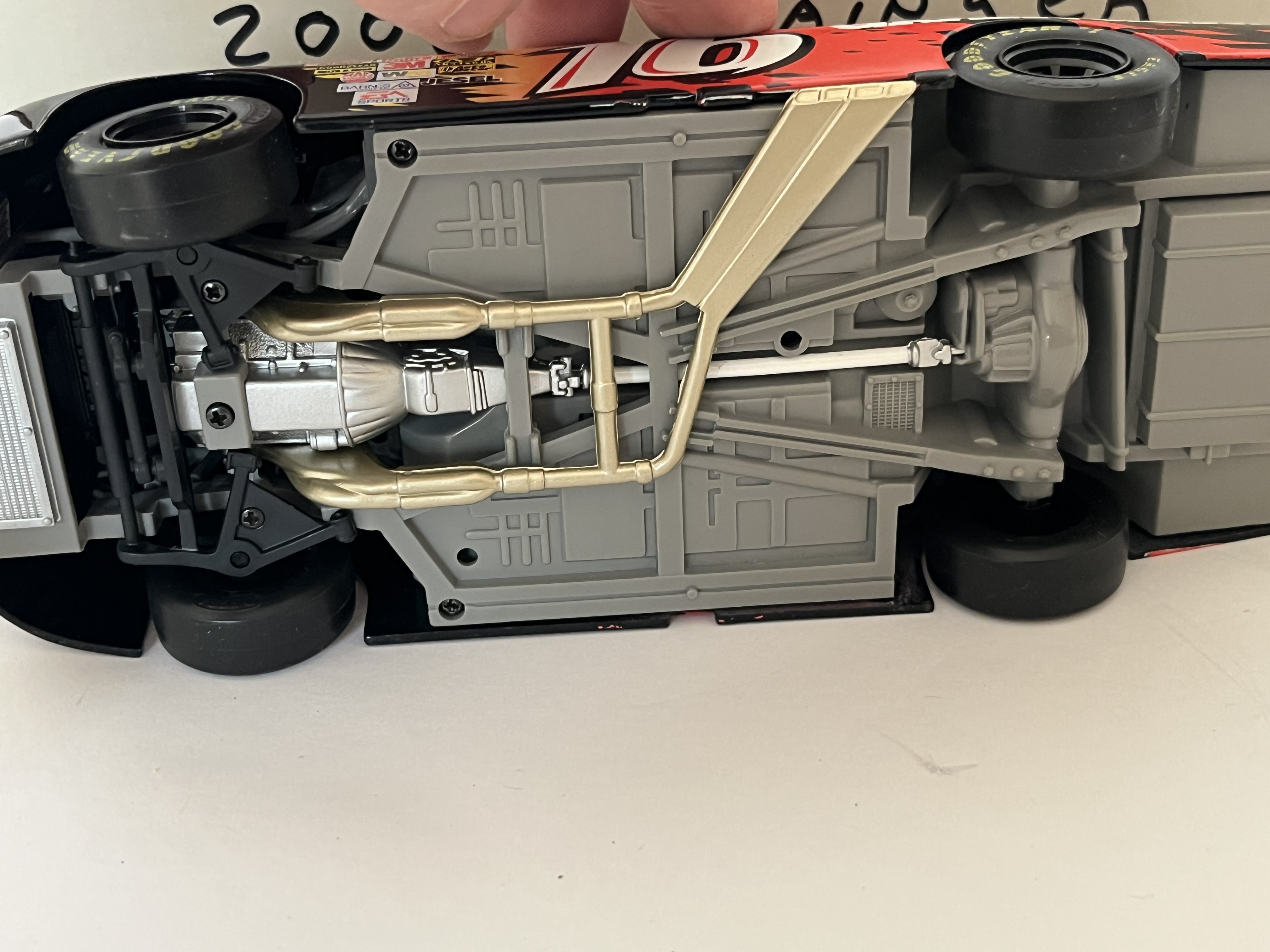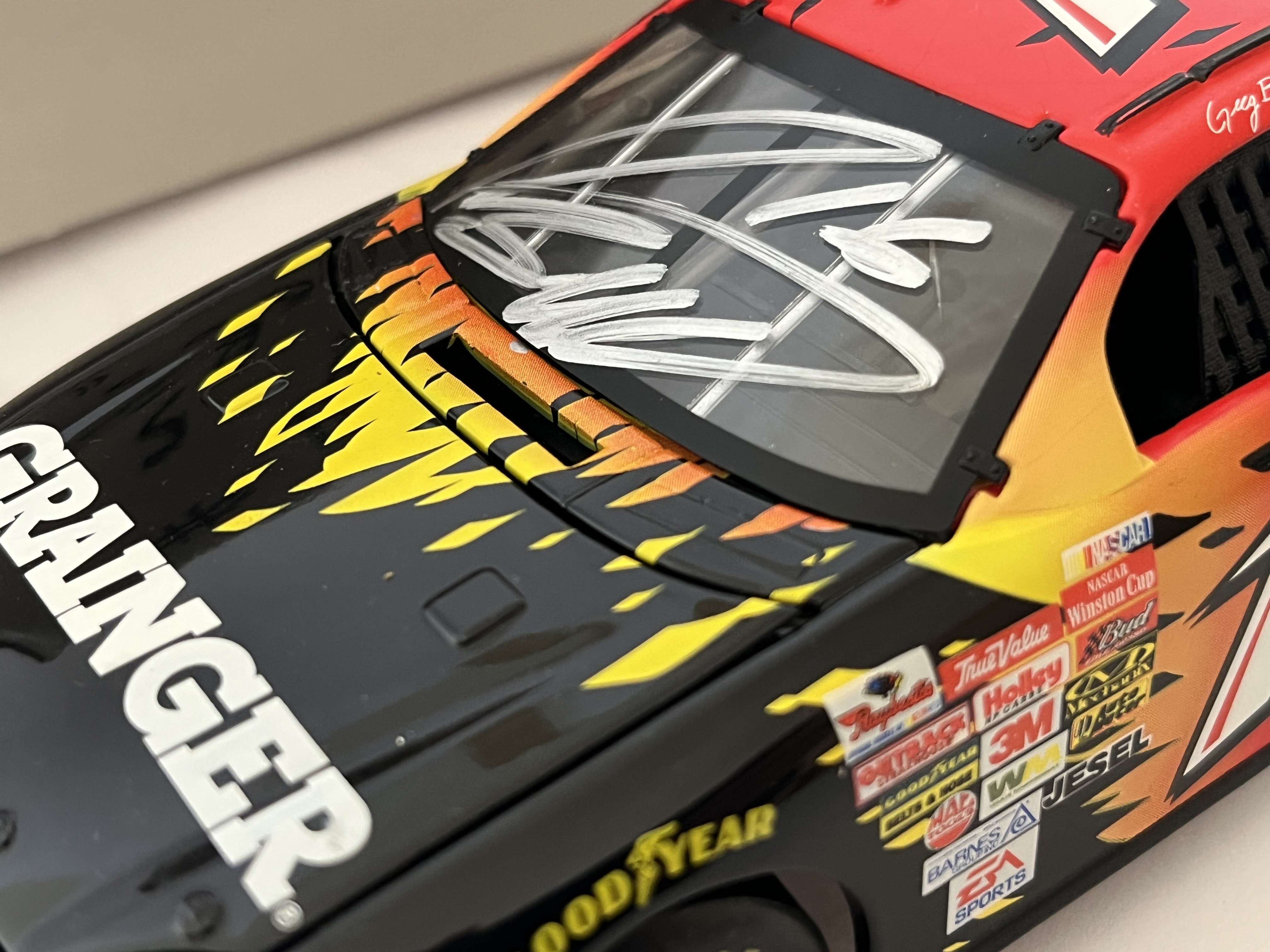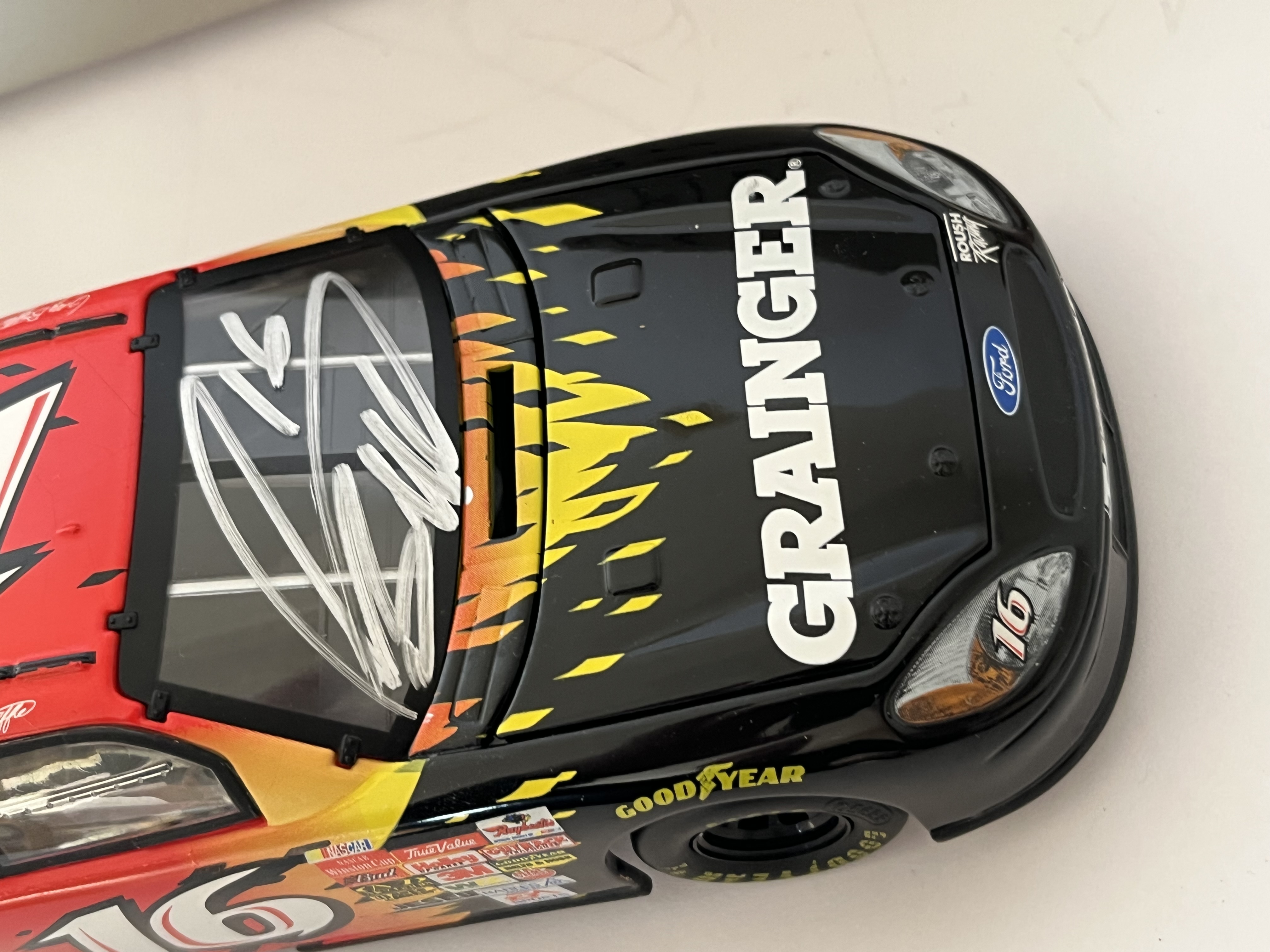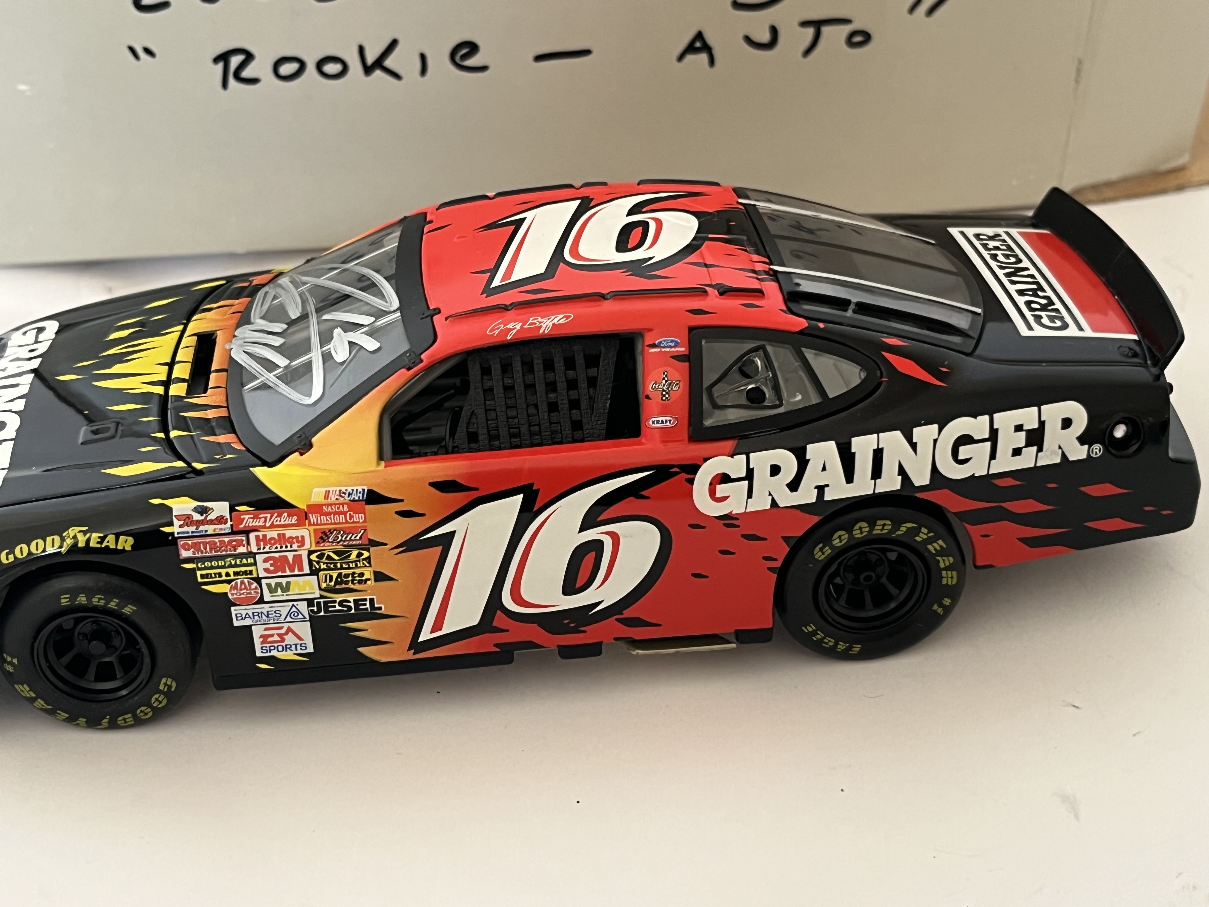 This 1:24 scale model represents the #16 Grainger Ford Taurus driven by Greg Biffle during his 2003 NASCAR Winston Cup Series rookie season. Manufactured by Motorworks. This lot includes the original Motorworks assembly instruction sheet and a non-original grey cardboard storage box with handwritten identification: #16 G. Biffle 2003 Grainger Rookie – Auto. 8.5 inches L x 3 inches W.