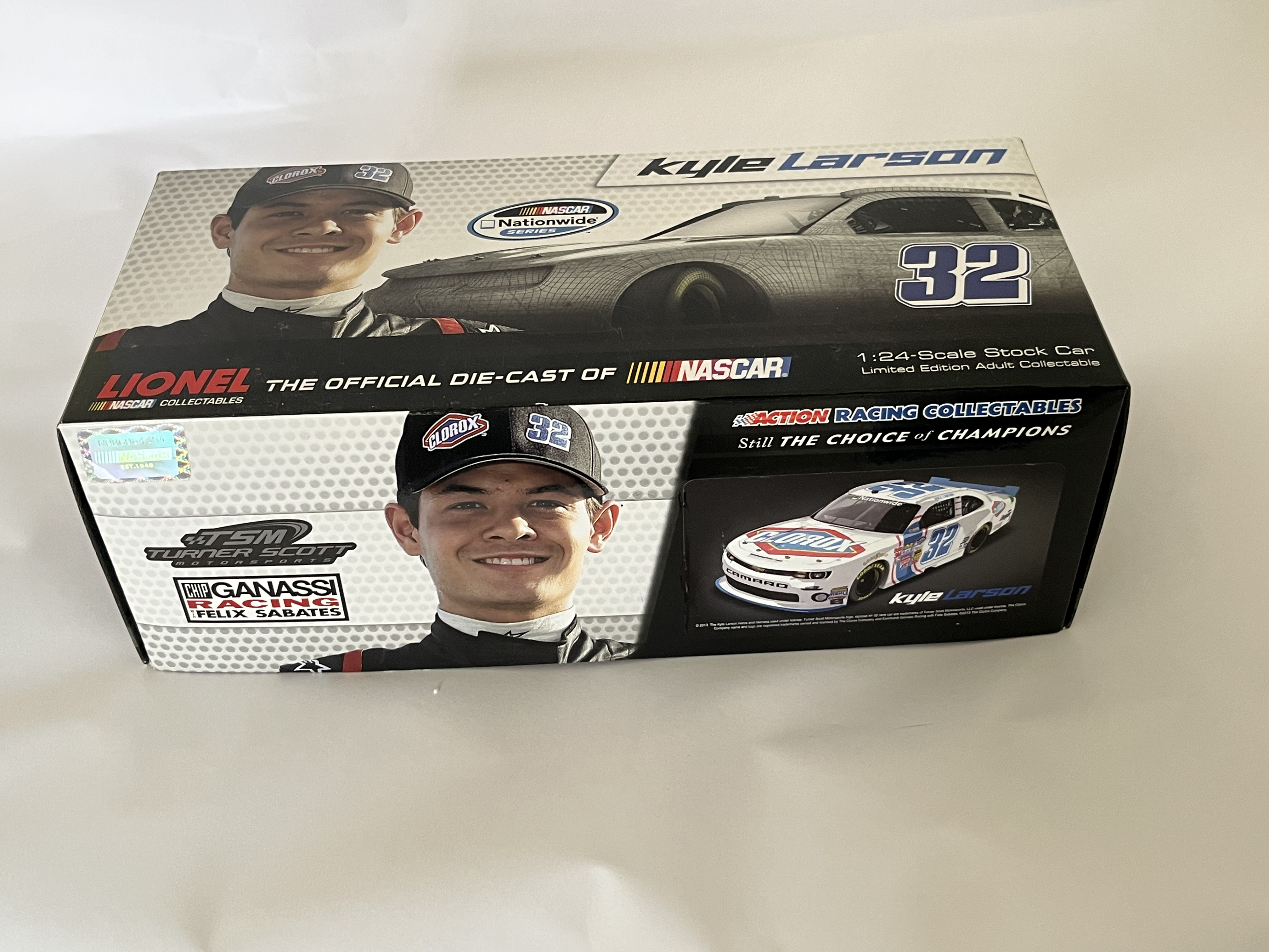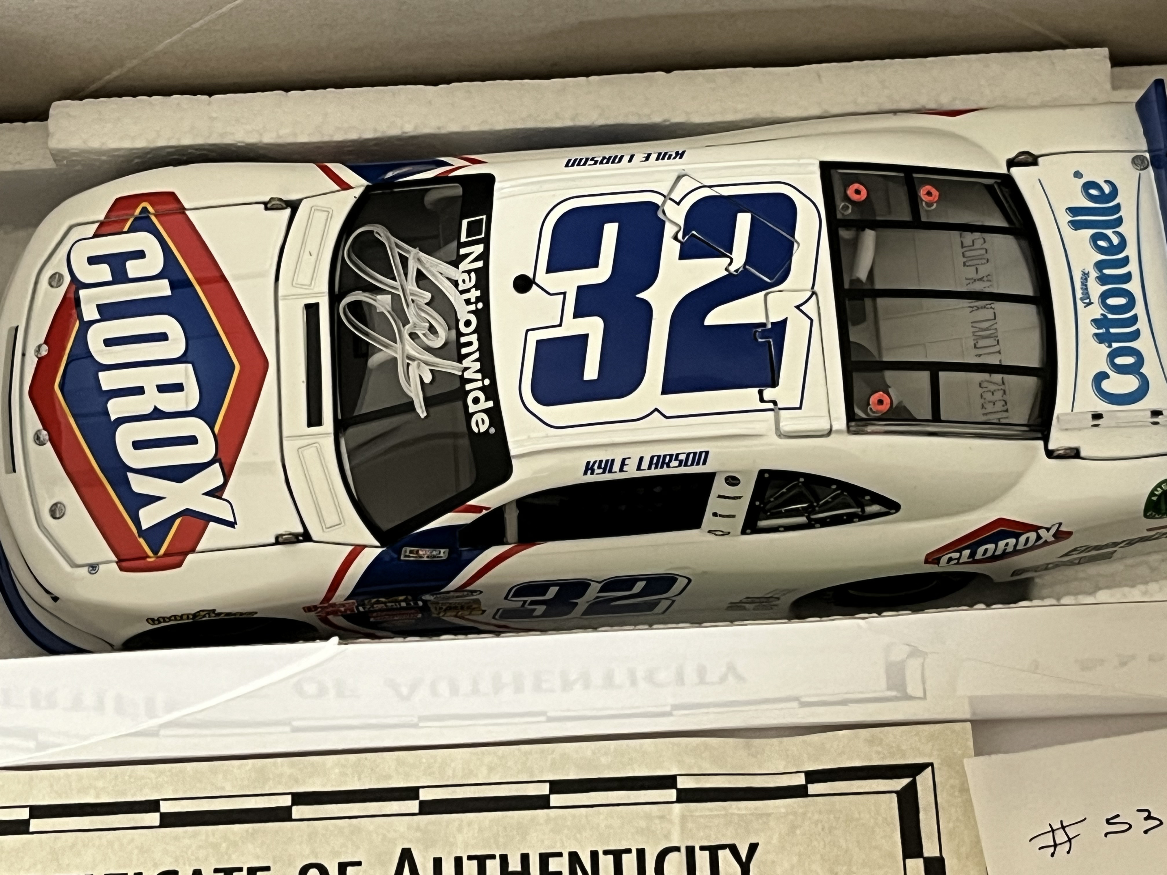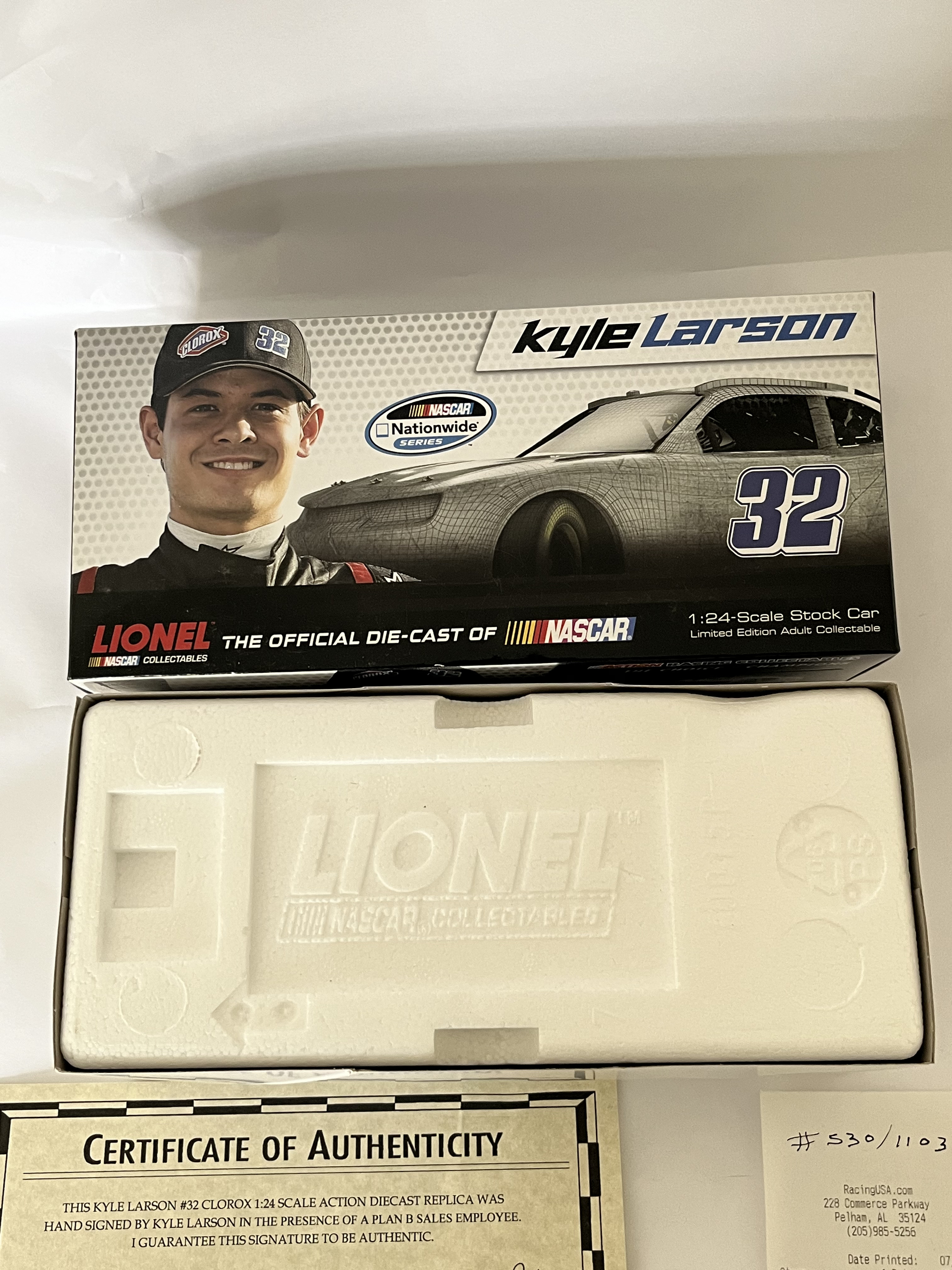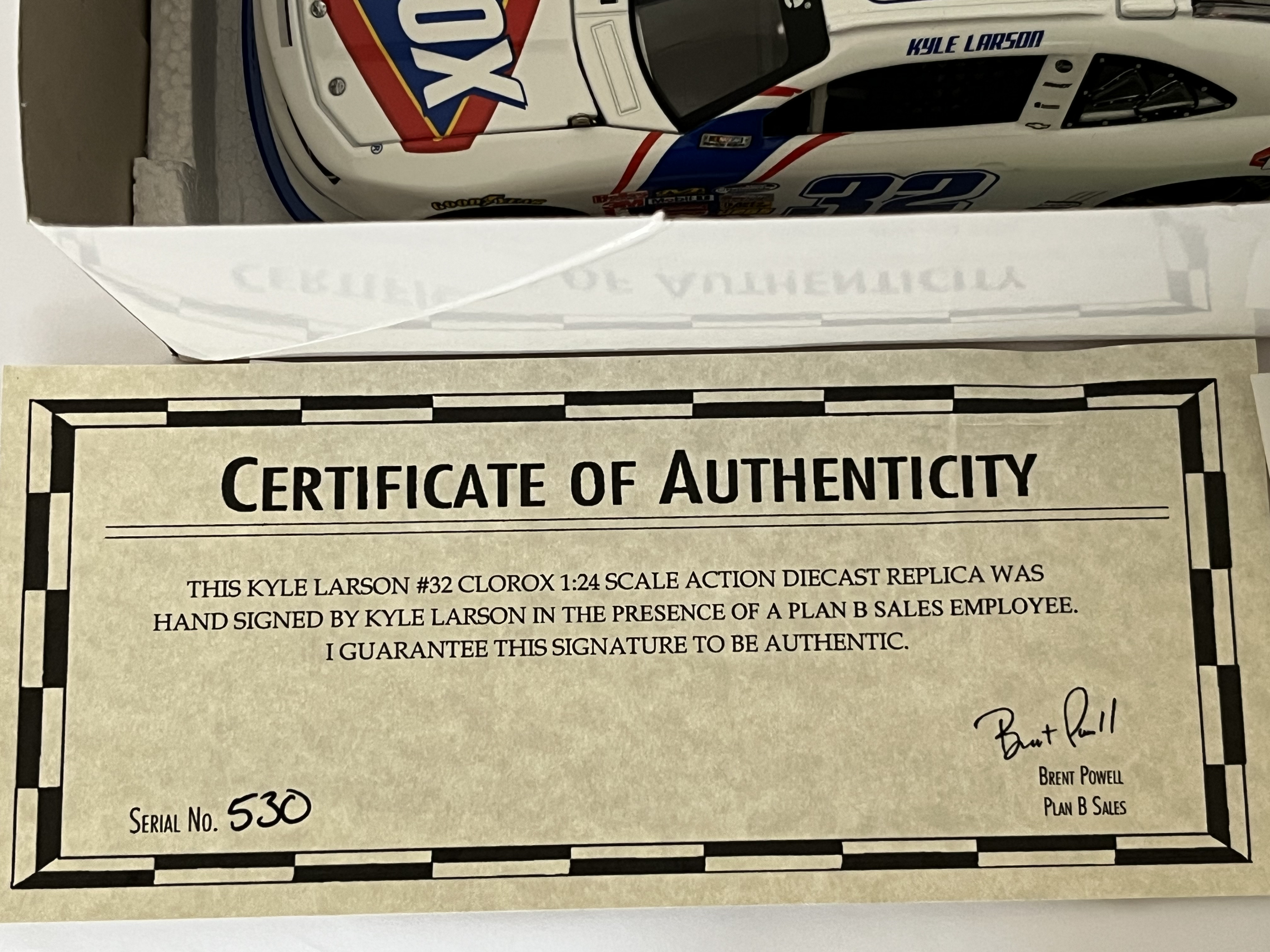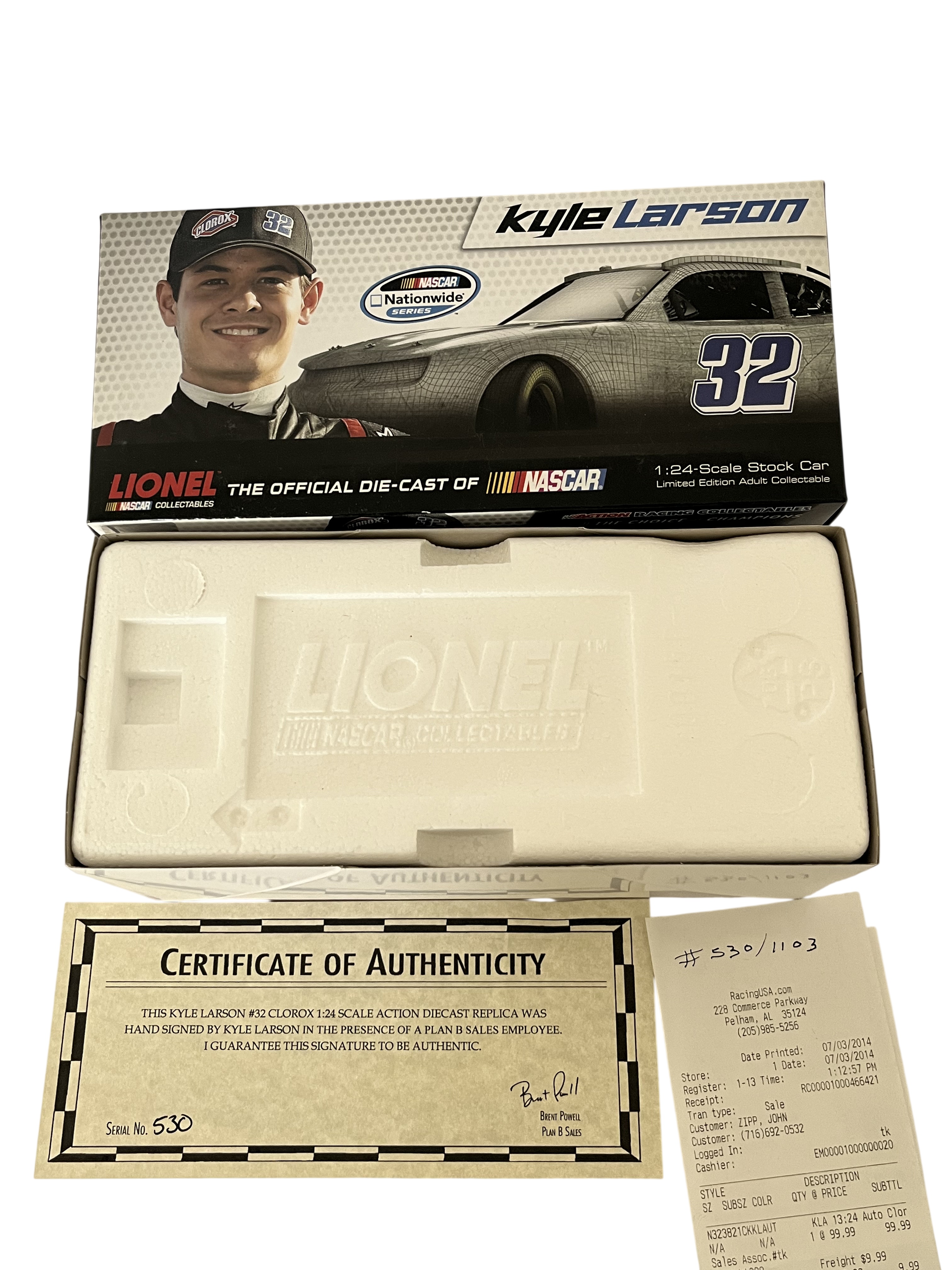 A 1:24 scale die-cast replica of the #32 Clorox Chevrolet Camaro driven by Kyle Larson during the NASCAR Nationwide Series. Certificate of Authenticity from Plan B Sales, bearing serial number 530, which verifies the signature was witnessed by a company representative. Also included is the original sales receipt from RacingUSA.com dated July 3, 2014. The car is housed in its original illustrated retail box with the factory protective styrofoam insert. 1:24 scale, approximately 8.5 inches in length.