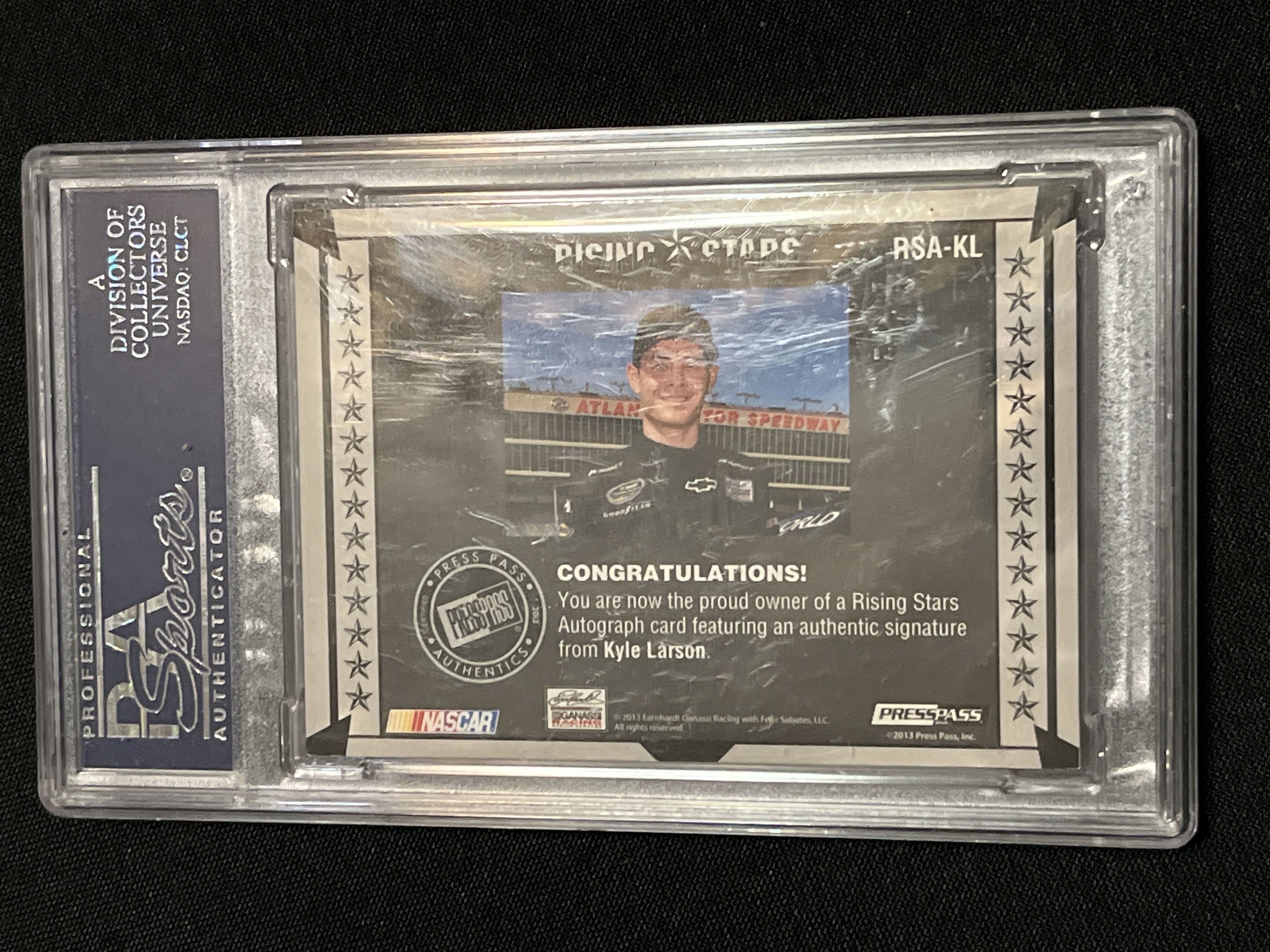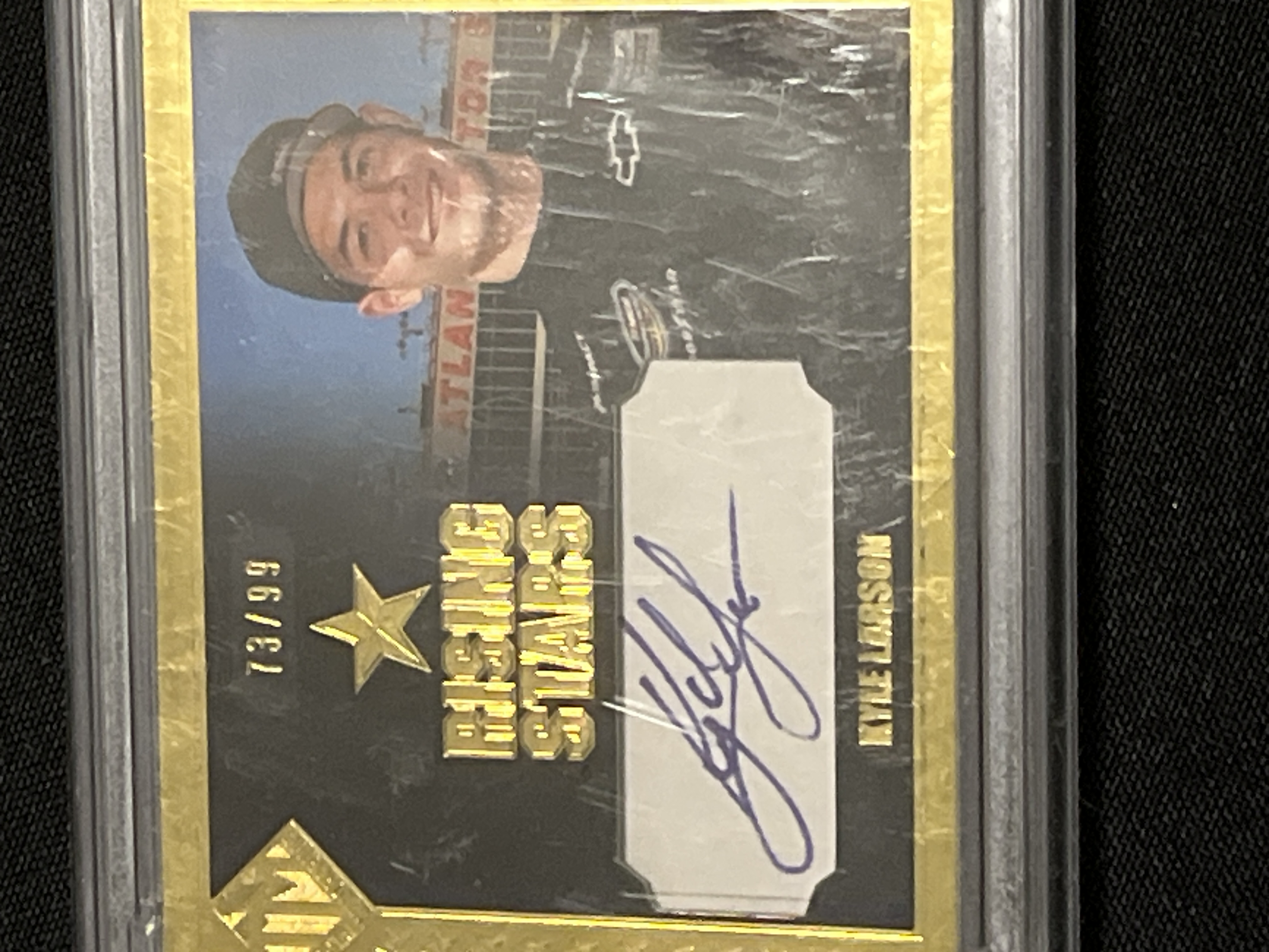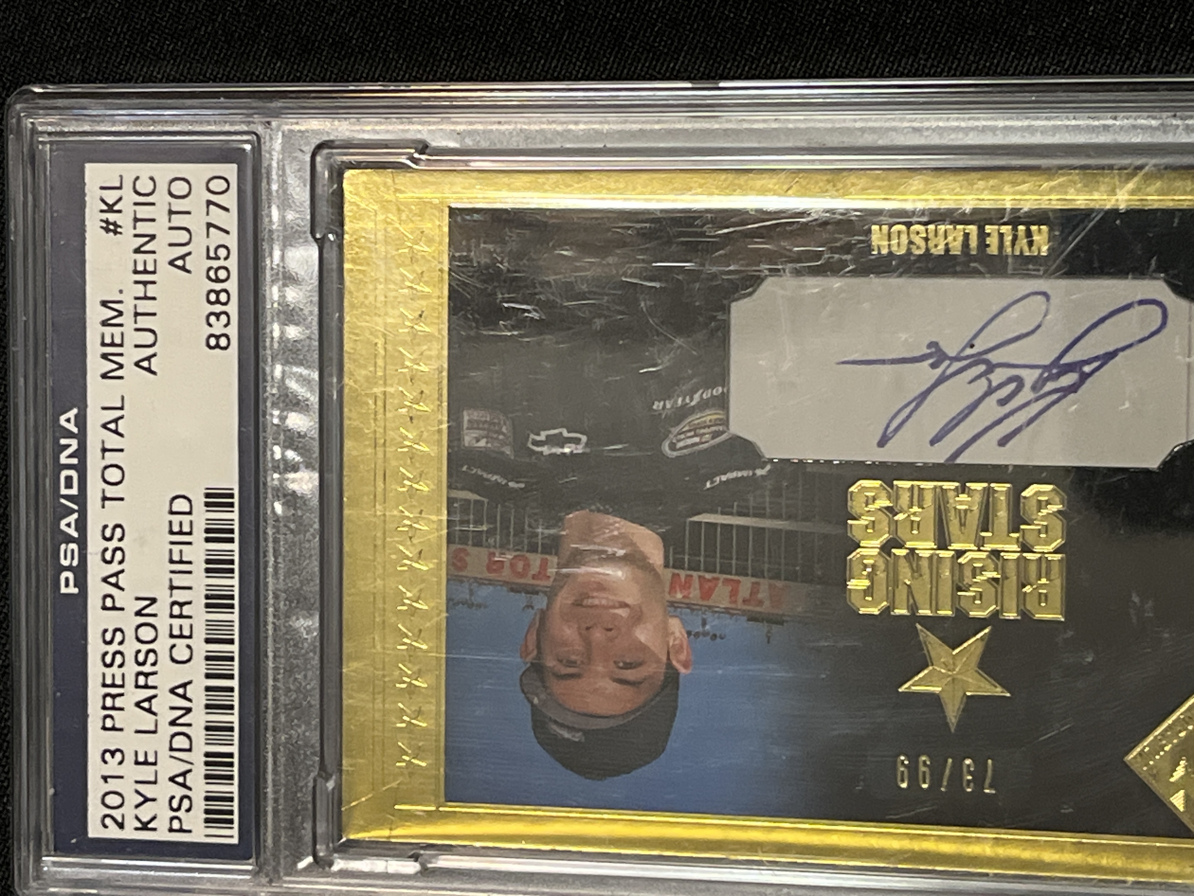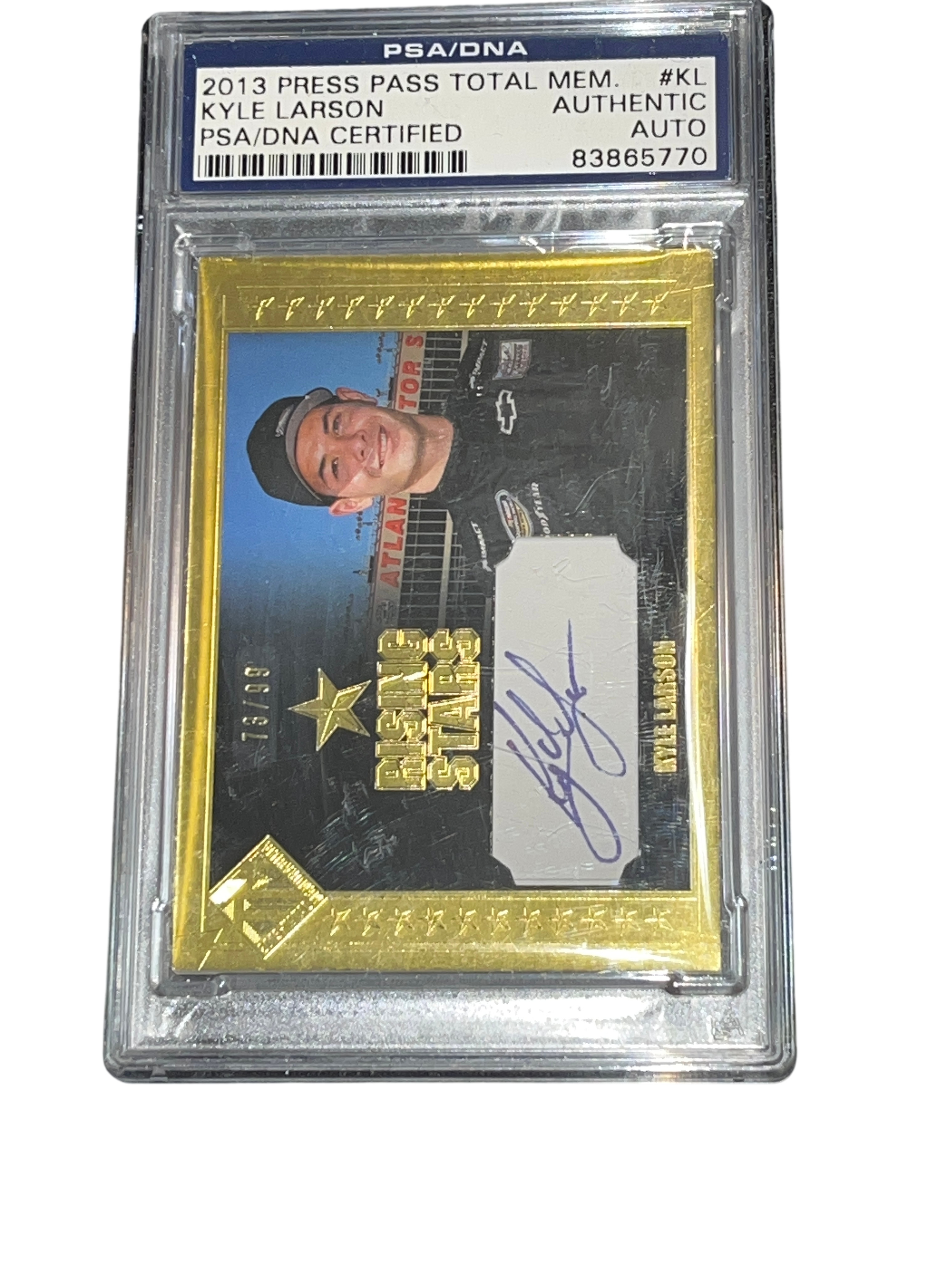 2013 Press Pass Total Memorabilia Kyle Larson Rising Stars Gold Autograph card, number #RSA-KL. This rookie-year card features a sticker autograph and is a limited edition Gold parallel, serial-numbered 73/99. Encapsulated and certified by PSA/DNA as an authentic autograph, certification number 83865770.