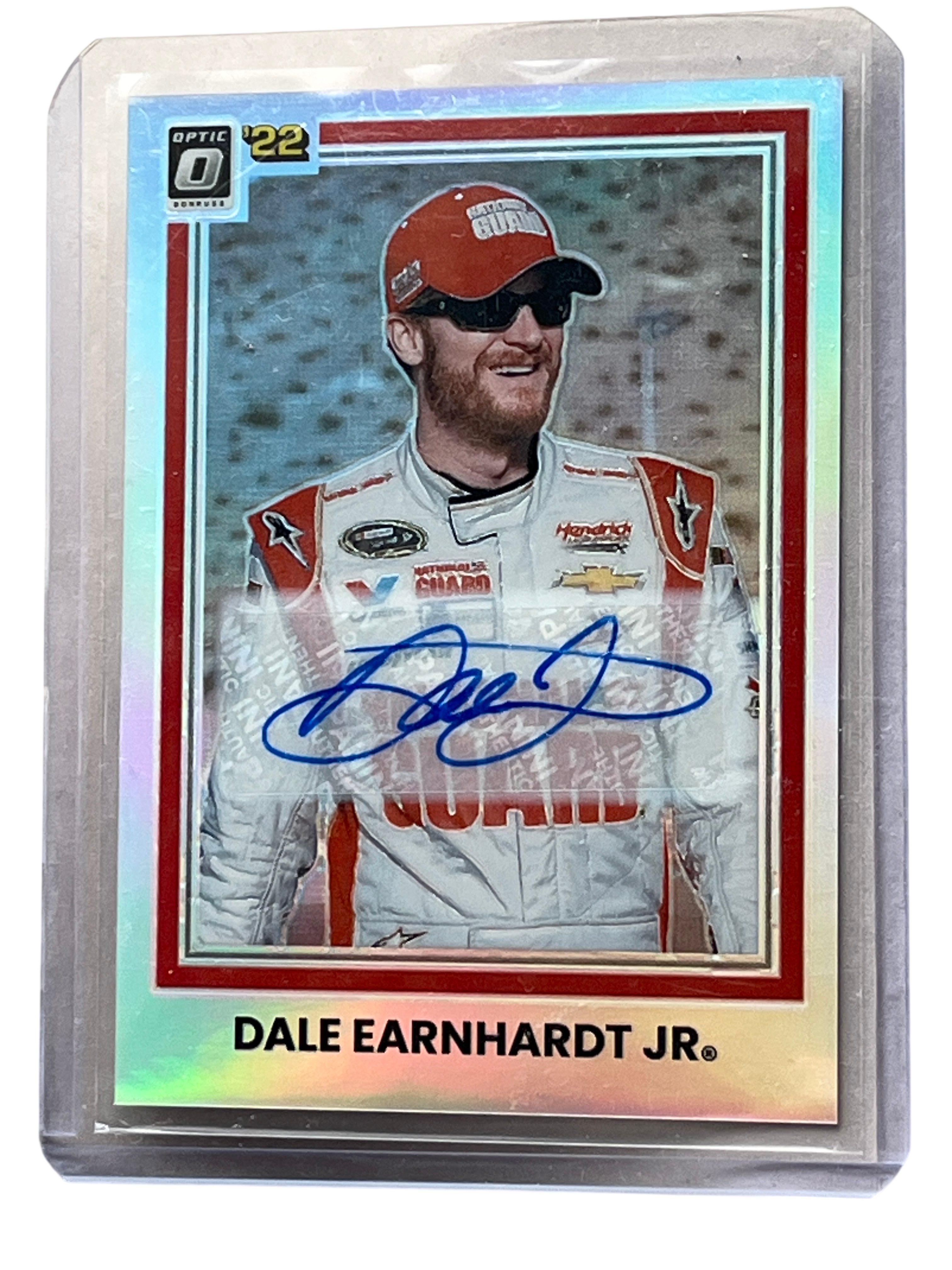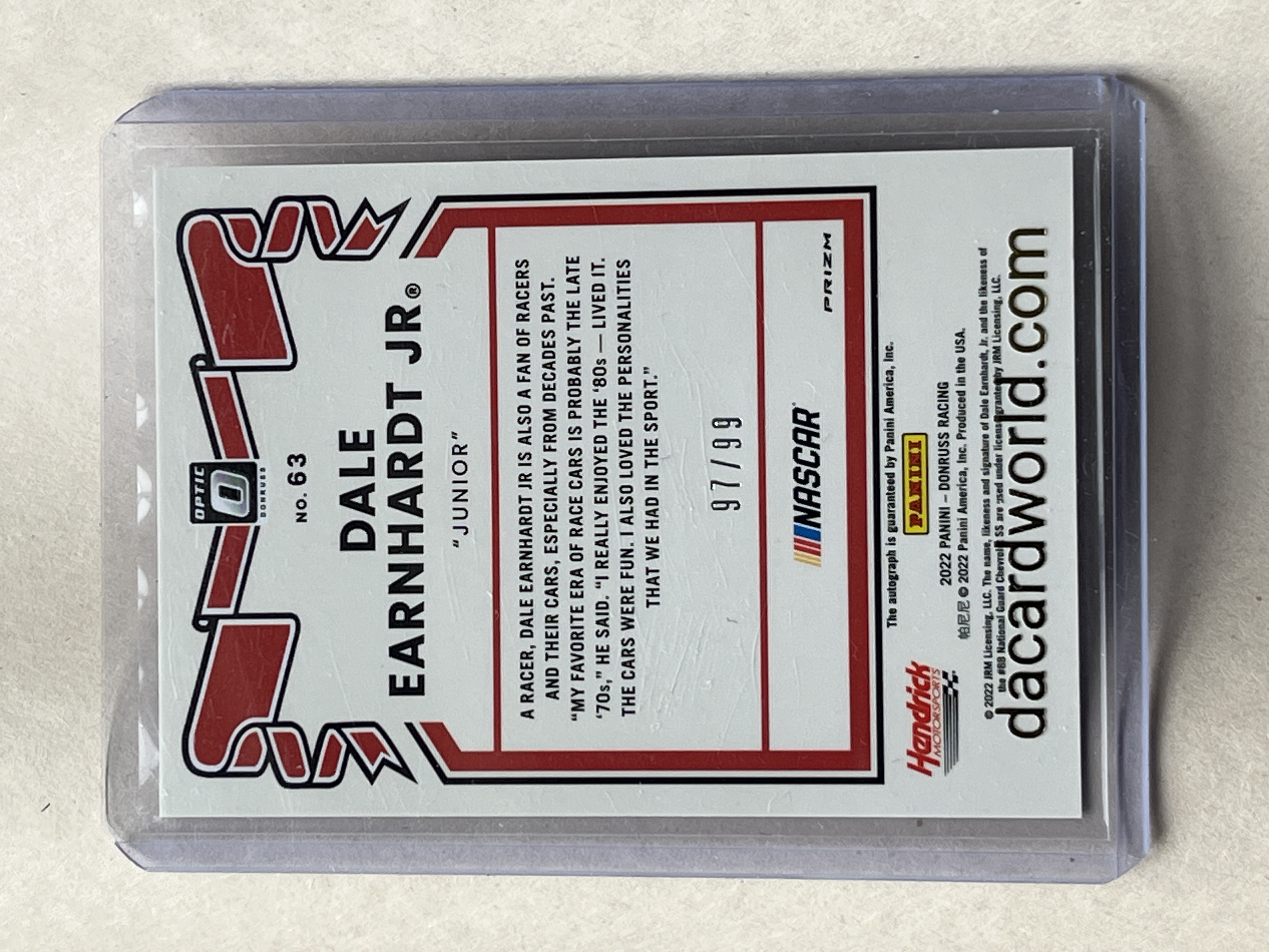 2022 Panini Donruss Optic racing trading card featuring Dale Earnhardt Jr., card number 63. The card features a holographic Optic finish and a manufacturer-authenticated blue ink signature on a clear sticker overlay. The reverse is serial numbered 97/99 and includes official licensing for NASCAR, Hendrick Motorsports, and Panini America, Inc.