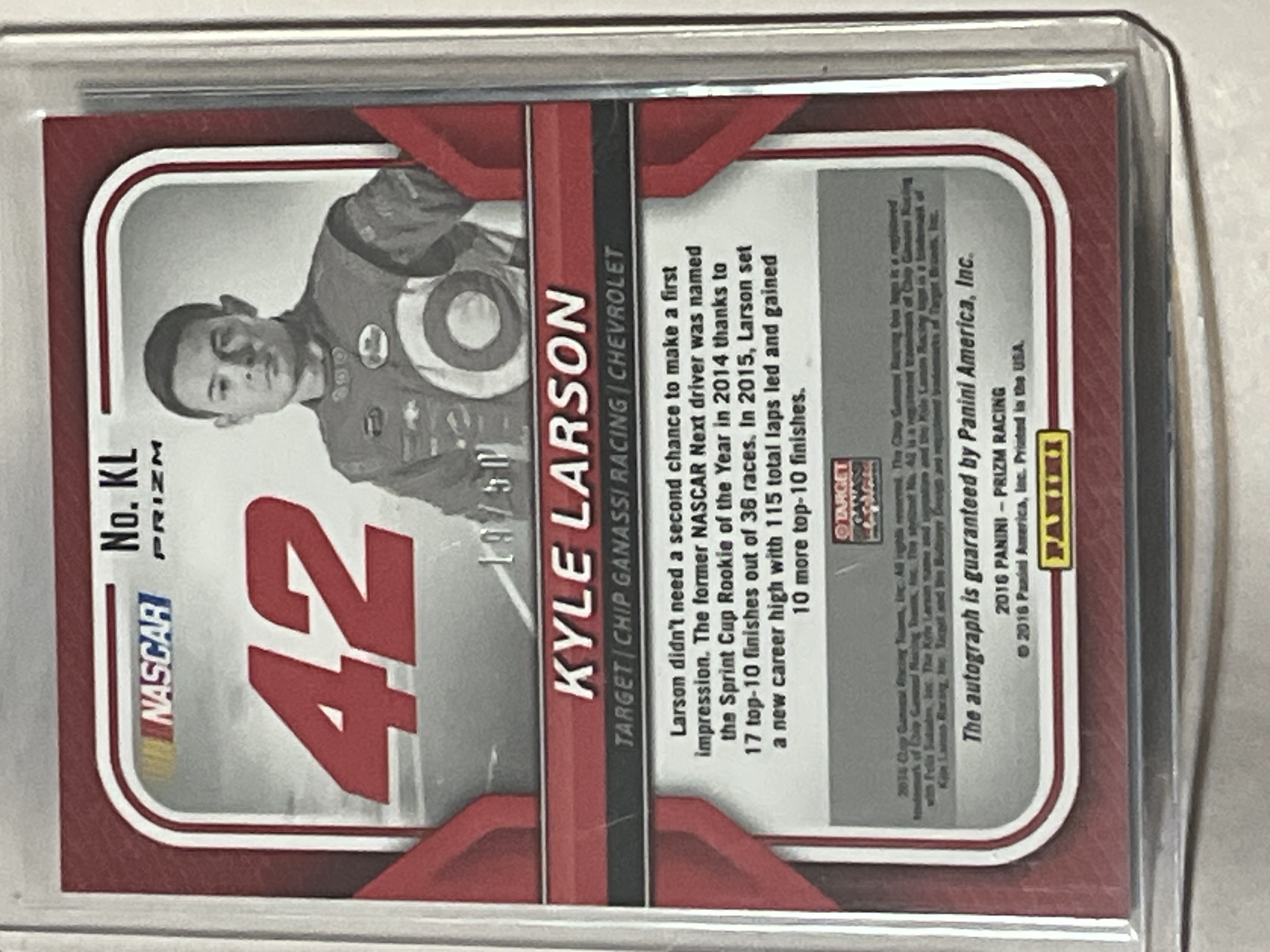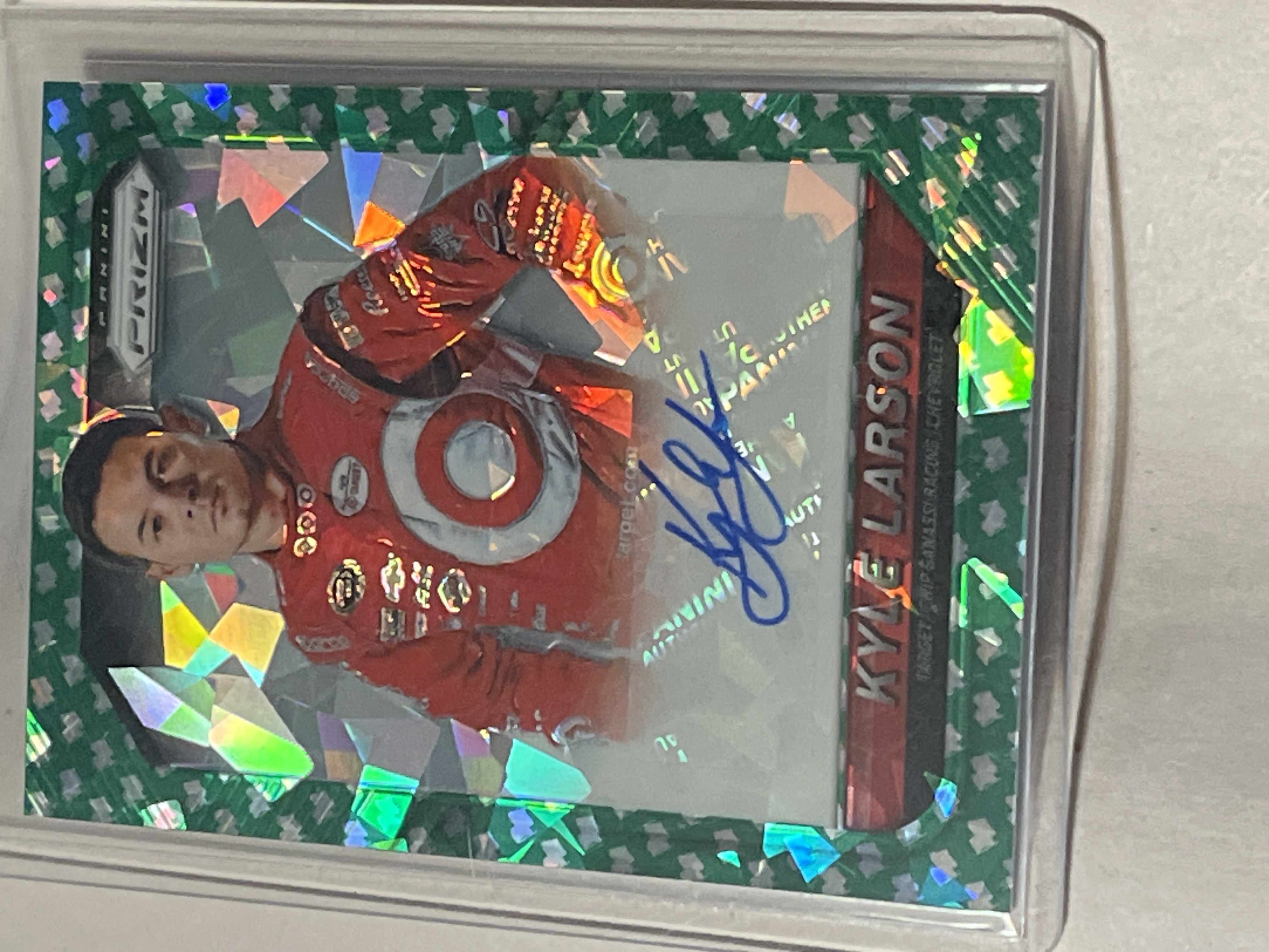2016 Panini Prizm Racing trading card featuring NASCAR driver Kyle Larson. The card features a Green Pulsar Prizm holographic parallel background and an on-sticker blue ink autograph. The reverse includes the NASCAR logo, card number No. KL, and a foil-stamped serial number 18/50. Authenticity of the signature is guaranteed by Panini America, Inc.